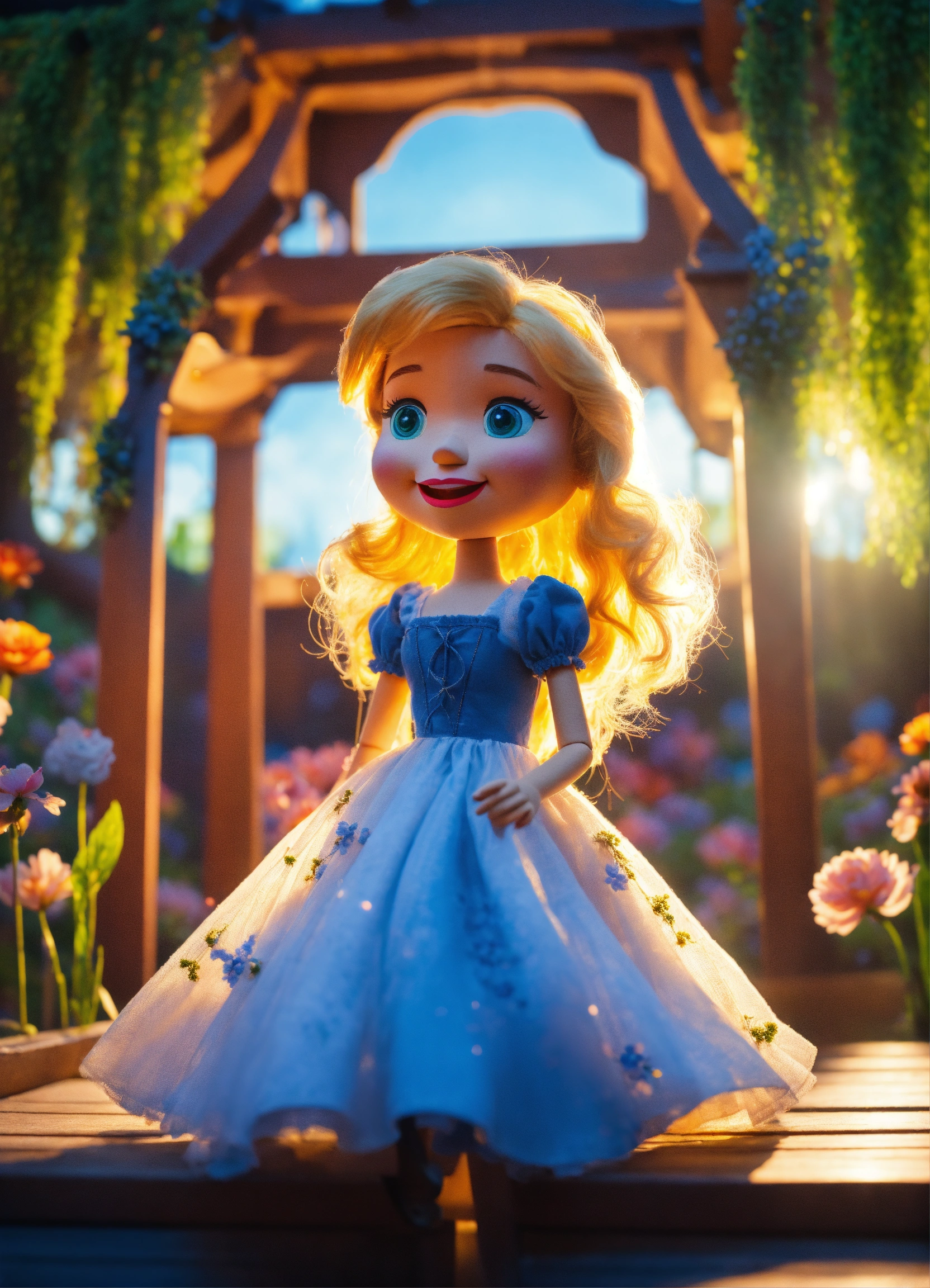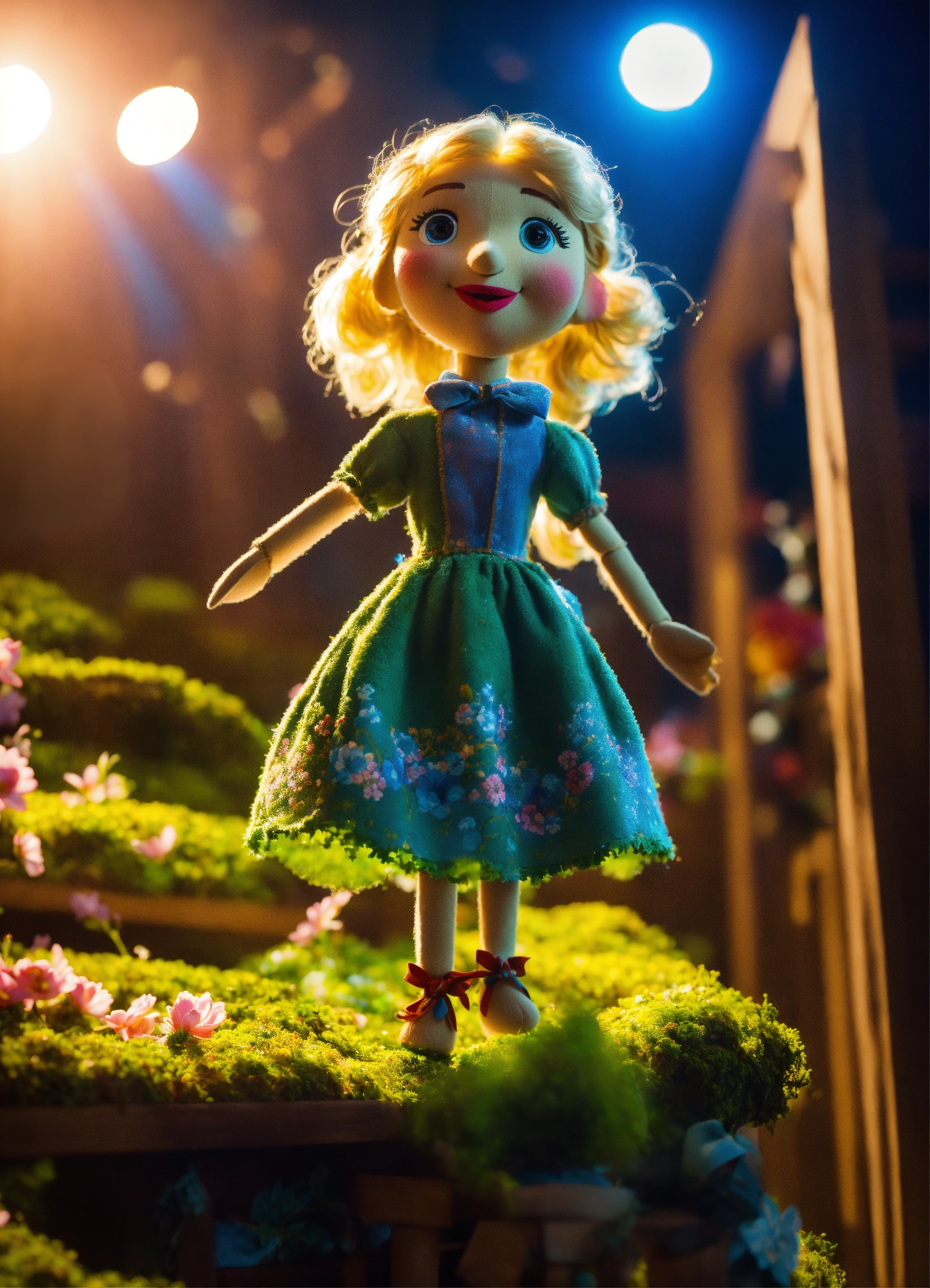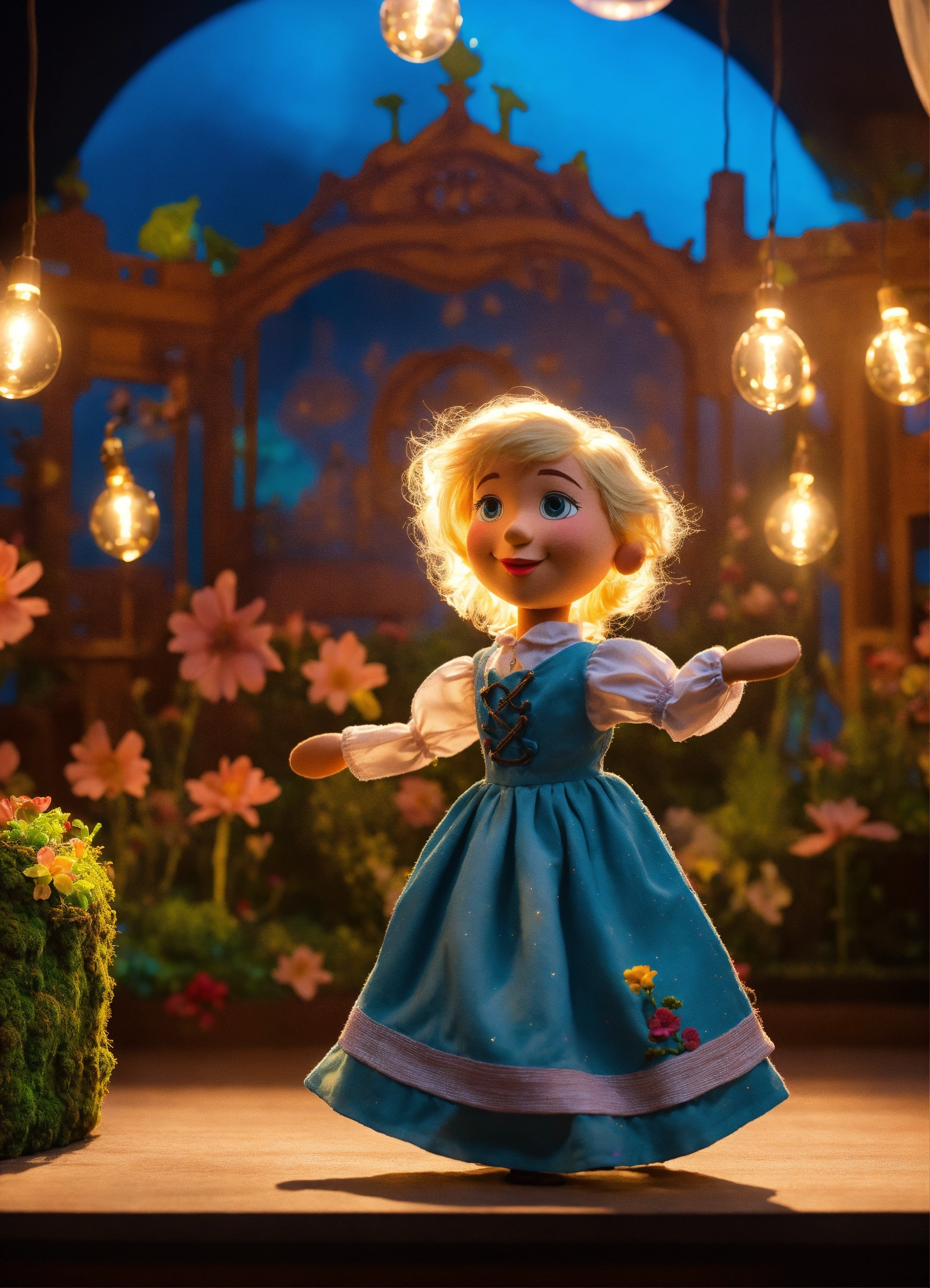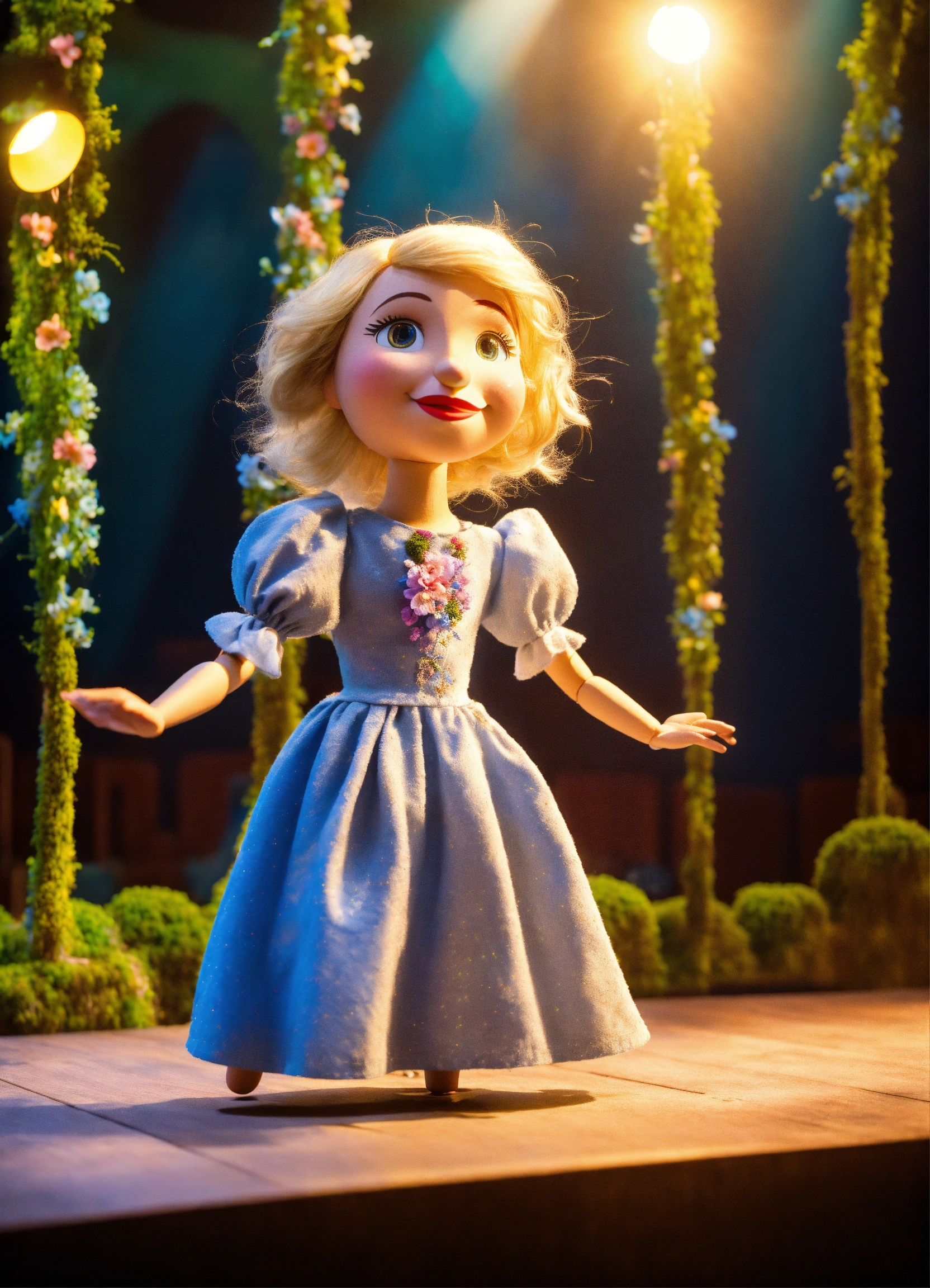 One wooden puppet, a blond-haired girl pixar style, happy, dressed with a dress, on a theater stage with a beautiful light, surrounded by a blue sky and flower land. ta beautiful light theater stage cinematic lighting, ultra 4k hd, illuminated by irridescent moss