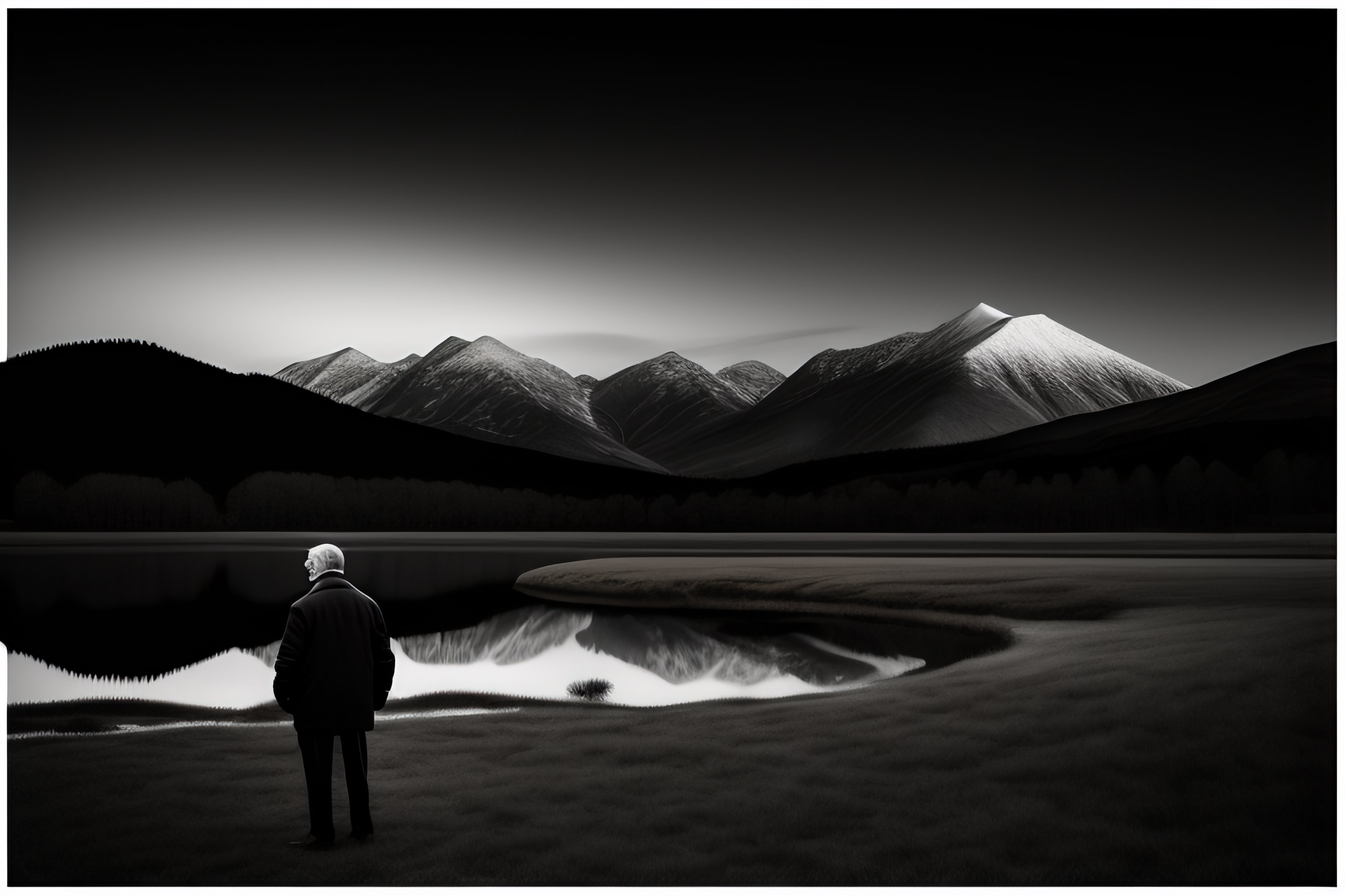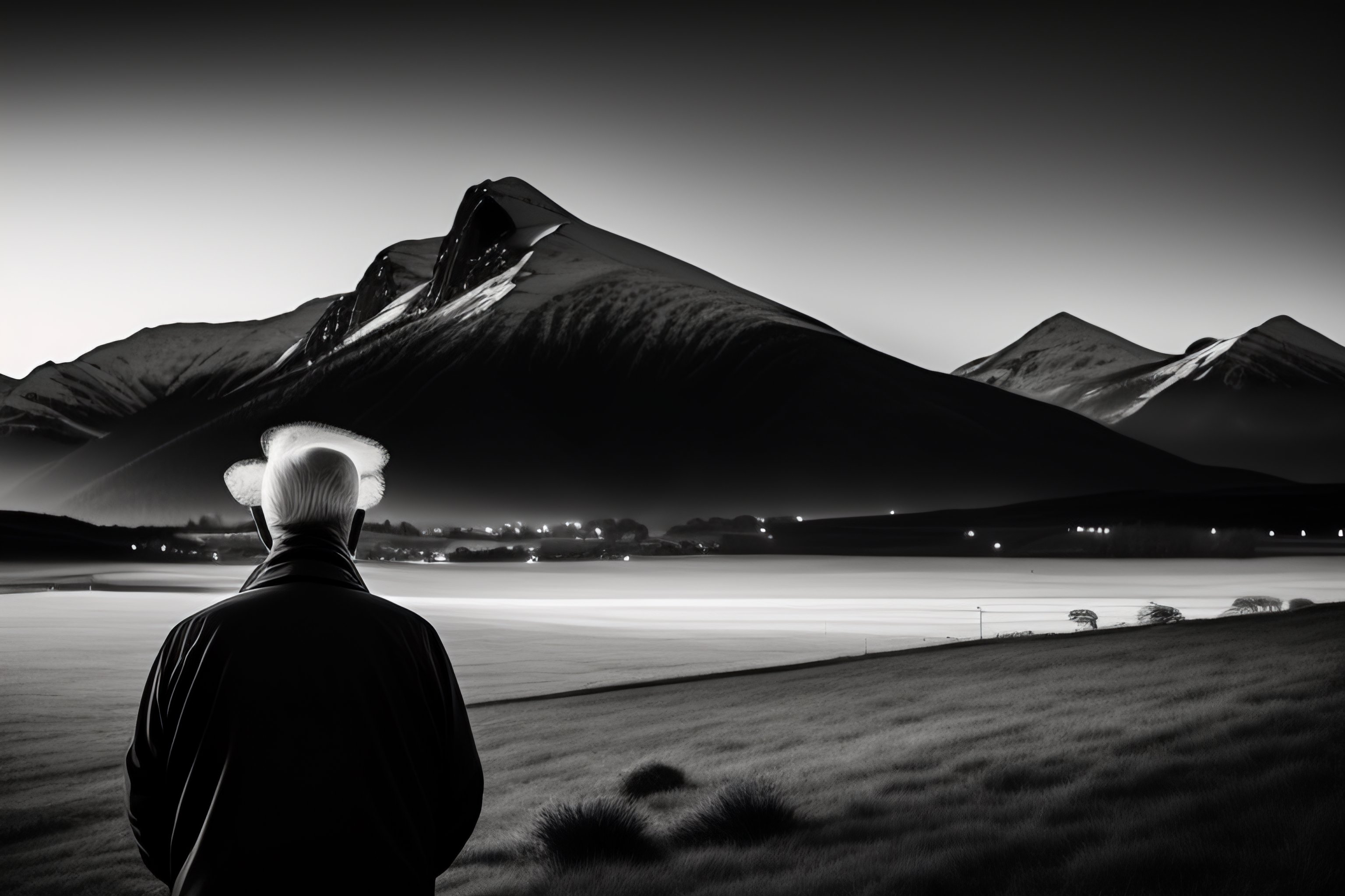 Fine-art black and white photography of an old man standing, back to the camera, looking at a wild mountains at night
