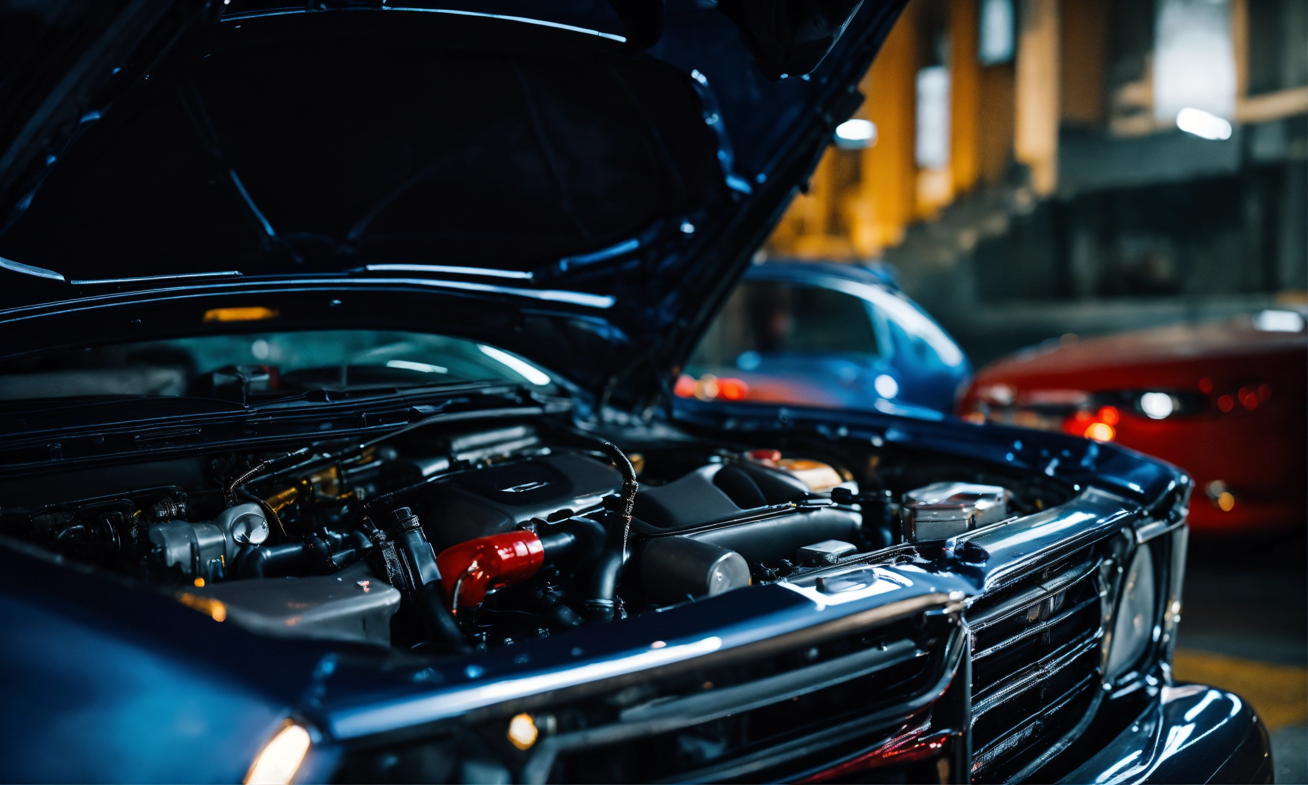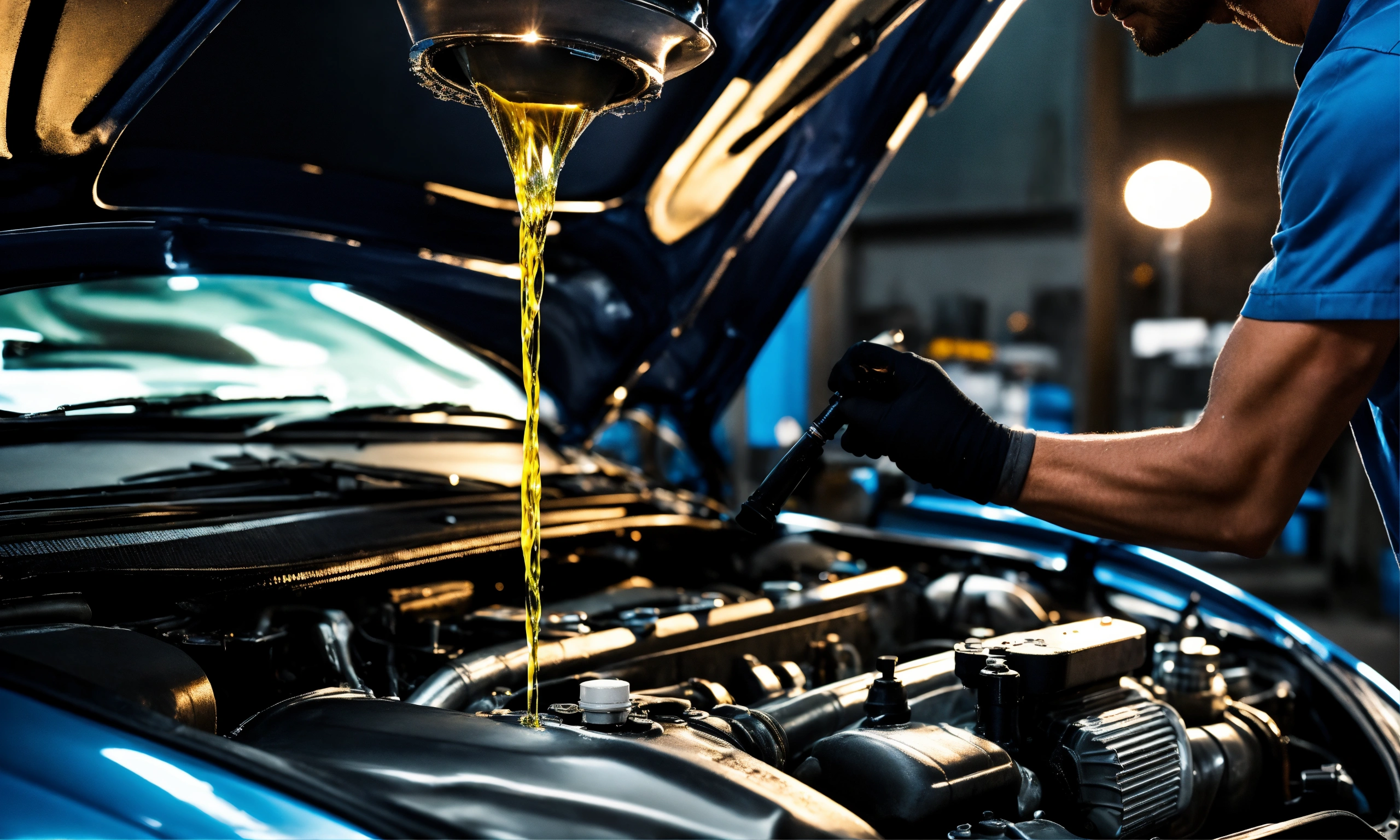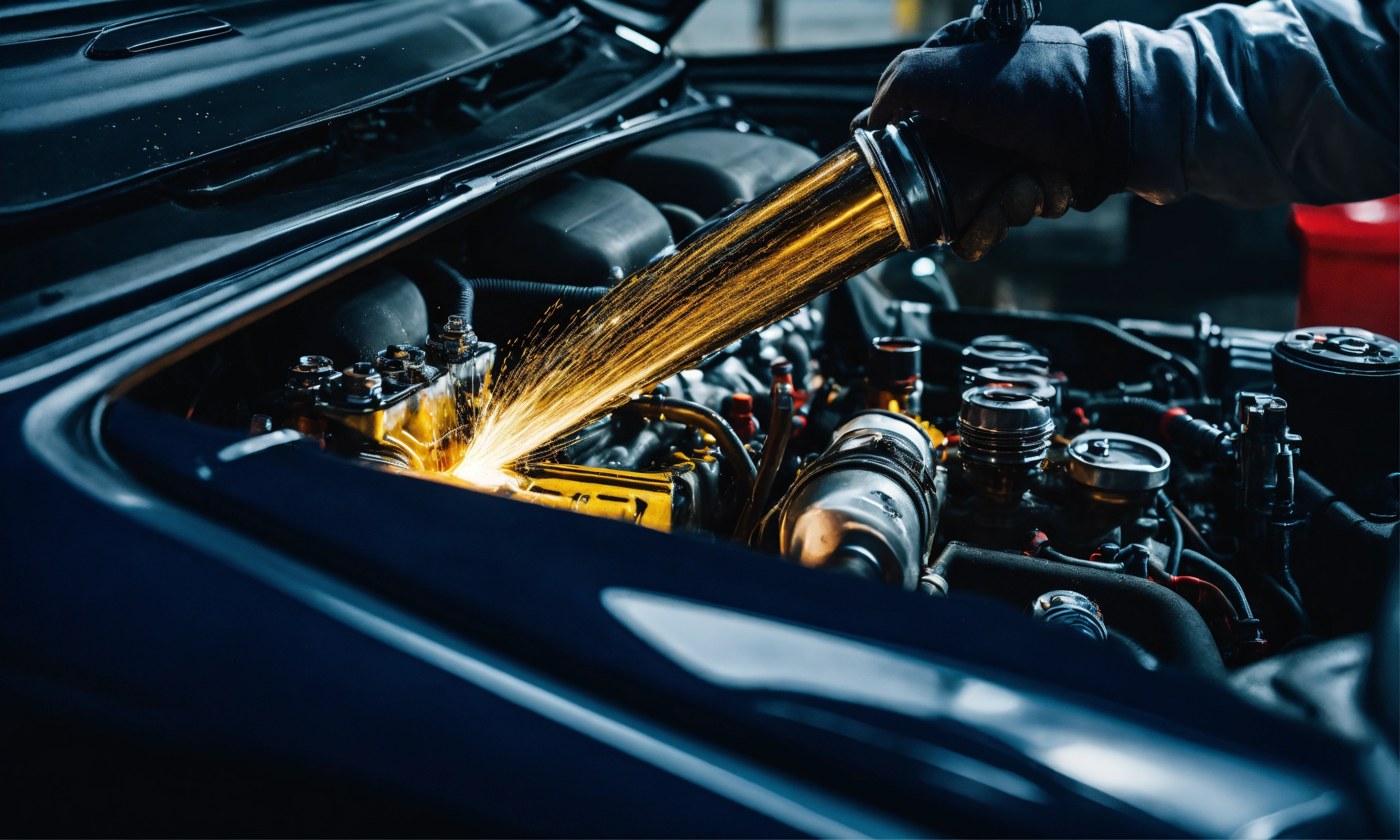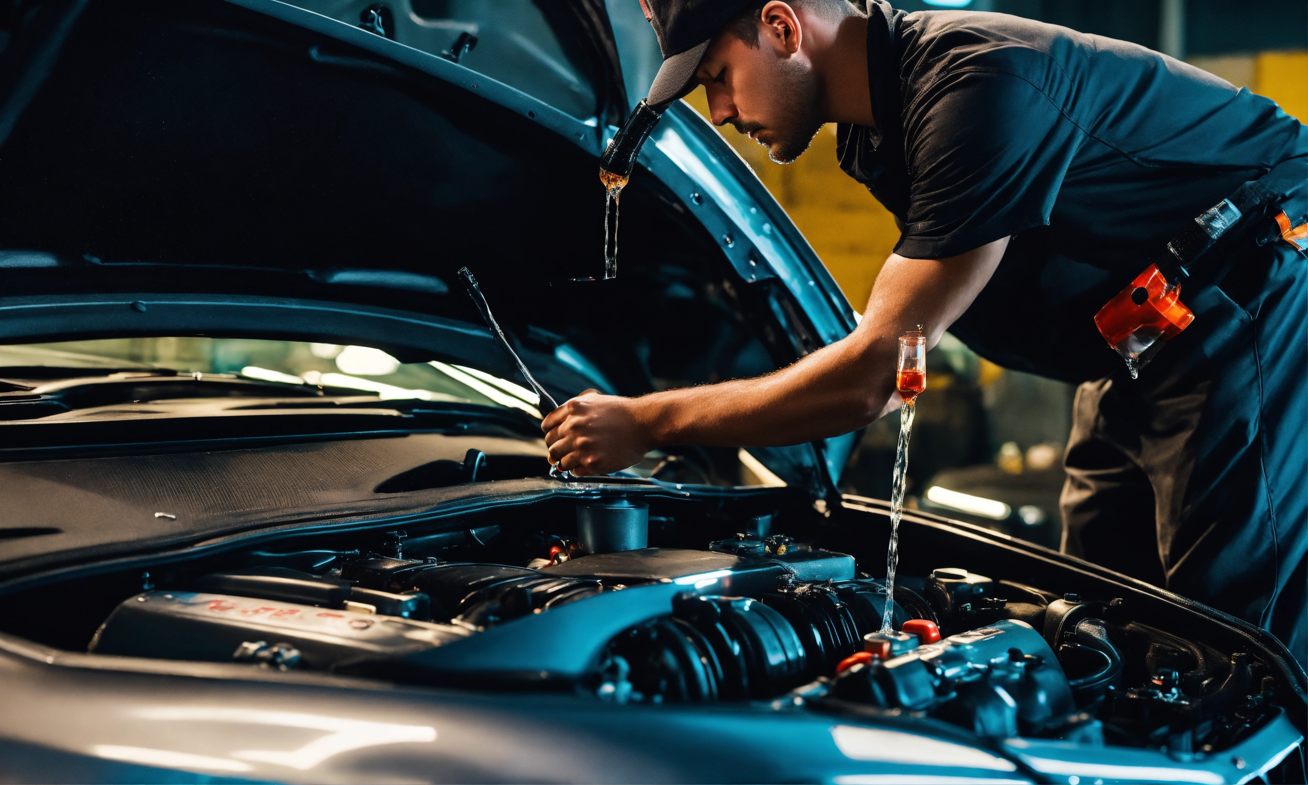 A mechanic pouring liquid into a car engine, captured in a close-up shot with the car's hood open. the photograph should have nighttime lighting, be in ultra-high 4k resolution, and exude a cinematic poster-quality feel