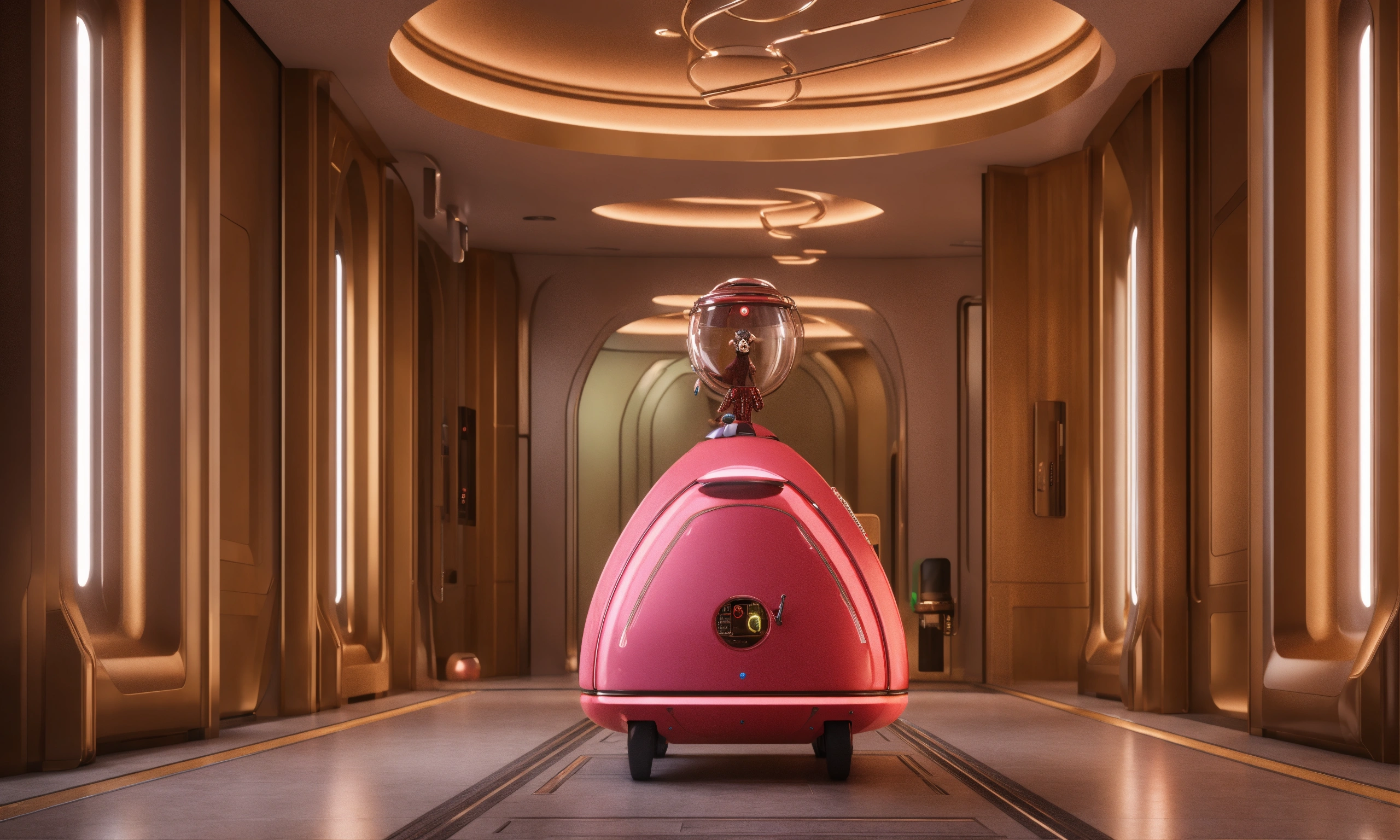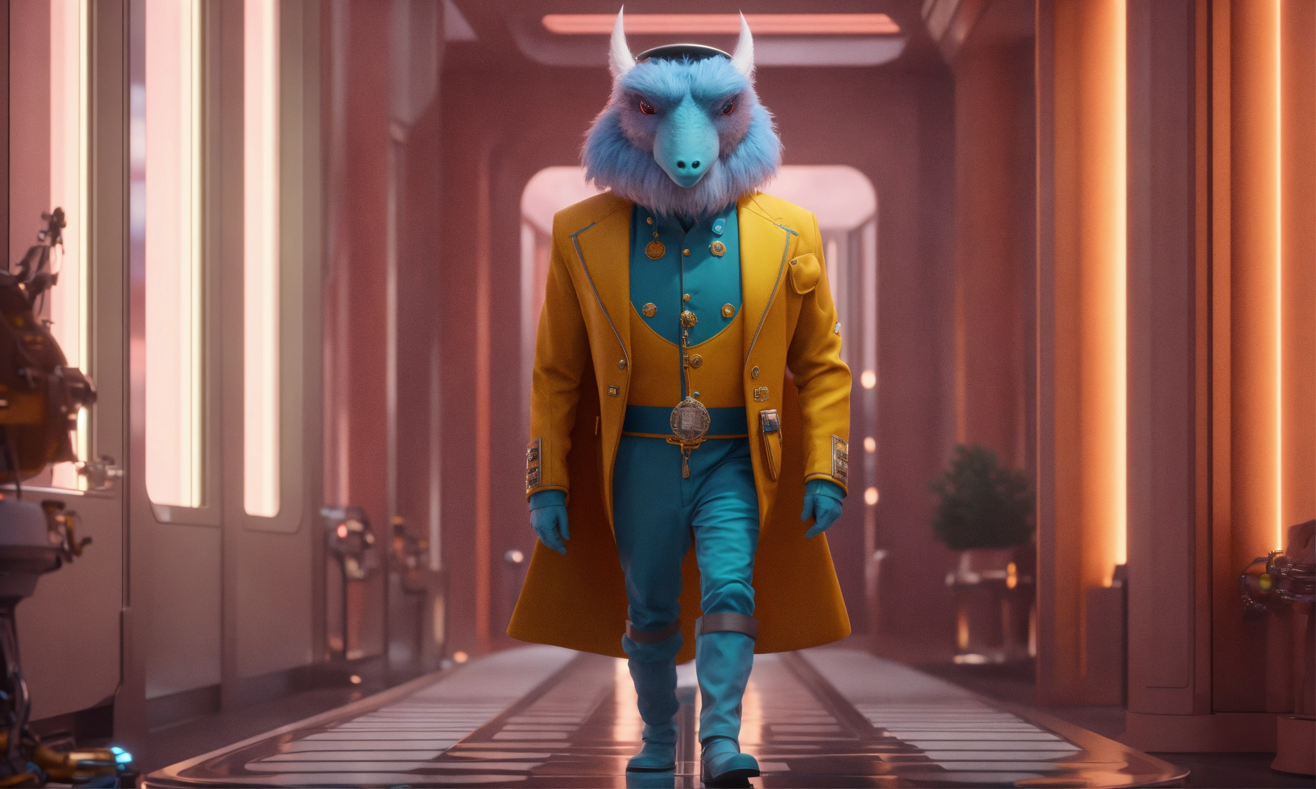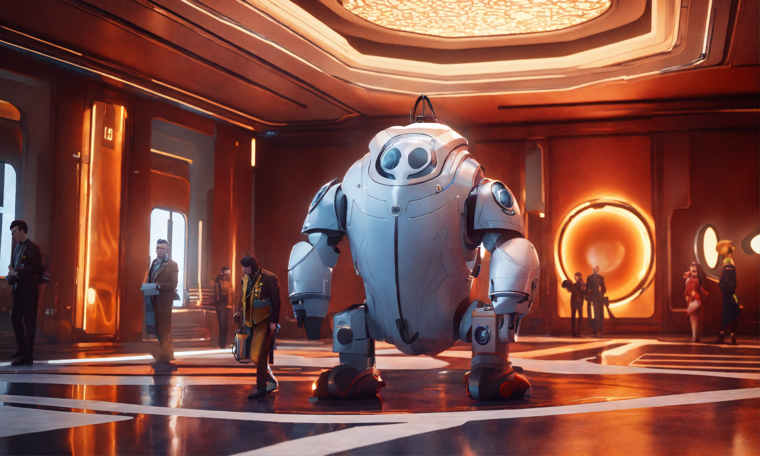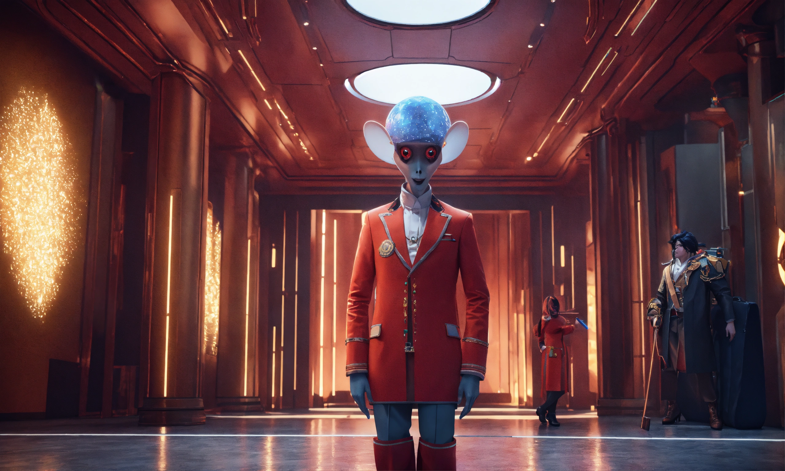 A strange pale igor like bellhop creature offers to take your bags at a luxury space, realistic, futuristic, sci-fi, 8k, unreal engine, zaha hadid, 8k realistic, pixar, disney, cartoon, unreal engine, 3d, sci-fi