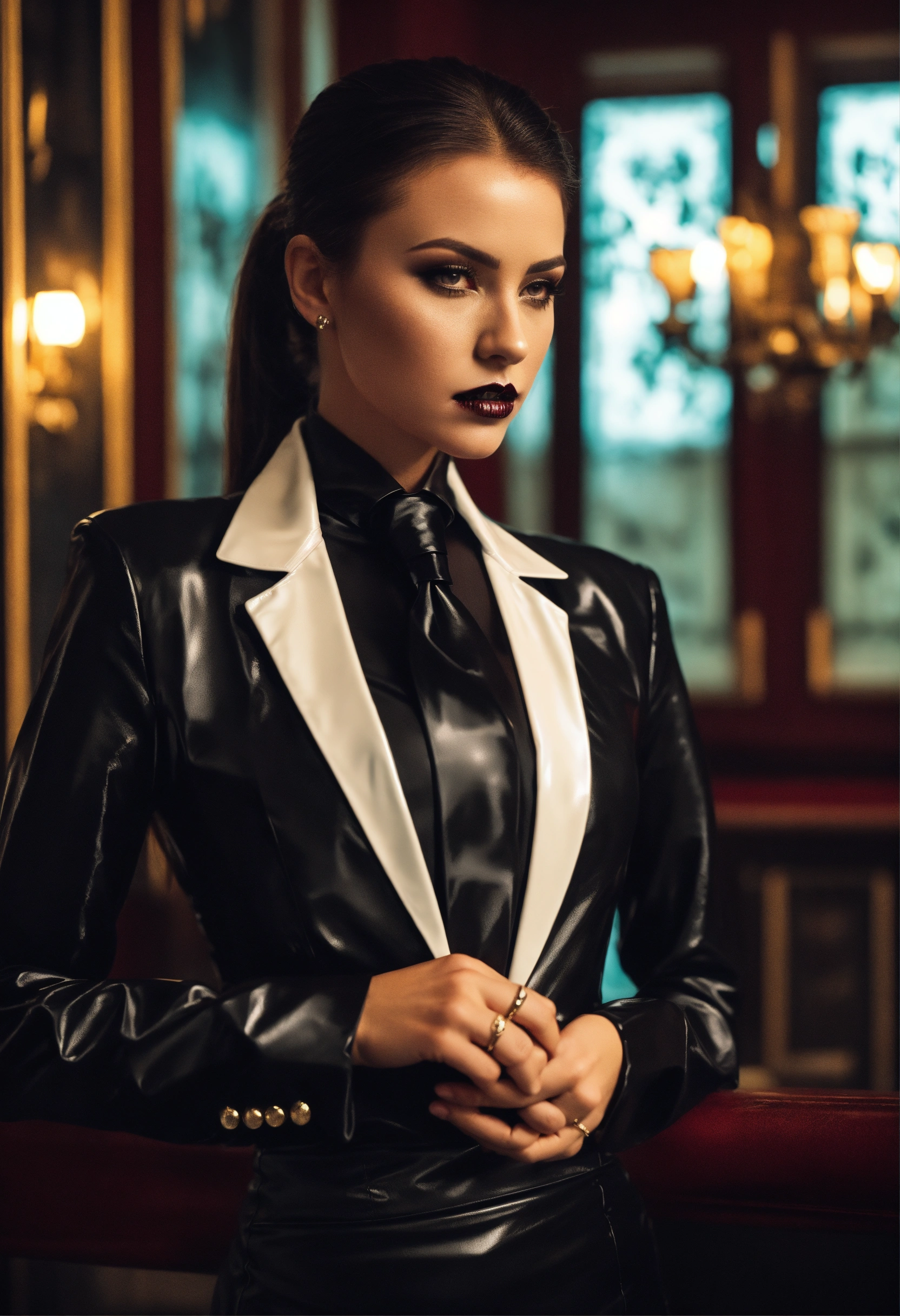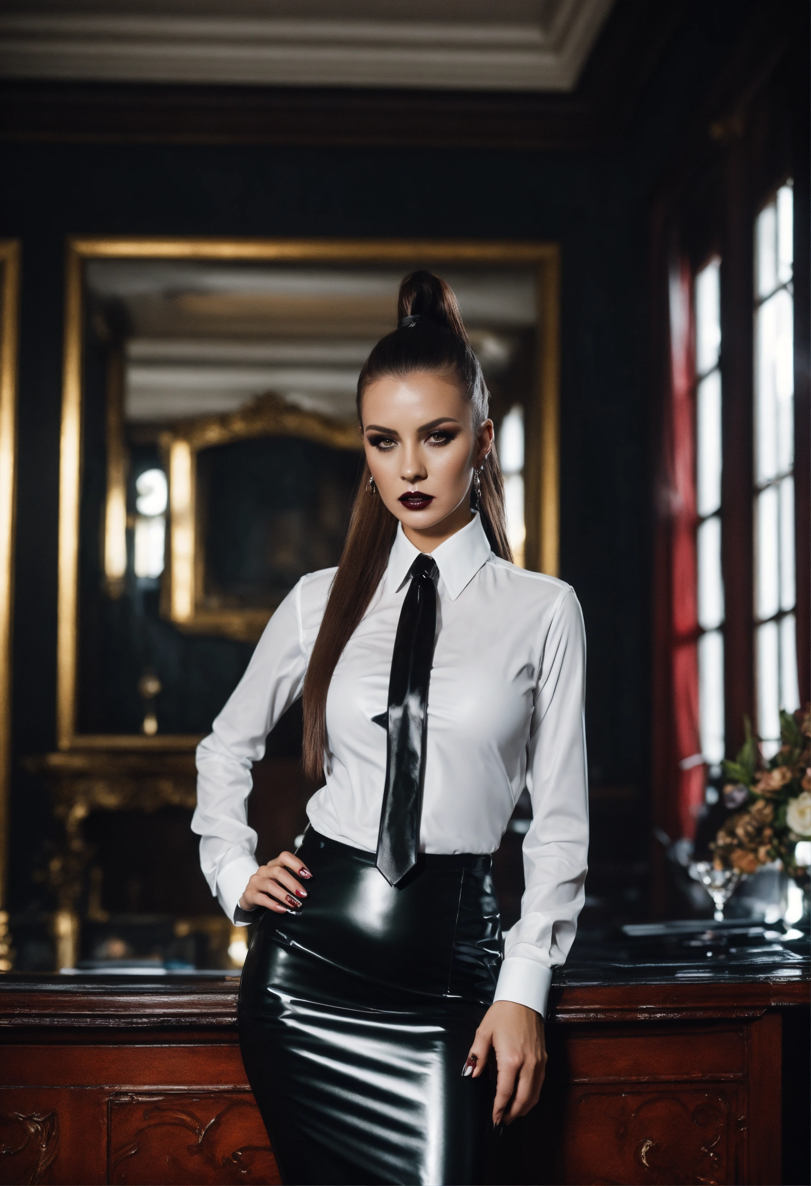 Cinematic style, stunning seductress woman model, straight high ponytail, strict black pvc business blazer, white office shirt with black necktie, black pvc pencil skirt, mansion room, underworld vampire movie look