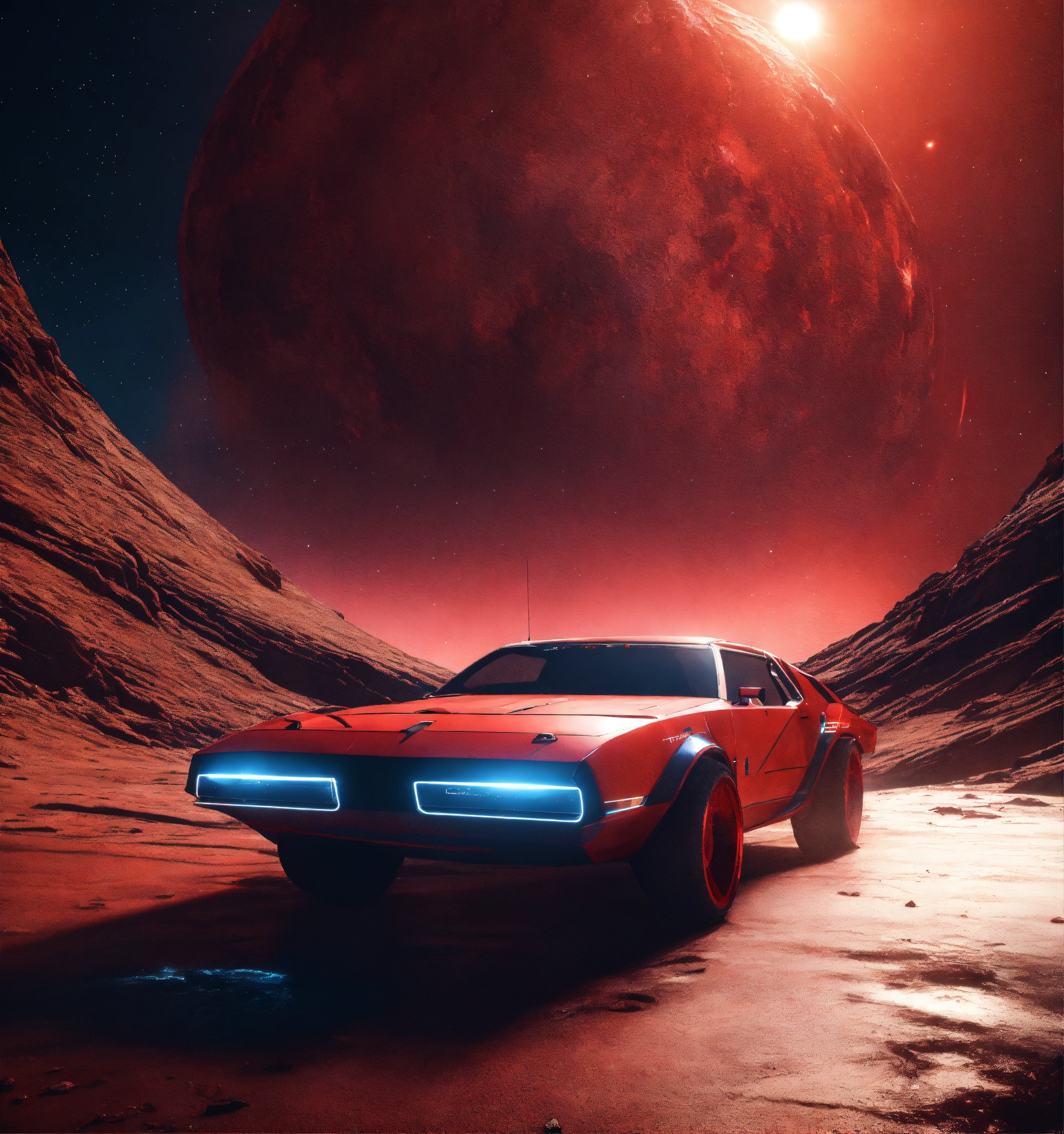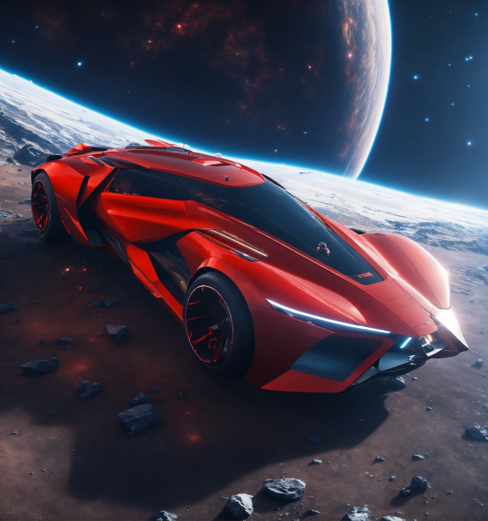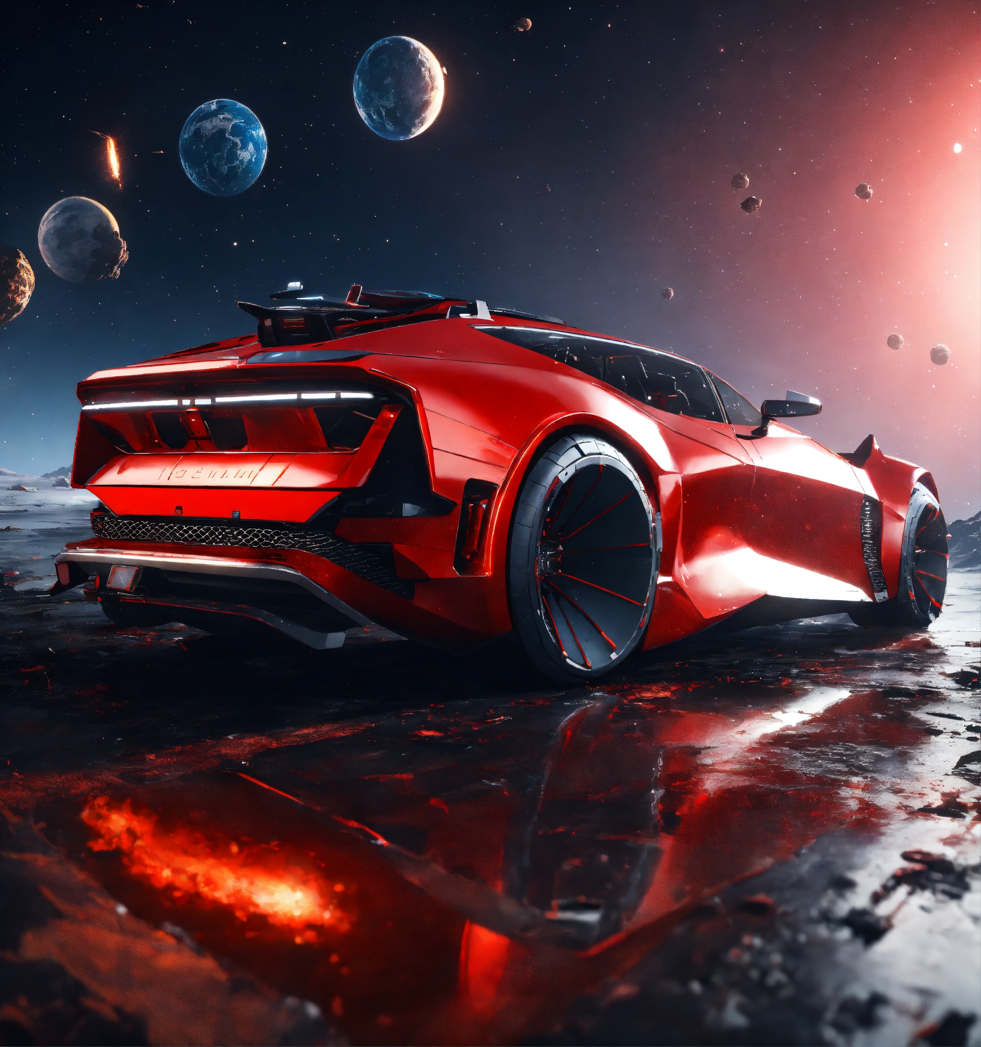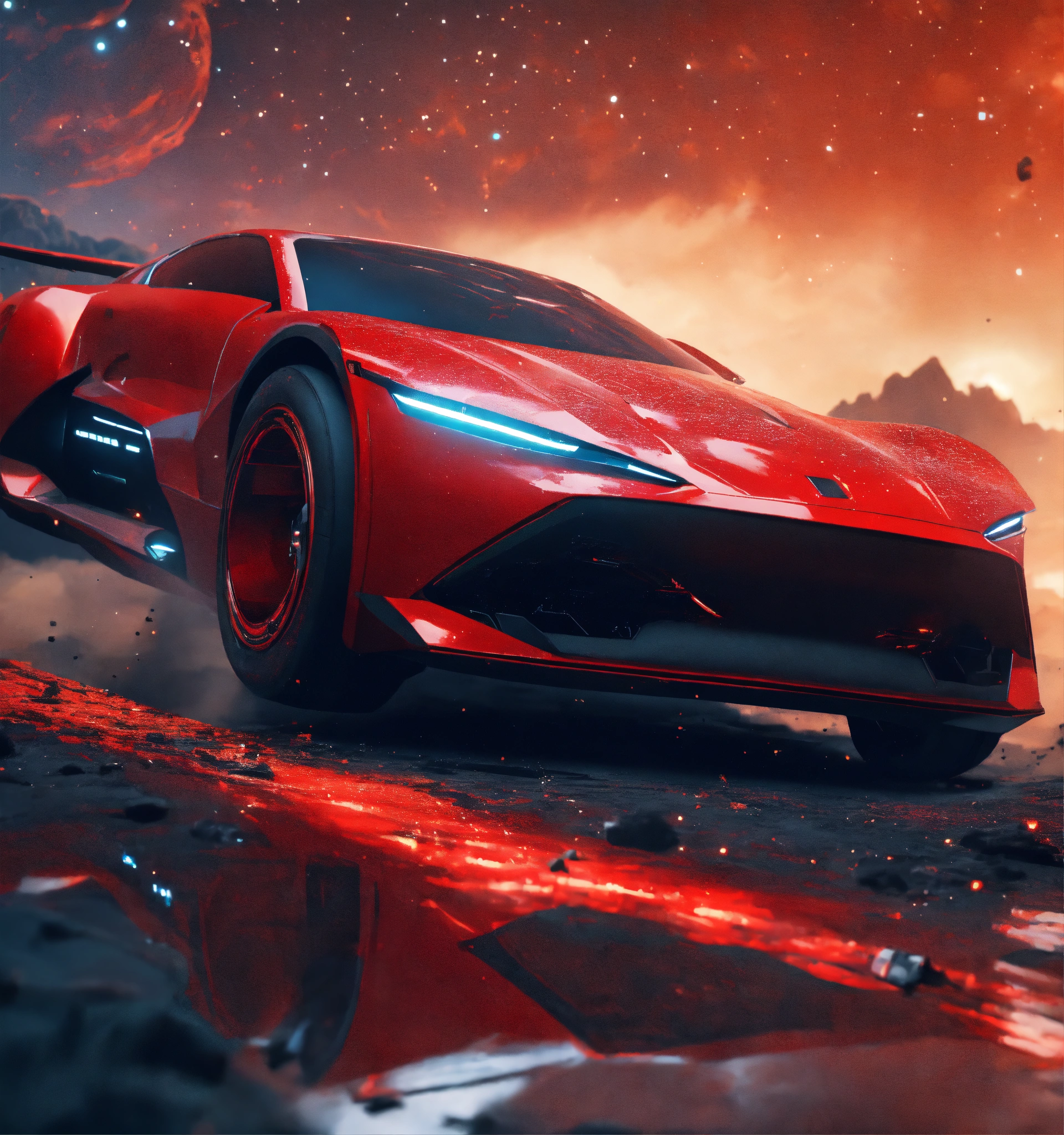 Luxurious sleek red flying beat up futuristic clunker car shooting out in space, future, hi tech, exterior, sci fi, unreal engine, realistic.