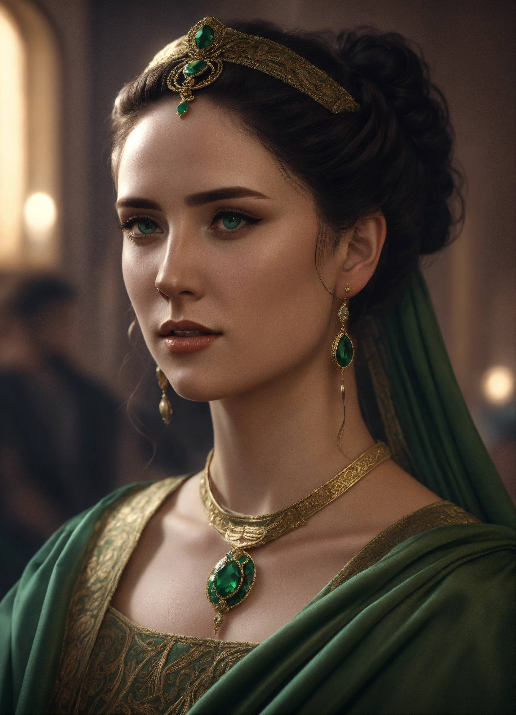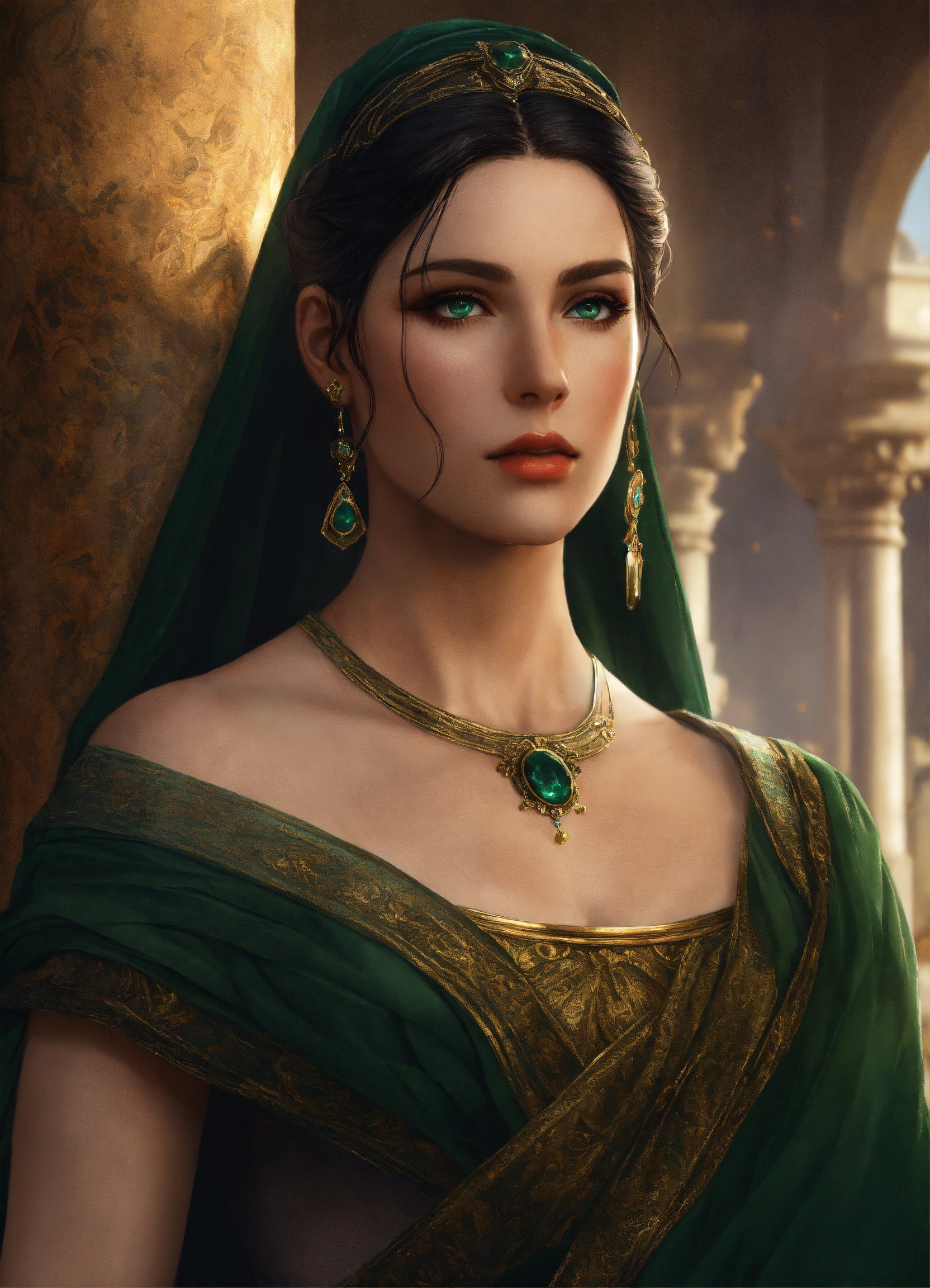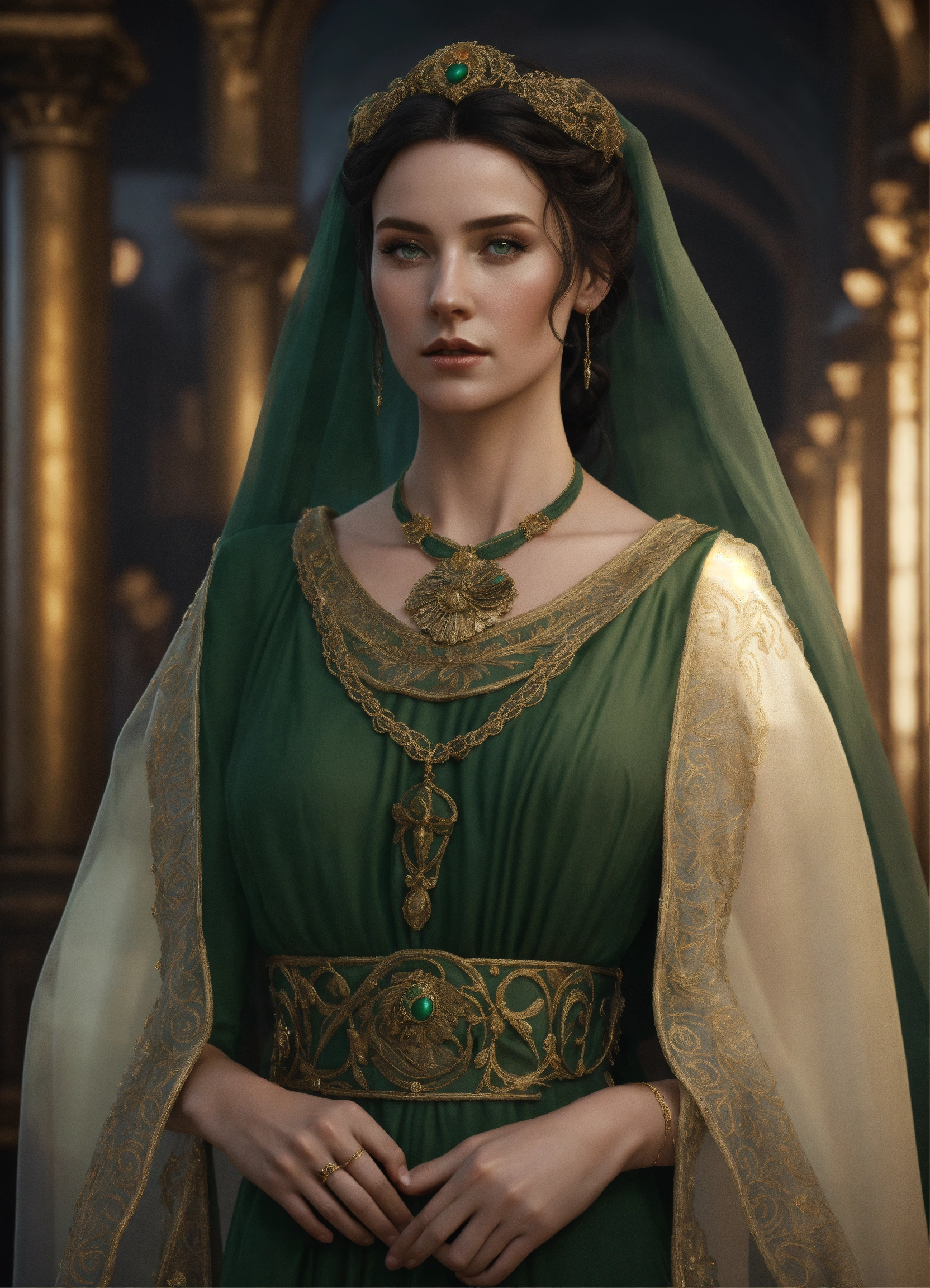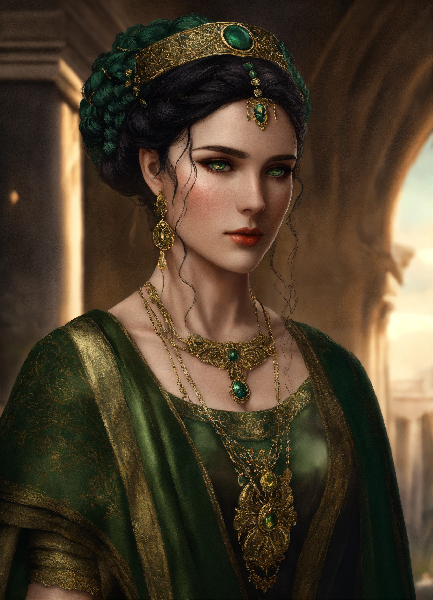 A noble roman woman with dark hair and dark green eyes, hair in bun, she is wearing a roman stola and has a veil on her hair, roman palla, 50 years, in the style of eve ventrue, hyperdetailed, realistic, 8k.