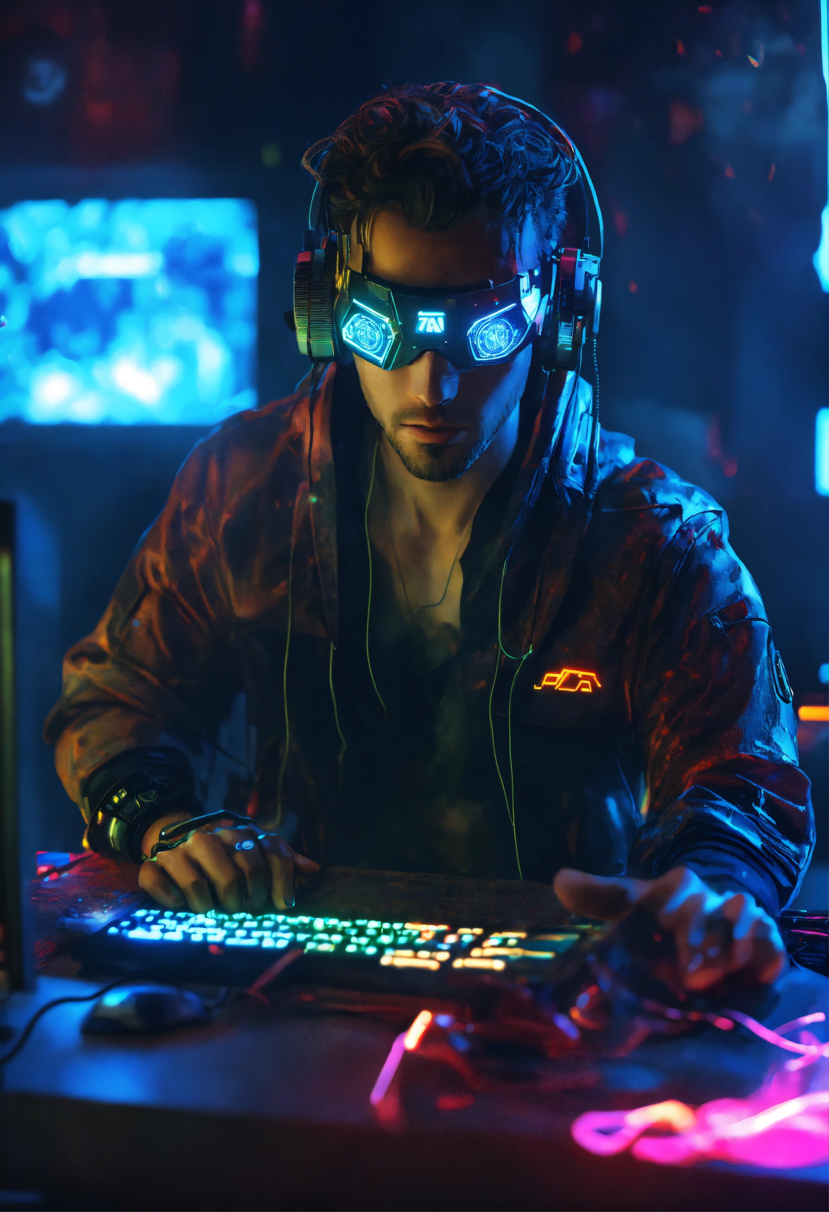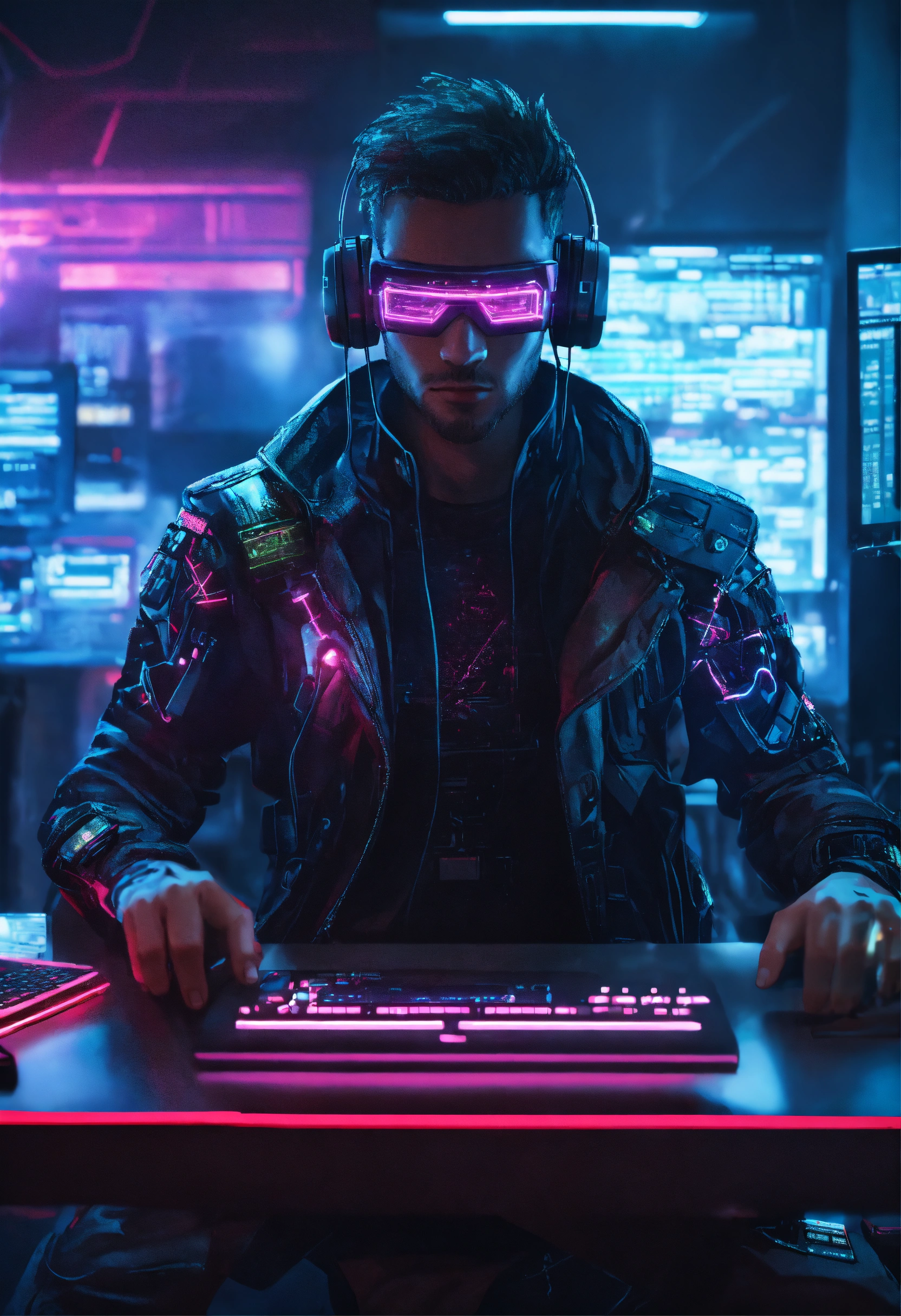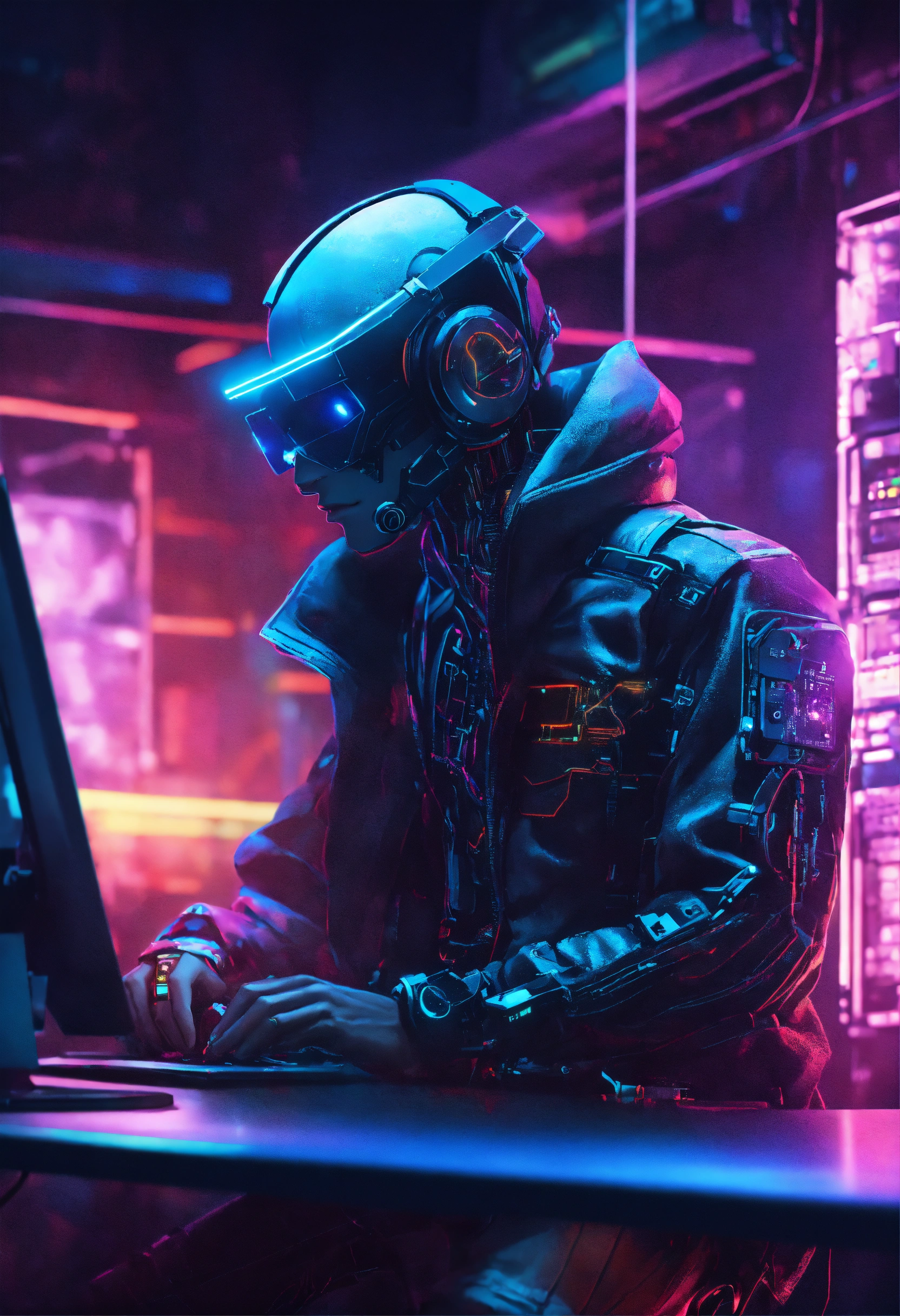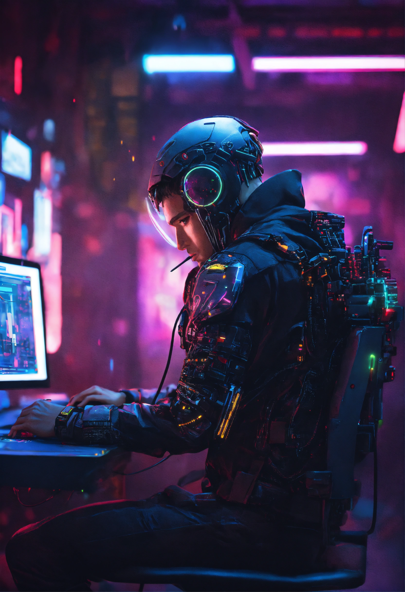 A cyberpunk hacker, half robot half human using a computer, lightening coming from his eyes, security room, cyberpunk style, 8k, hyper realistic, neon lights, half body, hyper-detailed, volumetric lighting