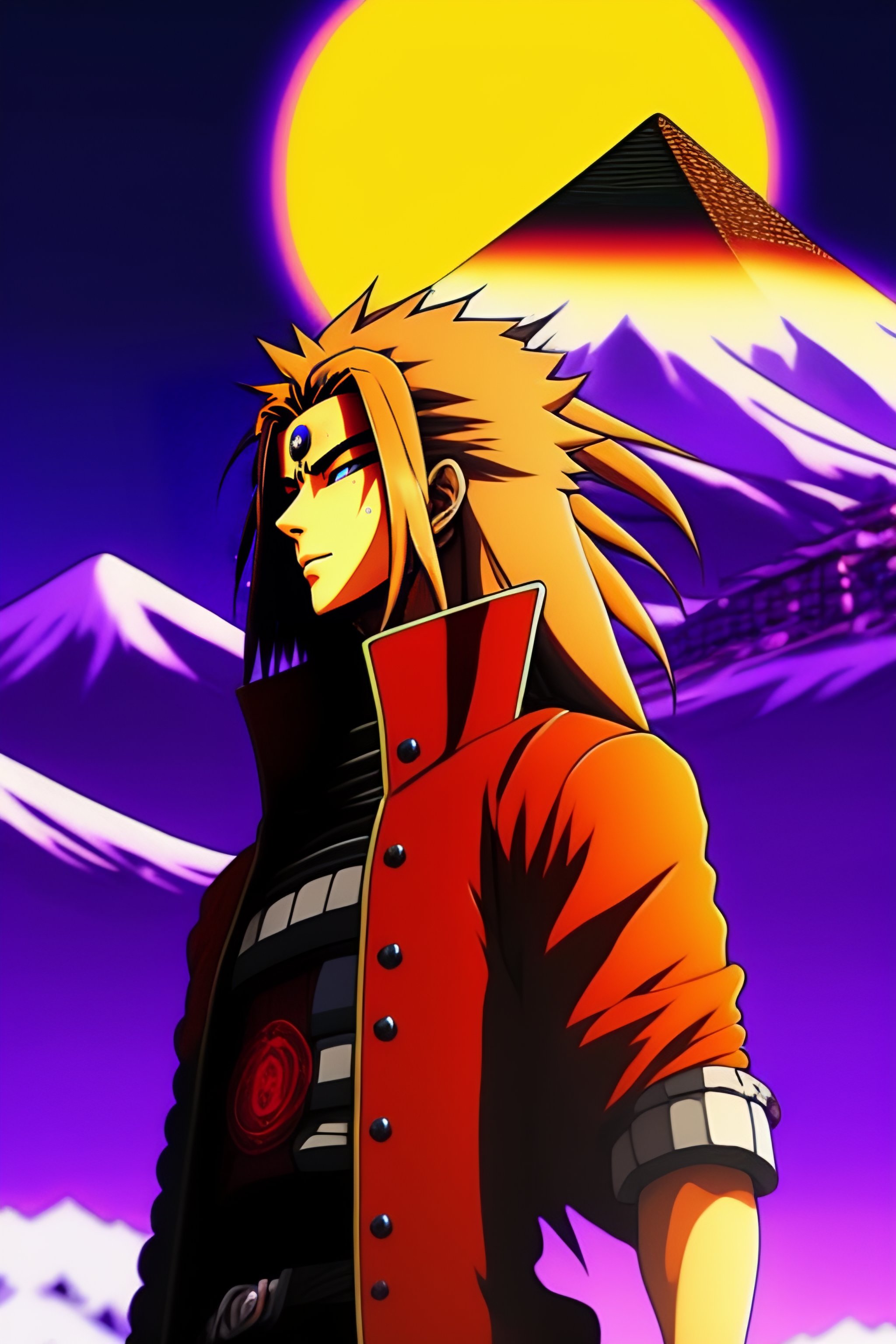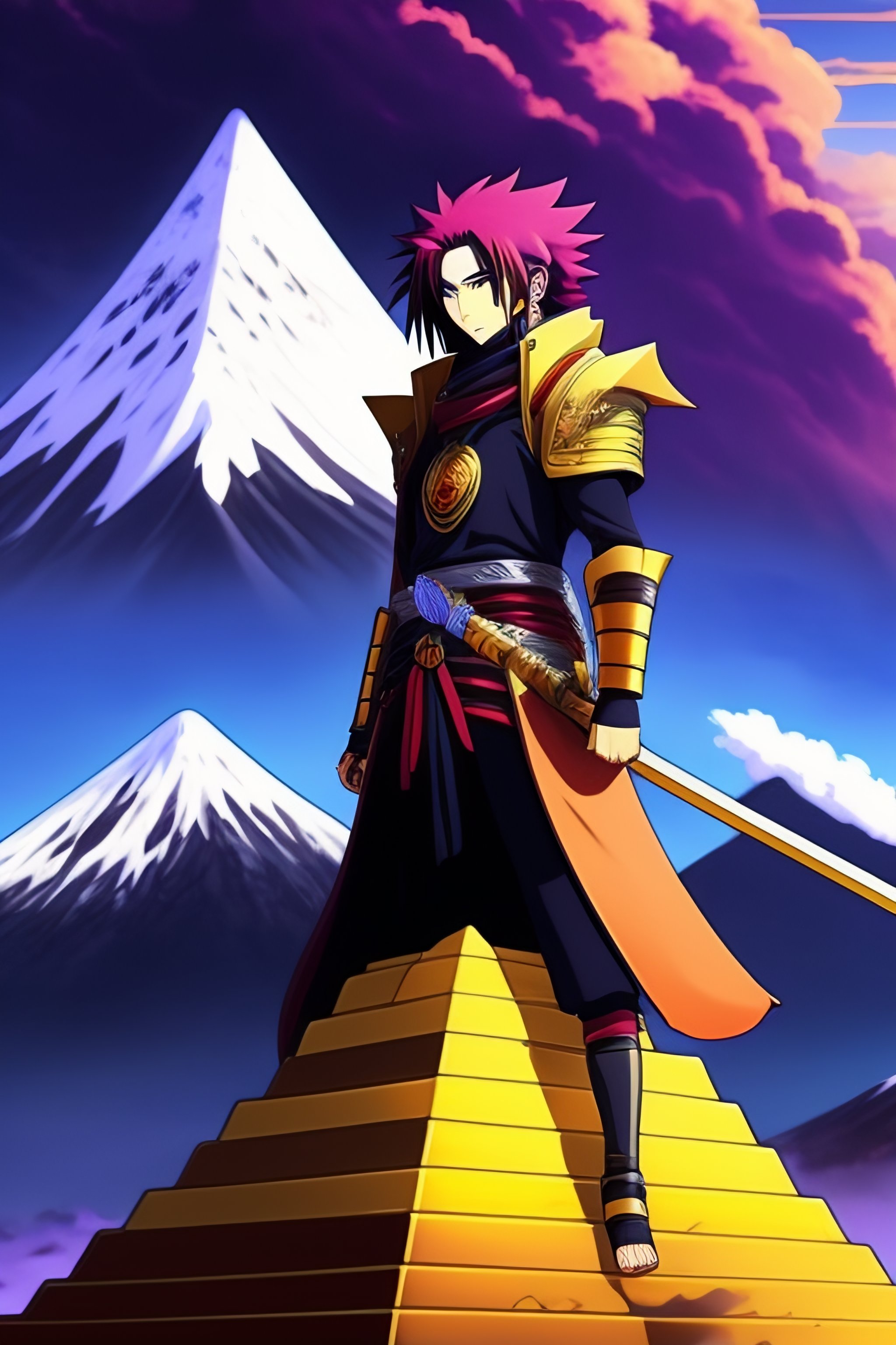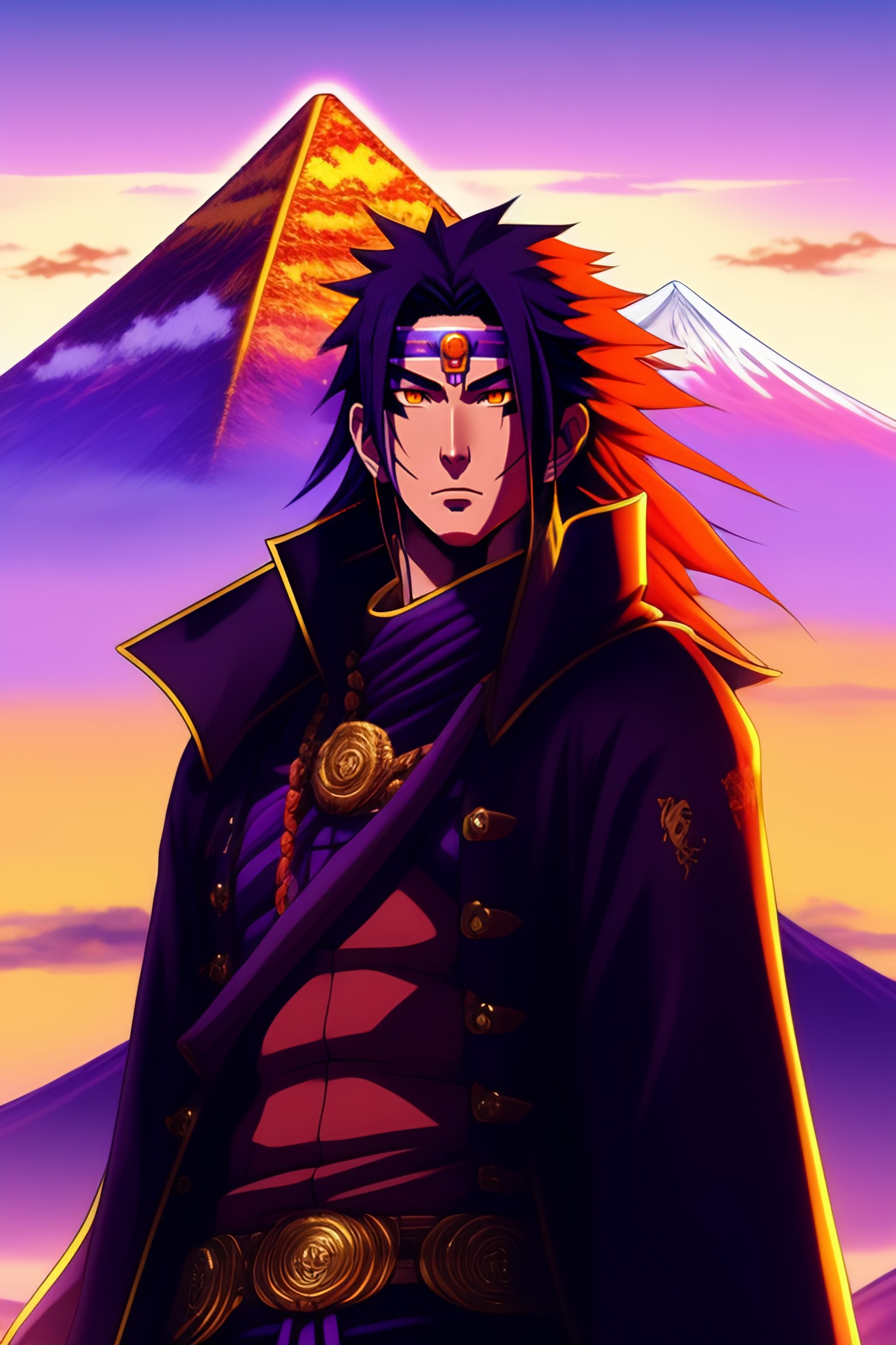 Uchiha madara, battle scar on eye, long golden spiky hair, masashi kishimoto art style, mount fuji in background, golden pyramid on top, purple black lightning rods shooting from sky, cartoon style