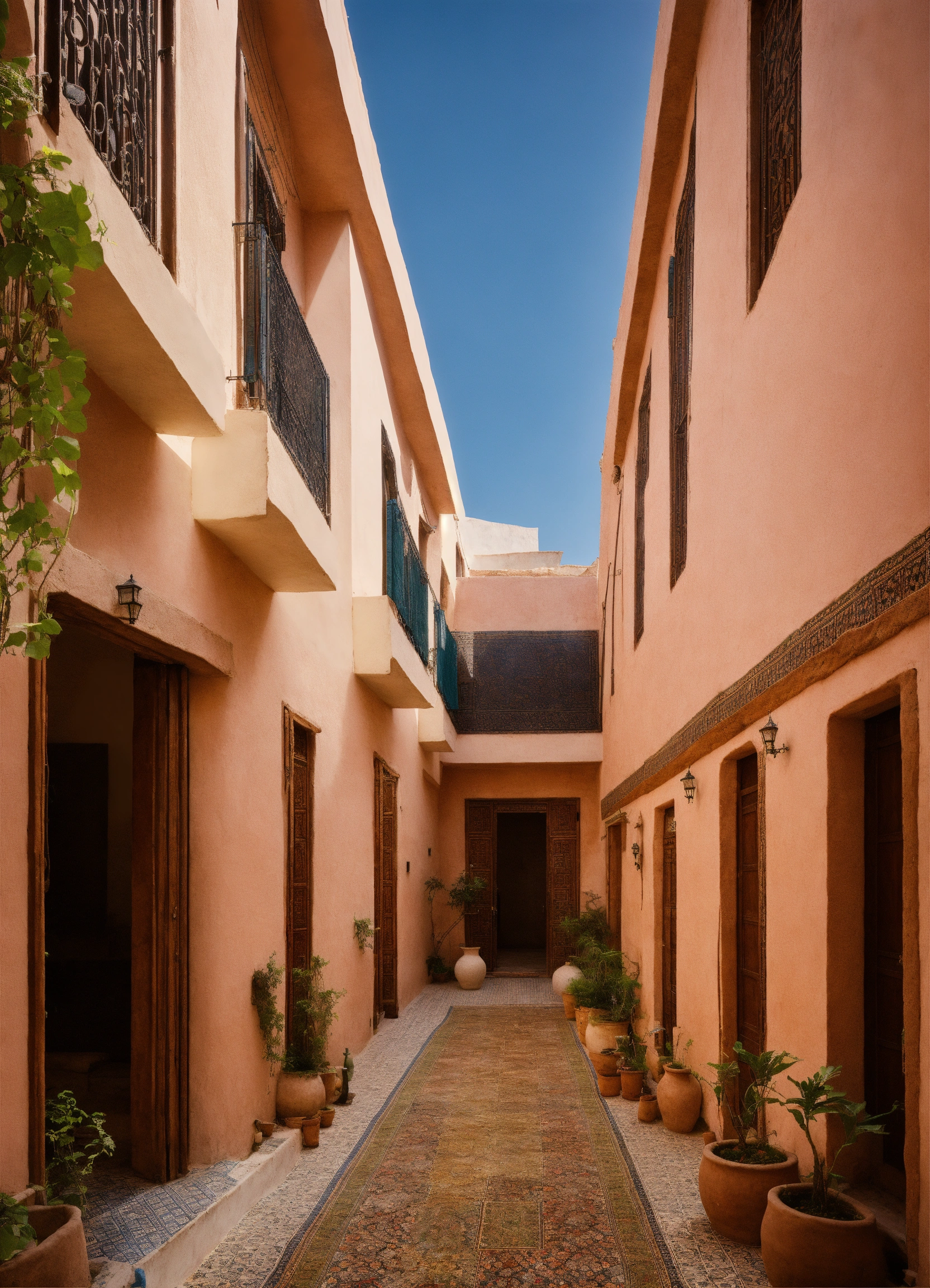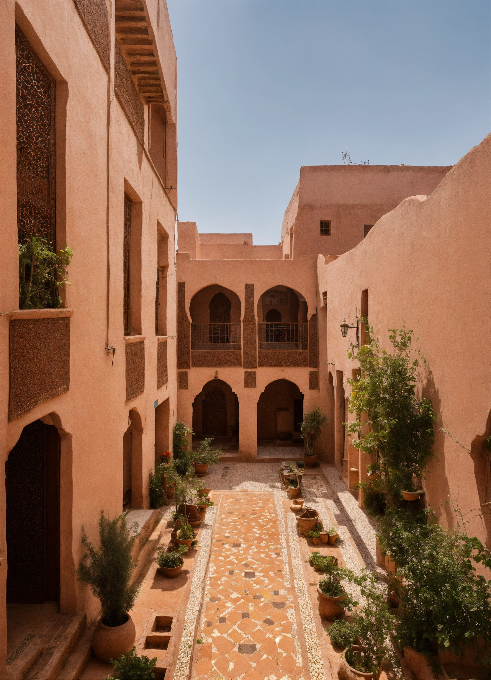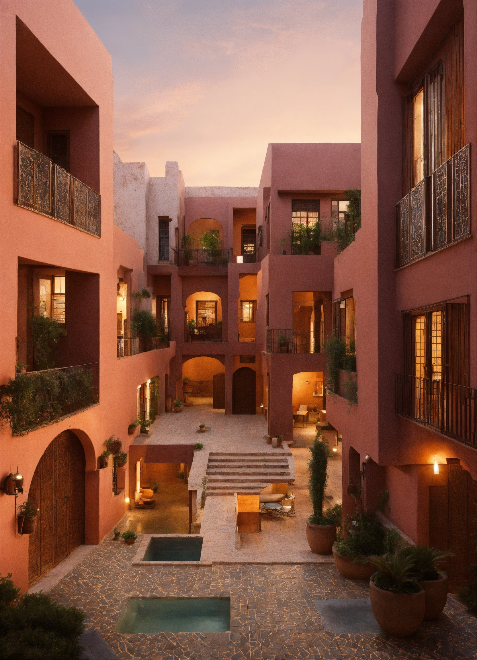 A residential mix used development, with low rise buildings, with small windows, central courtyards, in morroco