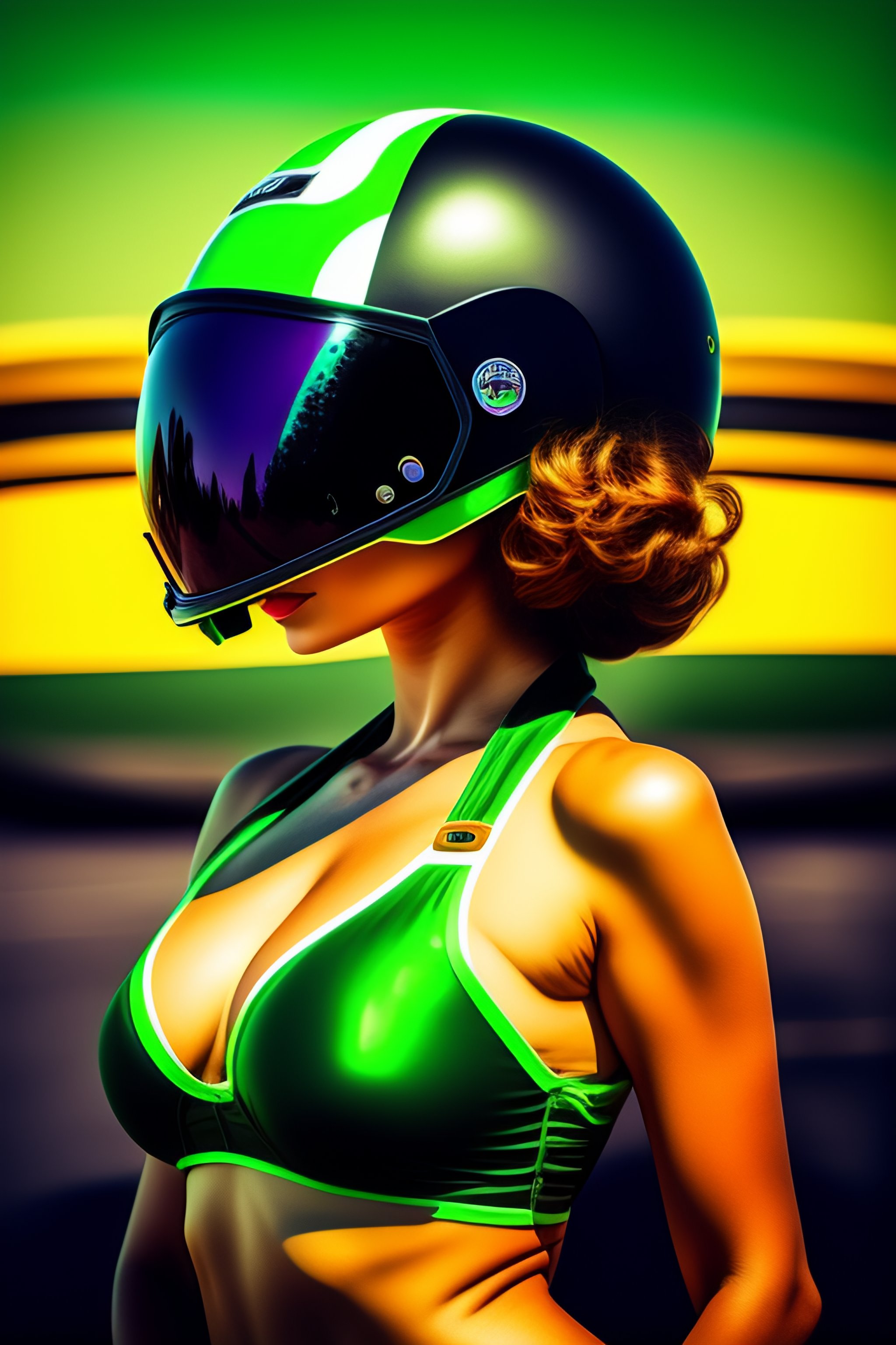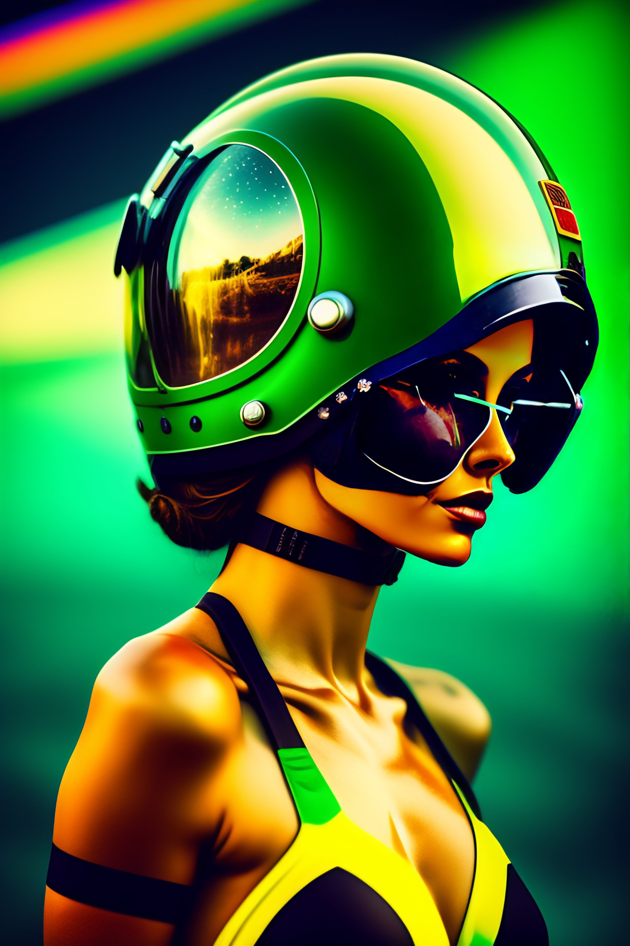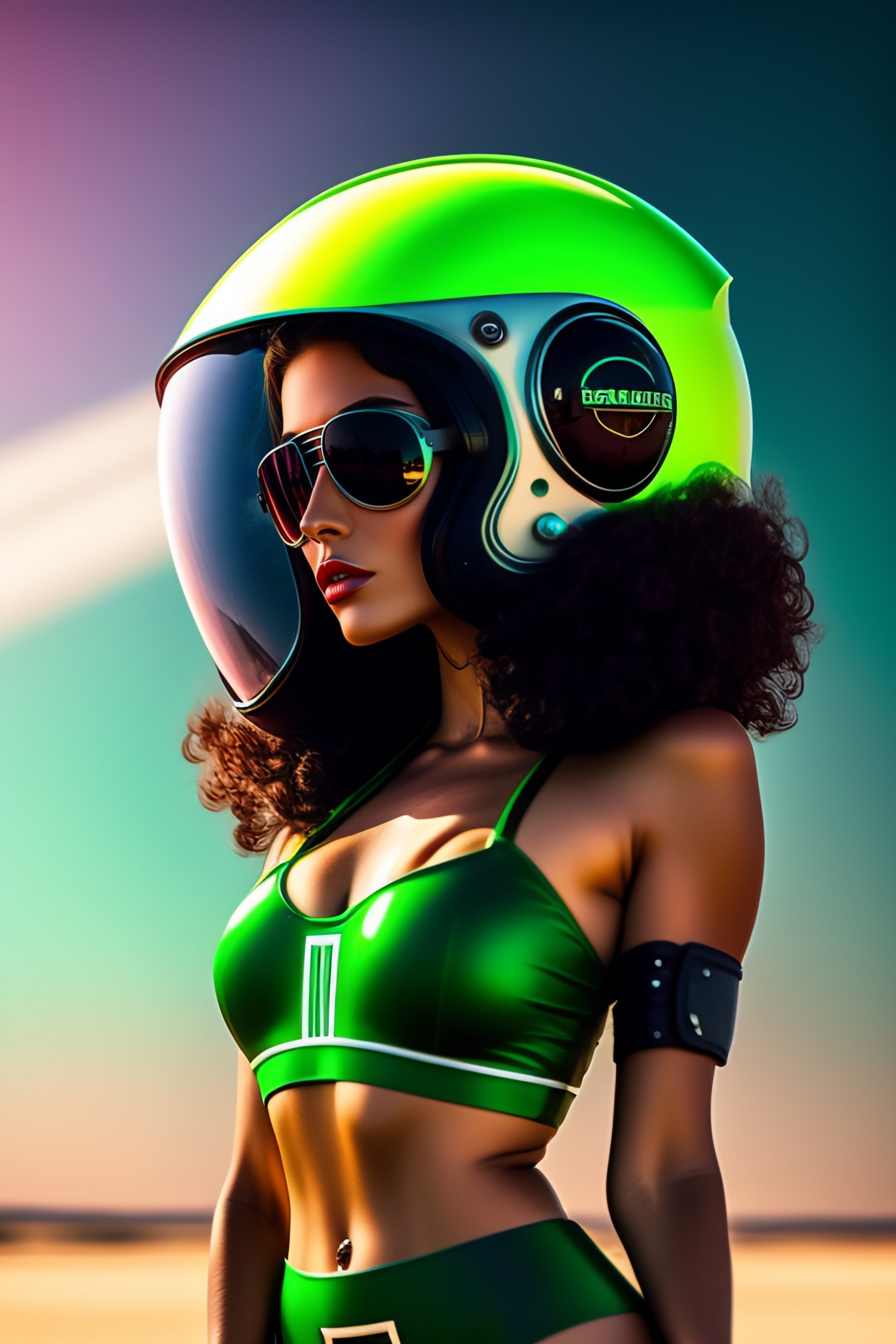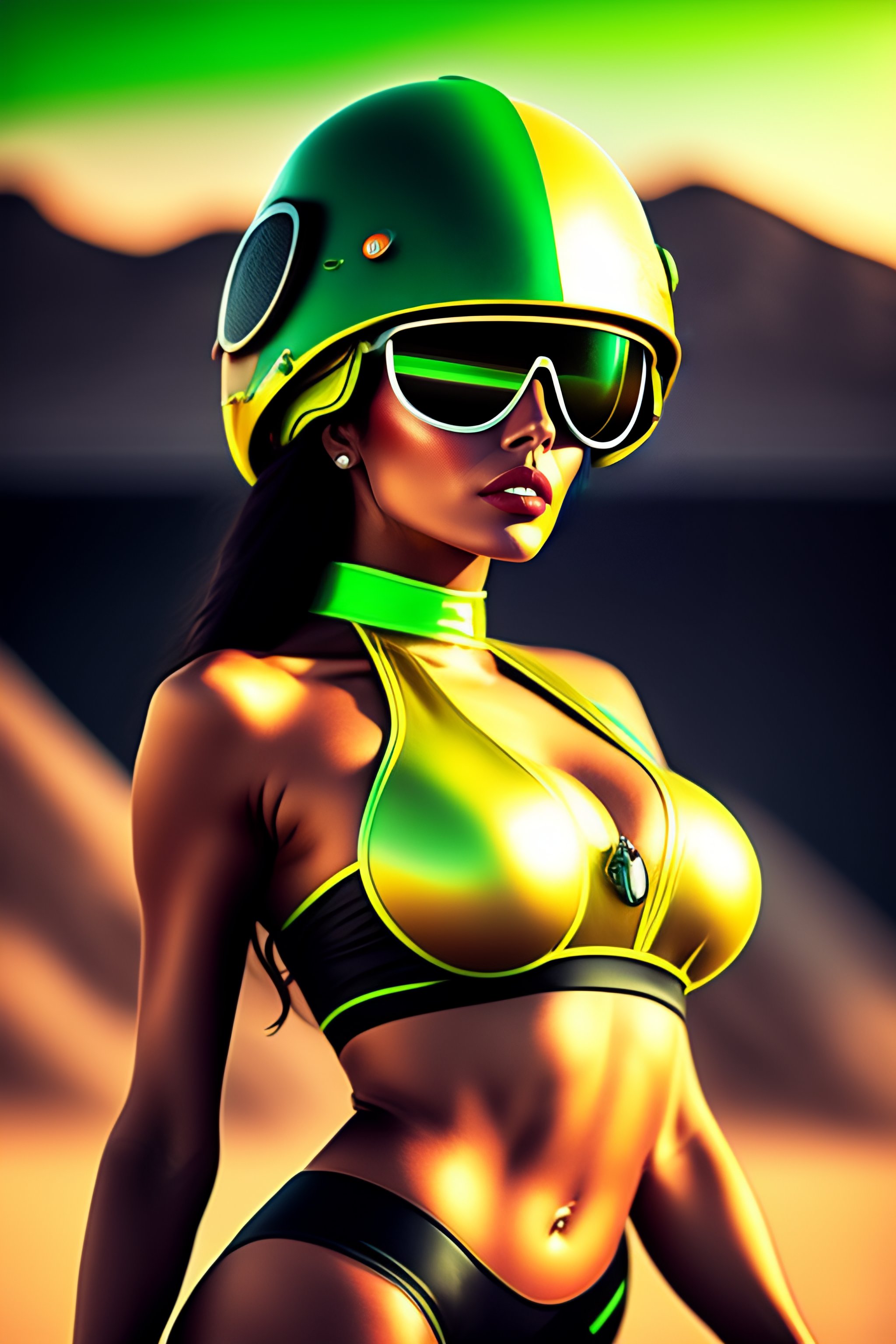 Pilot girl, in pilot helmet and green bikini, alien stripe, spaceport in background, retrofuturistic, retro sci fi art, —test —creative —ar 2:3