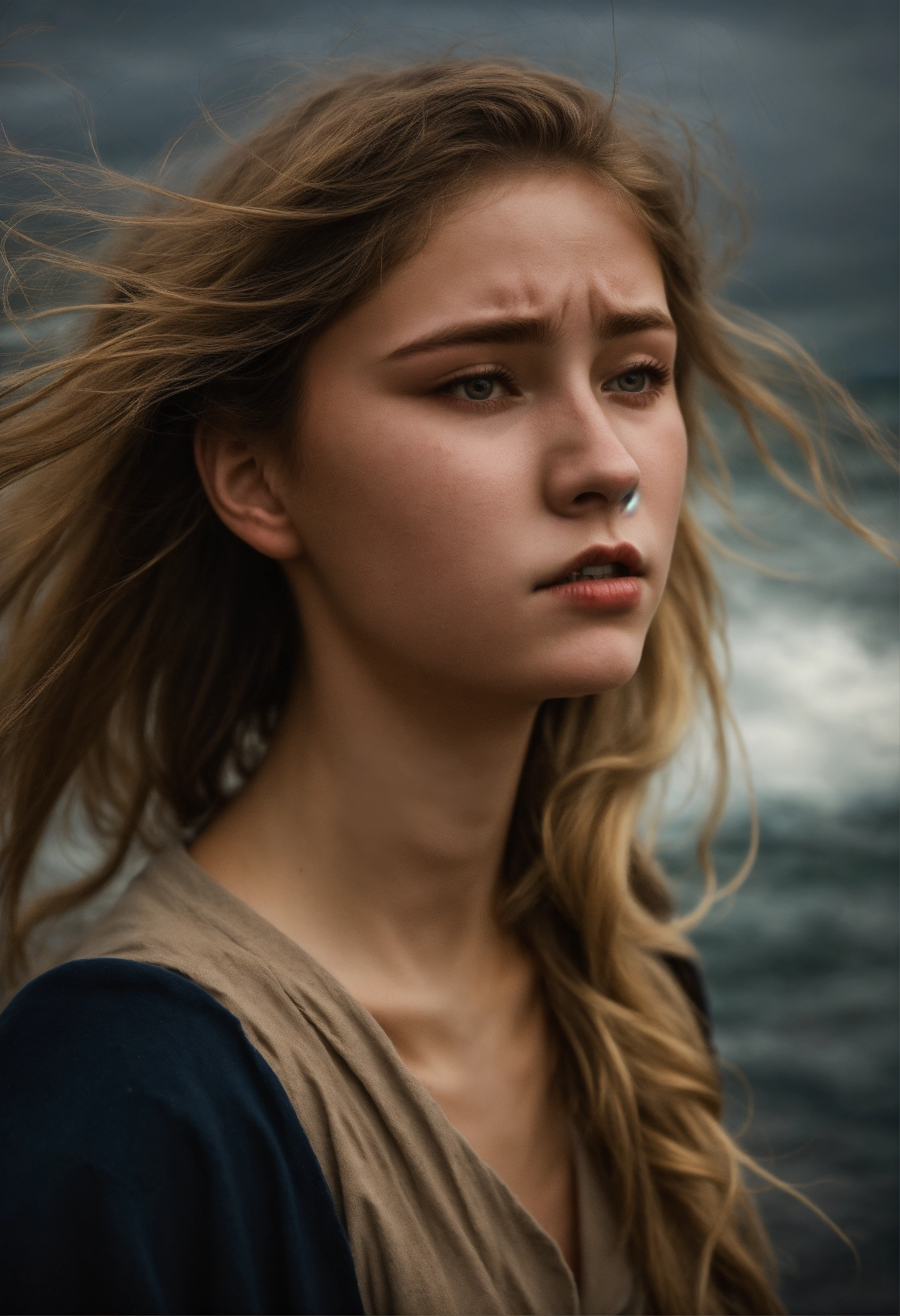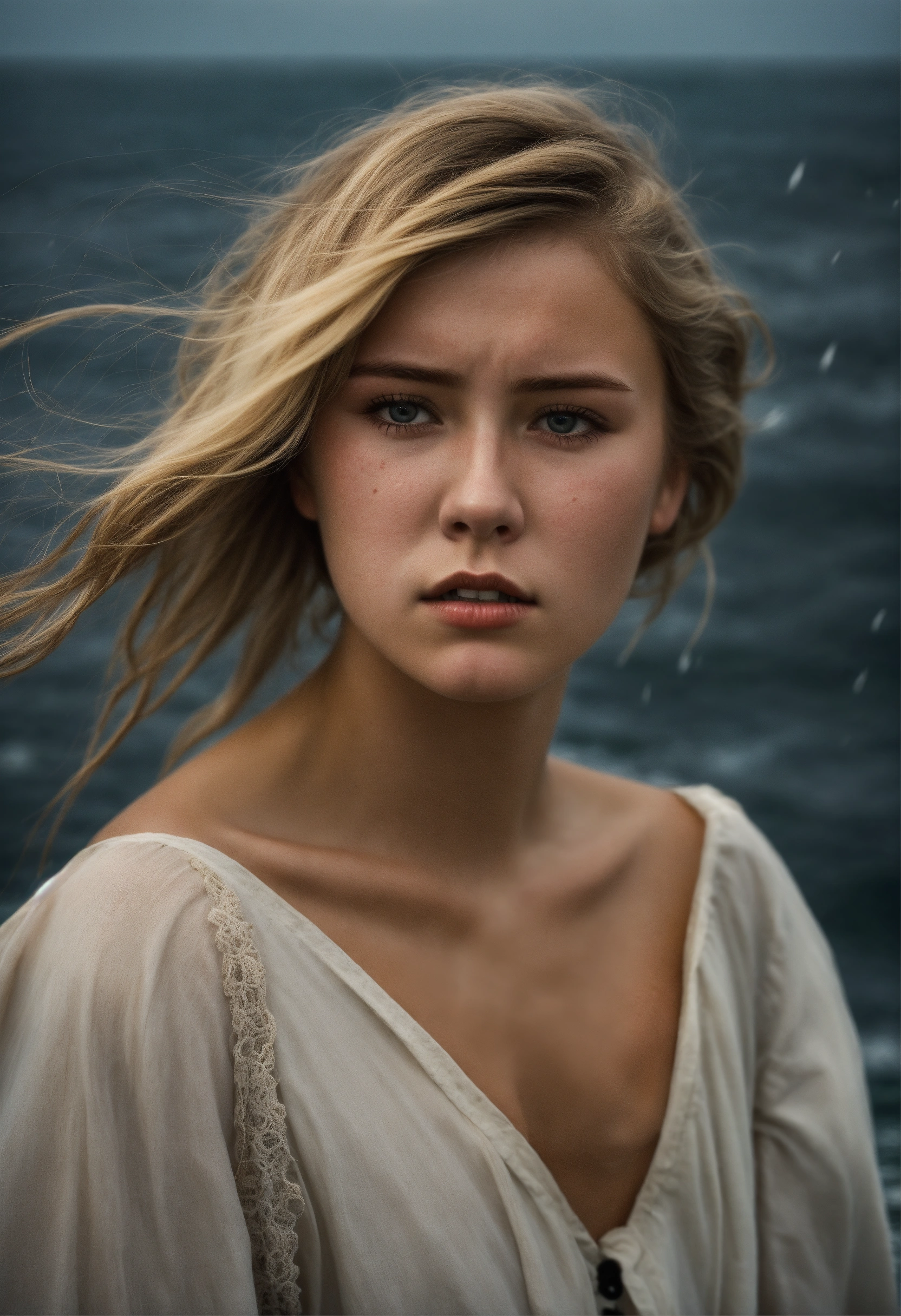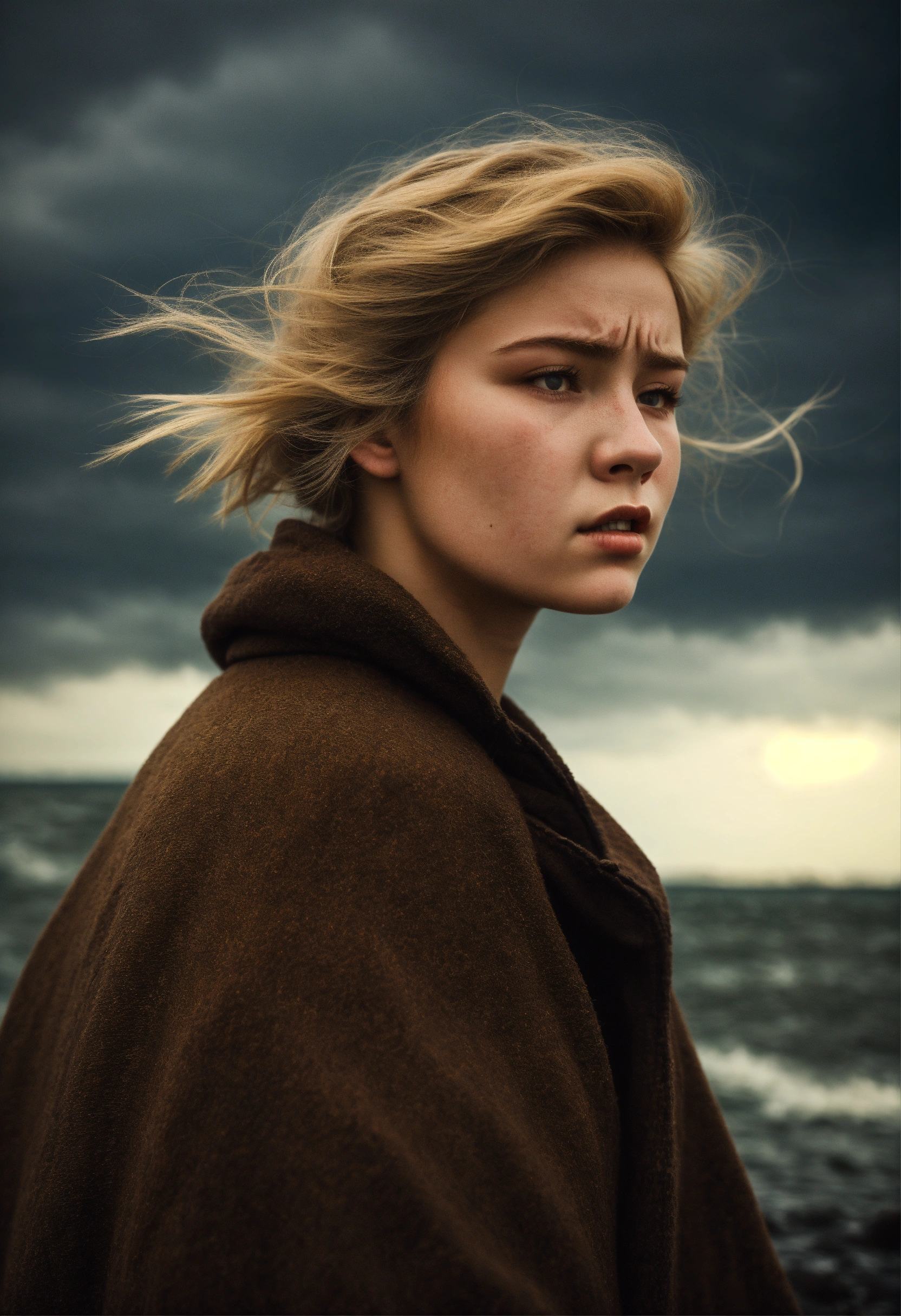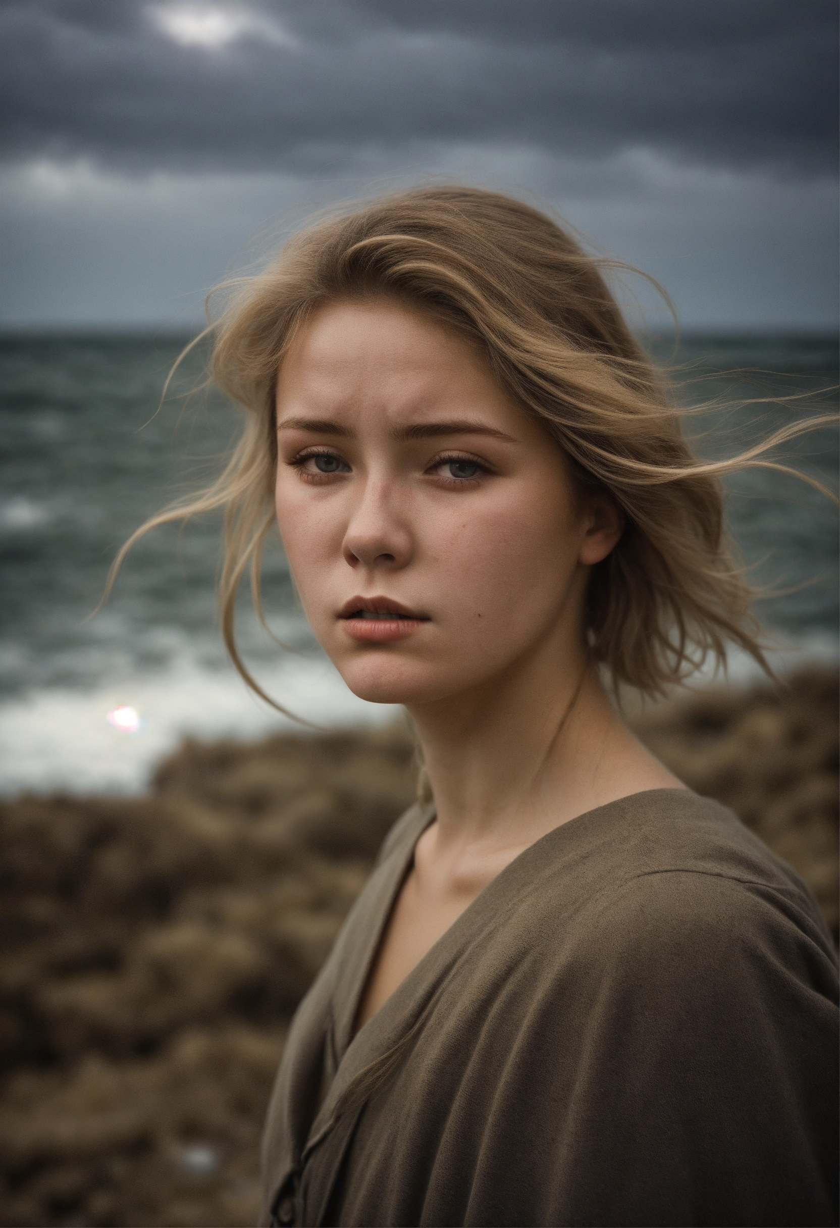 1910's 18 year old russian girl, worried face, brown eyes, short light blonde hair blowing in the wind, by the dark ocean, in storm, lighthouse