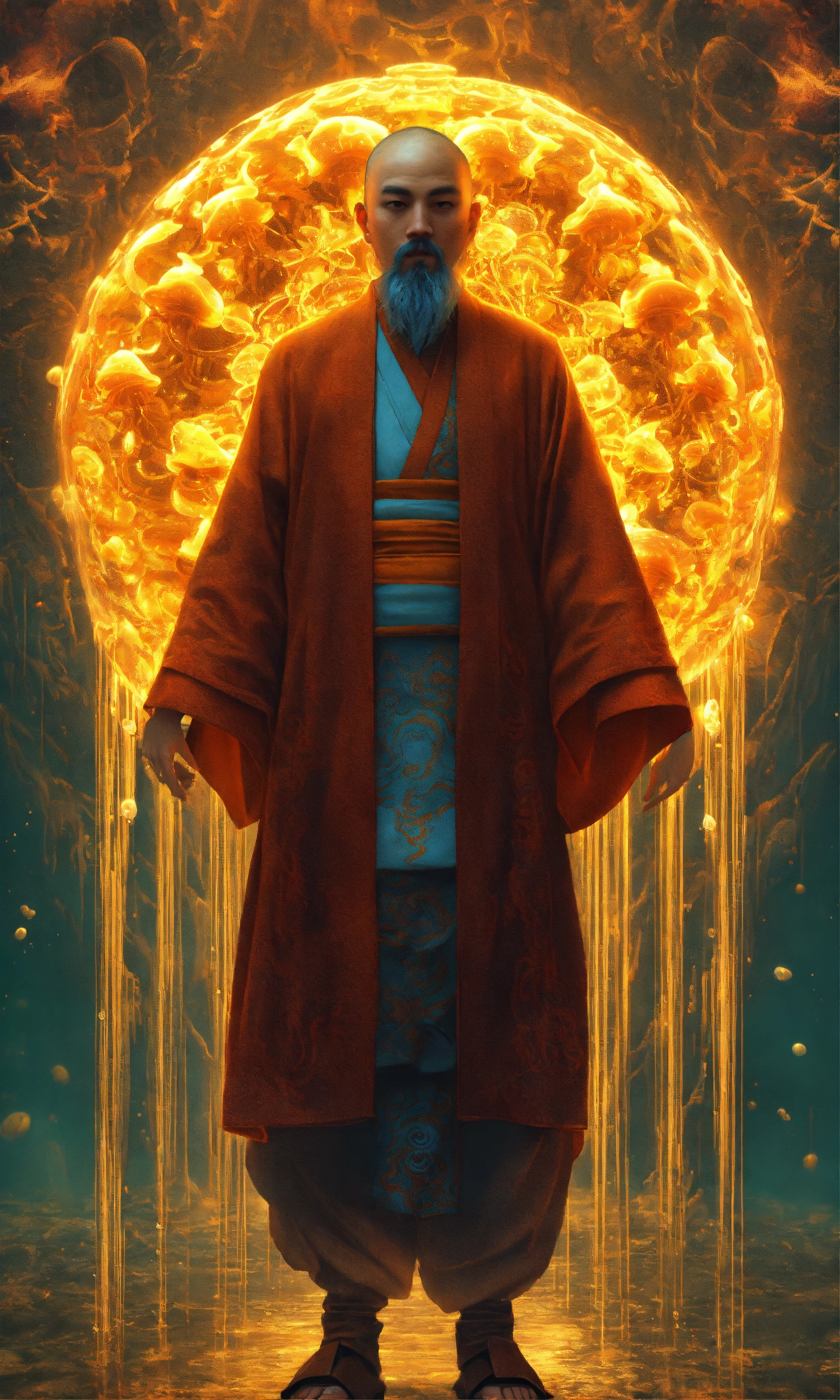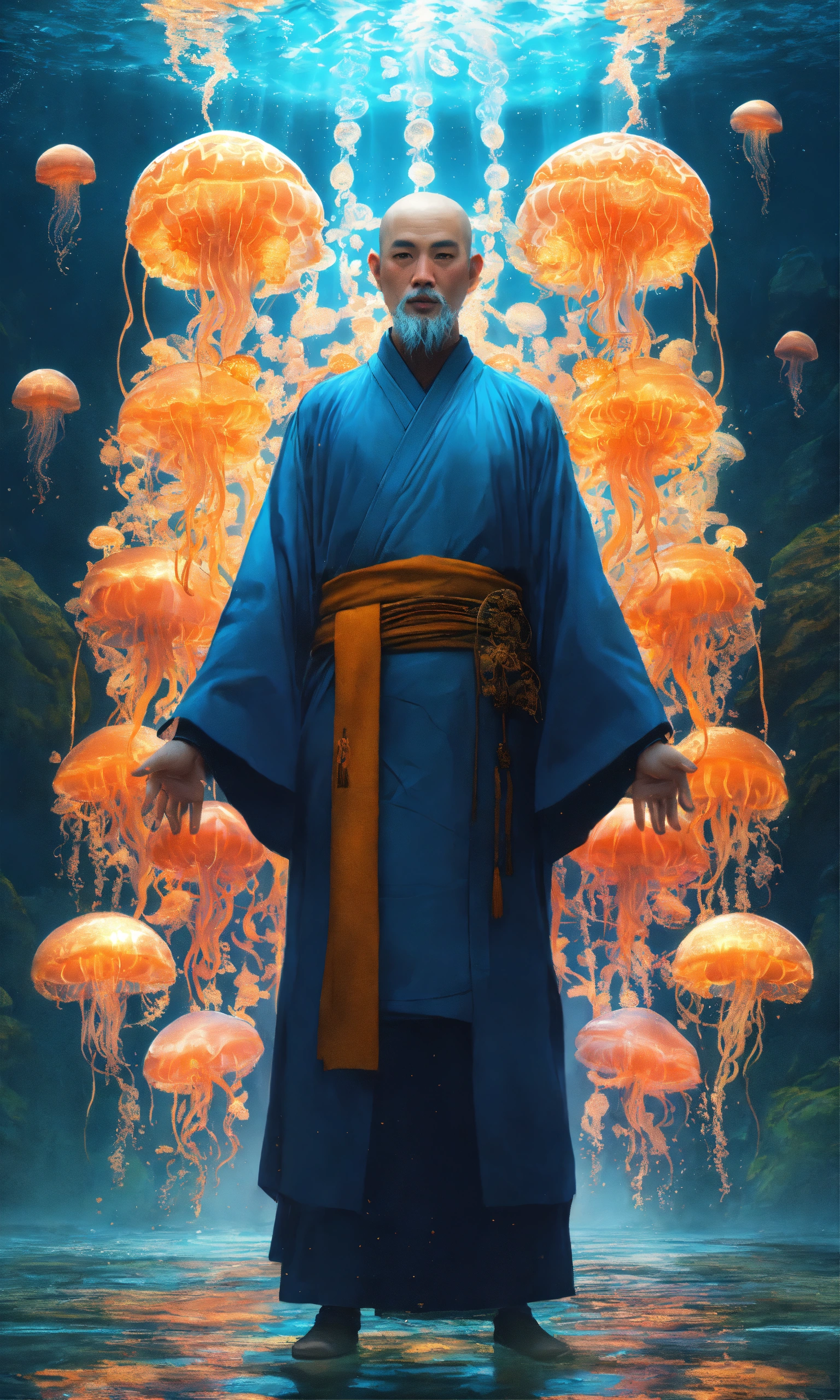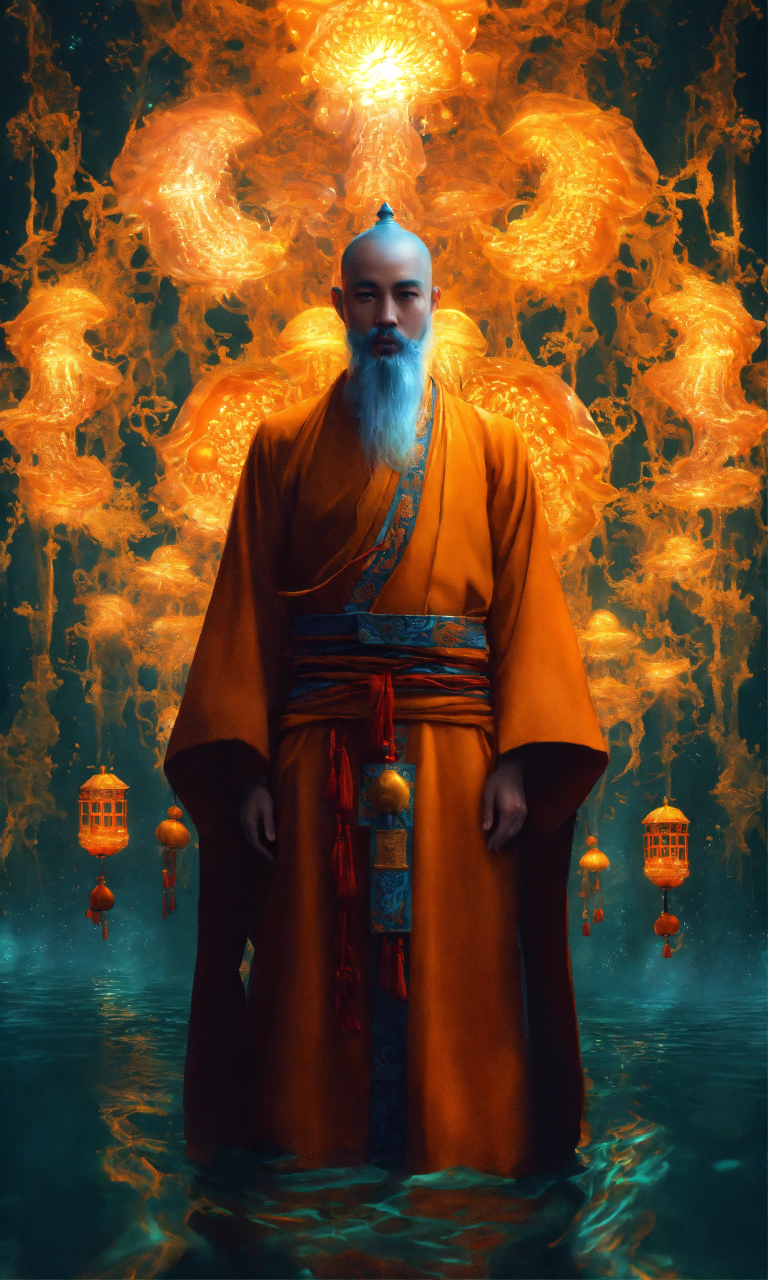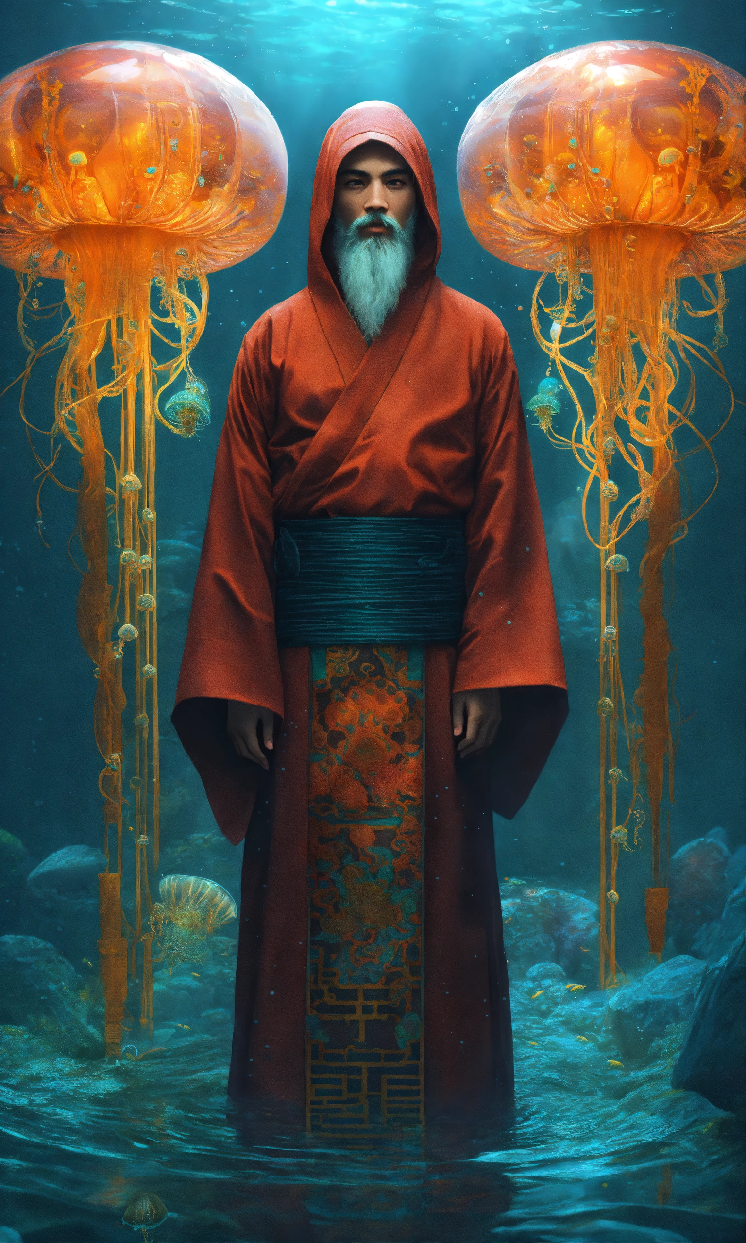 Taoist monk shaolin tesseract fractal underwater realiistic faces jellyfish wizard turkish cyborg lines, full body