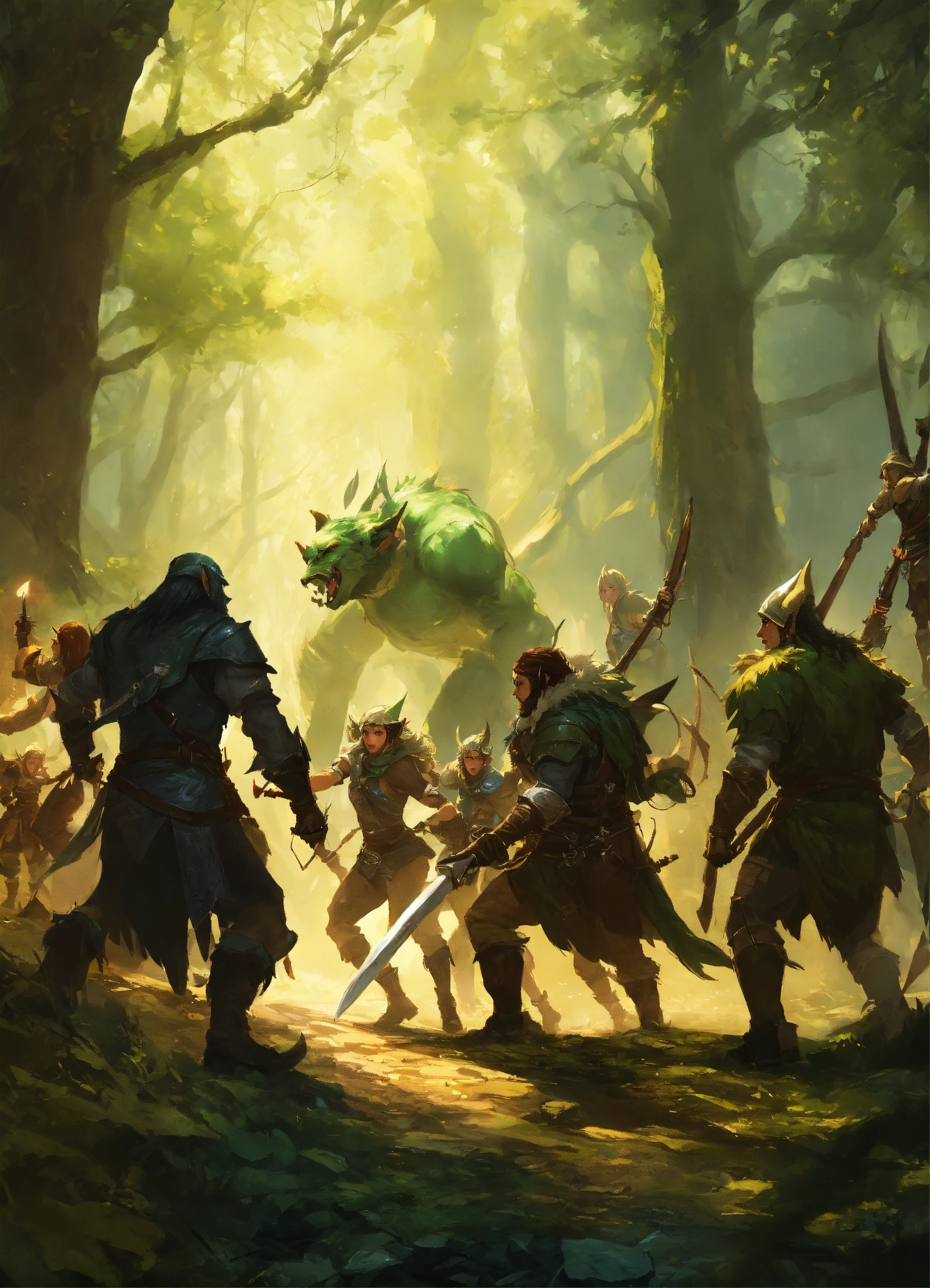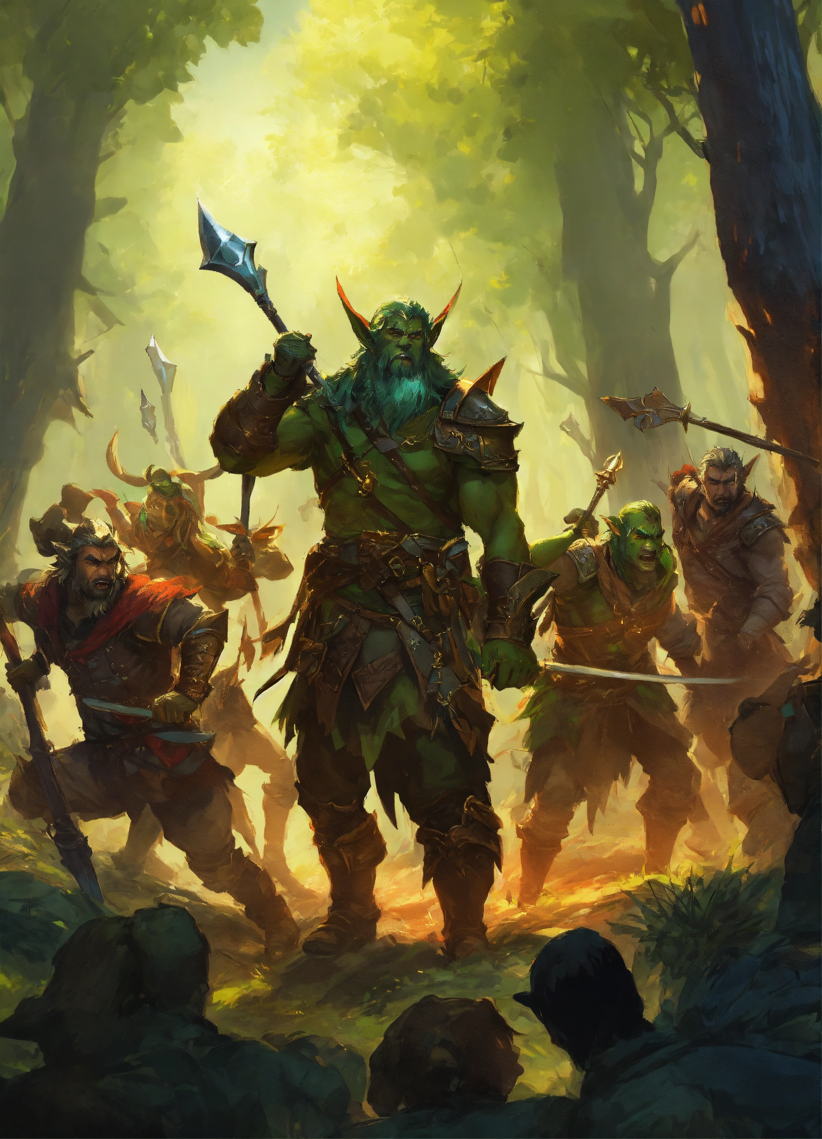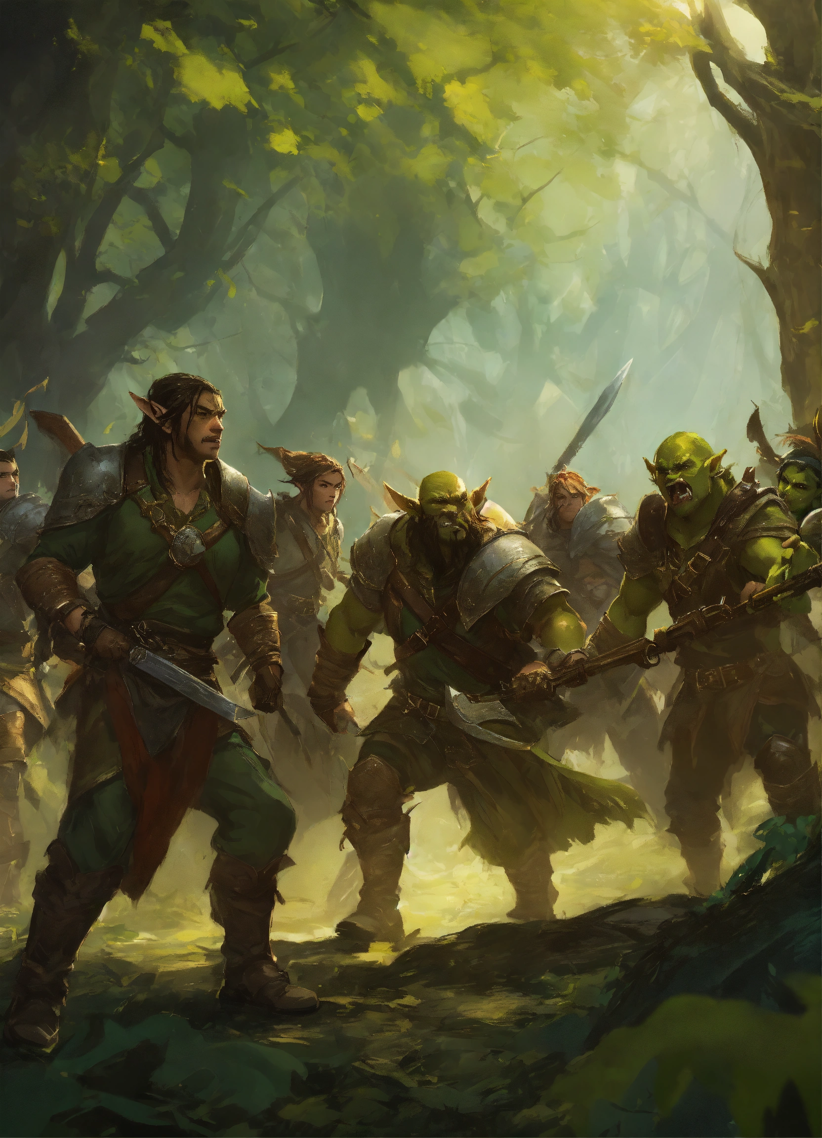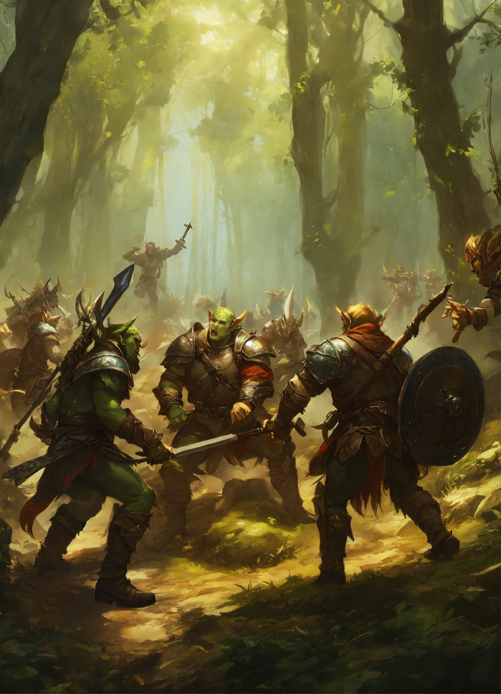 A group of four elves encounter a pack of six orcs in the forest, they start a hand to hand combat concept art