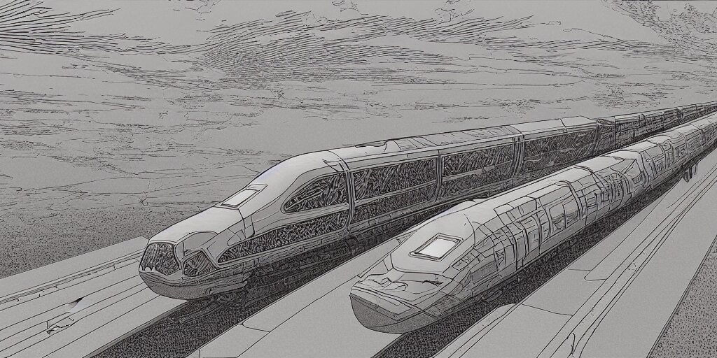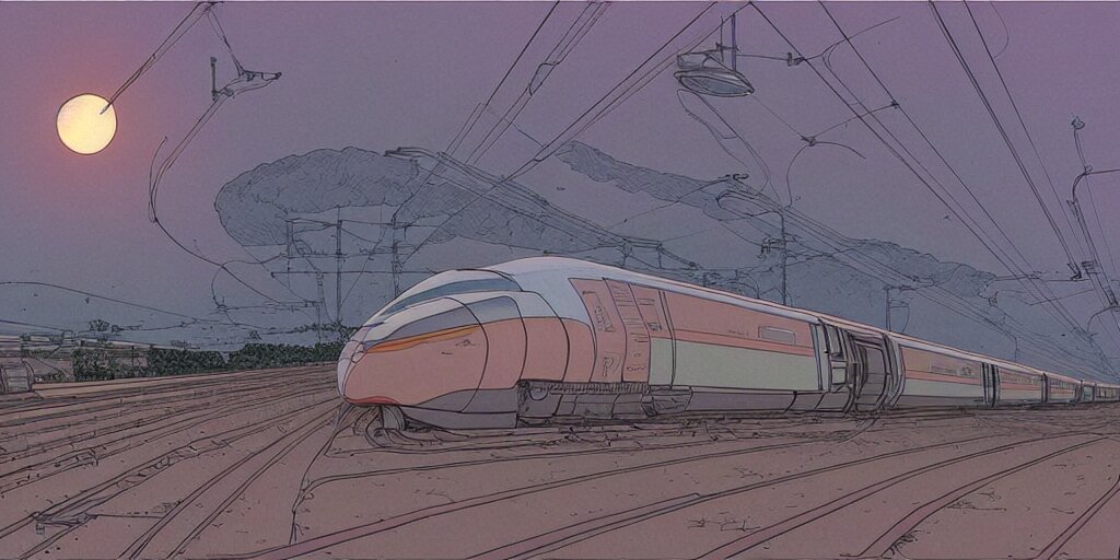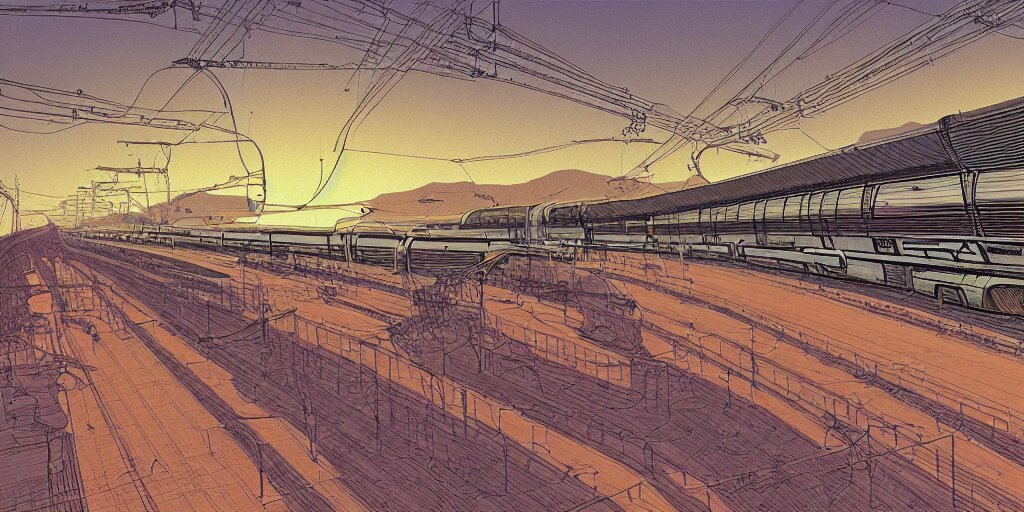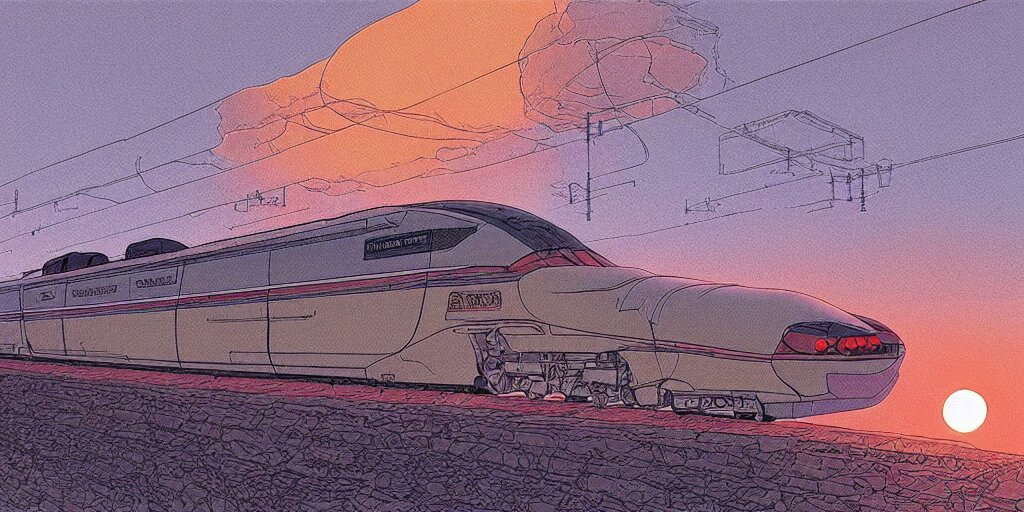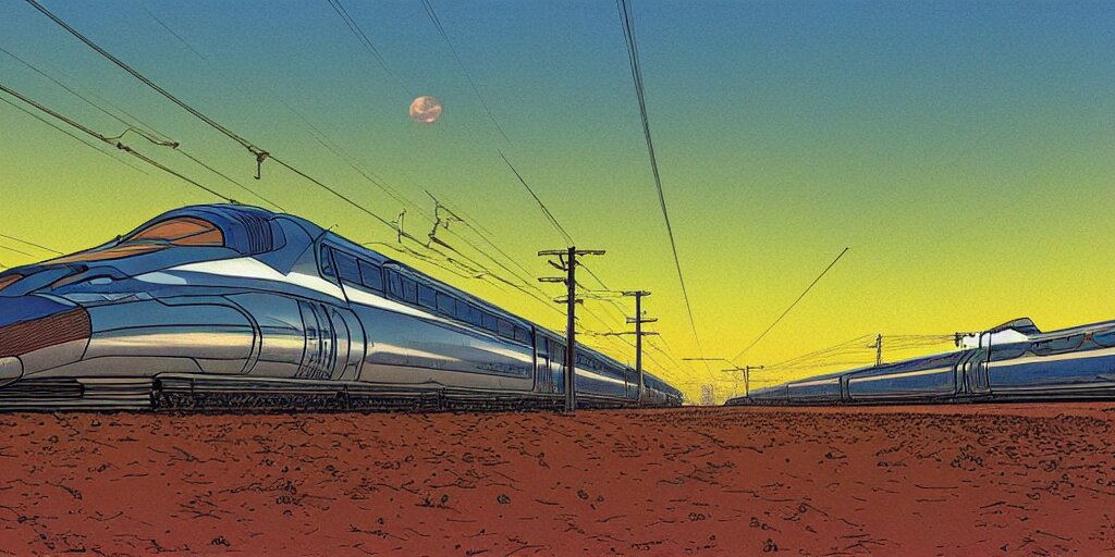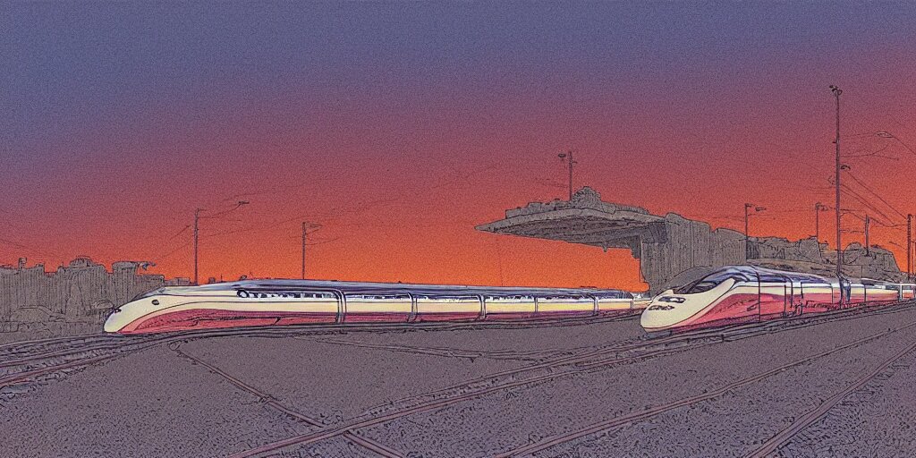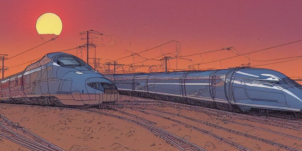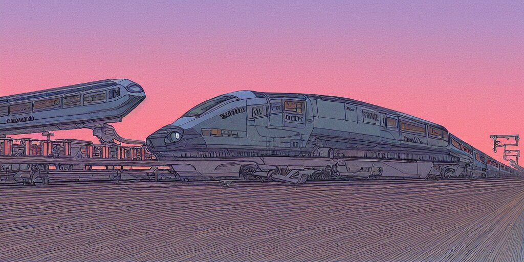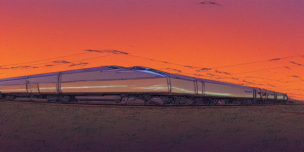 Weird west futuristic bullet train into the sunset, desaturated delicate illustration by moebius jean giraud