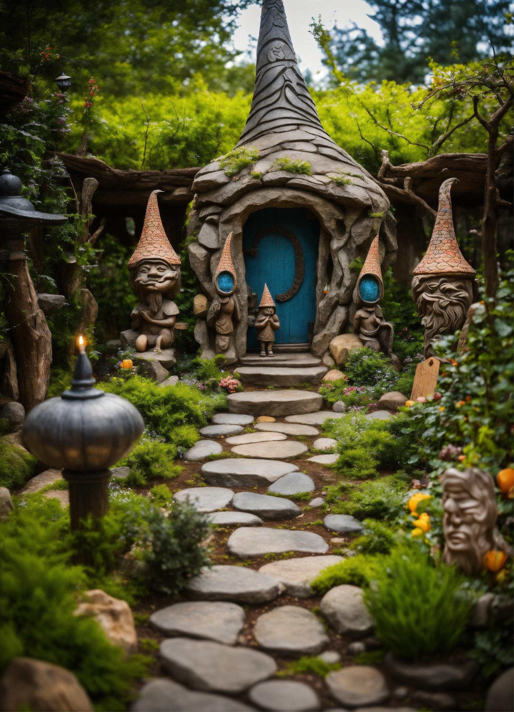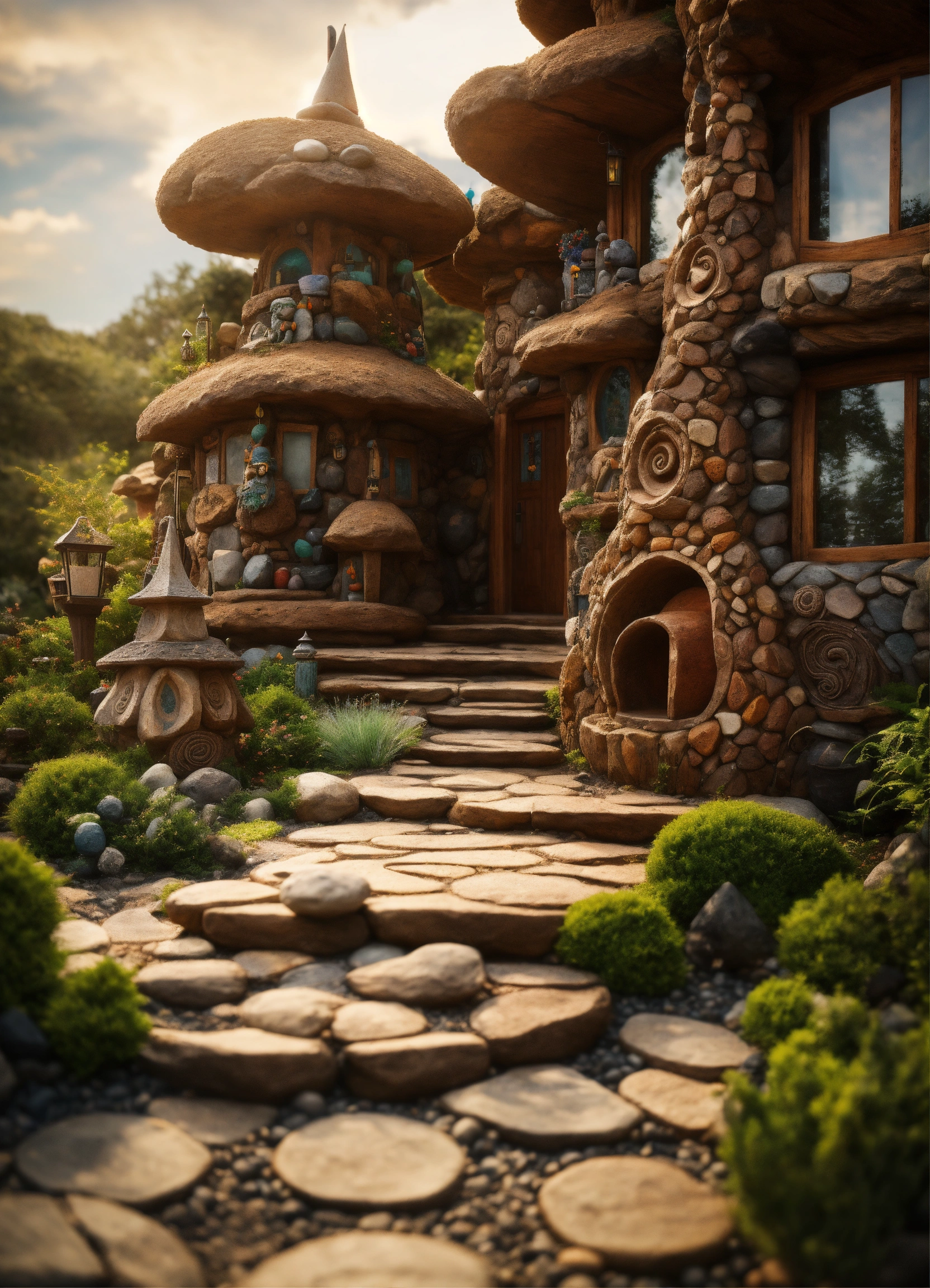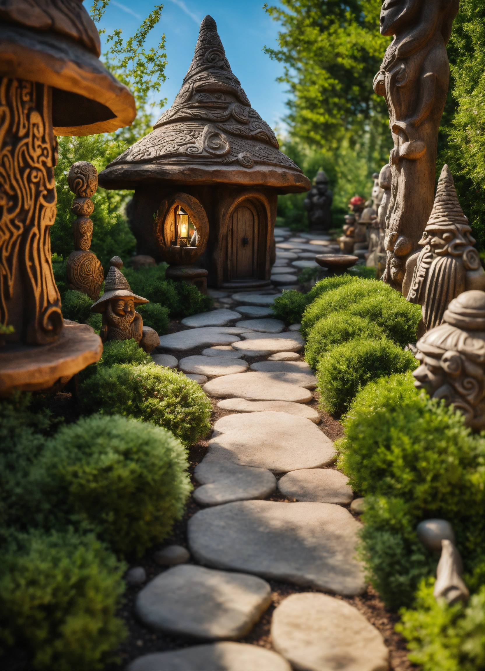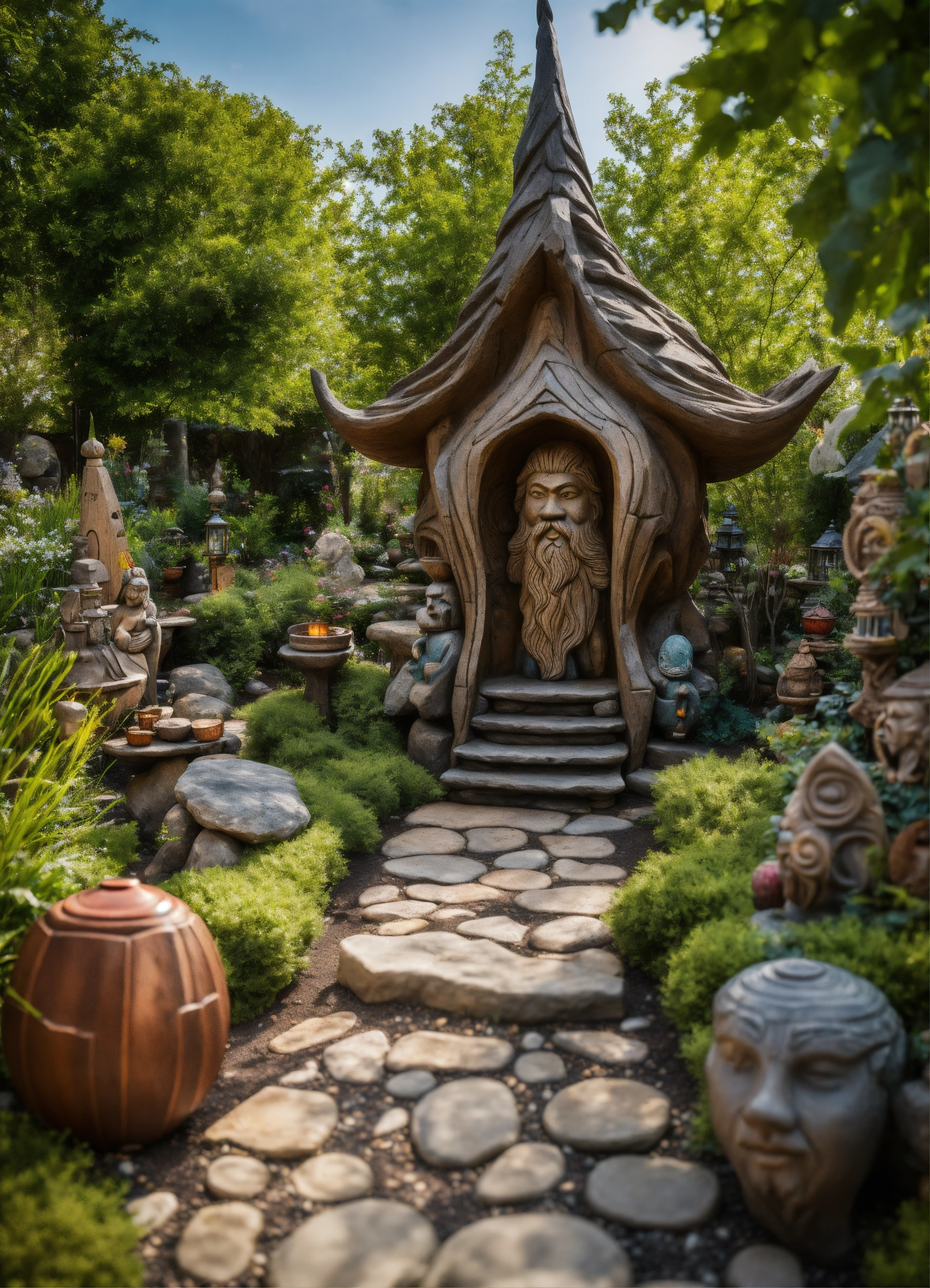 An ancient spiritual gnomes stone pathway rock garden.sculptured . style of alex grey, giger.unreal engine.totem sculptures.swirling patterned stone pathway courtyard.wood.stone.driftwood.statues. artistic sculpture.lanterns.air bnb tiny house/backyard