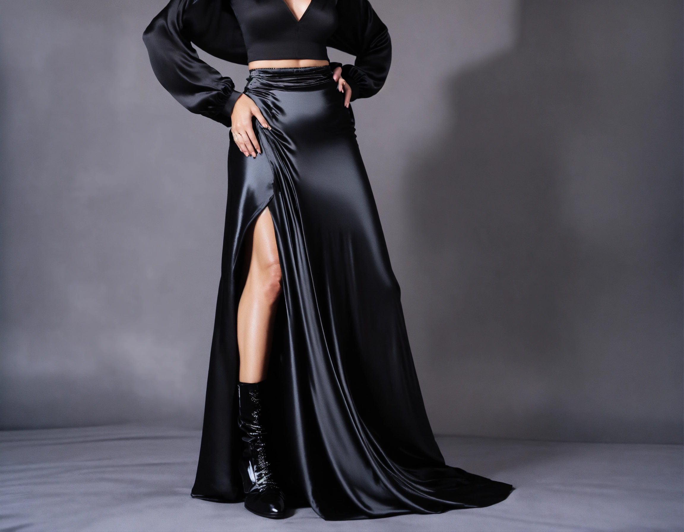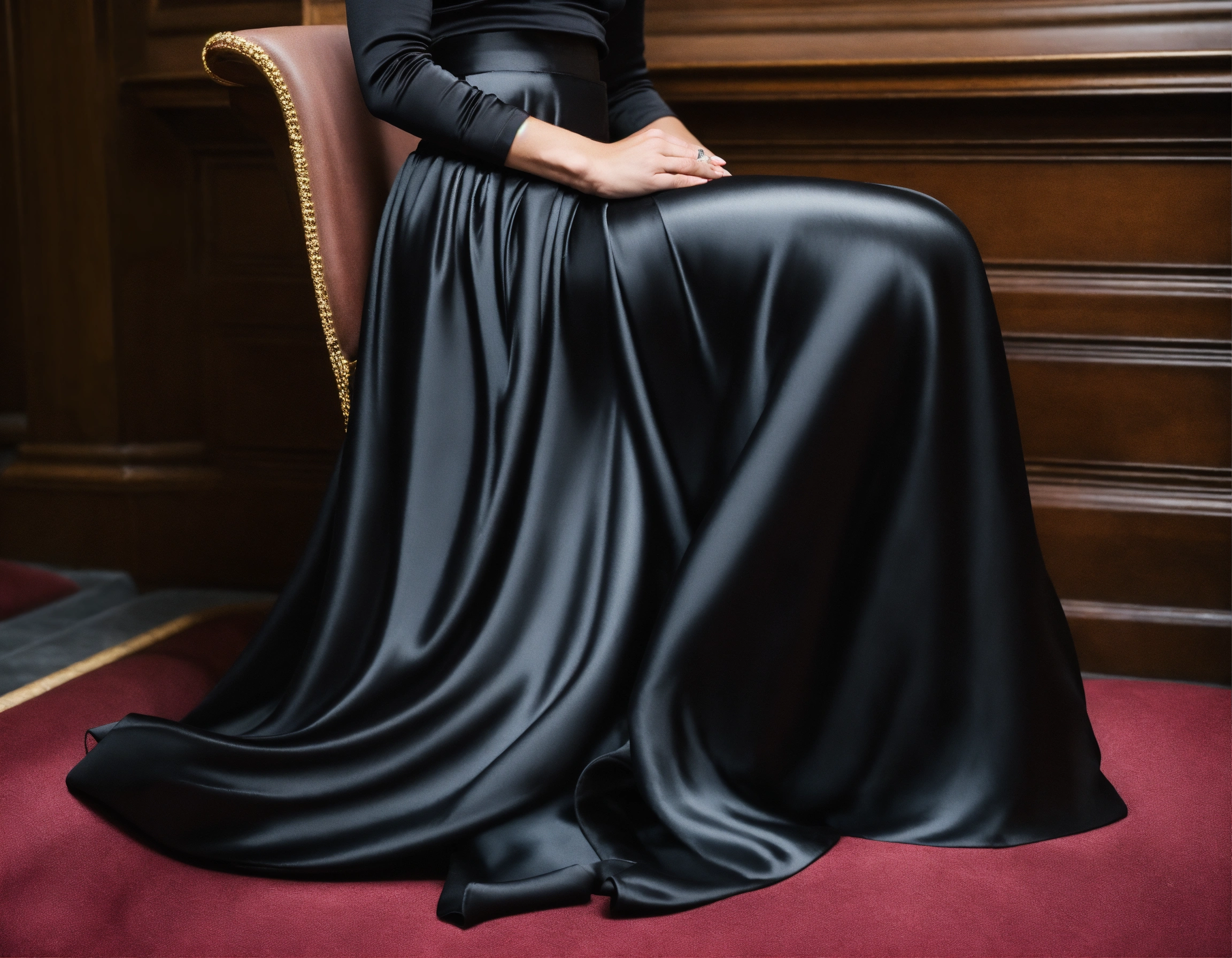 Man with godlike body wearing black satin shiny figure-hugging clingy pencil maxi skirt, pulled tight. close up, low angle. sat on throne.