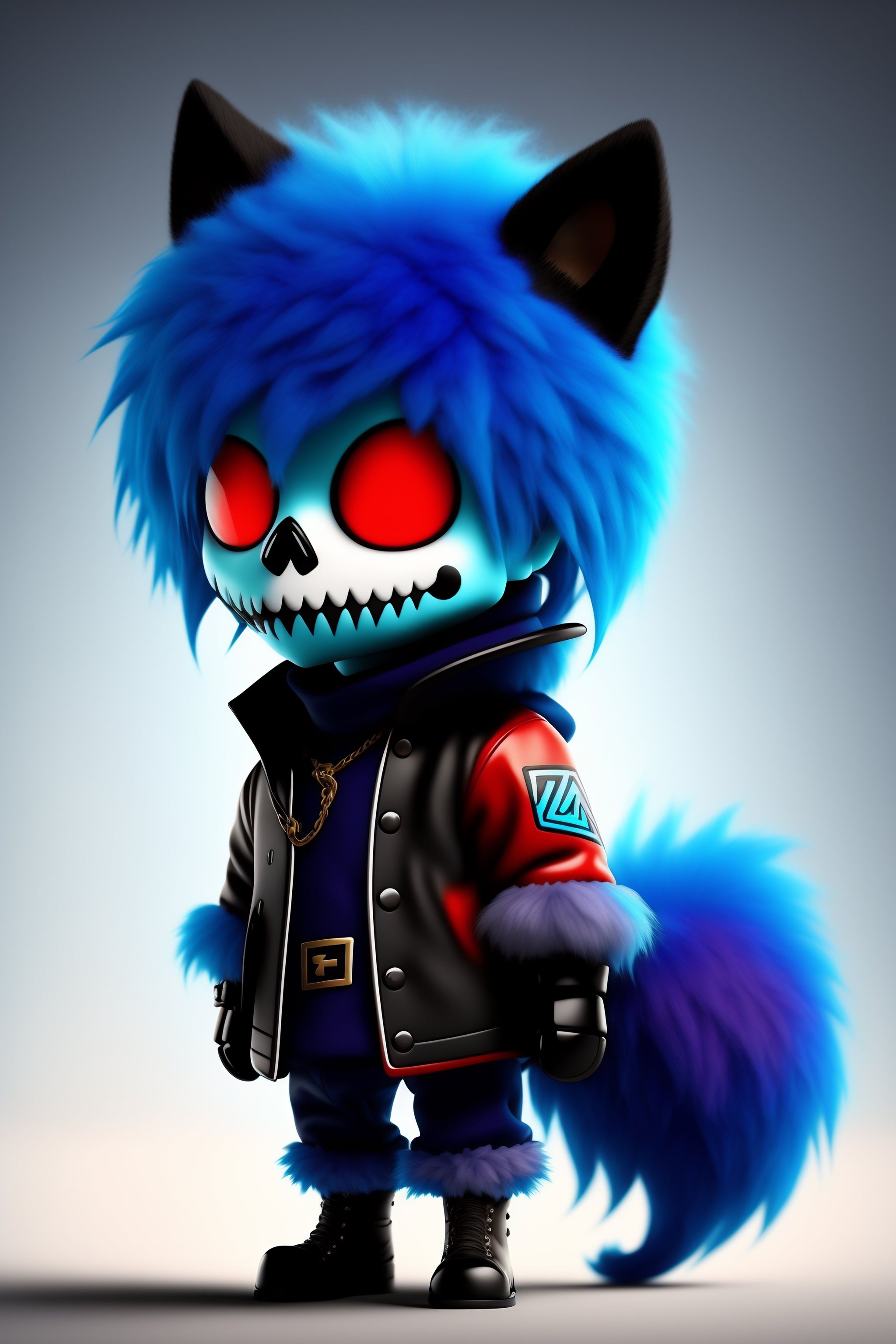 Grim, a blue and fluffy zombie with piercing red eyes and a perpetual scowl. he is always full of energy and mischief, and is always looking for new ways to cause trouble. even though he is a zombie, he doesn't scare easily and is actually quite cunning. he loves to play pranks and cause chaos, and is always up for a challenge. grim is a loyal companion, but he can also be unpredictable and dangerous. he will stick by your side through thick and thin, but be careful not to get on his bad side.
