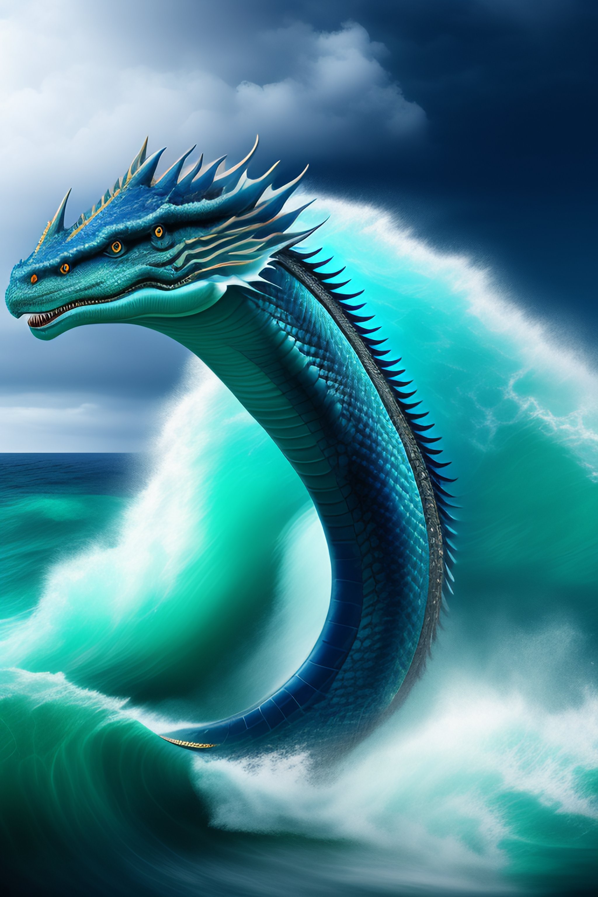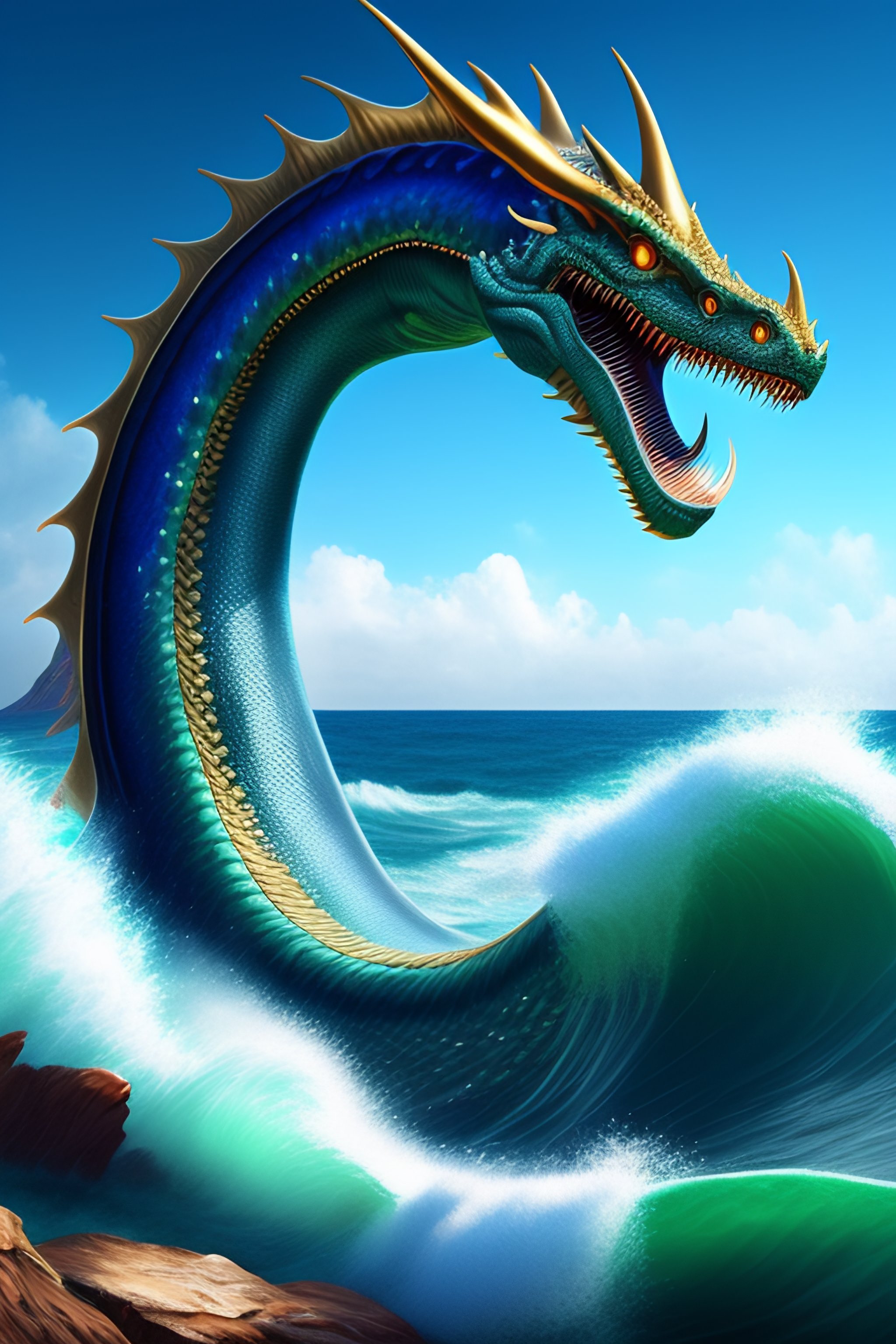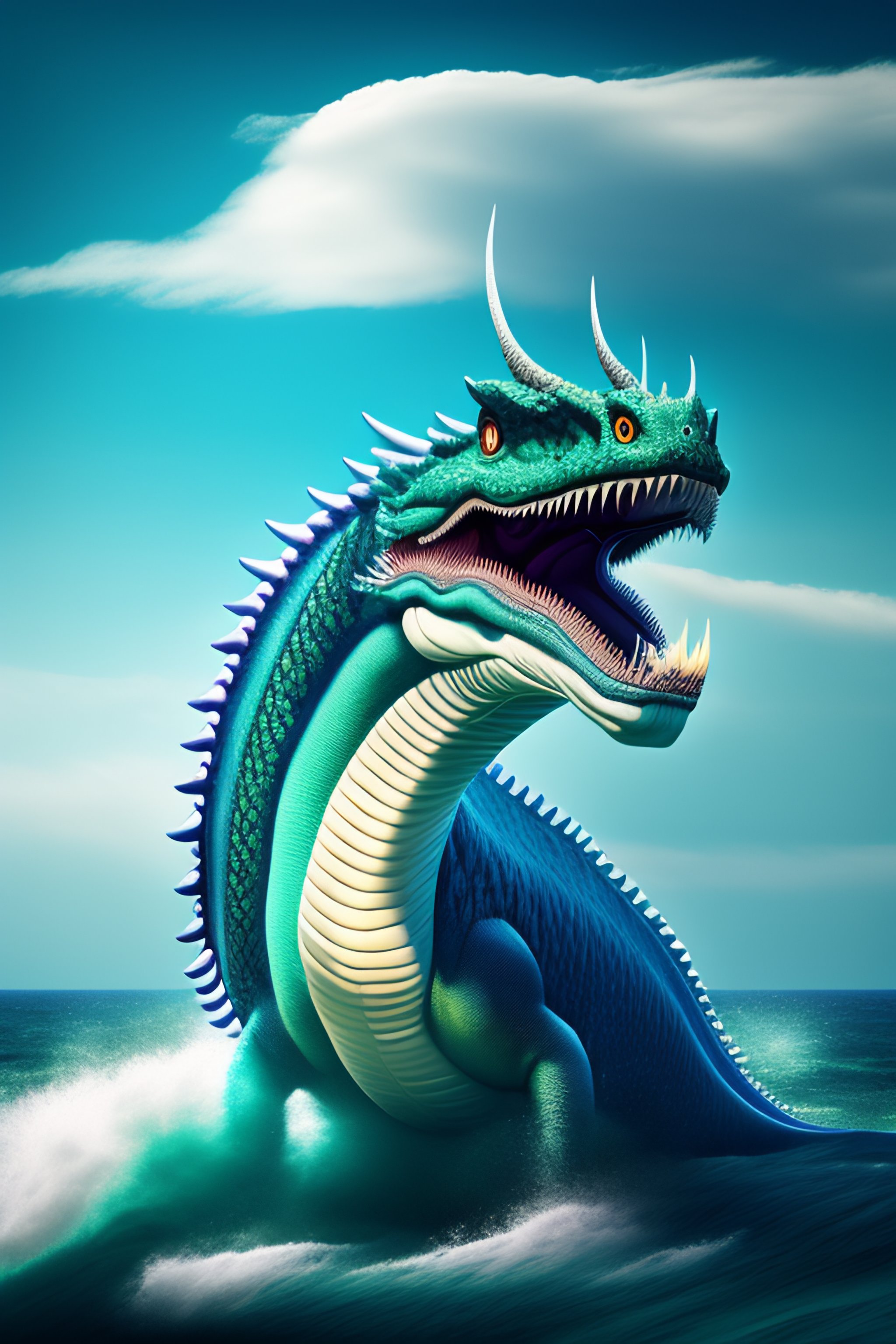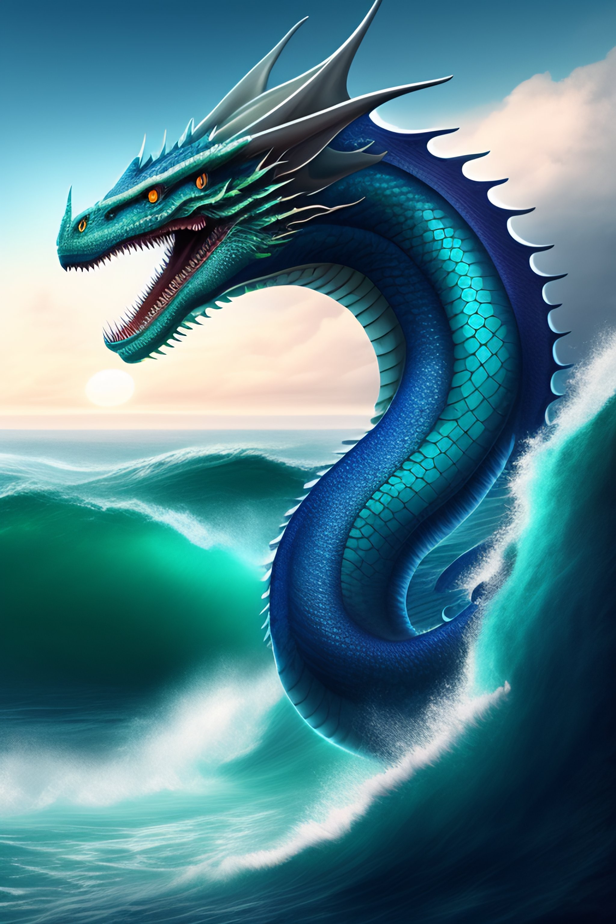 A ferocious creature that looks like a giant sea serpent dragon with an ocean background