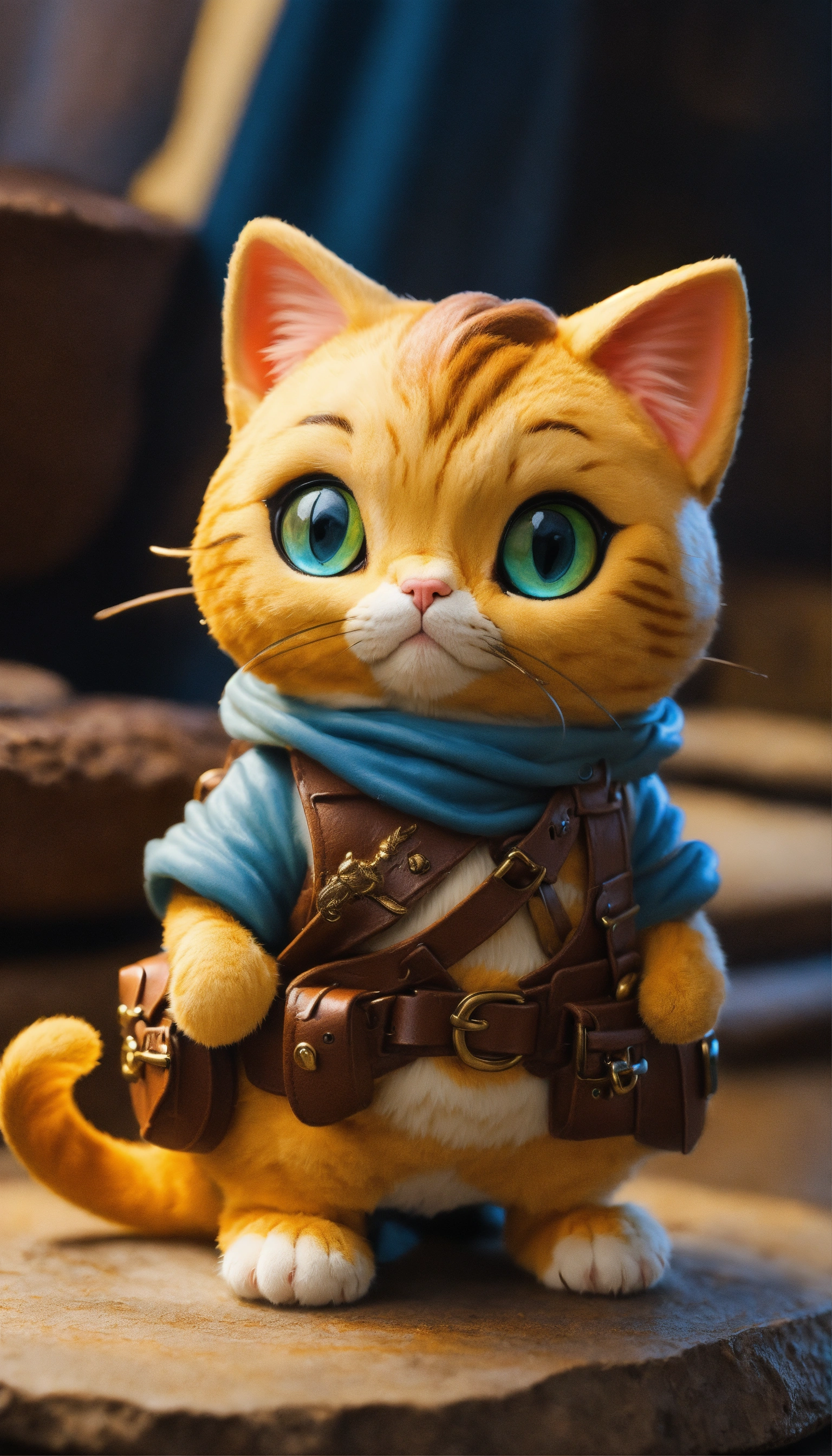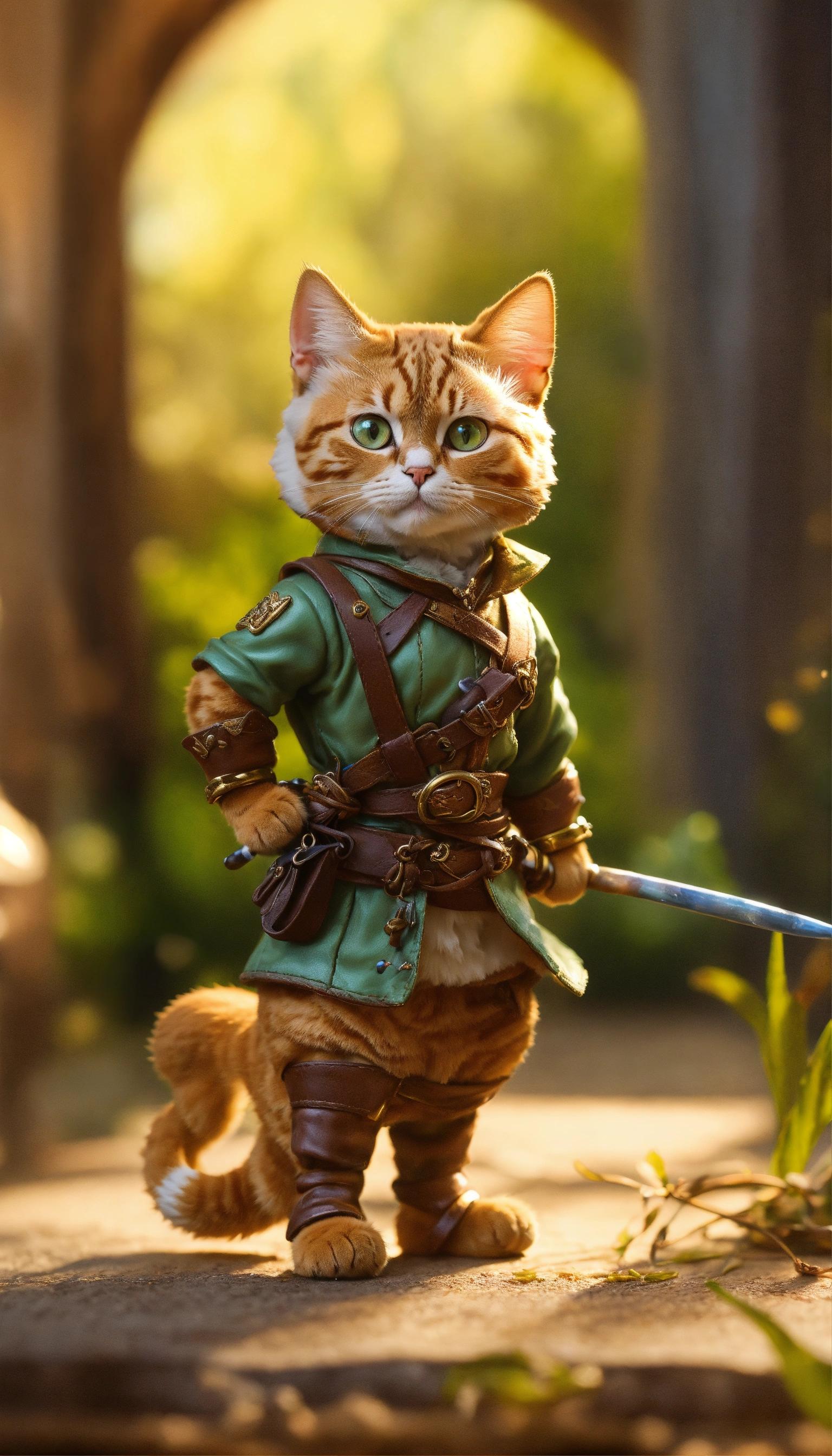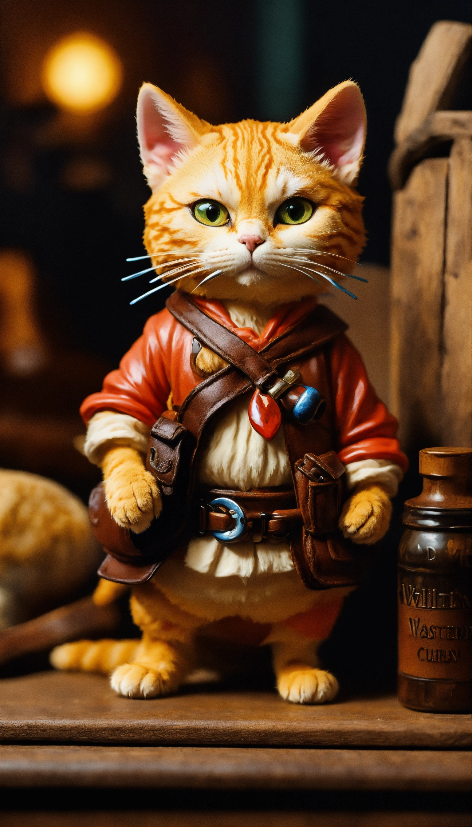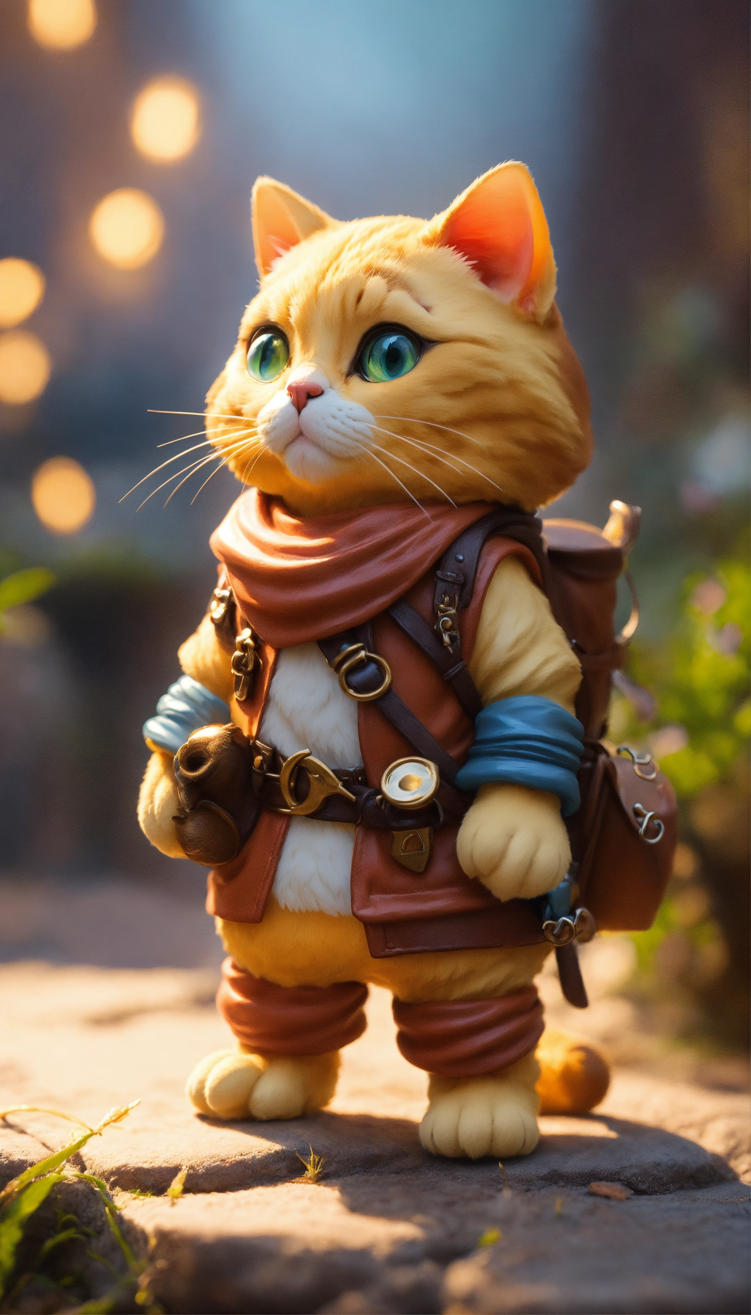 Cute cat adventurer figure, product shot, oil painting, whelan, beautiful lighting, fantasy, d&d, masterwork, realistic figure, realism, anthropomorphic figure