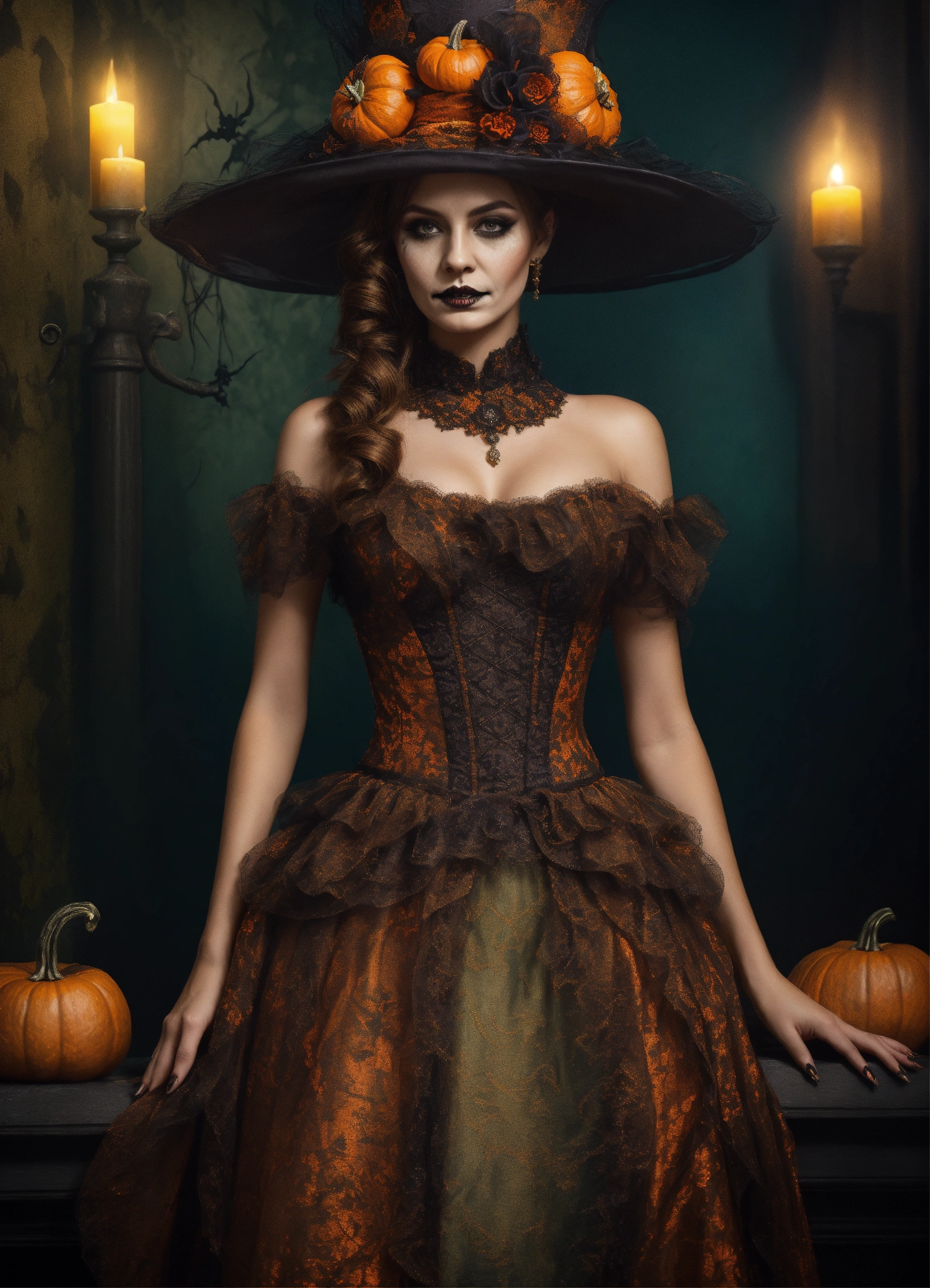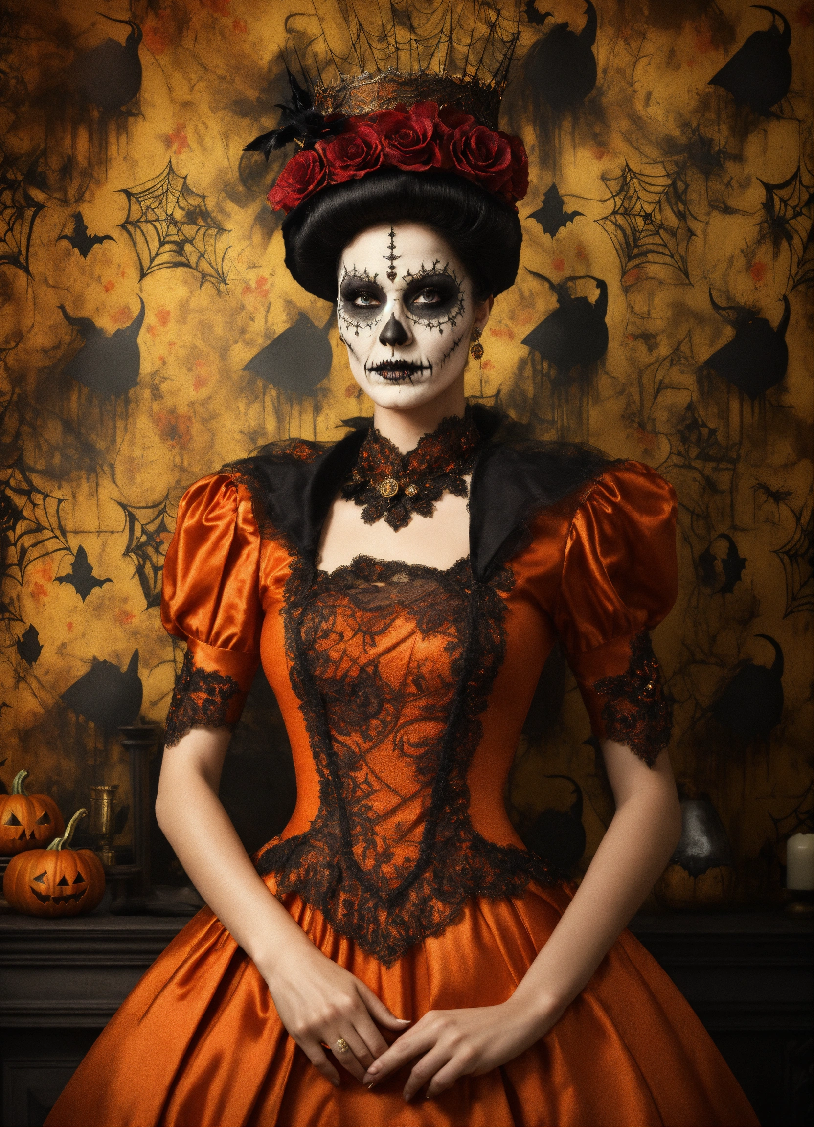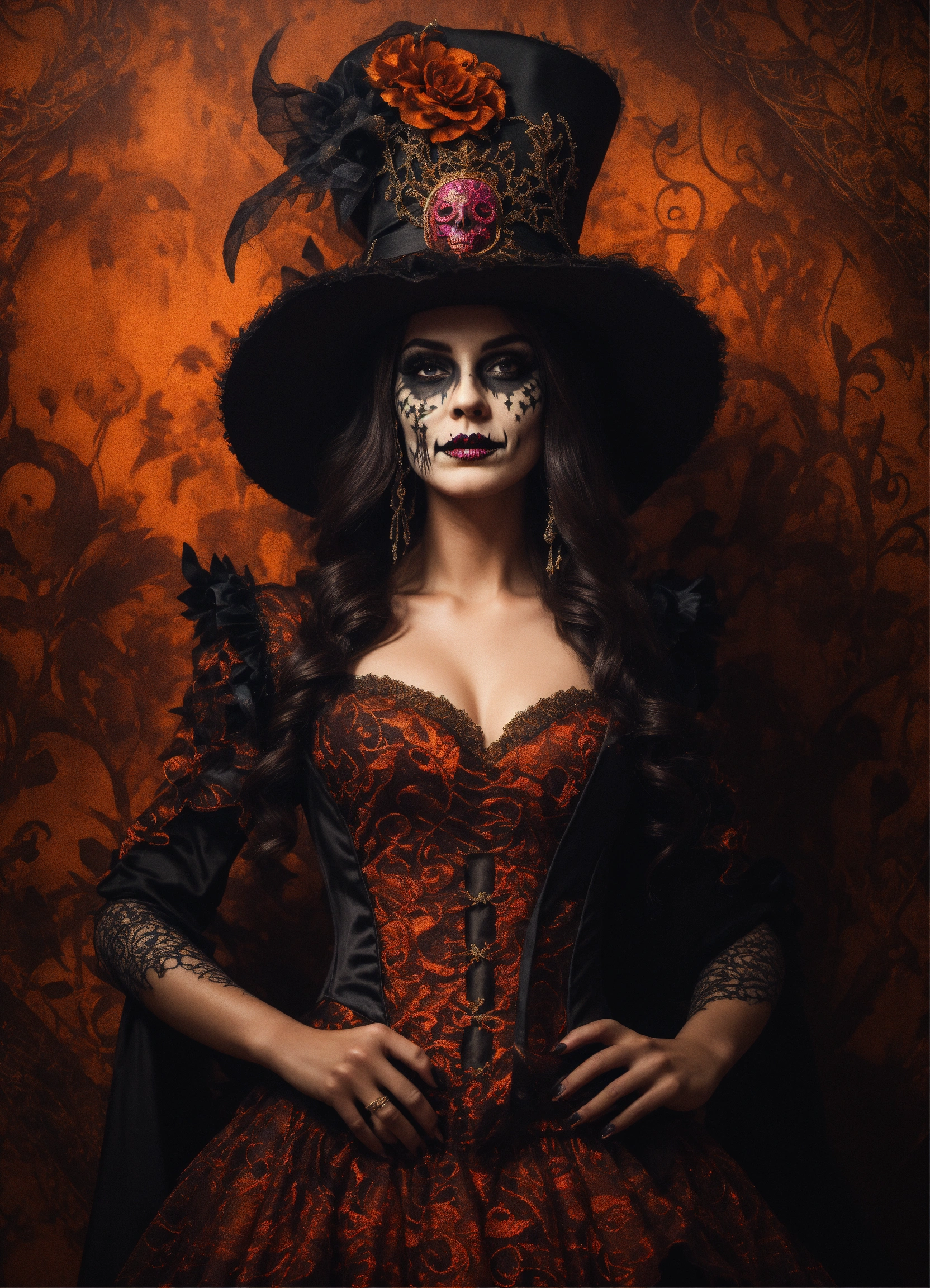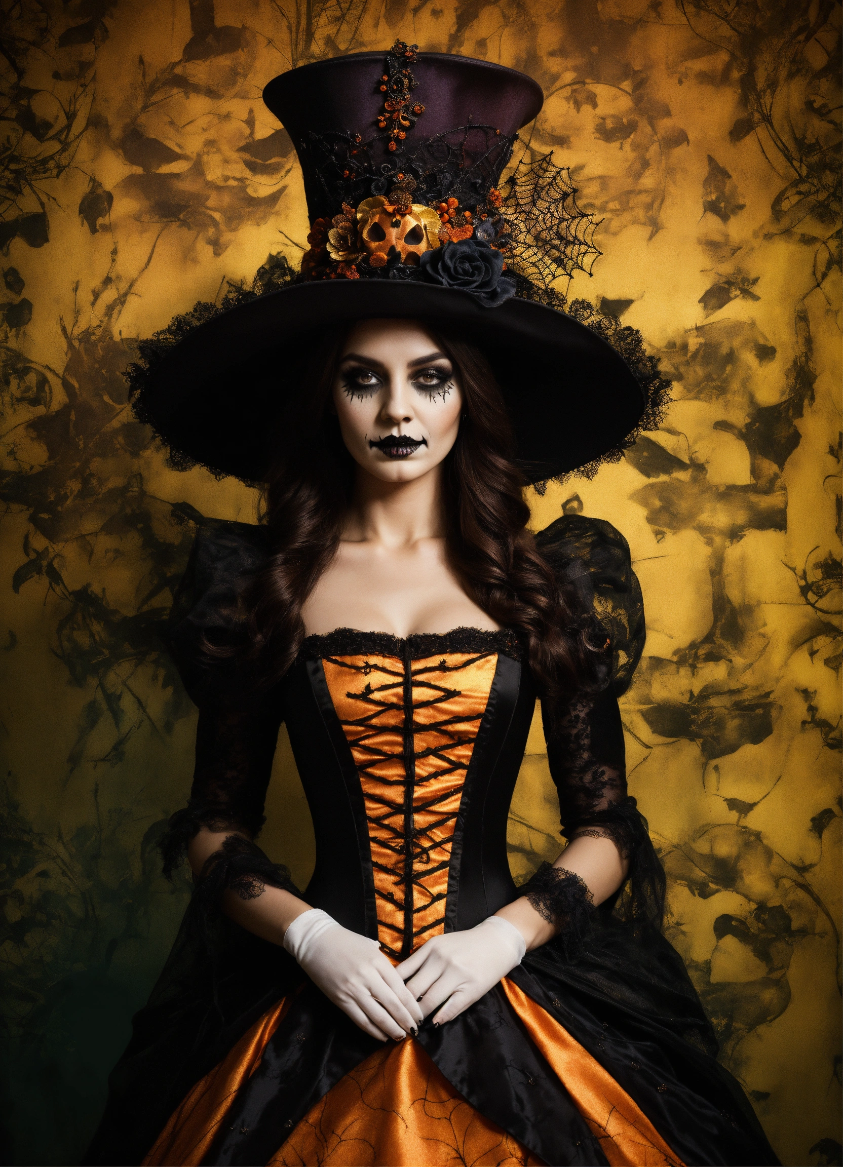 Beautiful spooky version of a 25 year old queen of halloween in an elegant and intricate costume with a fascinating hat, background with grungy wallpaper, 3d, 32k, photorealistic and very detailed. detailed and realistic skin texture, halloween colours and elements