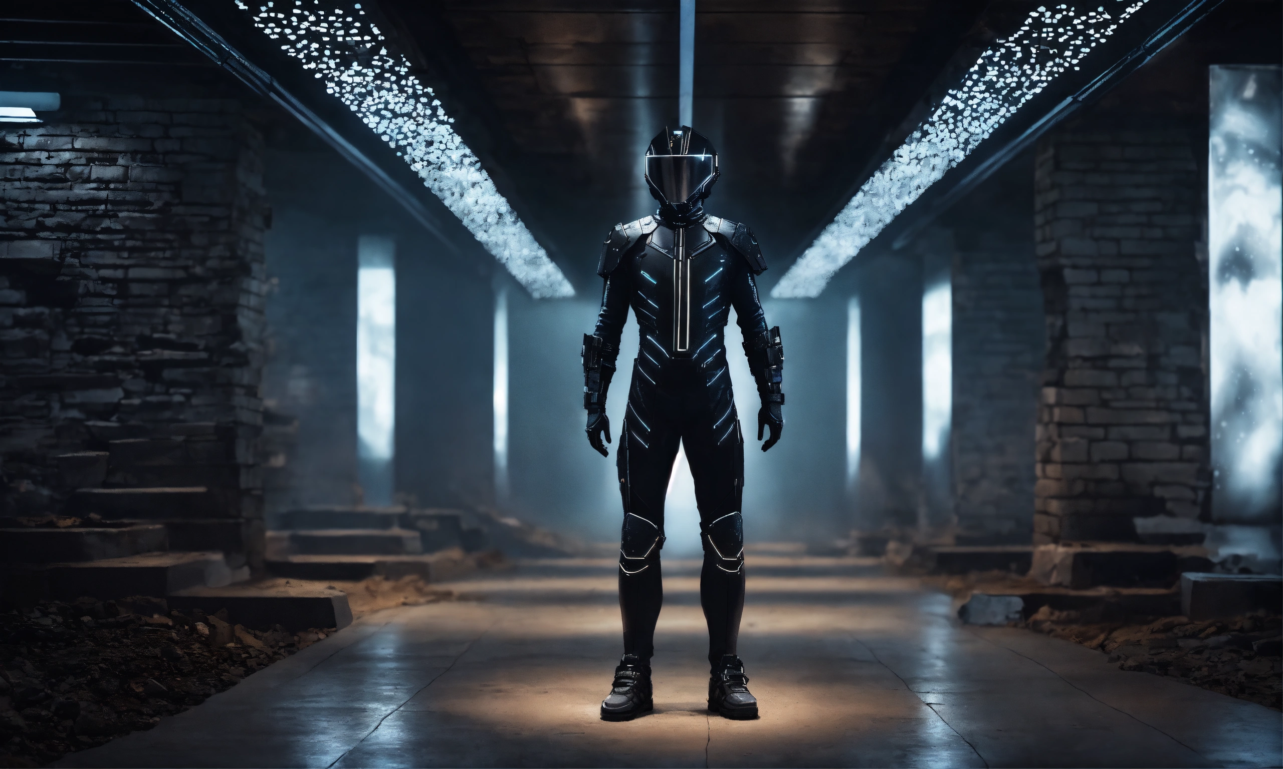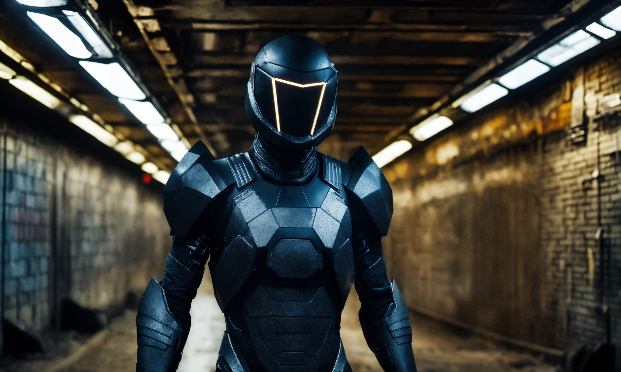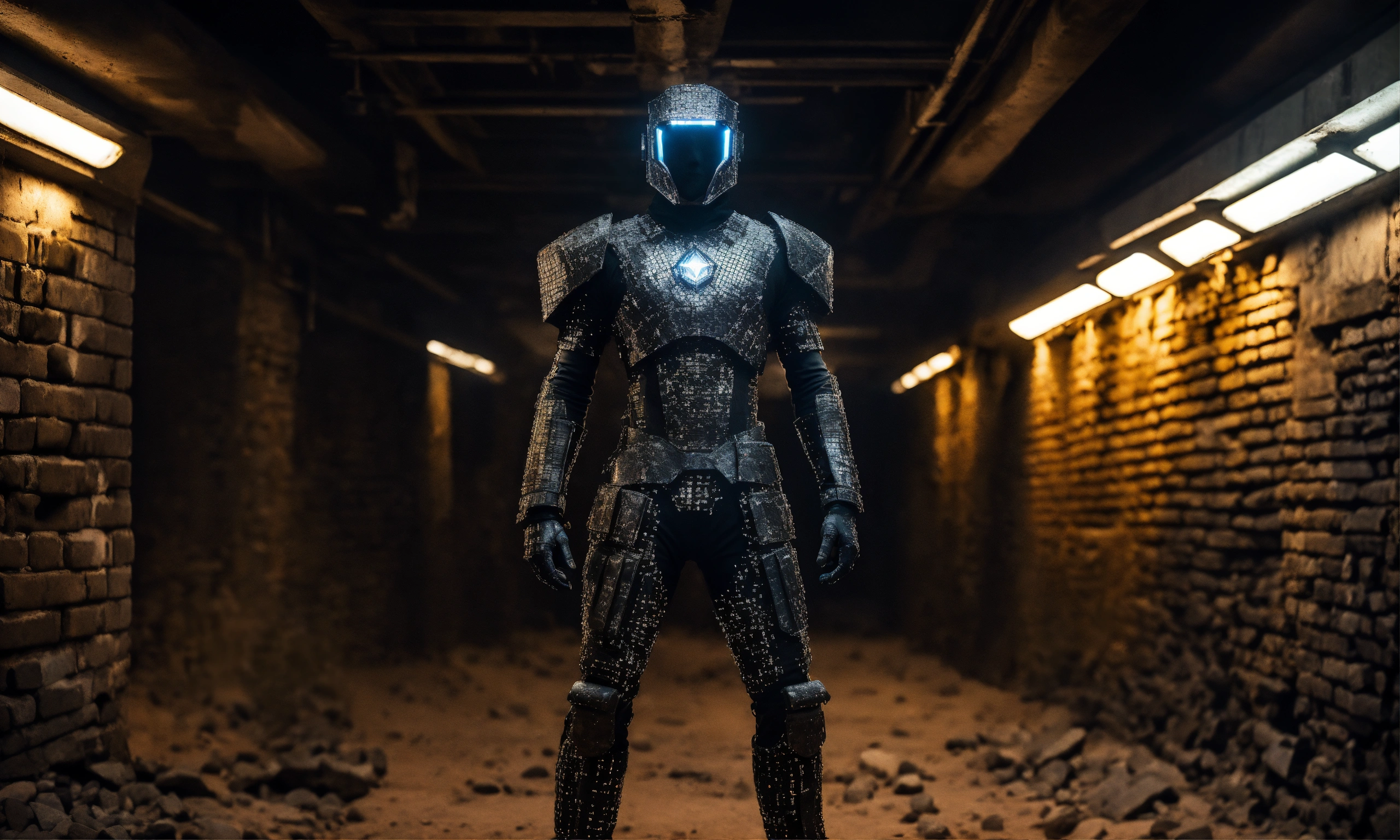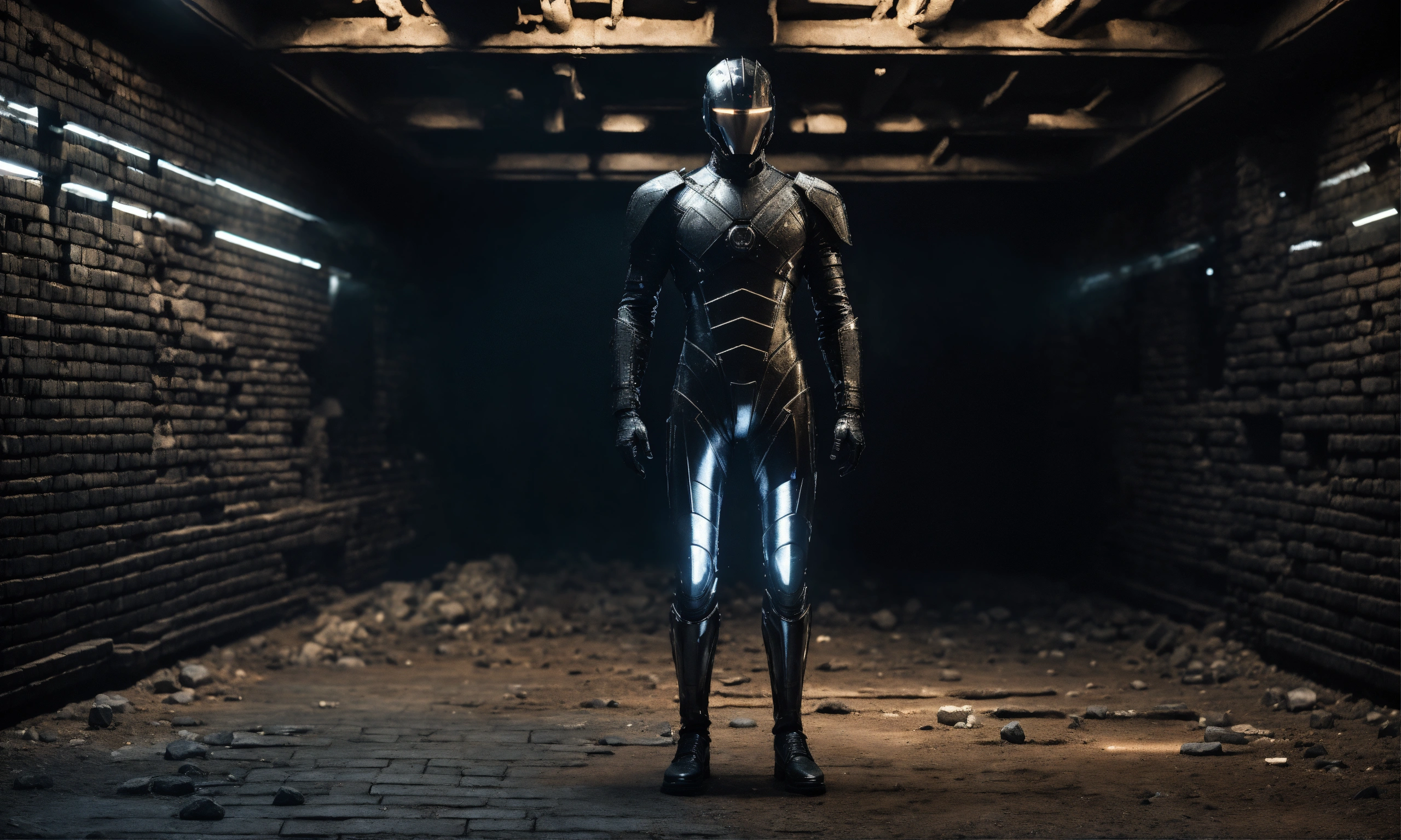 An ultrarealistic photograph of a minimalist futuristic full body power suit, without lights, made of black mate metal and polymer, full crystal hull, for a man, imposing, modern minimalism, elegant, dystopia, mysterious, godlike, scary, in ancient subway ruins with withe stone bricks wall and dirt ceiling, dramatic illumination, 8k
