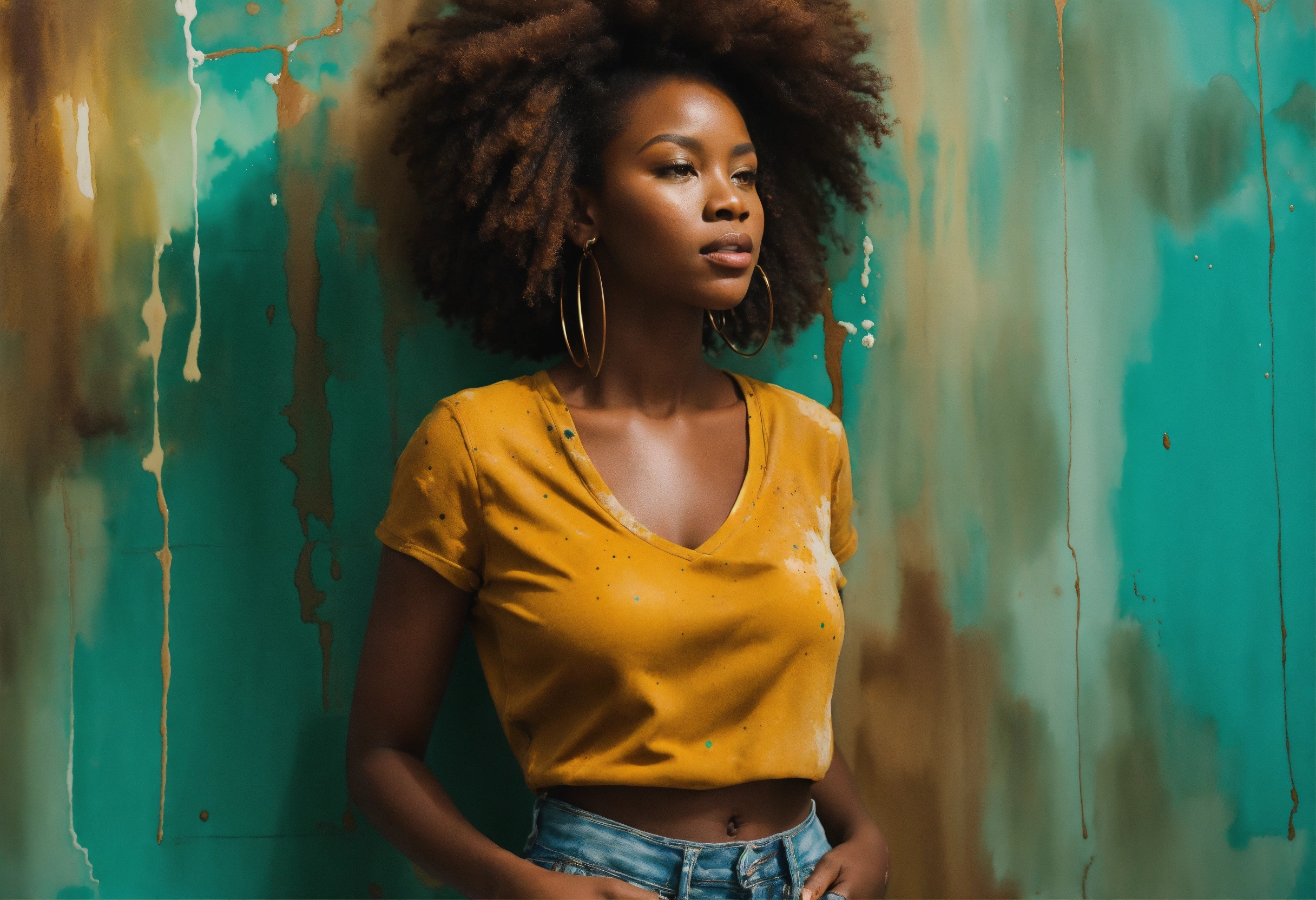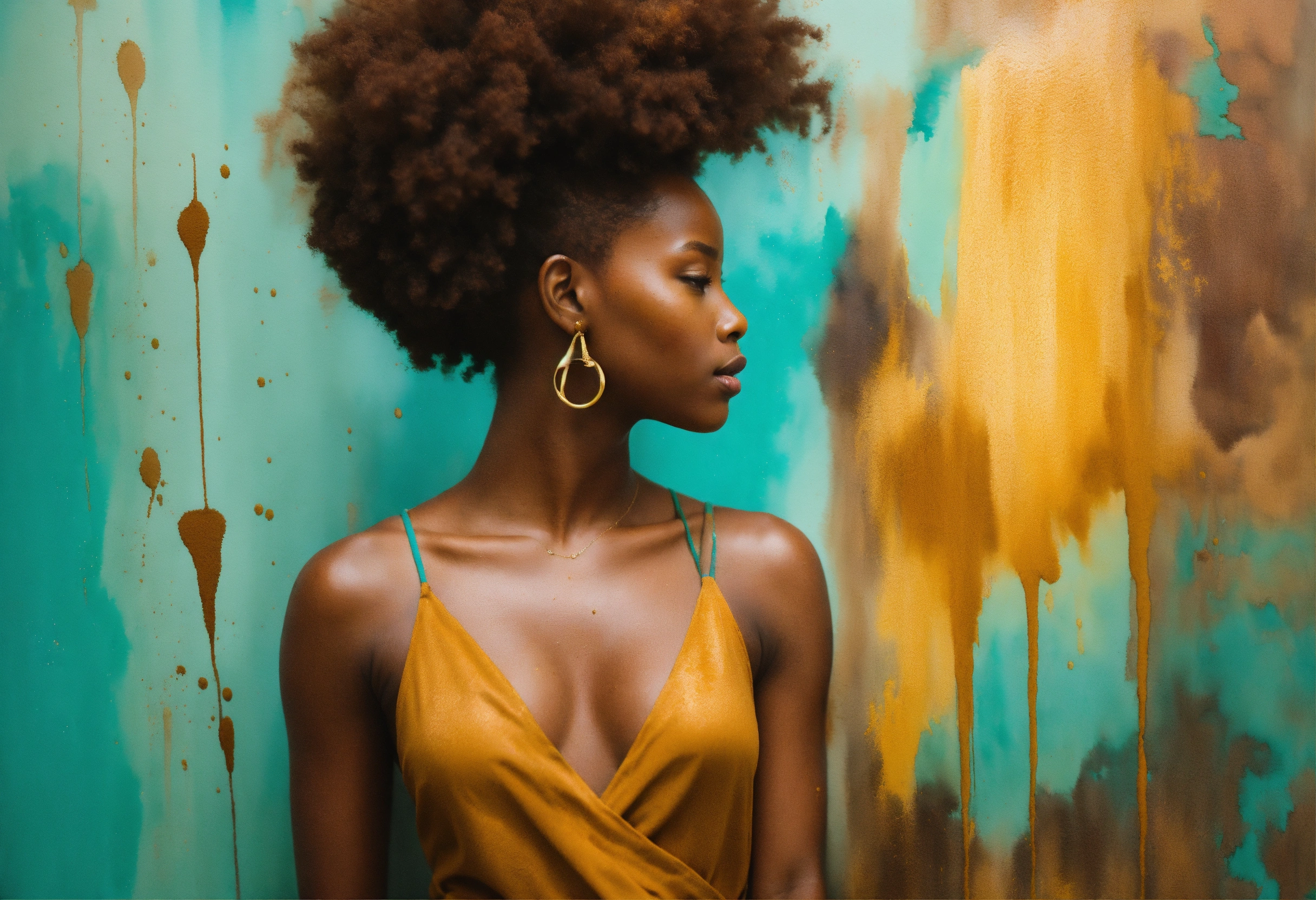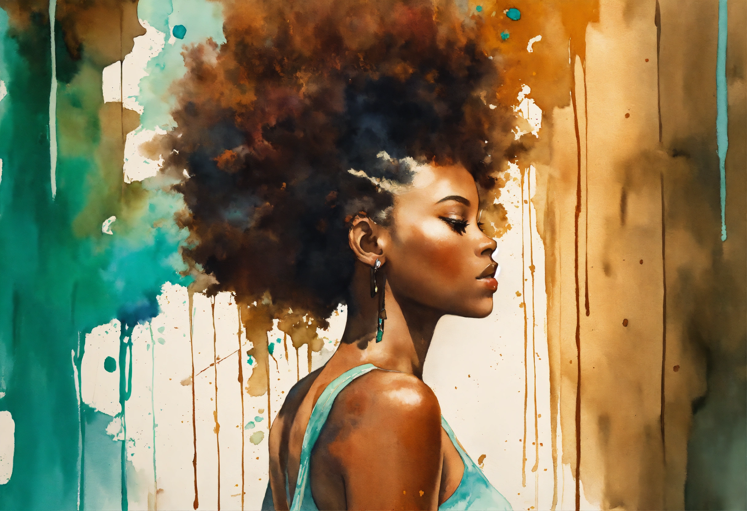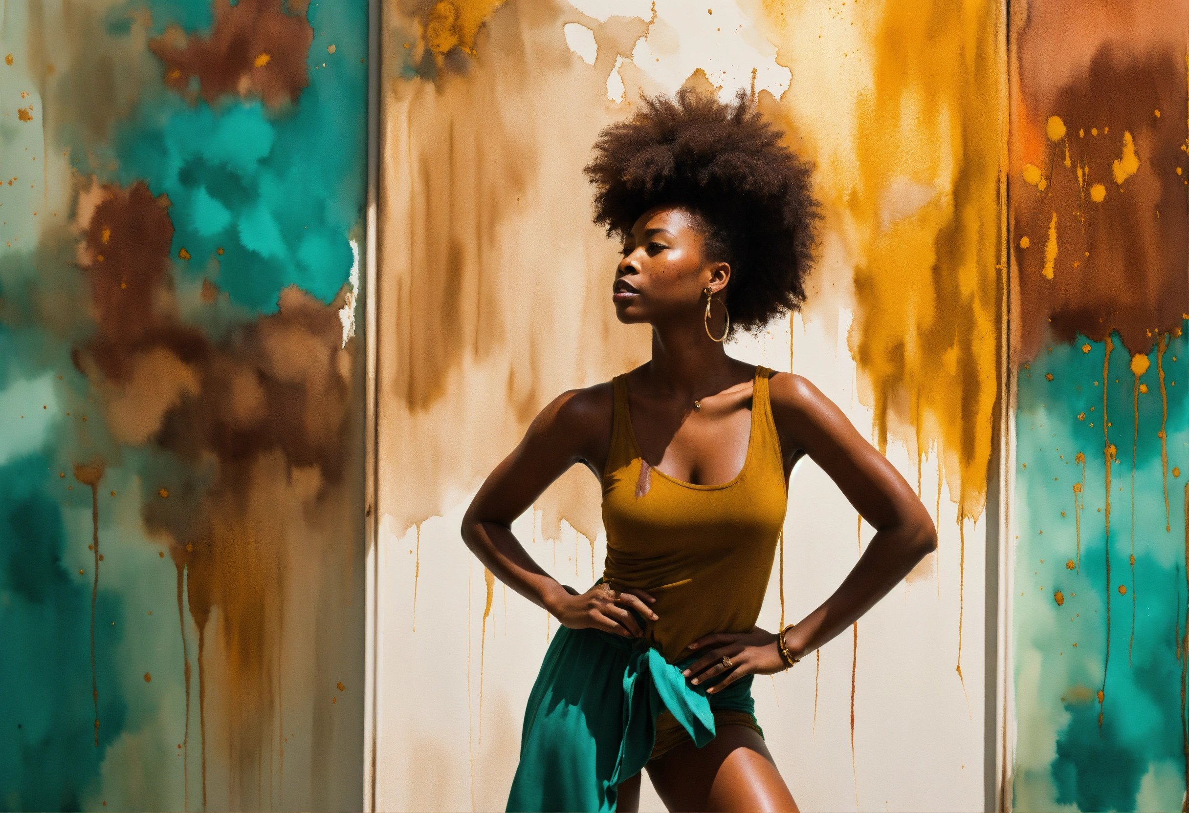 Action shot breaking through a gallery wall a beautifully majestic afrocentric woman holding on with dear life to the reflection of herself standing next to the wall to drag back towards herself, color palette; turquoise rich mahogany burnt umber mustard shades of verde, rule of thirds, watercolor paint splatter