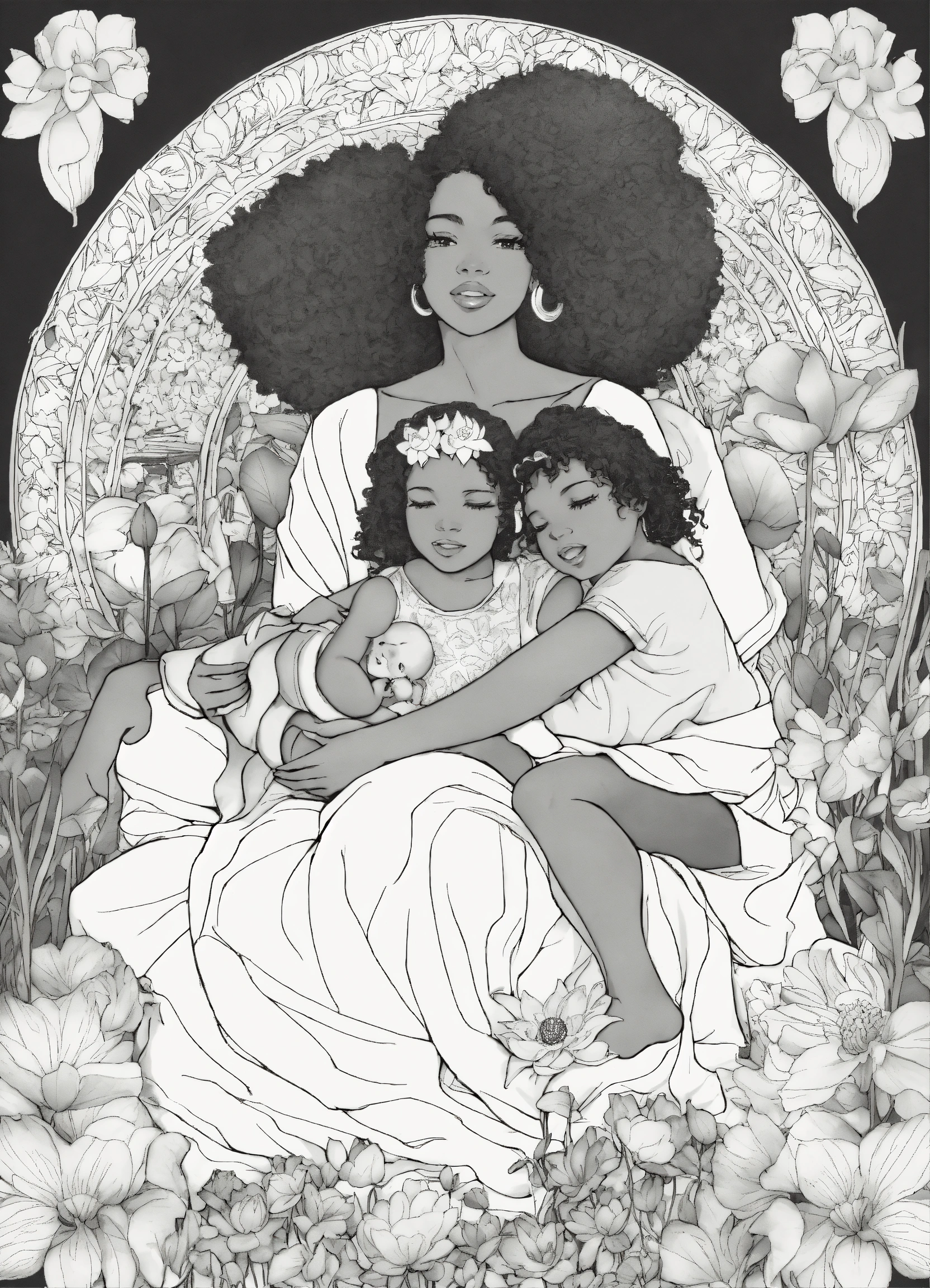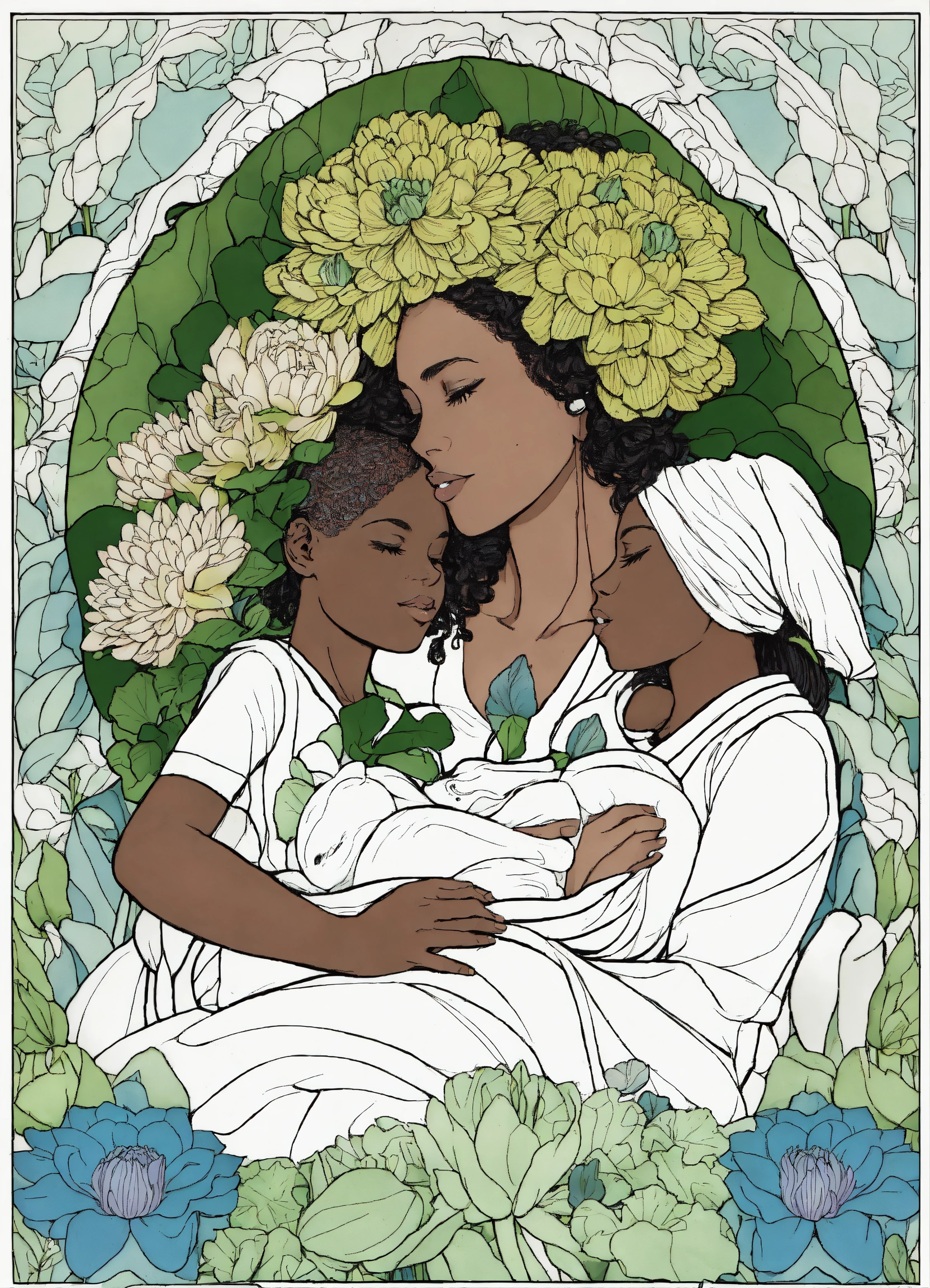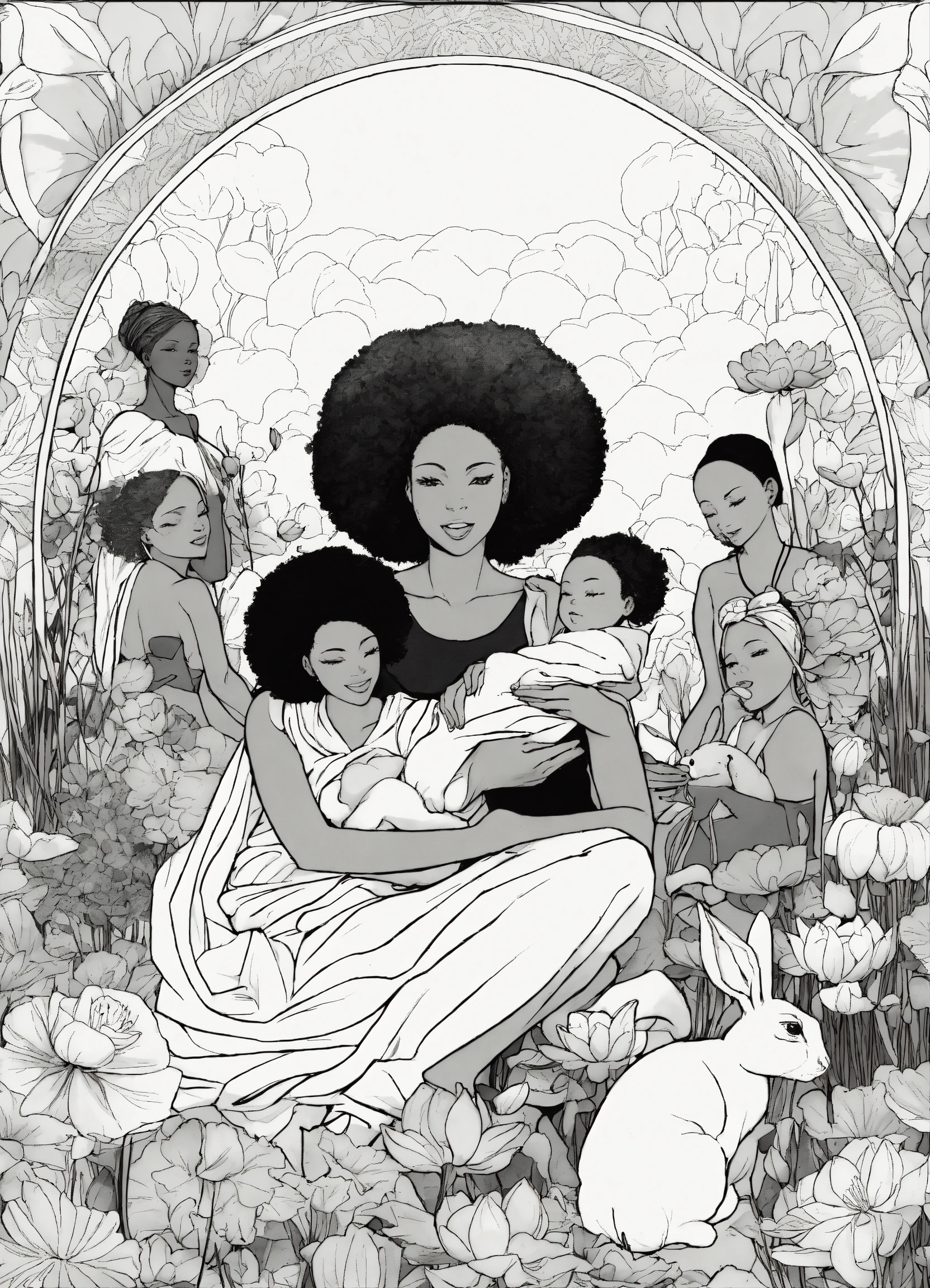 Black and white image coloring book dicerse group of african american women, sisterhood, large rabbits, blue and green, lotus flowers holding babies
