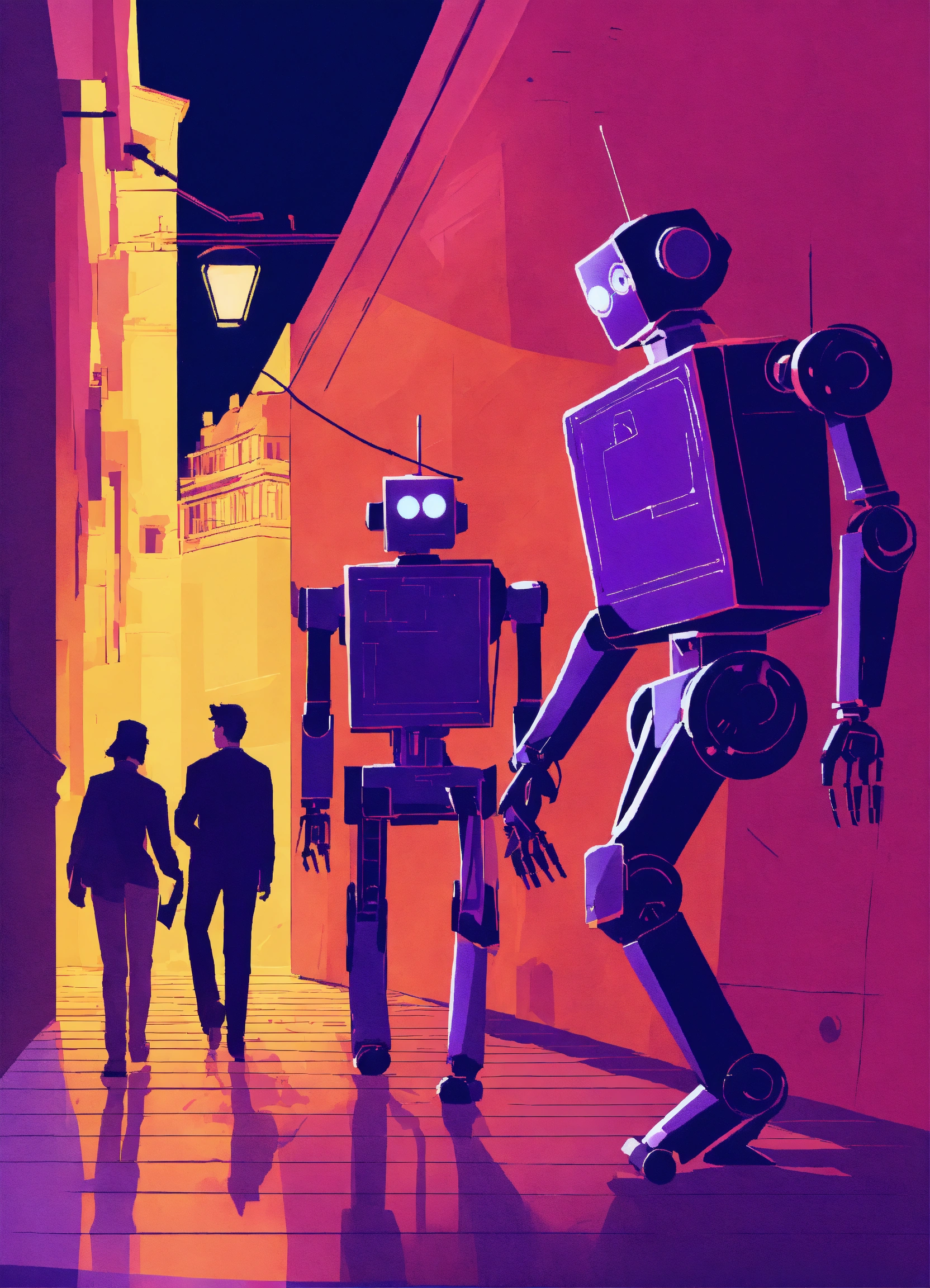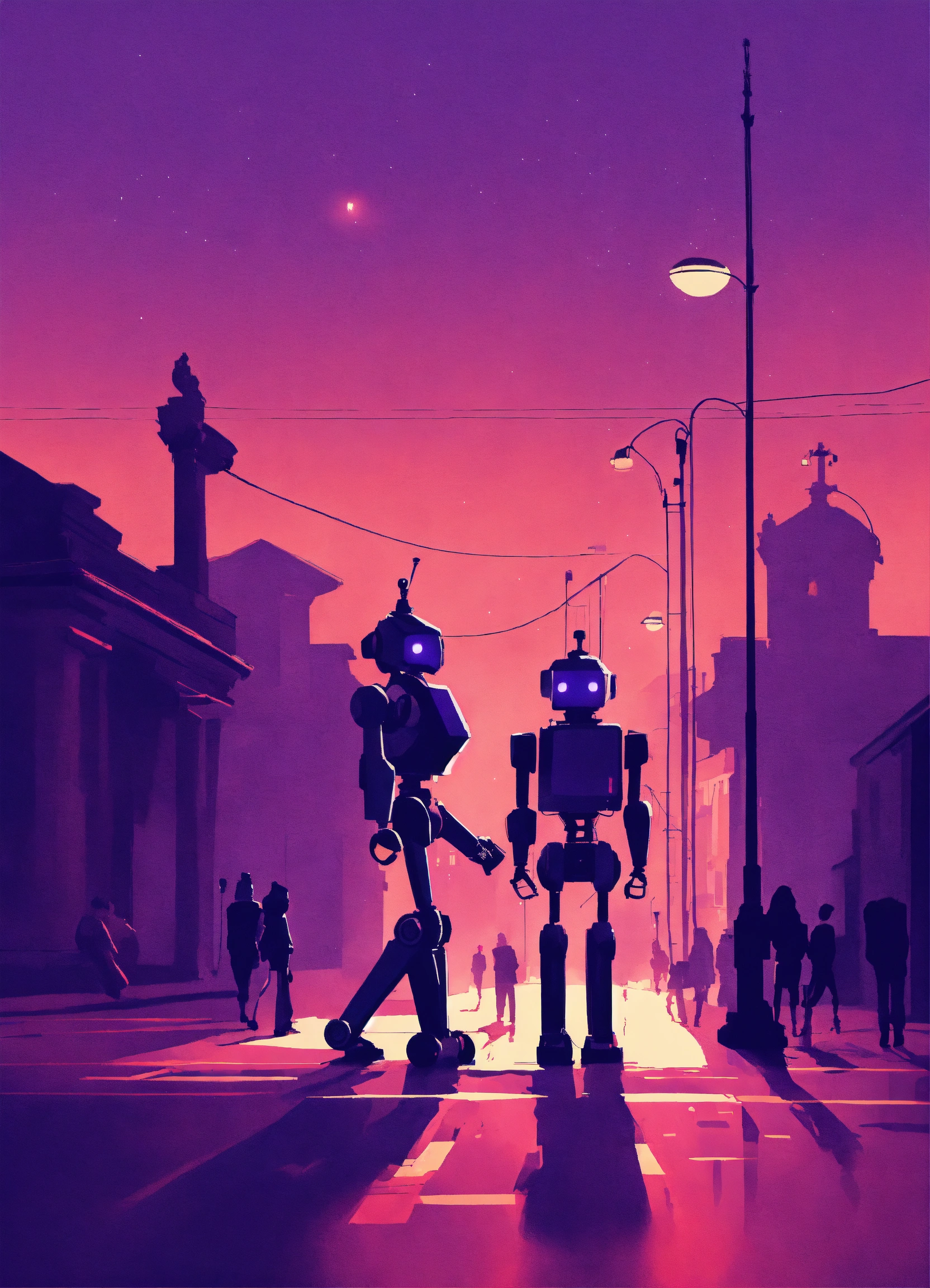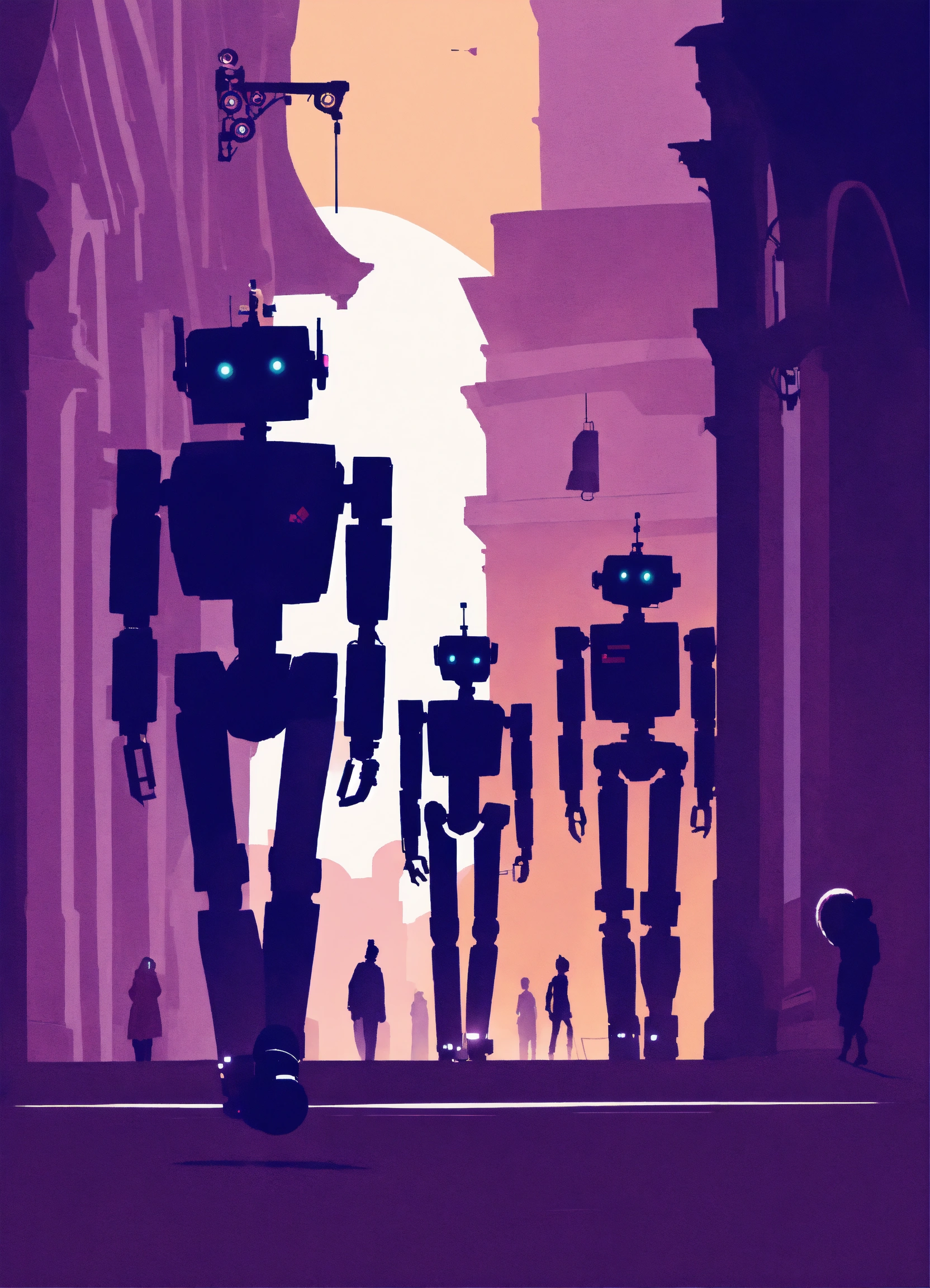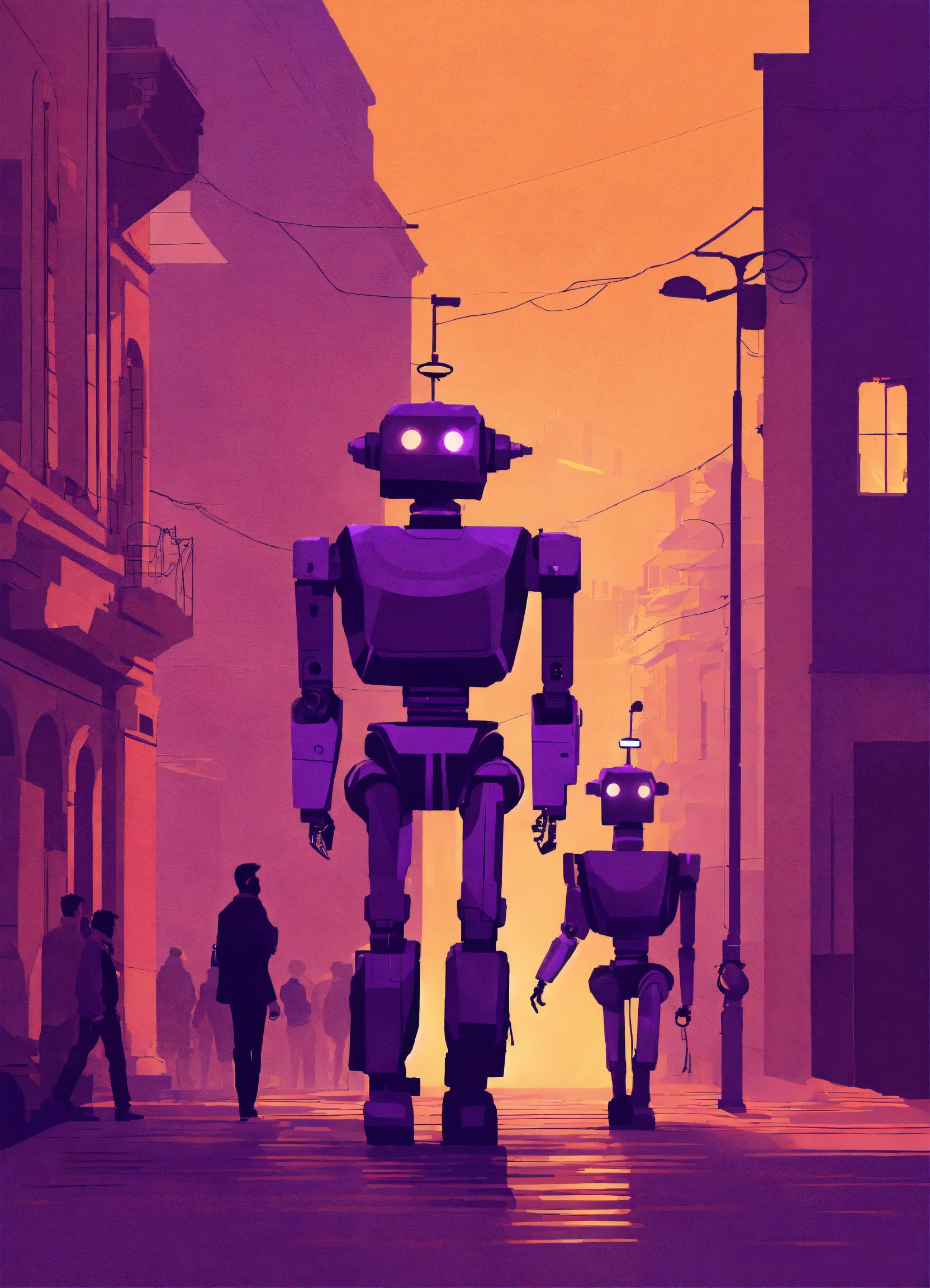 An illustration, robots walking with humans, digital, in roma, dark purple style, minimalist, refined