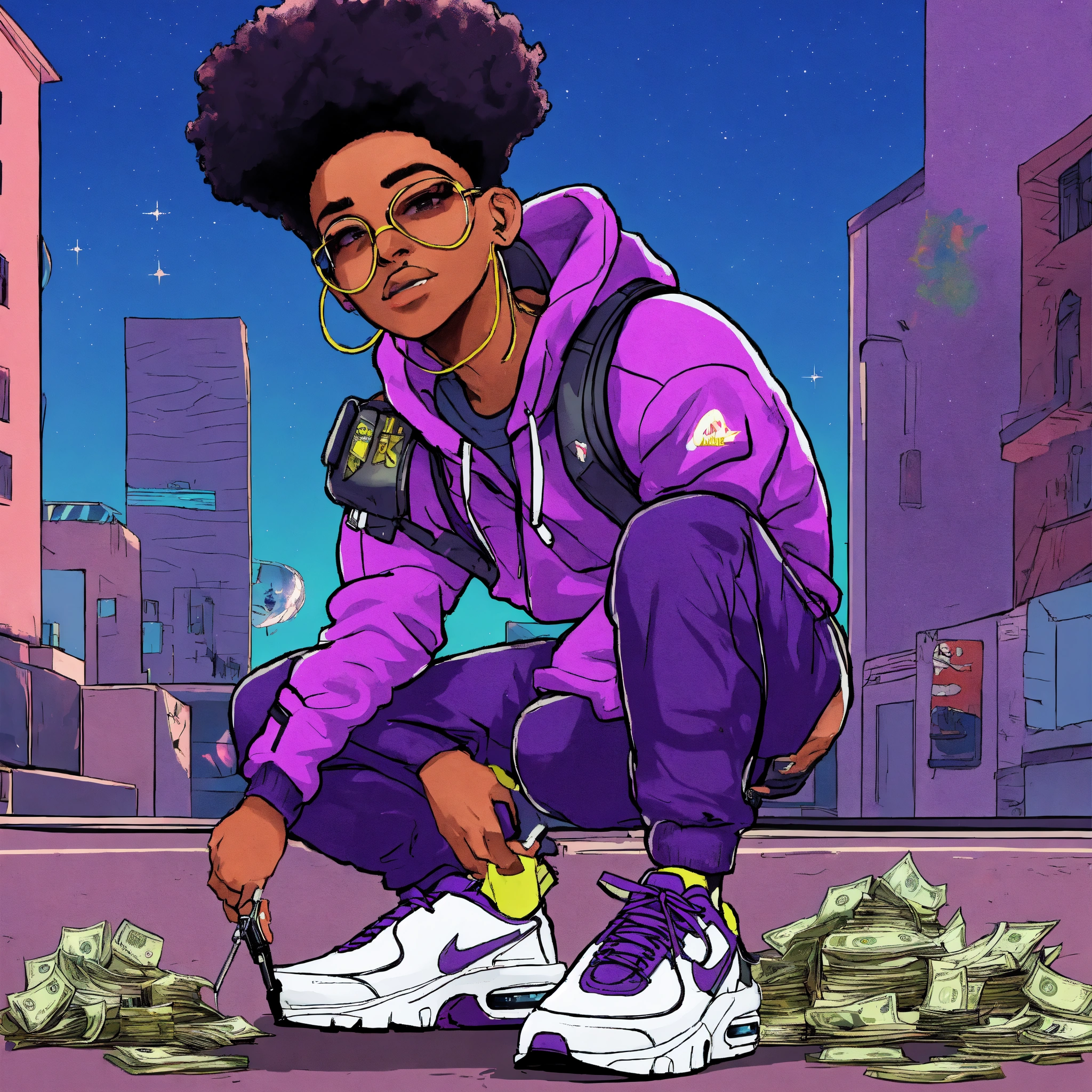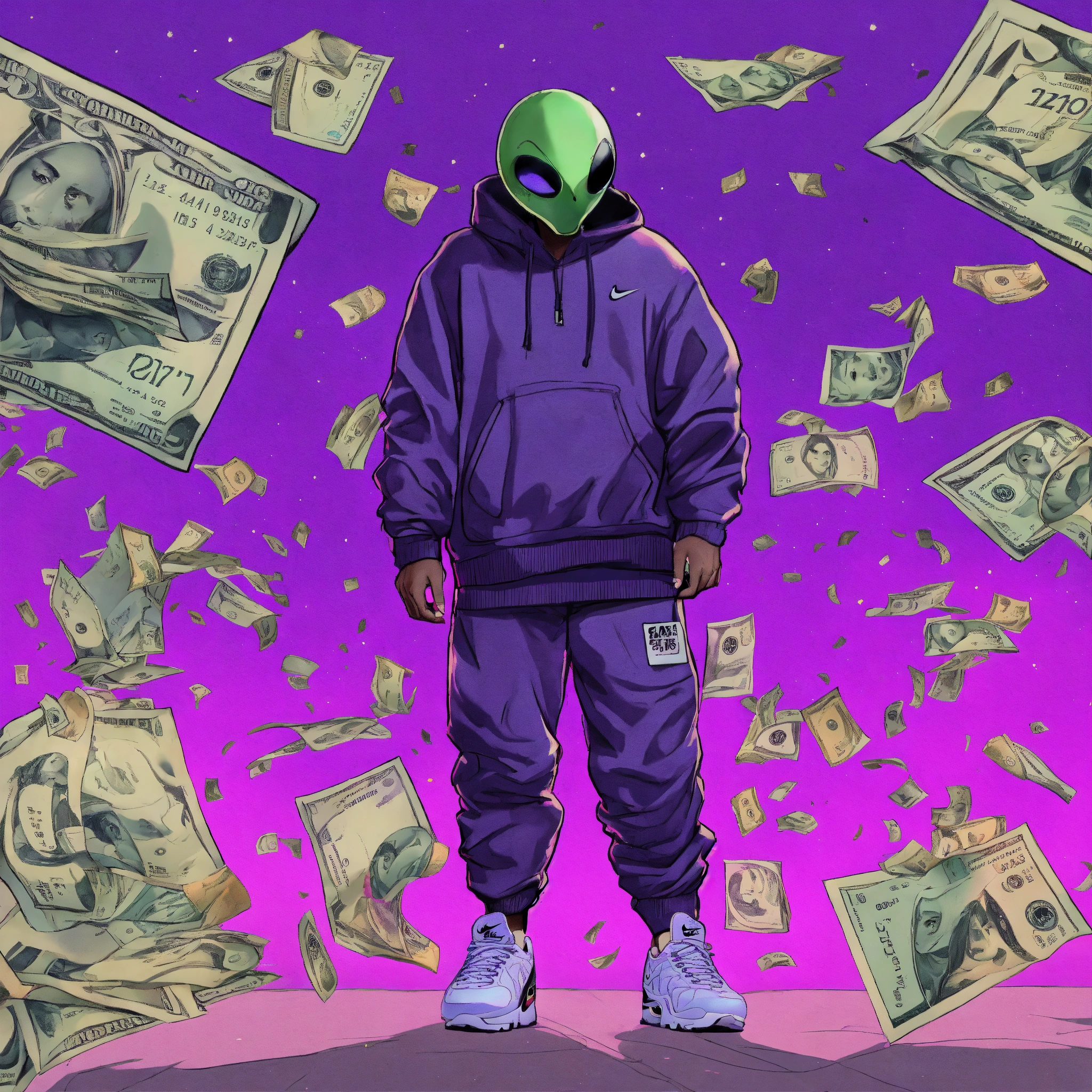 Criminal, alien face, jogging pants, nike air max plus, pistol, drawing, art, 4k, cartoon style, bundles of money, ghetto, galaxy purple