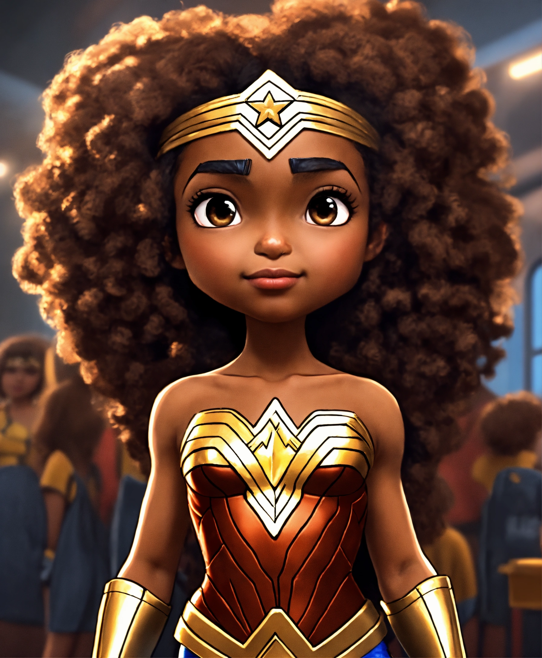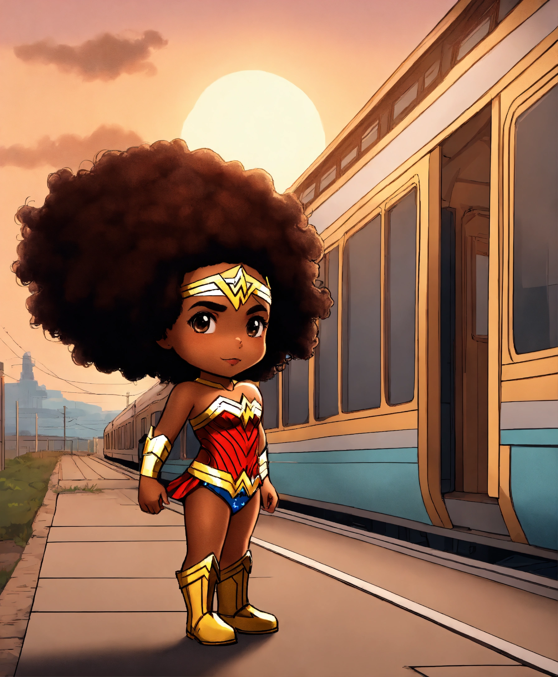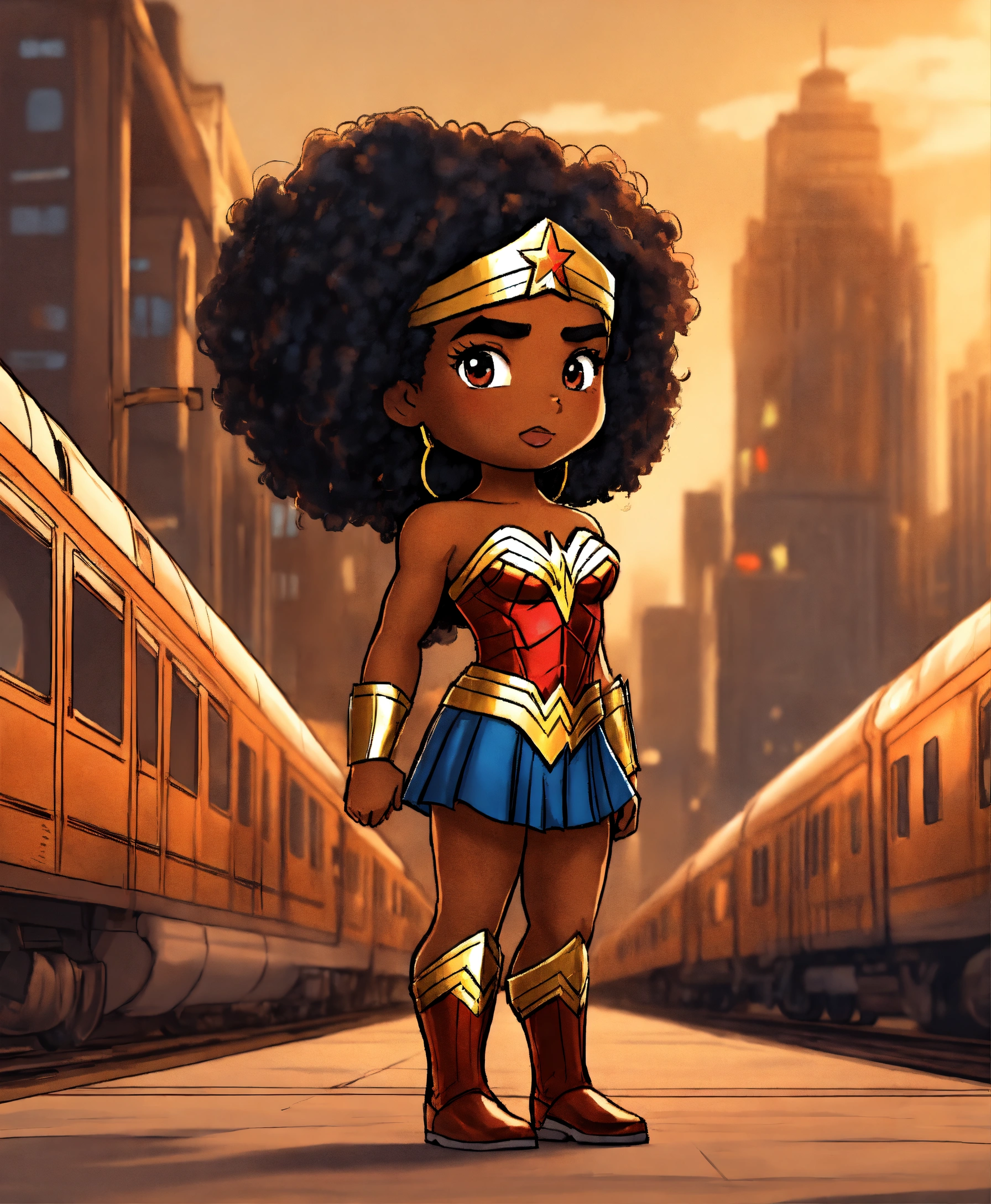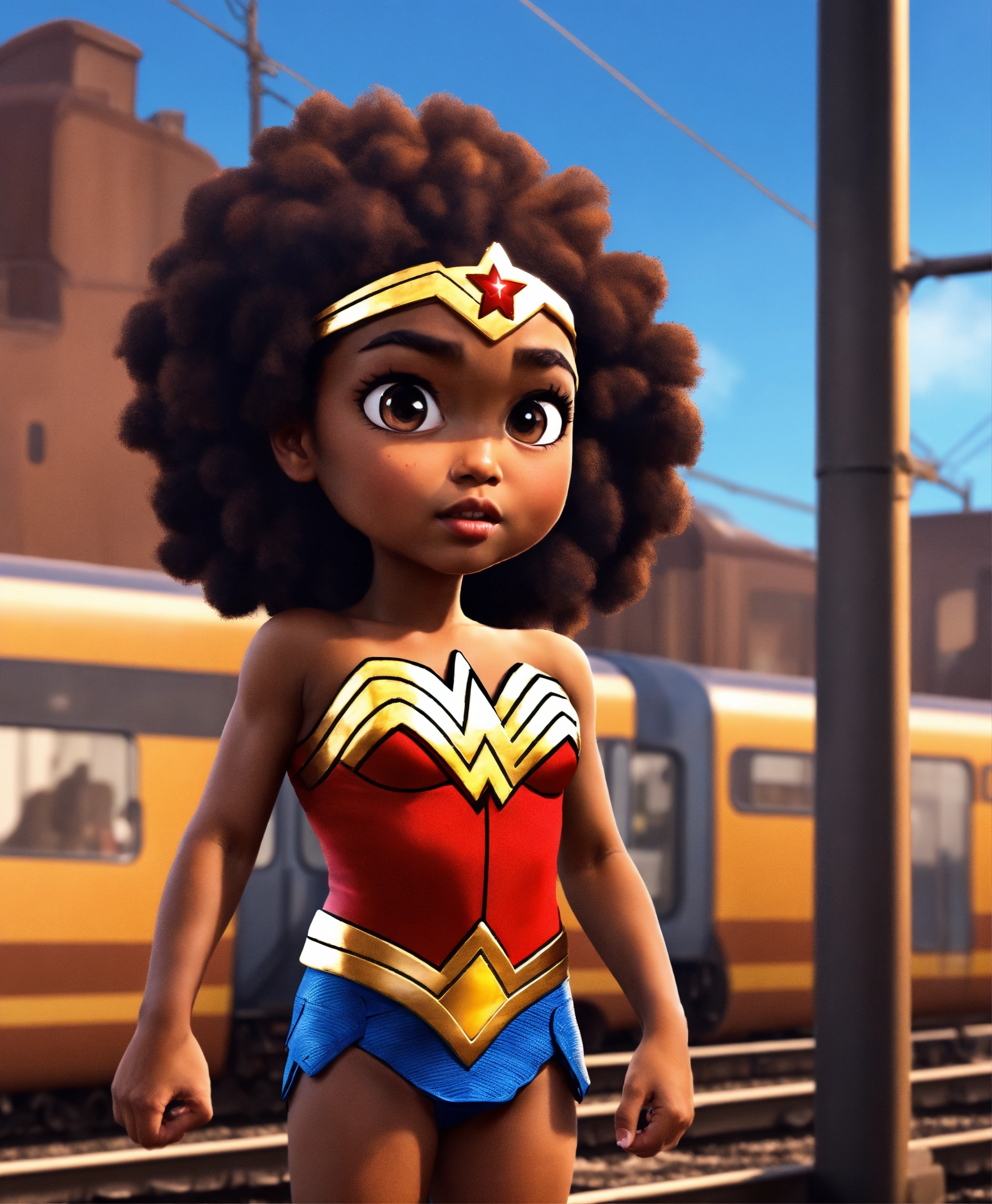 Brown skin wonder woman, little girl, train, standing, afro hair beautiful extremely detailed 8k cartoon