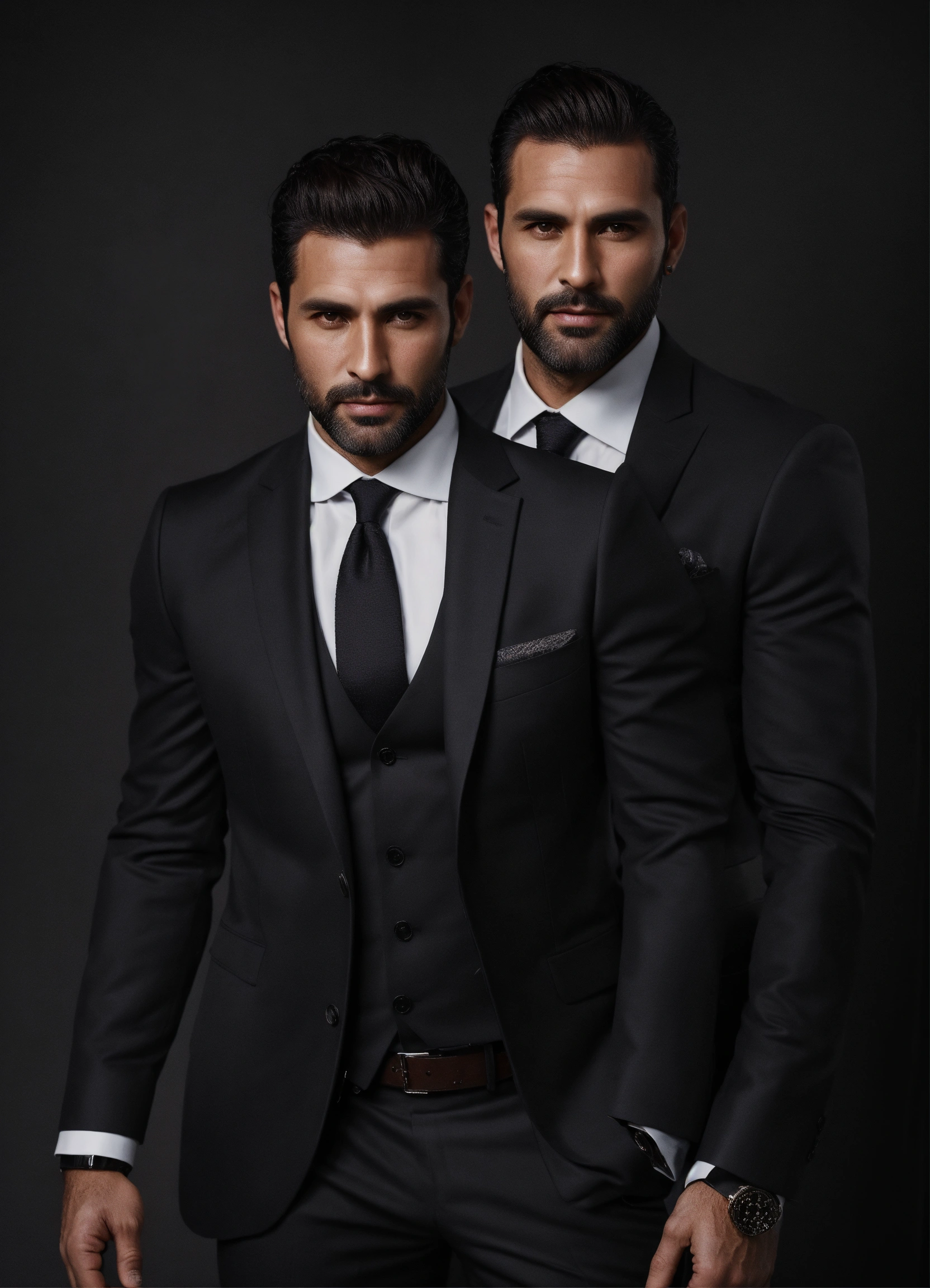 Ultra-realistic handsome 38-year-old man with dark brown straight hair, model with light eyes of arab origin, fashionable strict black suit, full length, dark background, photorealistic.
