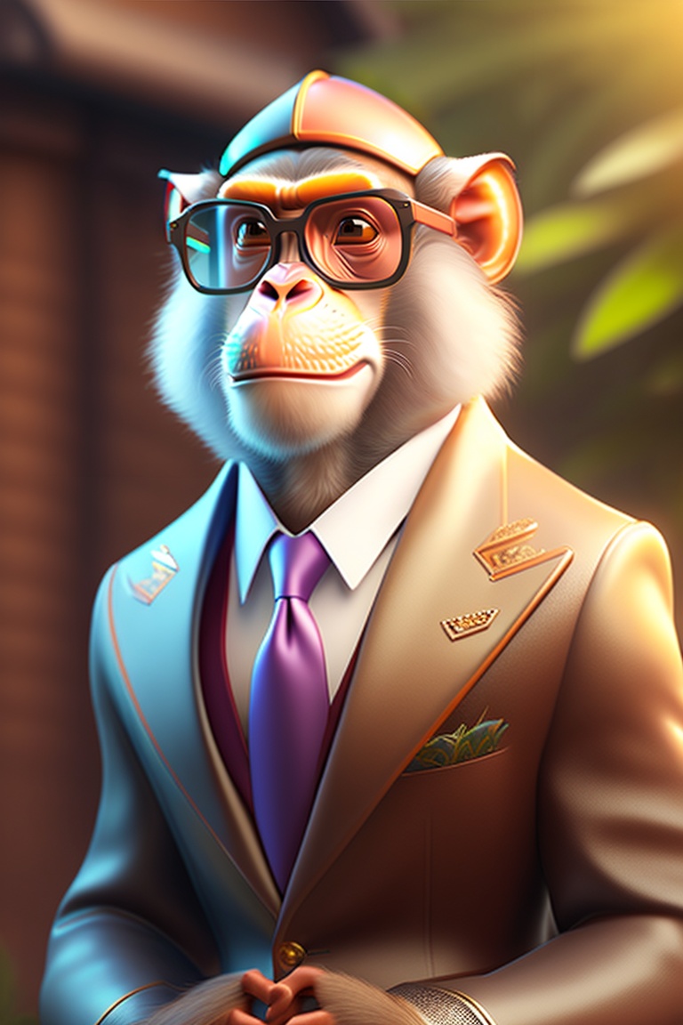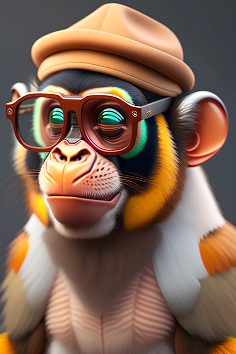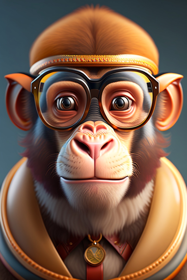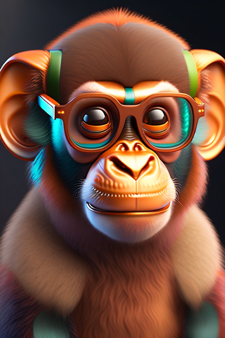 A detailed illustration of a monkey with noican wearing glasses 4d art, 4k resolution lighting, photorealistic rendering, using cinema 4d