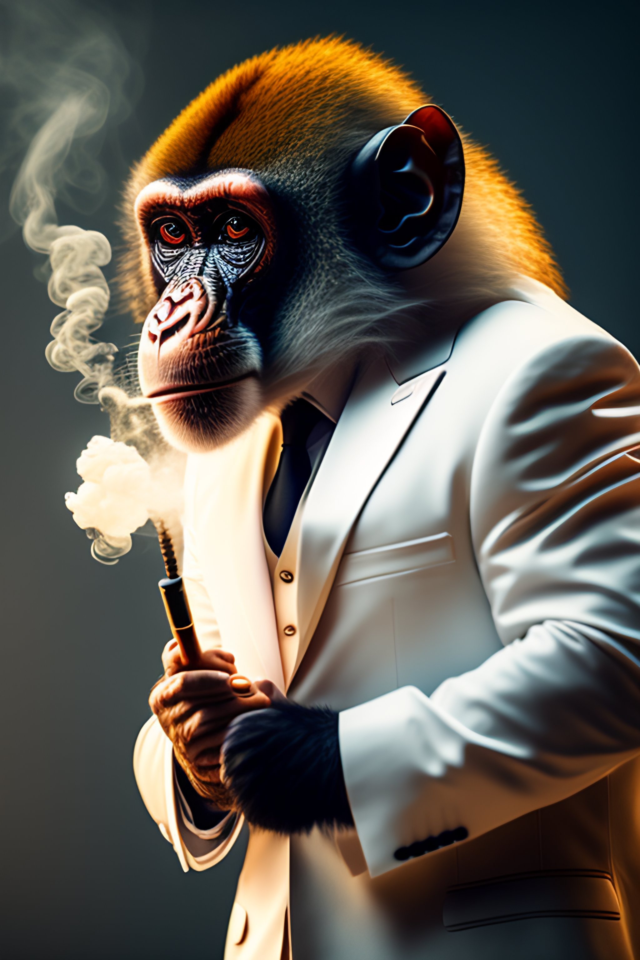Monkey smoking a cigarette while listening to jazz, in a super elegant white suit high definition image