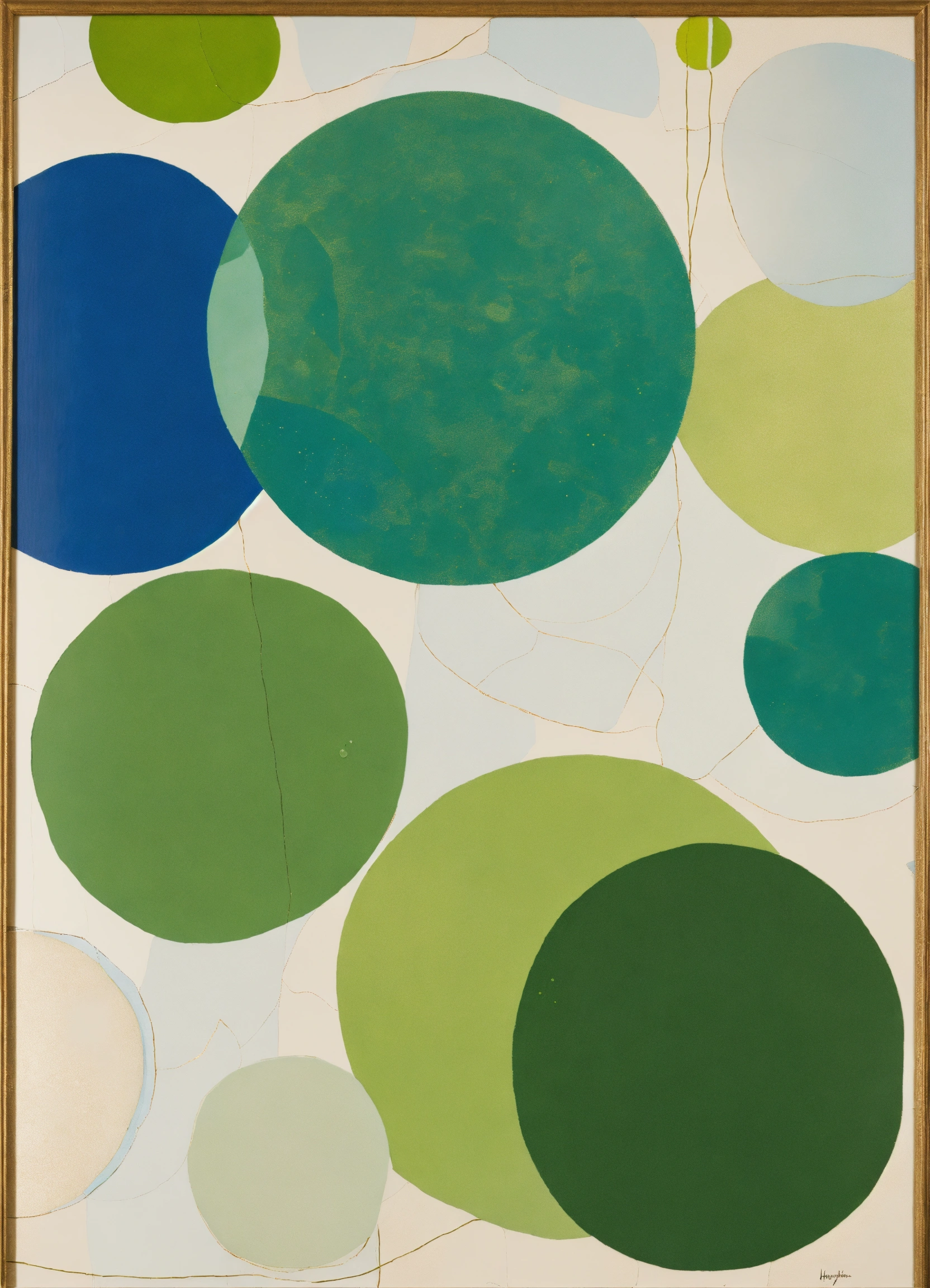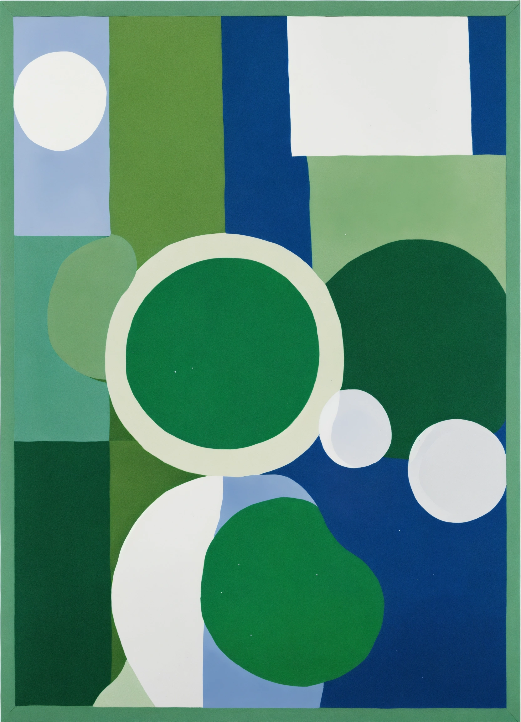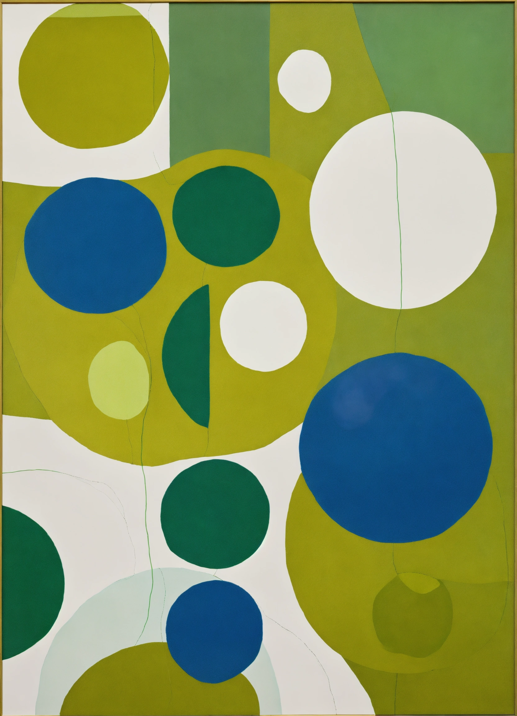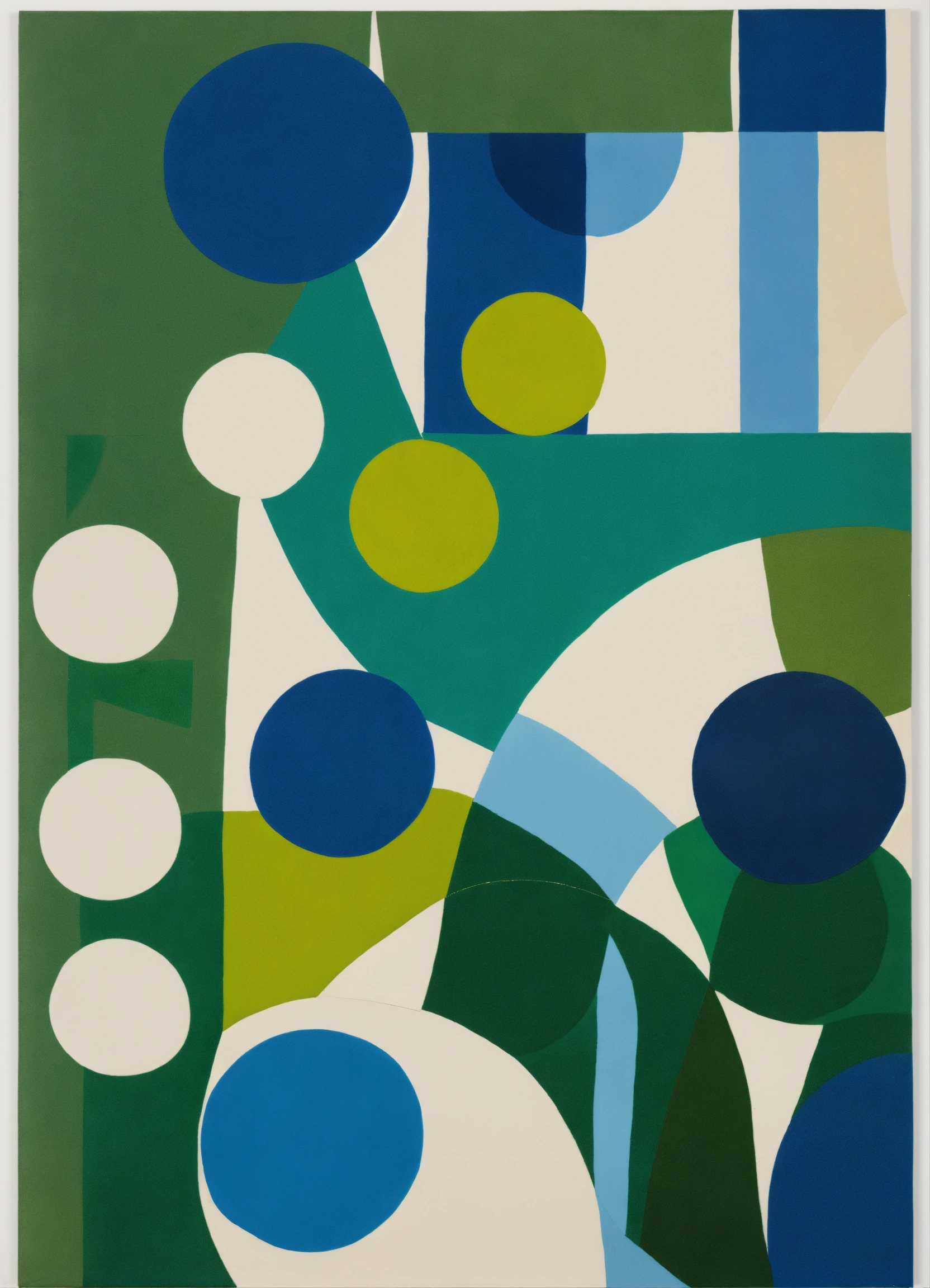 A paper collage art by henry matisse depicting round transparent bubbles in green, white, blue colors