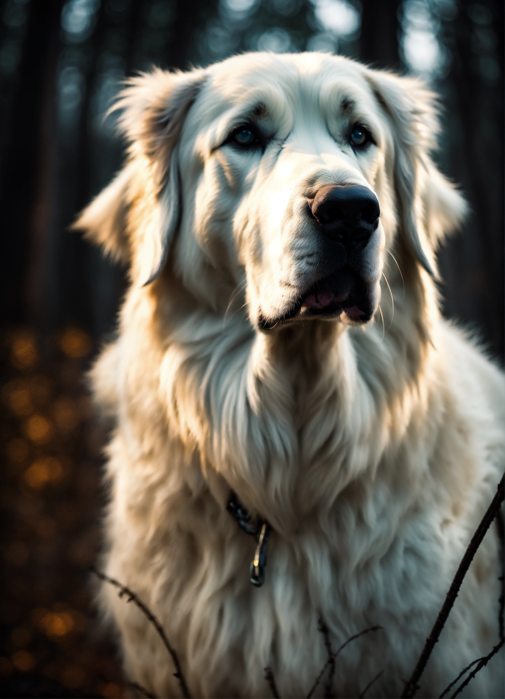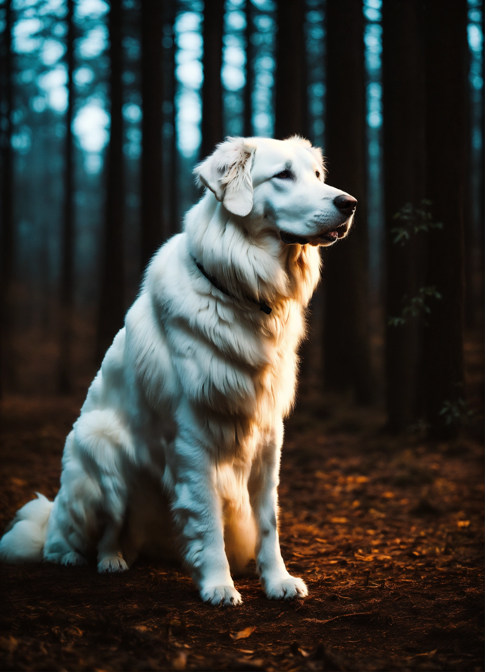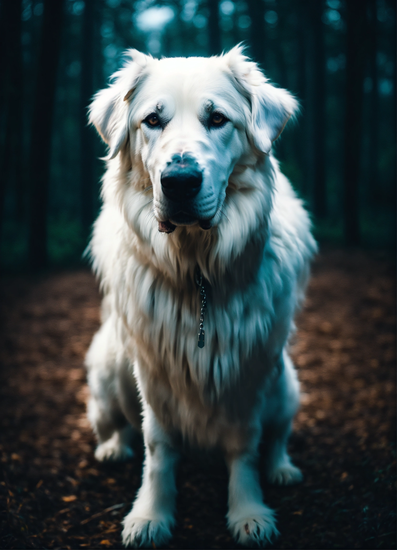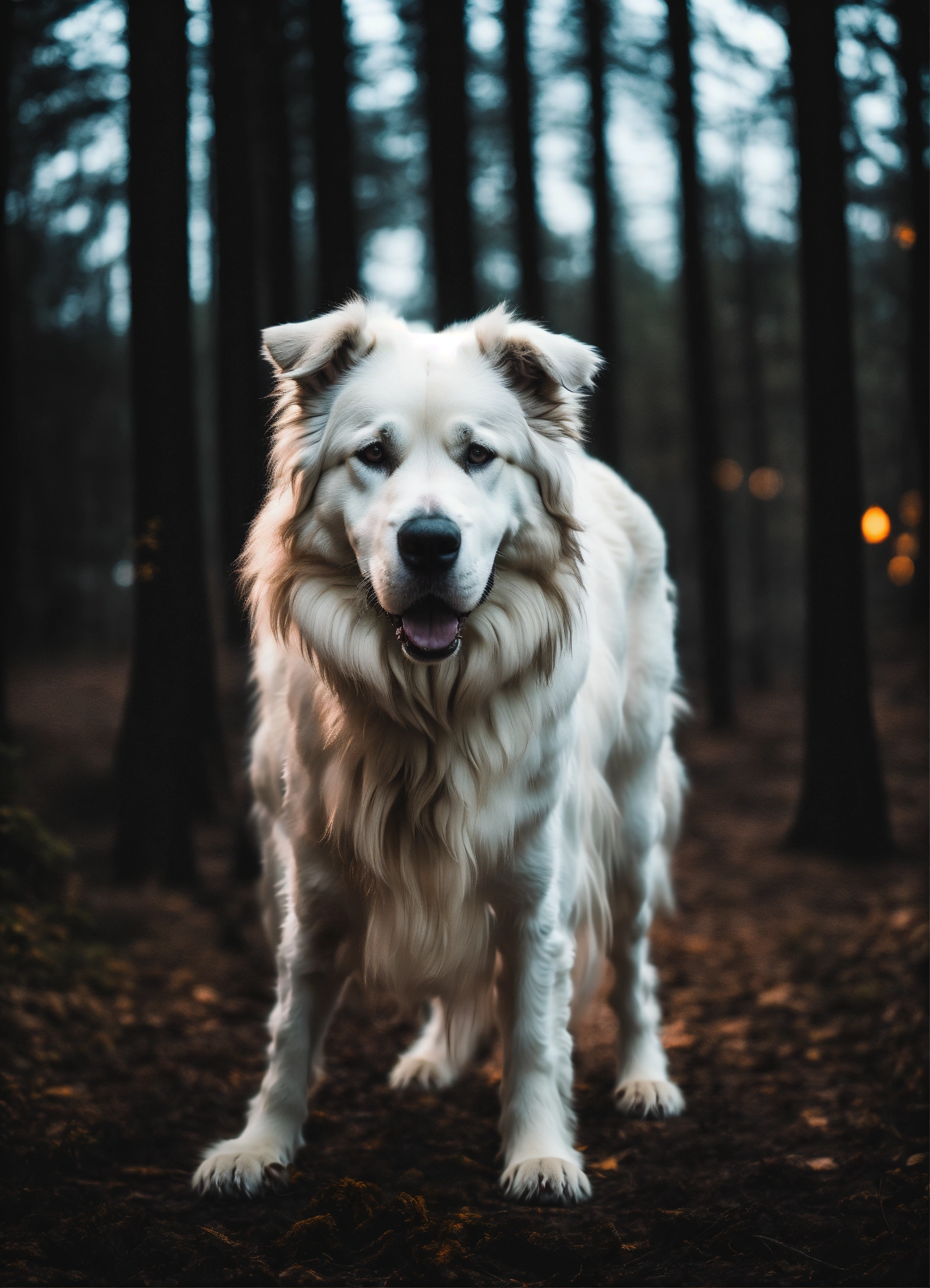 Realistic full body award winning photo of a large white dog with a long luminous coat, ominous, powerful, terrifying, emotional, photoshoot by albi, background is frightening forest at night. film grain.