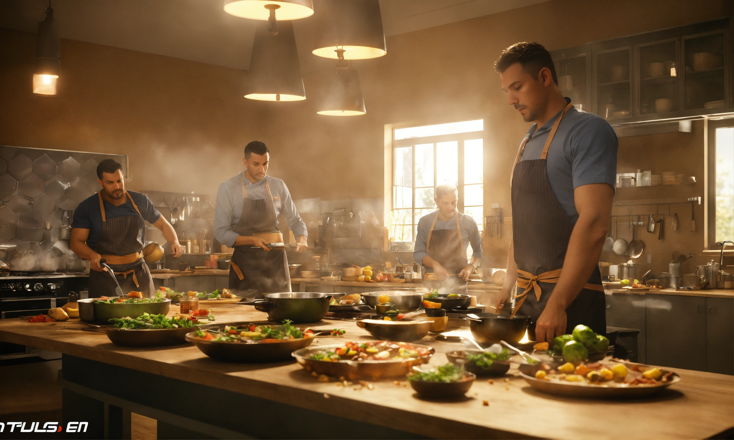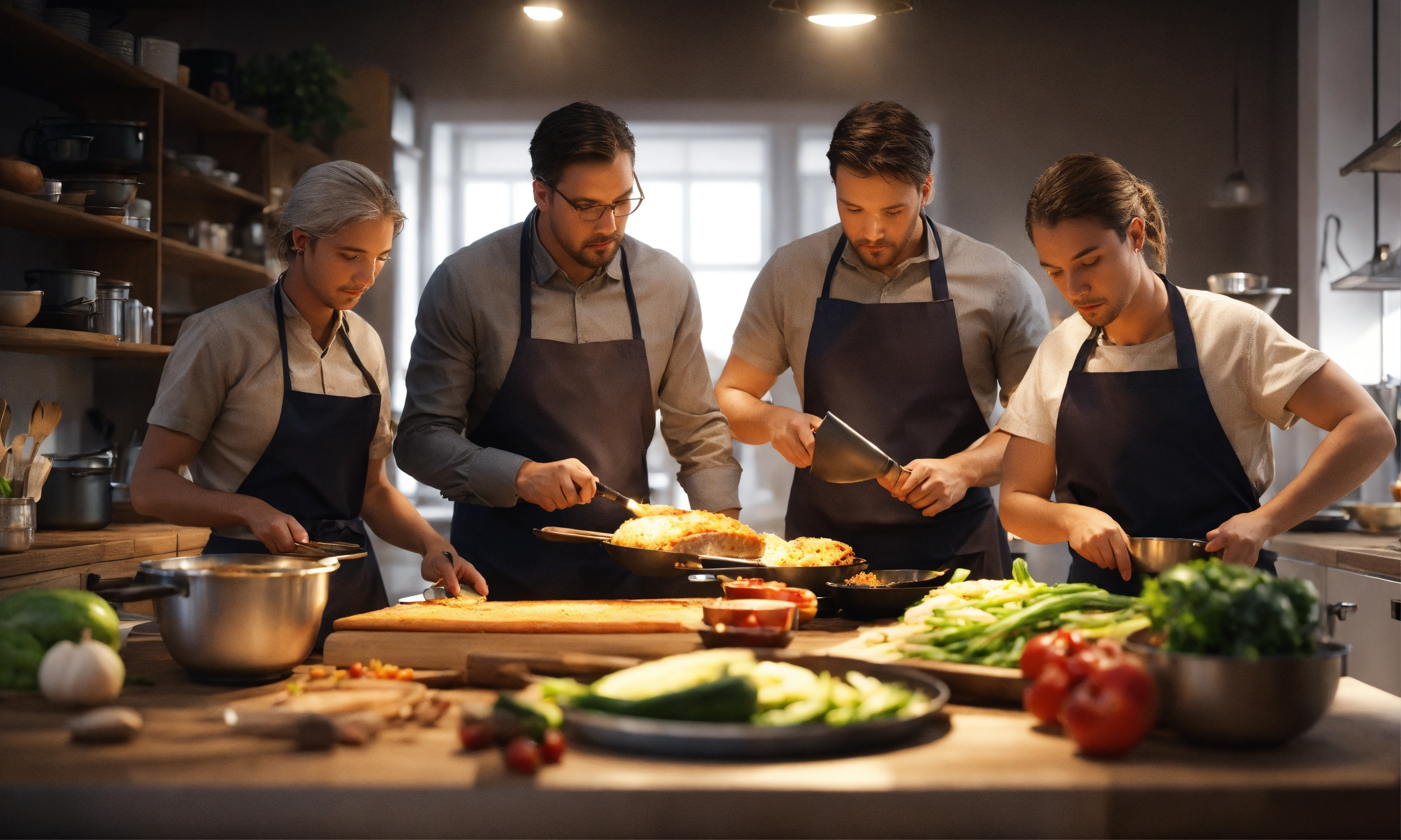 Team of people. teacher's master class for a group of people on cooking. octane render, trending on artstation, highly detailed, lighting, professional, realistic, sharp focus, 4k, 8k, high resolution, candid, personal, –testp, bright lighting, ultra-detailed, bright lighting, photo, high quality photo, cinematic shot, volumetric light, imax