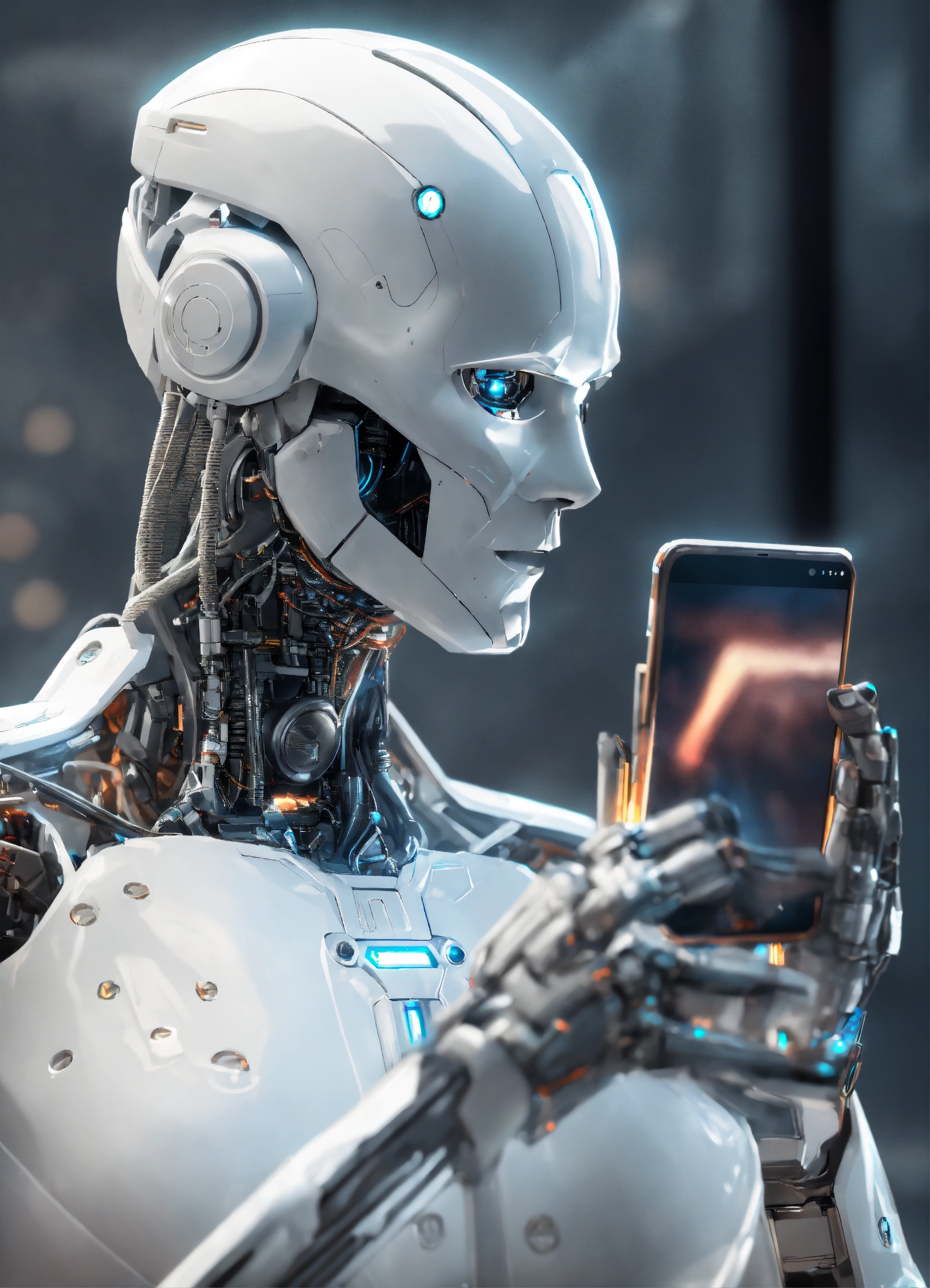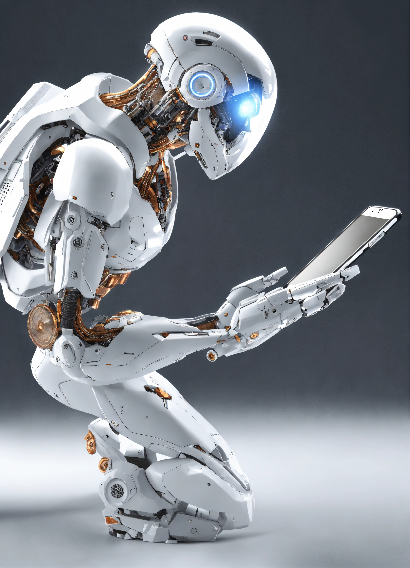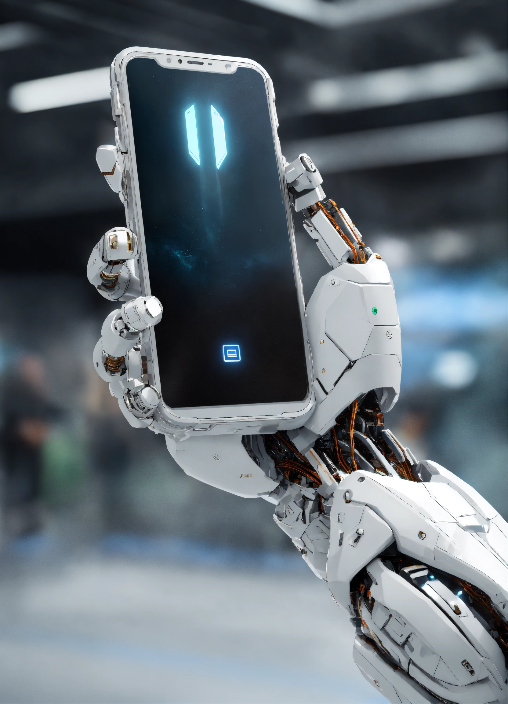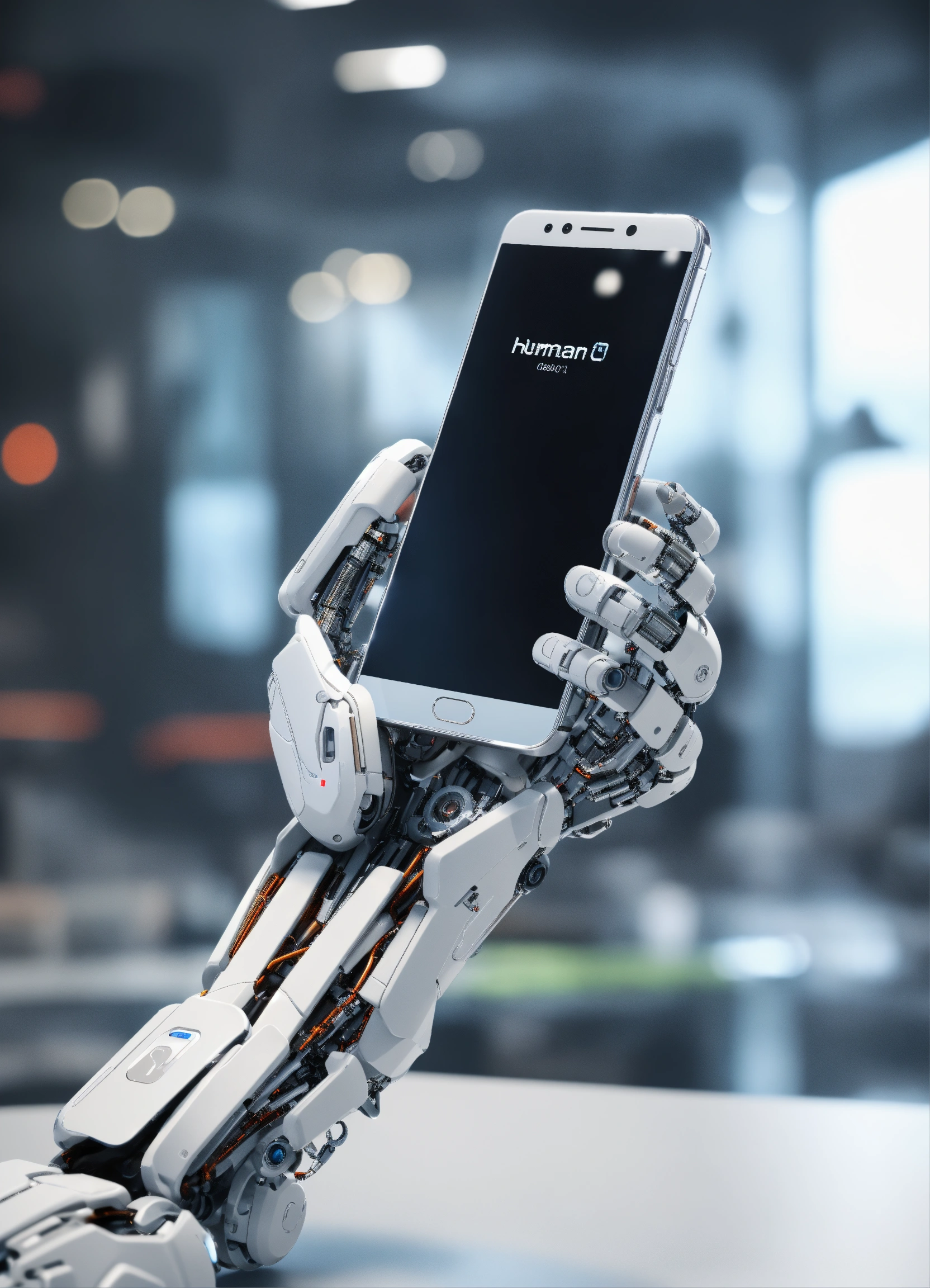 White humanoid cyborg arm holding smartphone