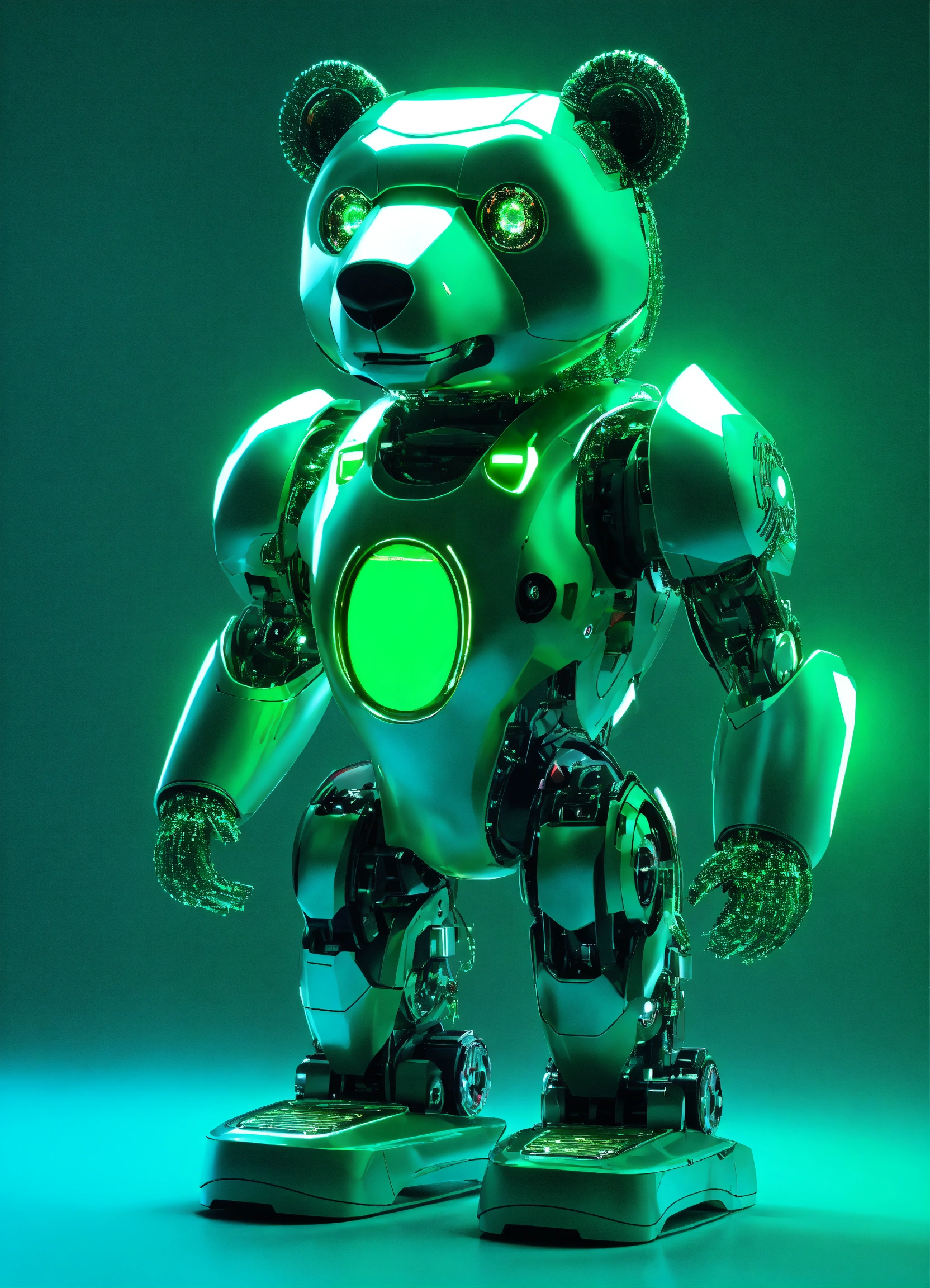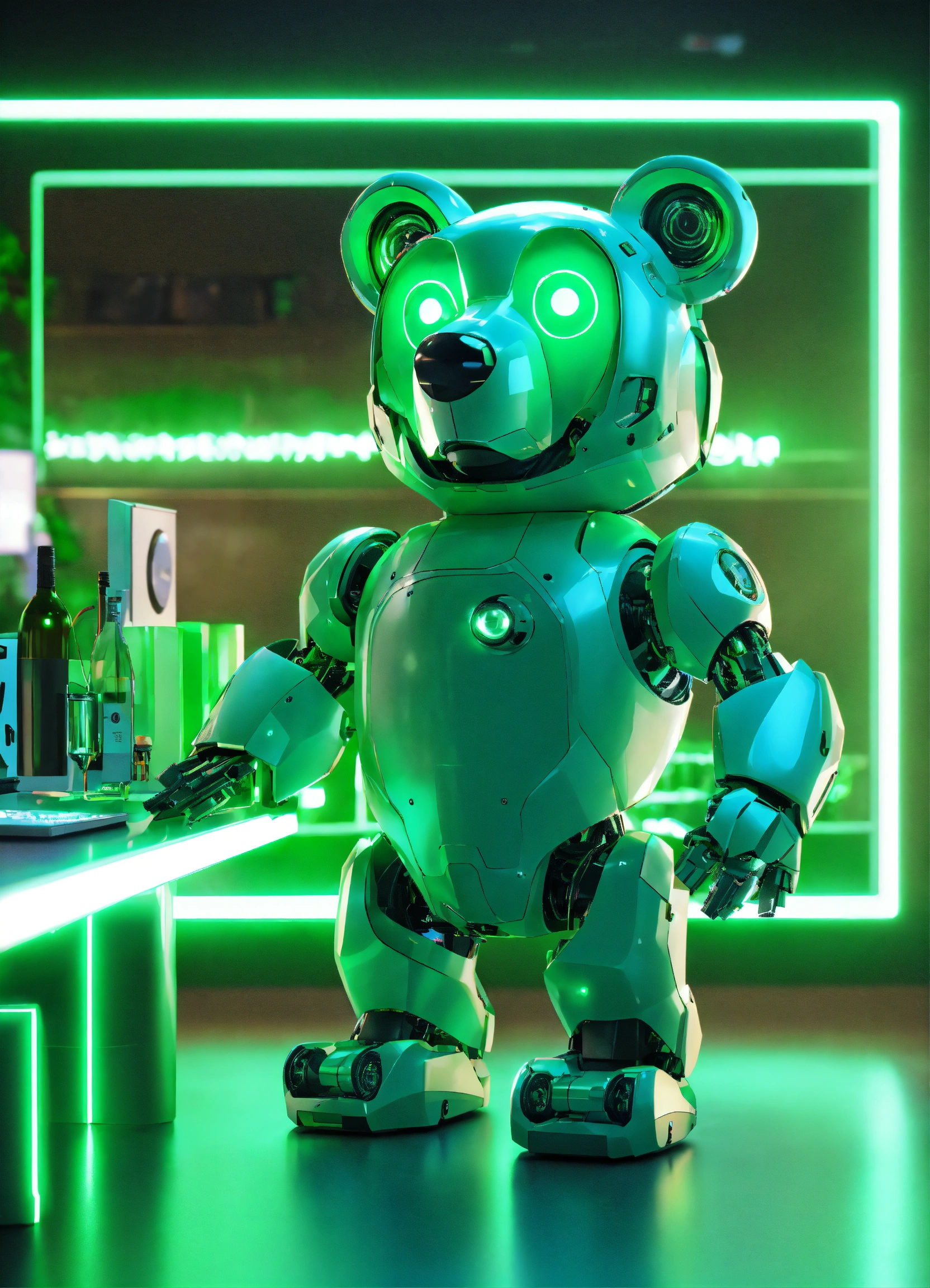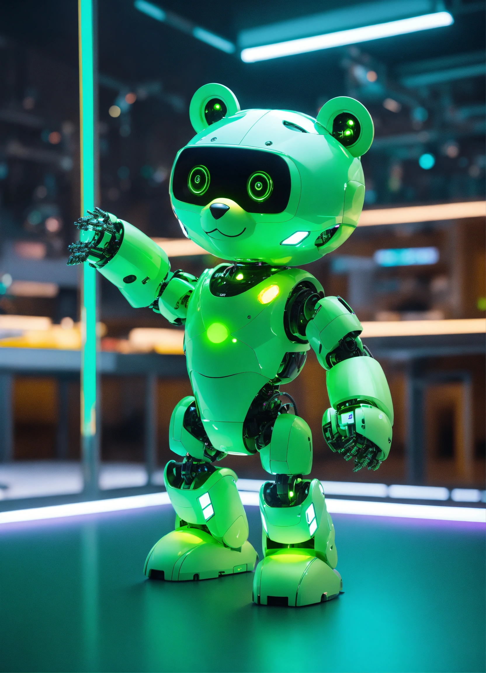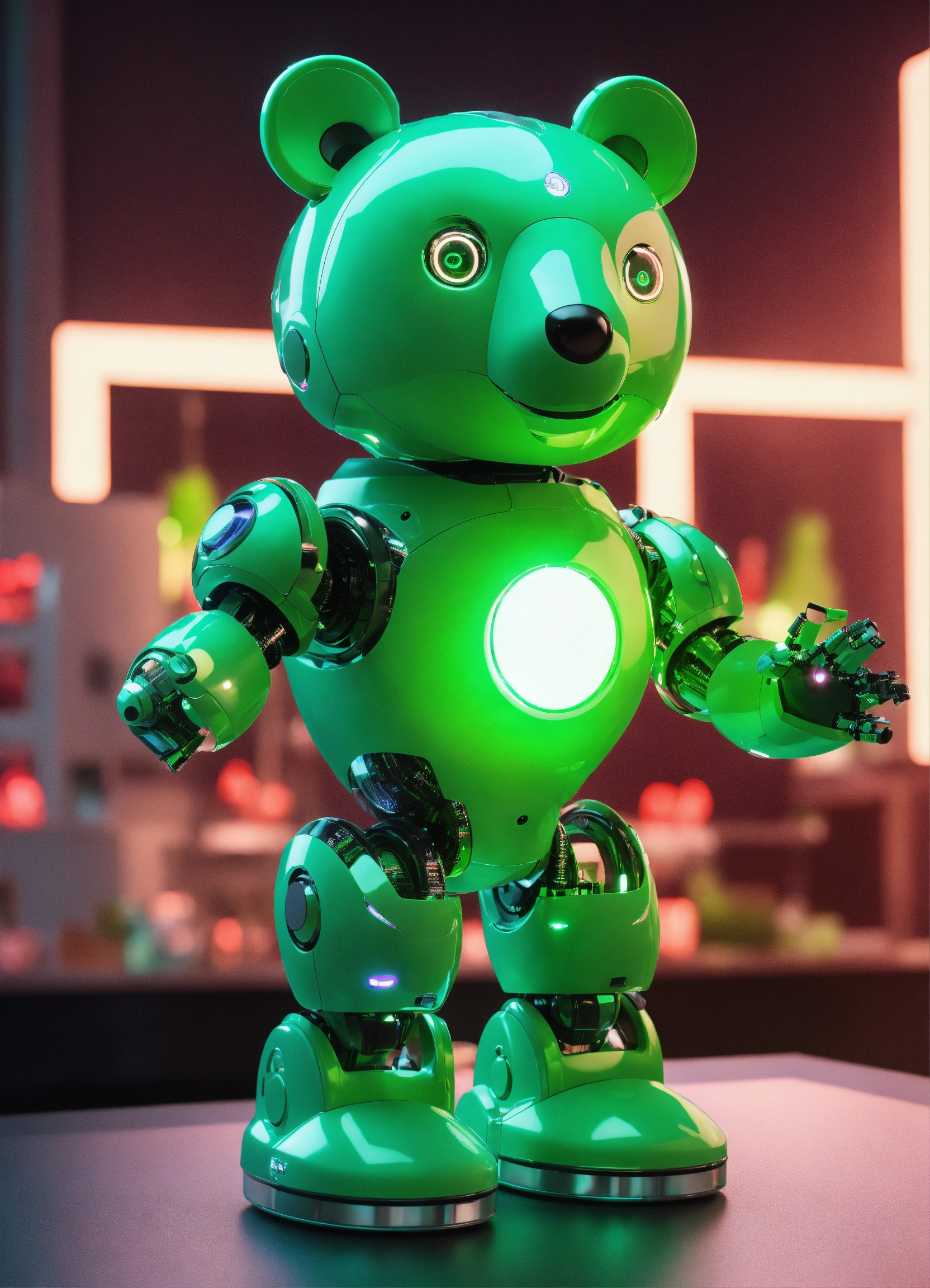 Create a green robotic bear with sparkling eyes, standing behind a big luminous hi-tech table, waving at the camera in 3d, eye level