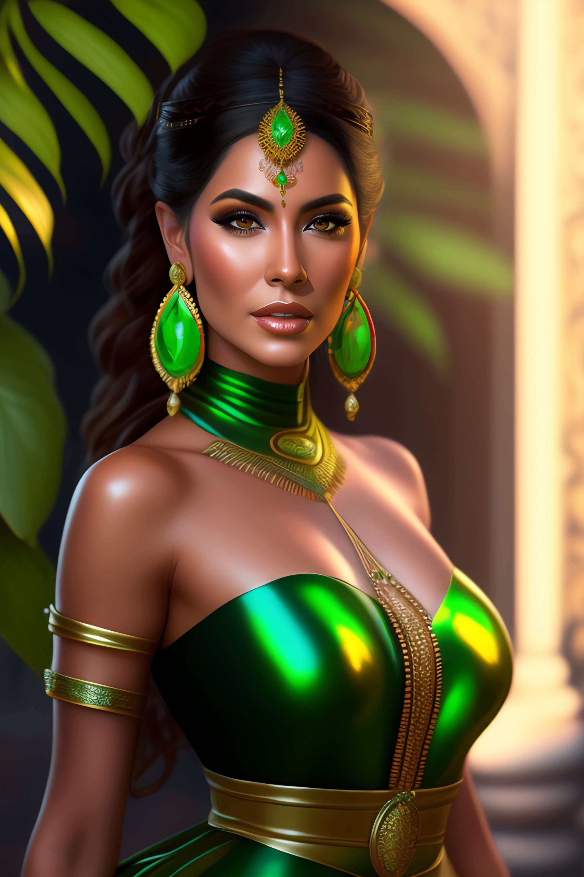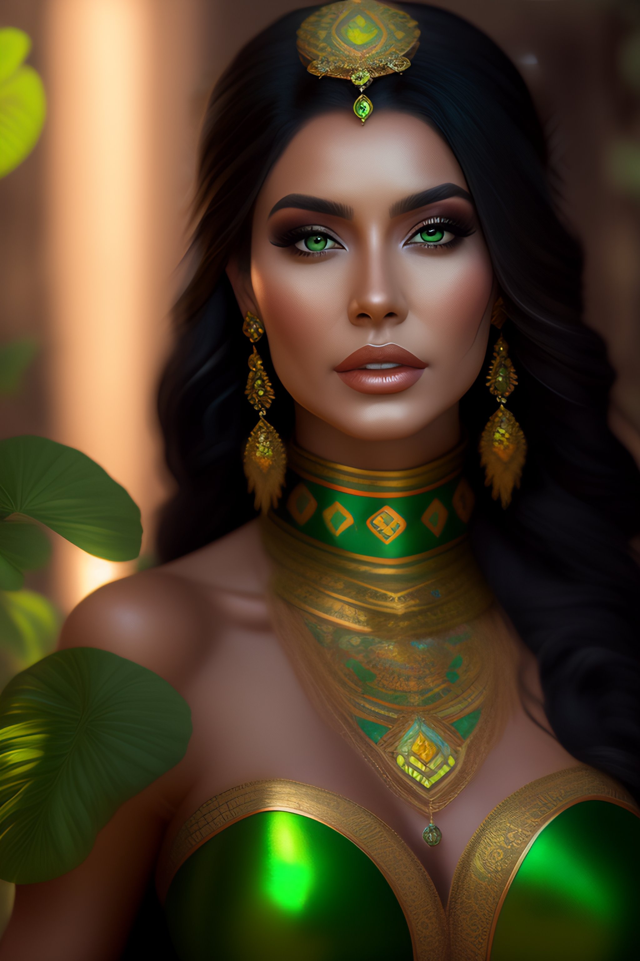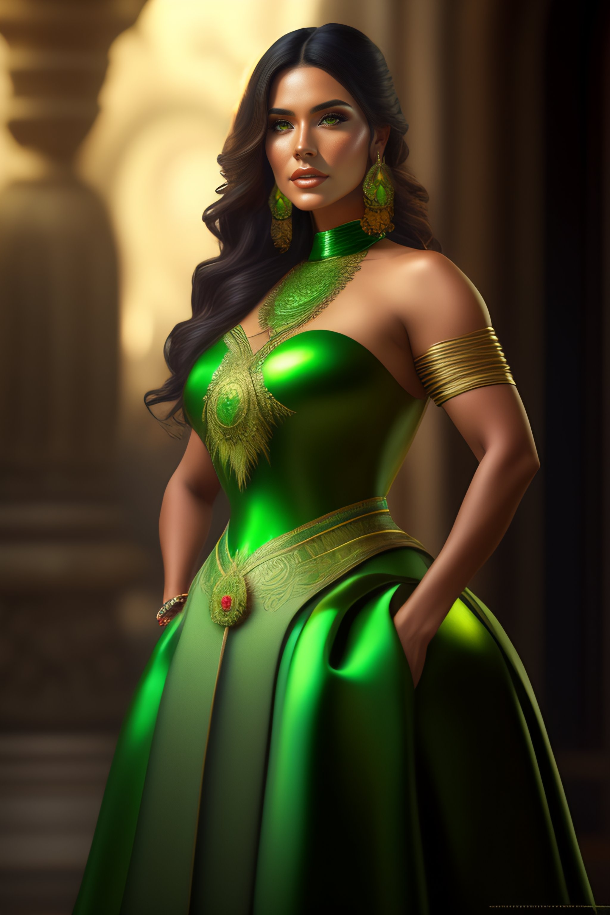 Full body painting of a latina mexican woman, ultra-realistic, concept art, intricate details, realistic looking skin, fully clothed flowing green dress, highly detailed, photorealistic, octane render, 8 k, unreal engine. art by artgerm and greg rutkowski and alphonse mucha