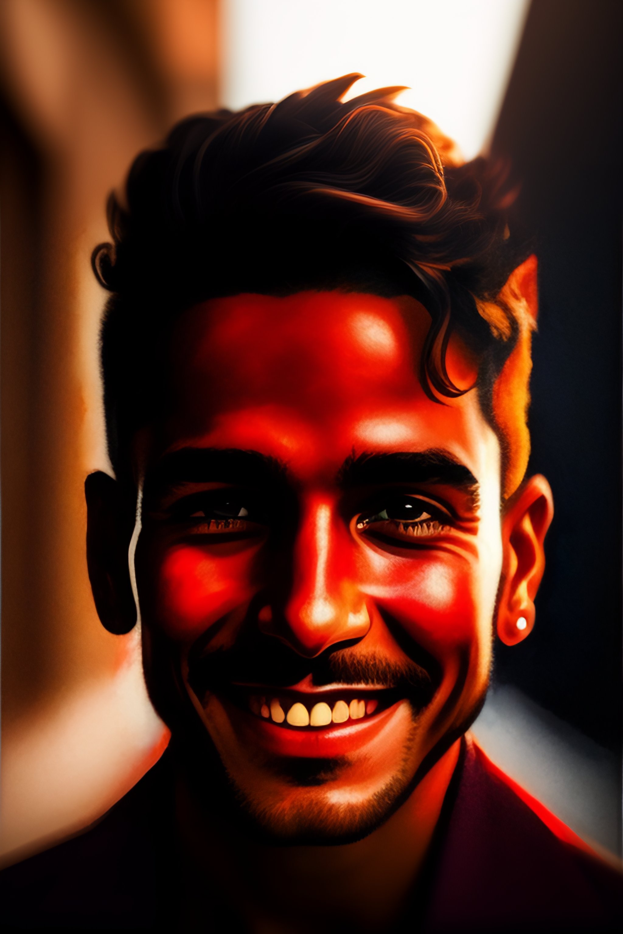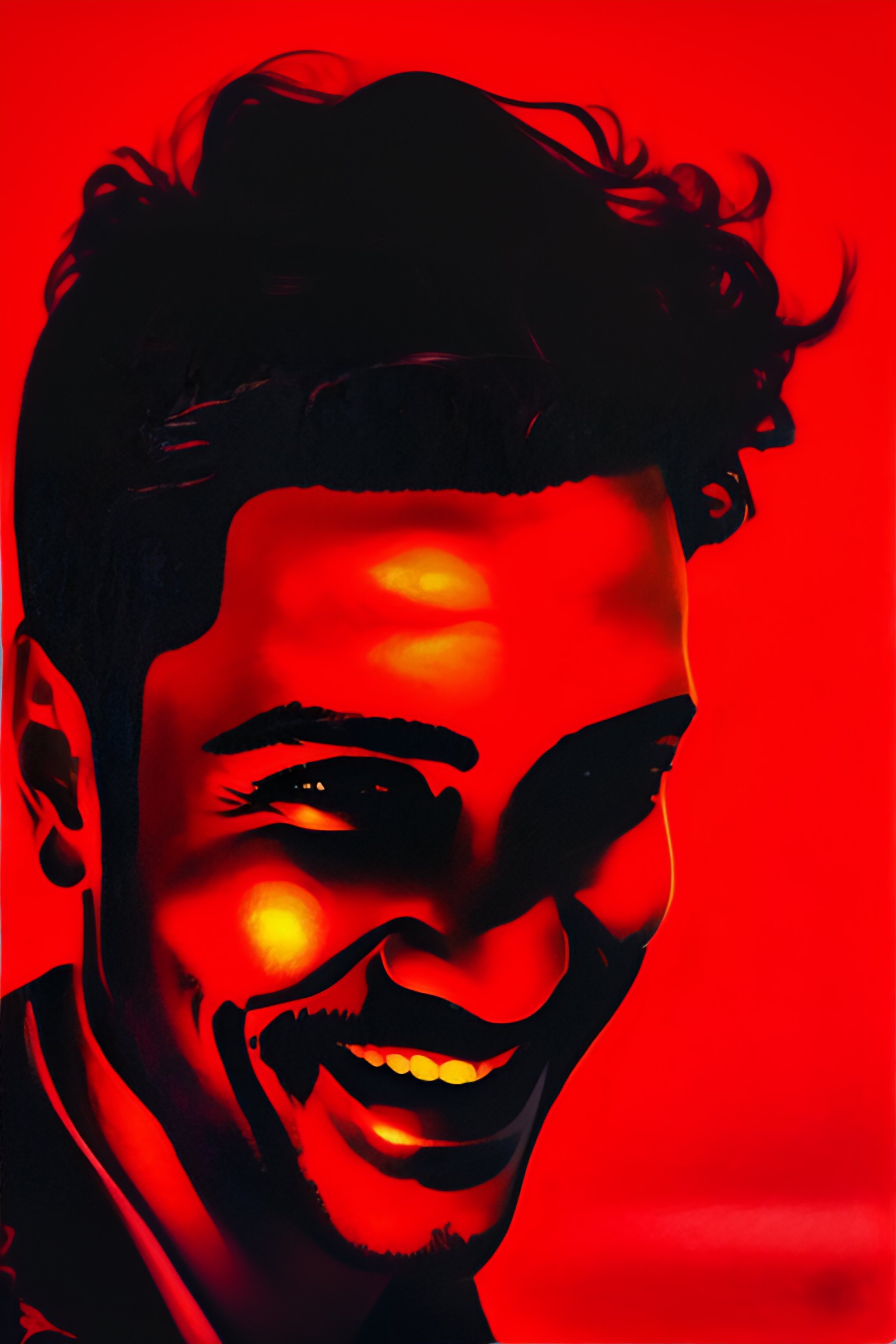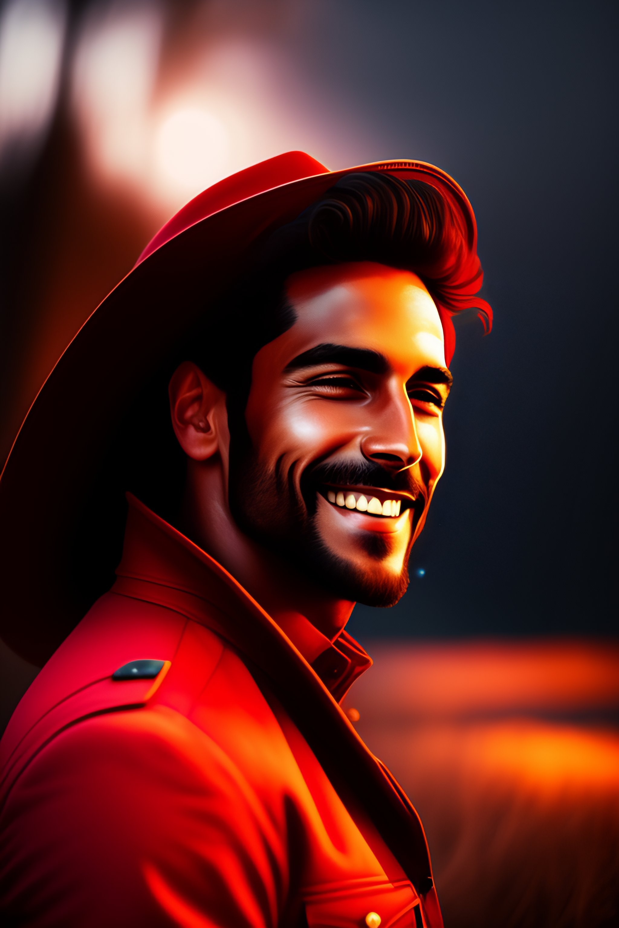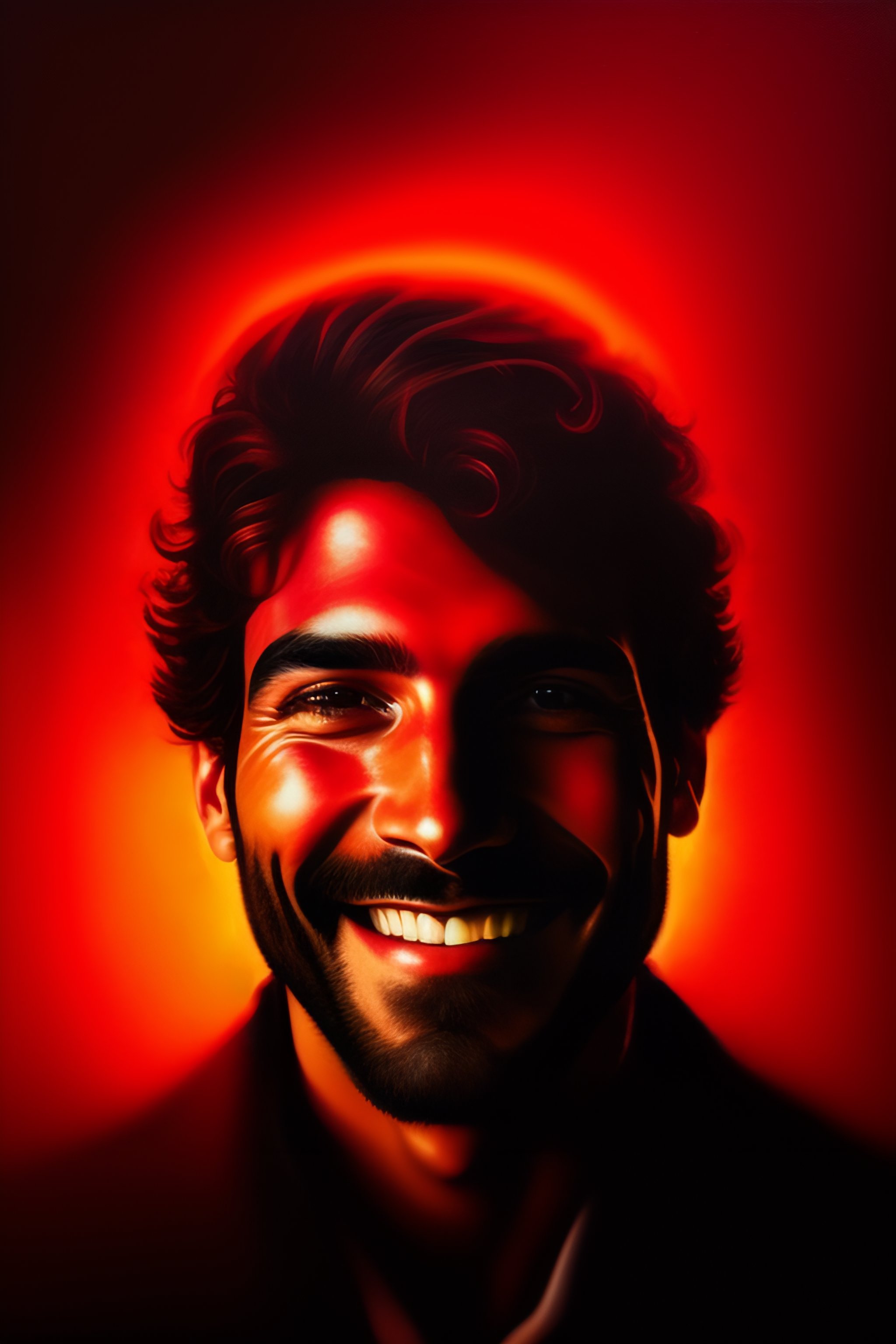 Hombre mirando de frente, ojos inyectados en sangre, sonrisa siniestra, luz contrapicada roja, ropa negra, fondo oscuro, pesadilla terror