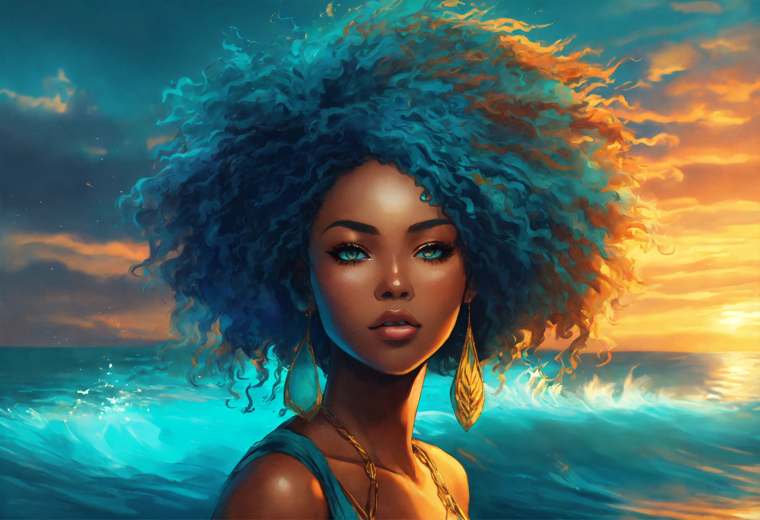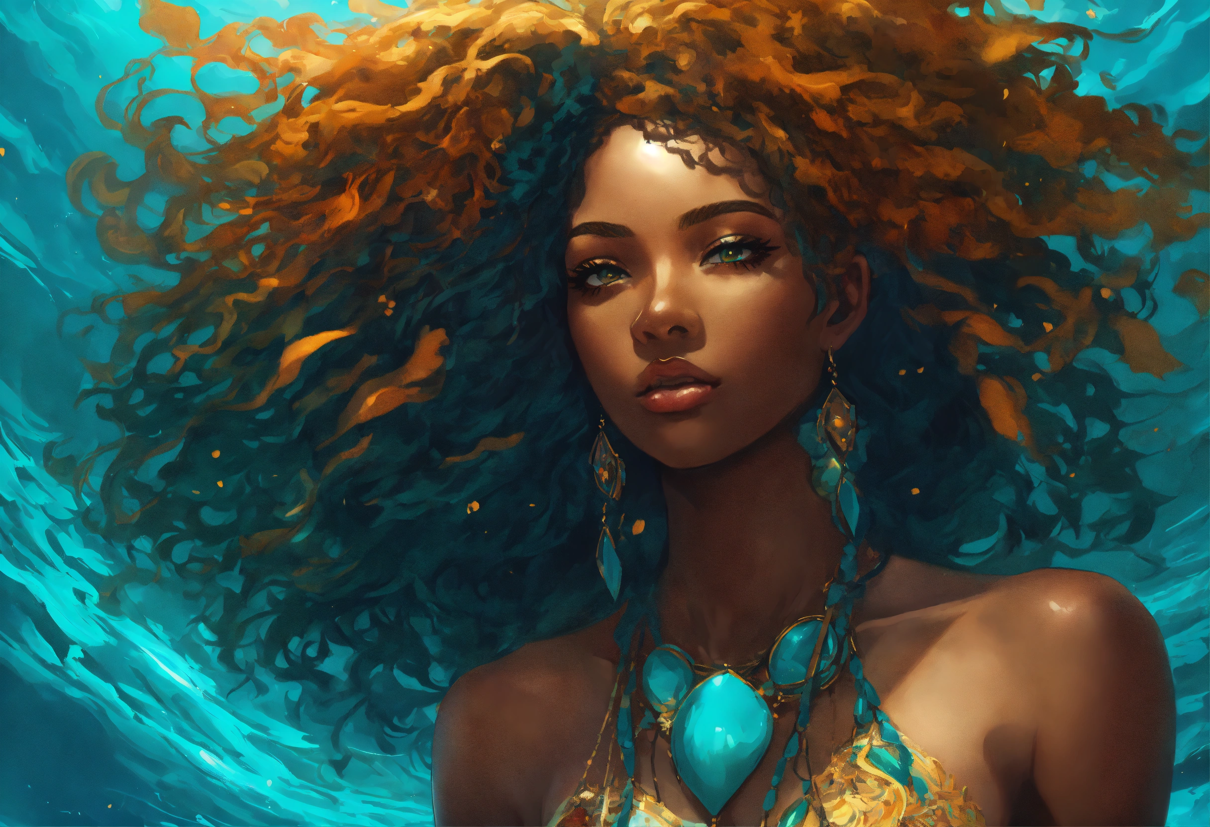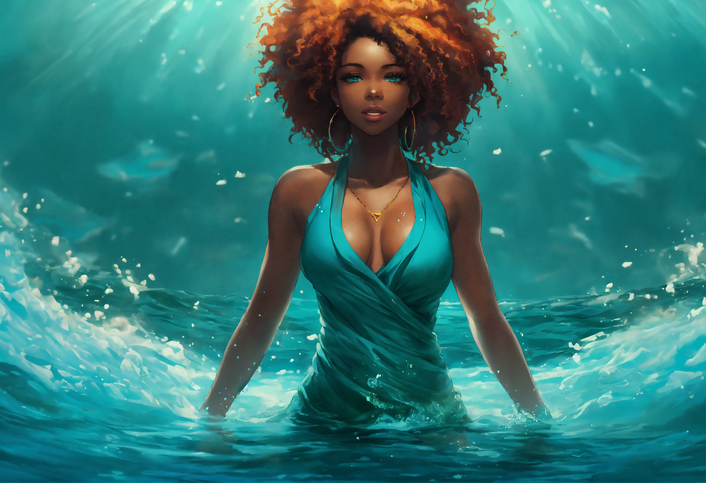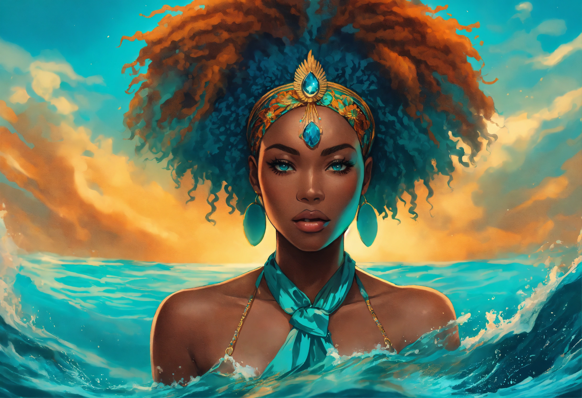 “i will rise as a phoenix before i drown “ afrocentric woman, woman’s hair gradually transitions from hair textirefull body, deep turquoise/ blue water, manga