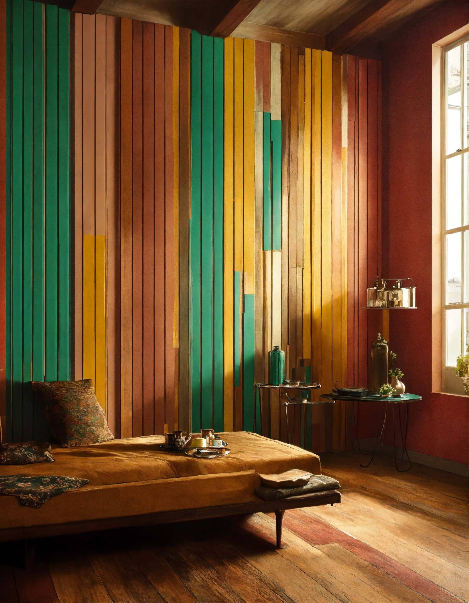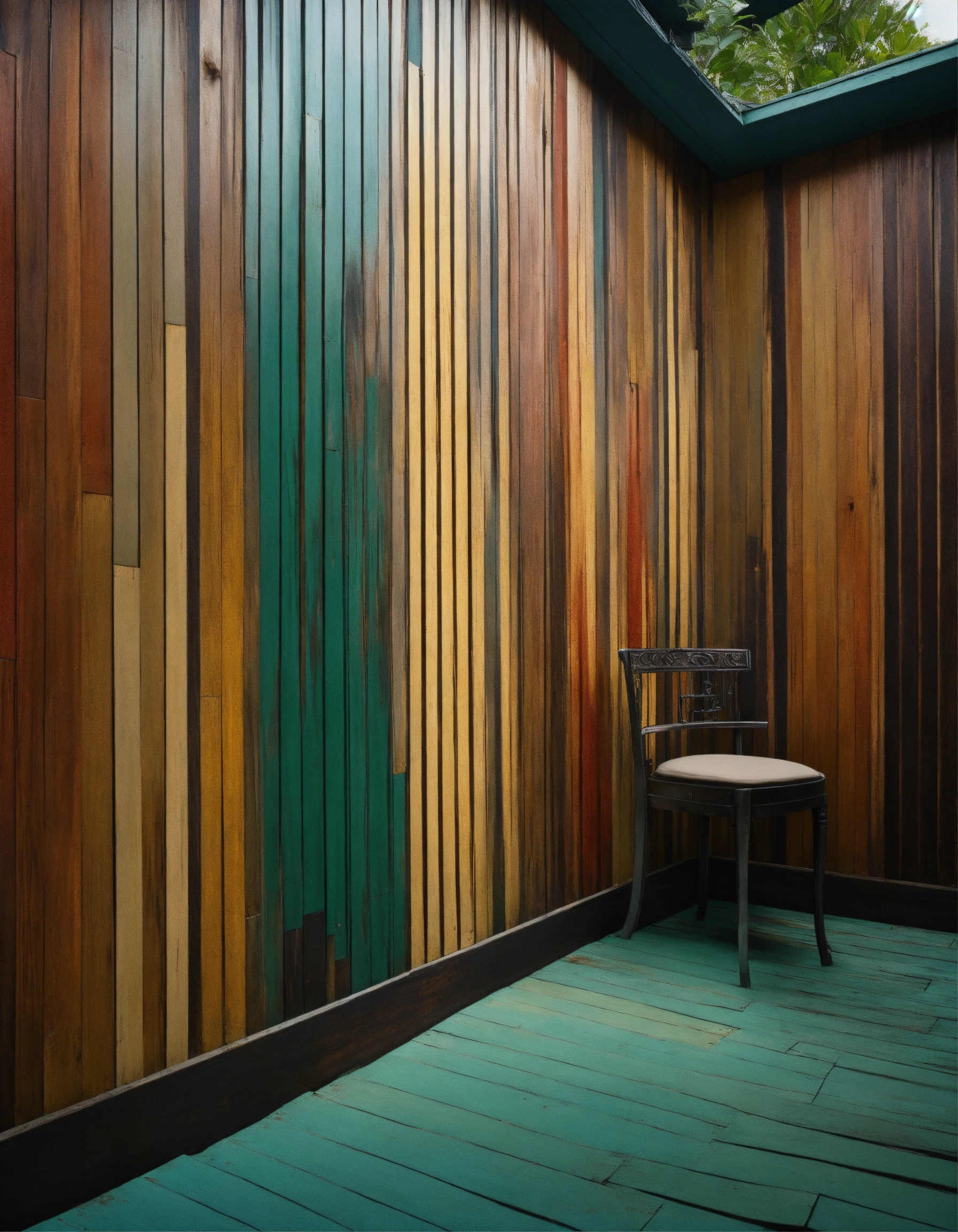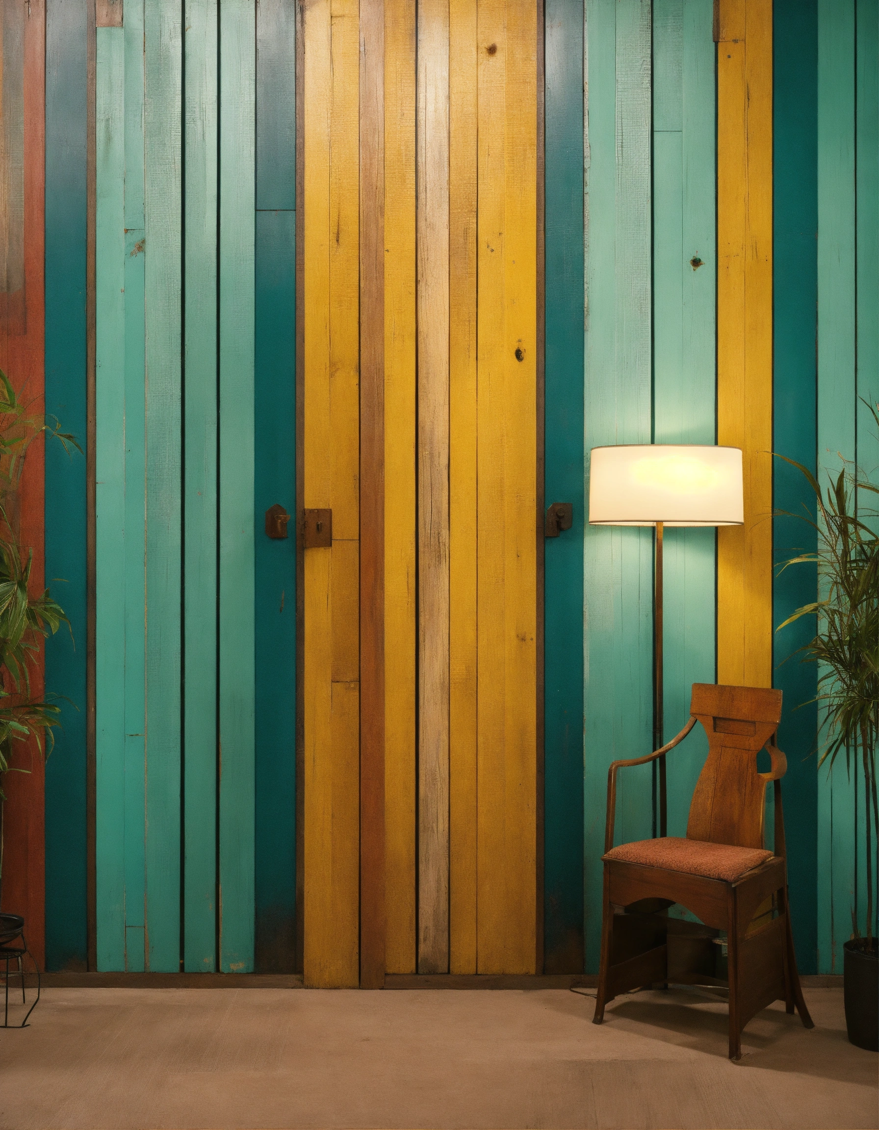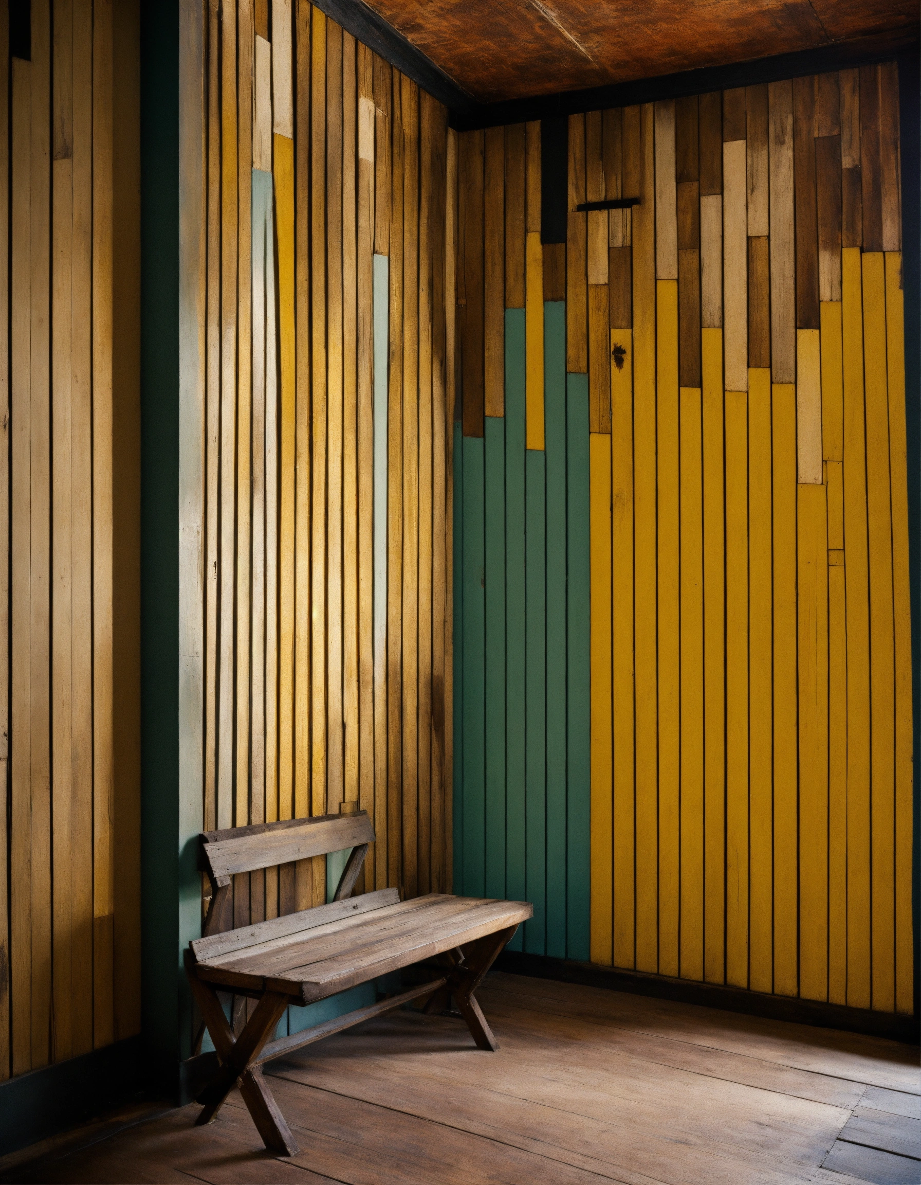 Art deco, room inside a building surrounded by old fence board, fence board is painted with 2 colors only, the fence board is painted art deco style, simple