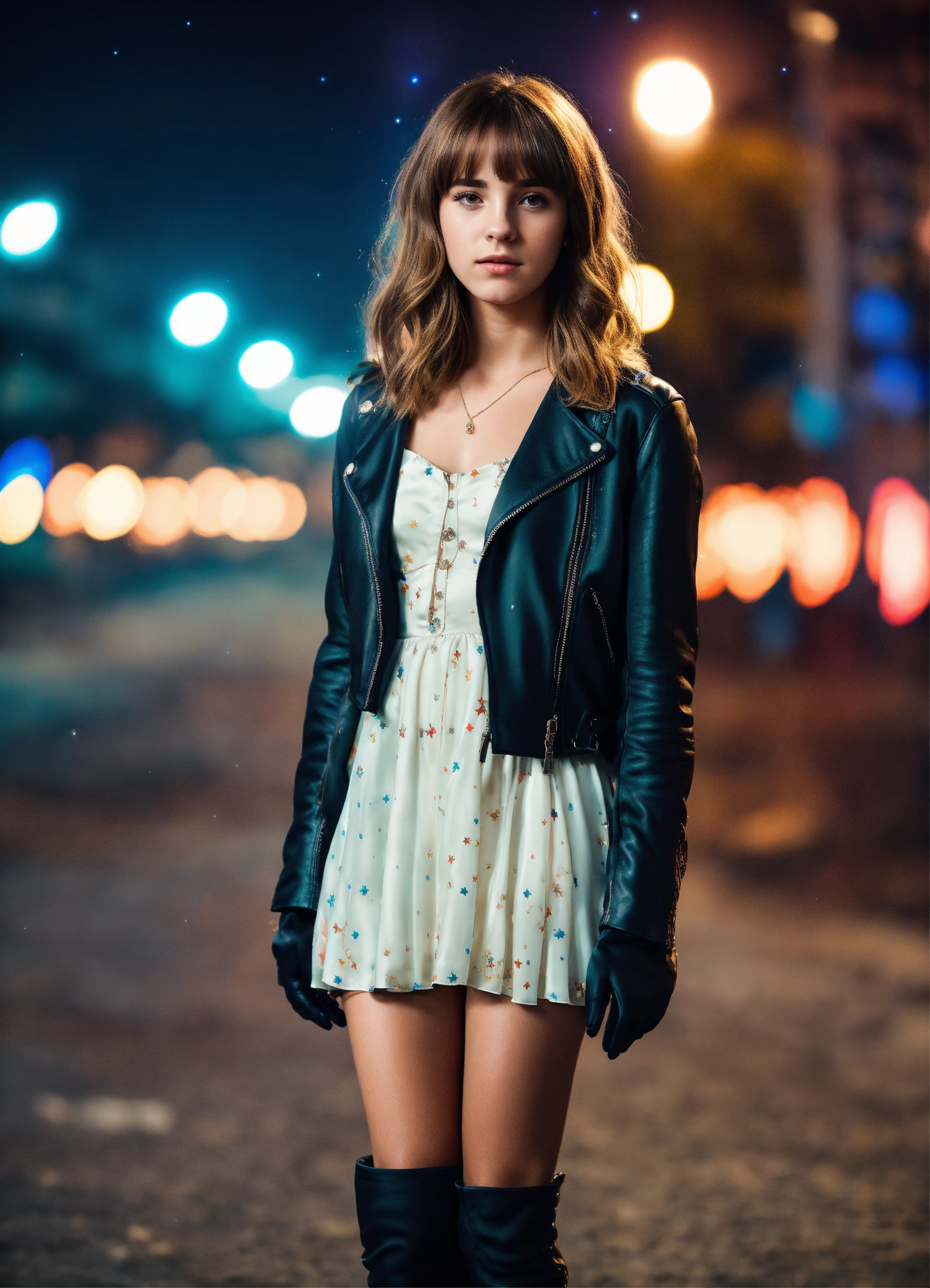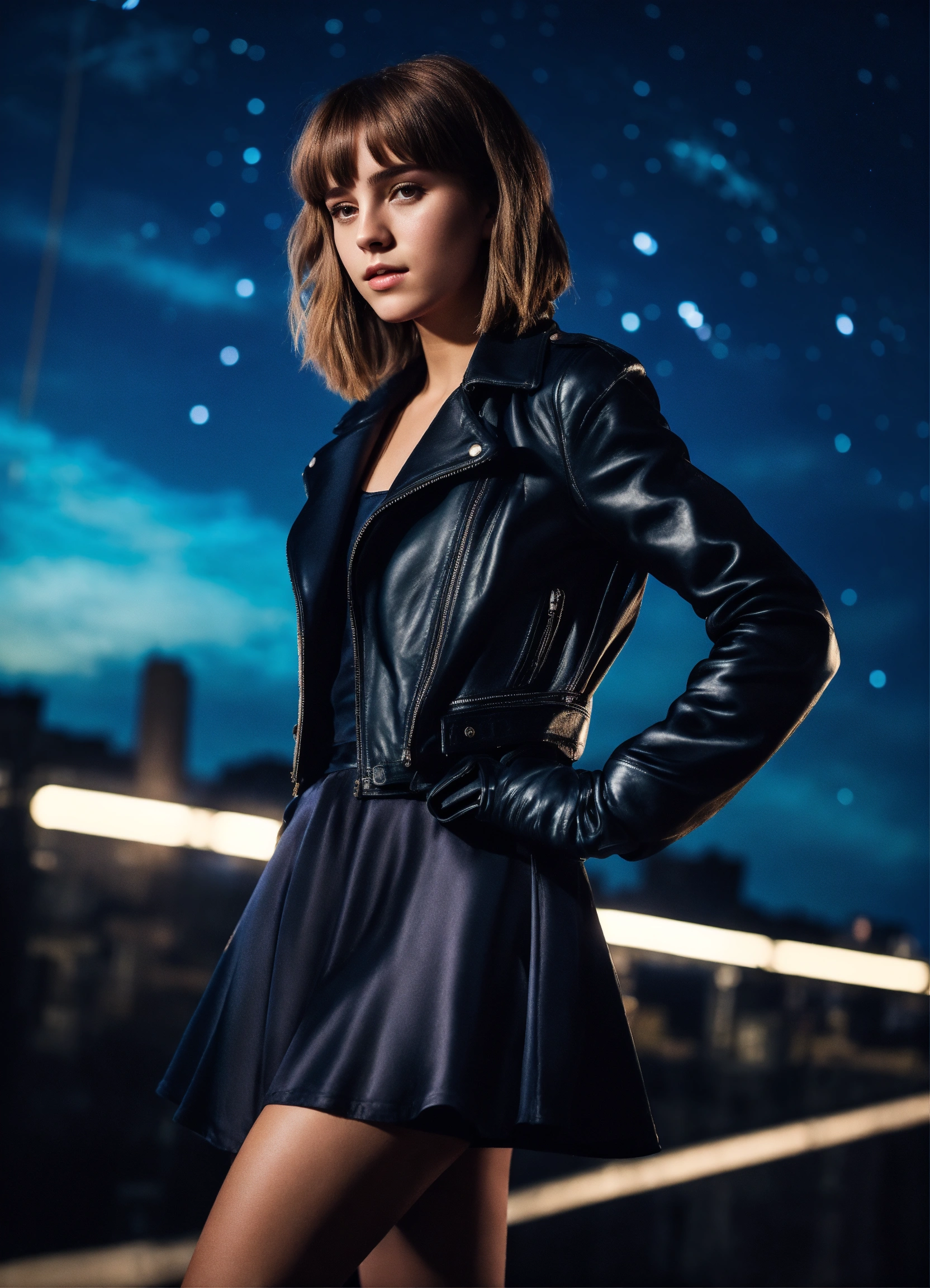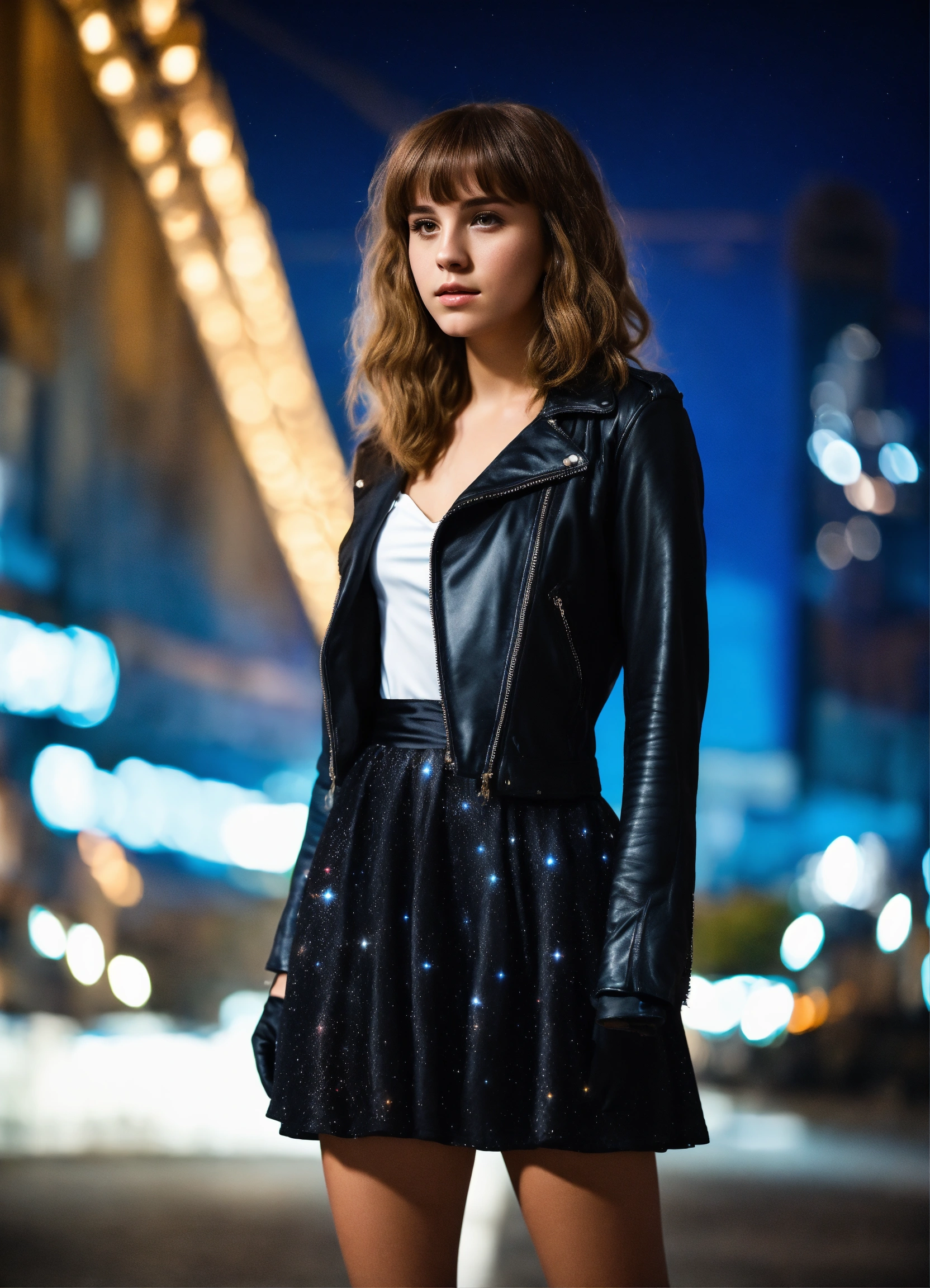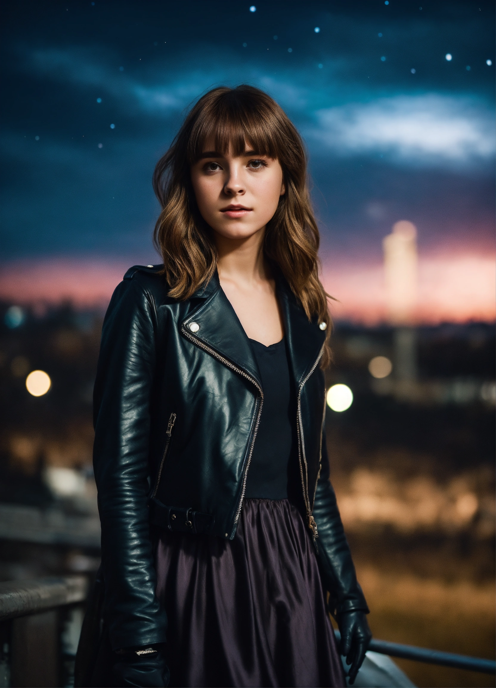 A real photo of a 25 year old girl with a "bangs hairstyle", wearing a short satin dress and black leather jacket and gloves. urban background in the sky we see the galaxy. full body, looking like a real version of hermione granger