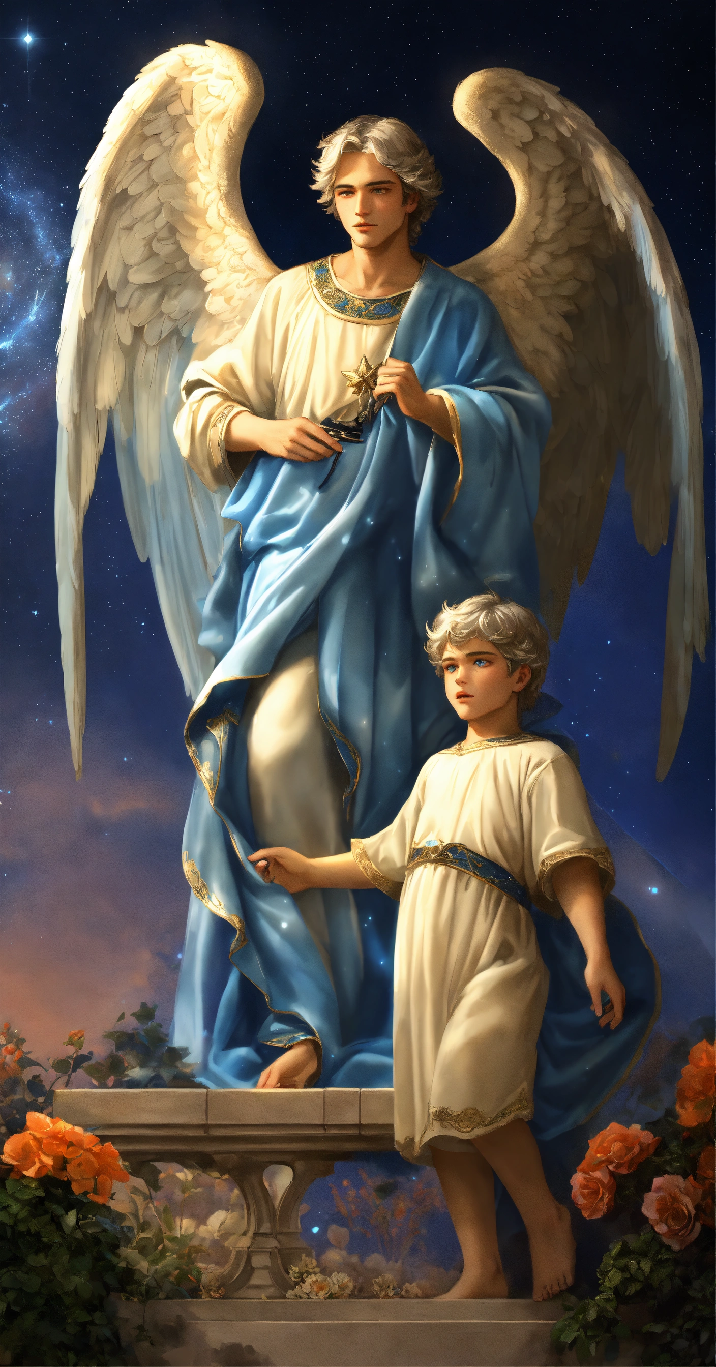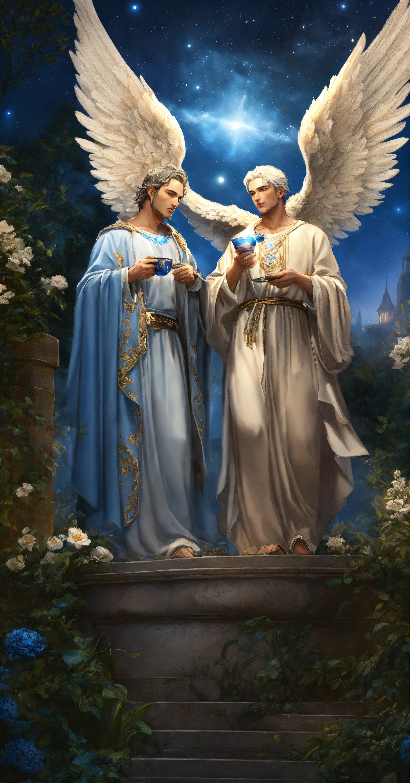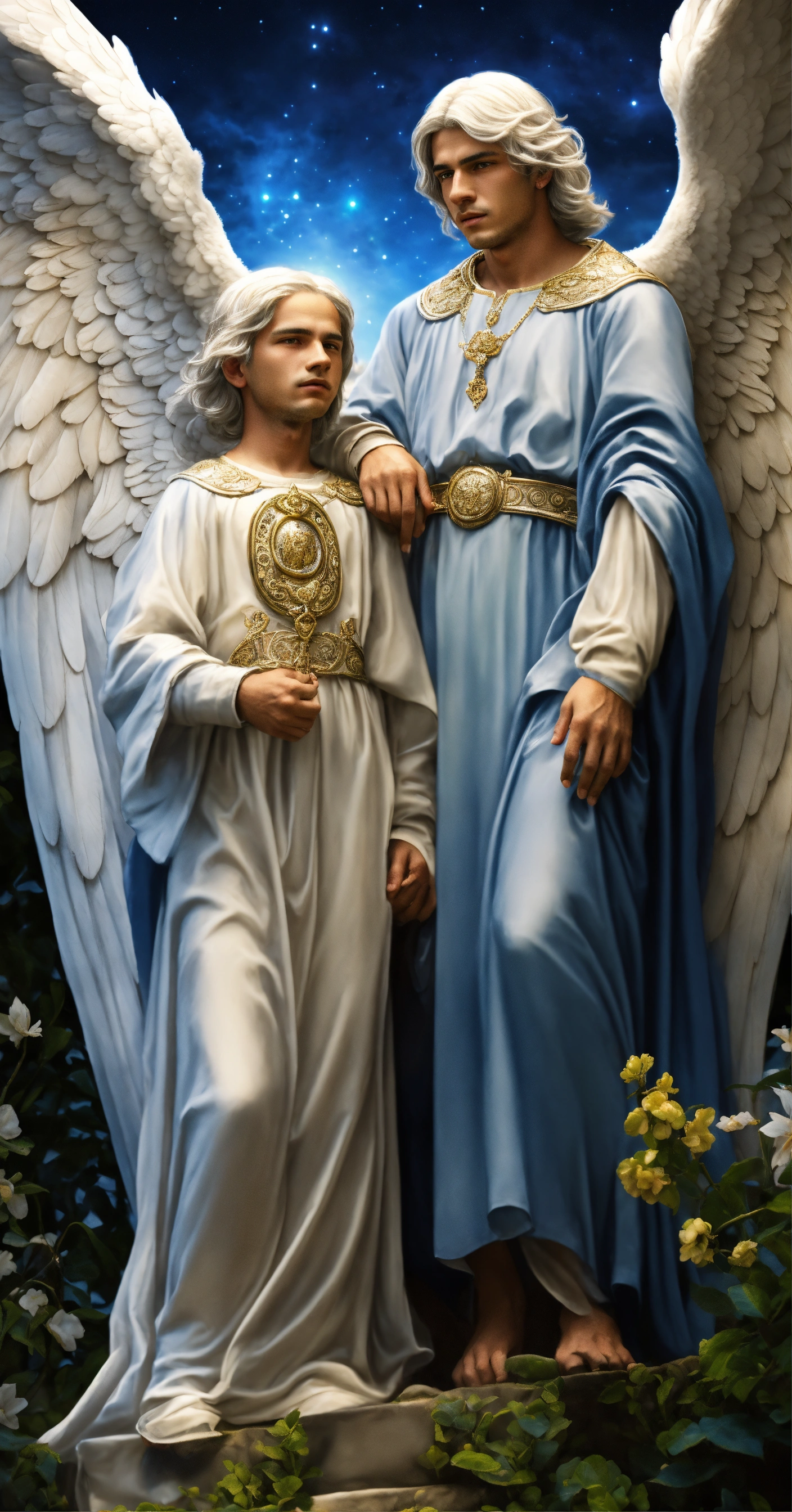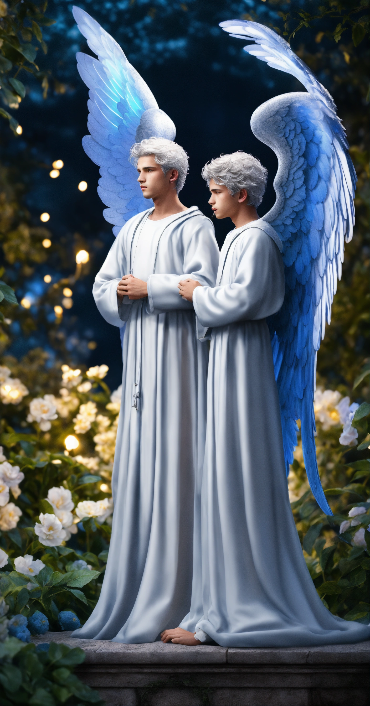 2 male guardian angels with detailed and luminous blue angel wings. 1 30-year-old male angel protecting a 9-year-old male angel child. the 2 male angels have large, uniform luminous blue wings. their faces beautiful and detailed. very clear eyes that open with a deep and penetrating look. detailed and manly short white hair. blue tunic-type dresses with many silver details. they are in a beautiful, detailed garden with a night sky. hyper-detailed, hyper-realistic illustration. realism. masterpiece. digital art, hd, high quality. high definition, high definition. 8k.