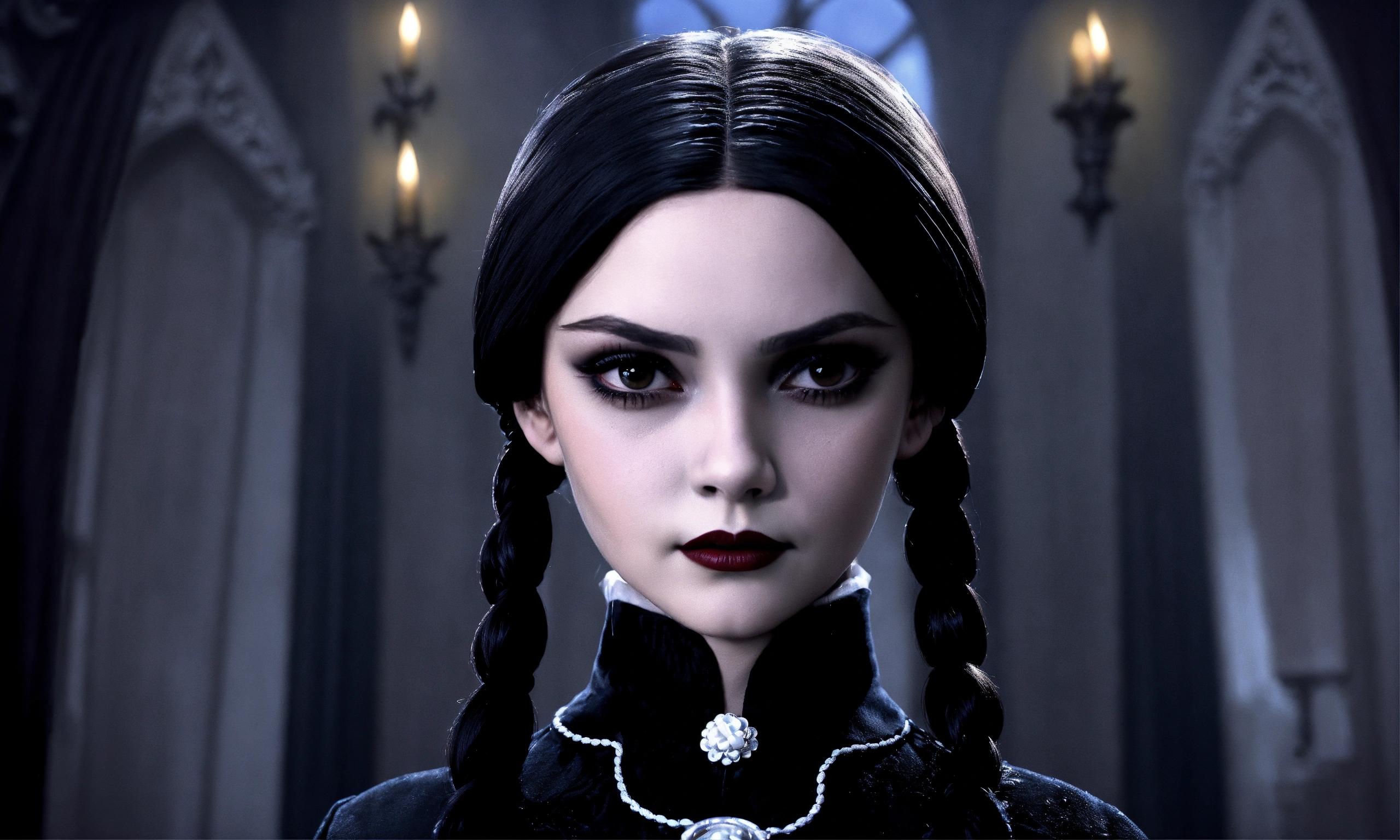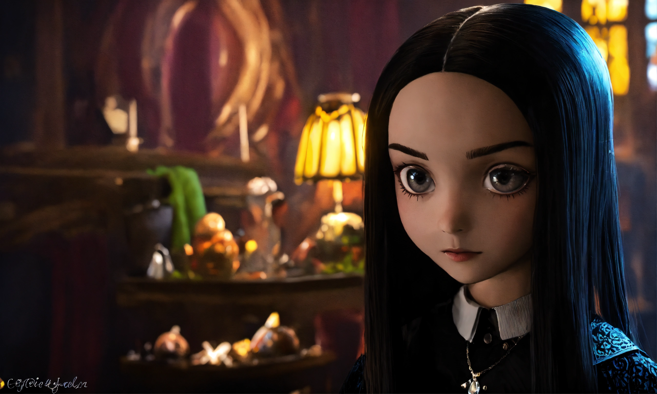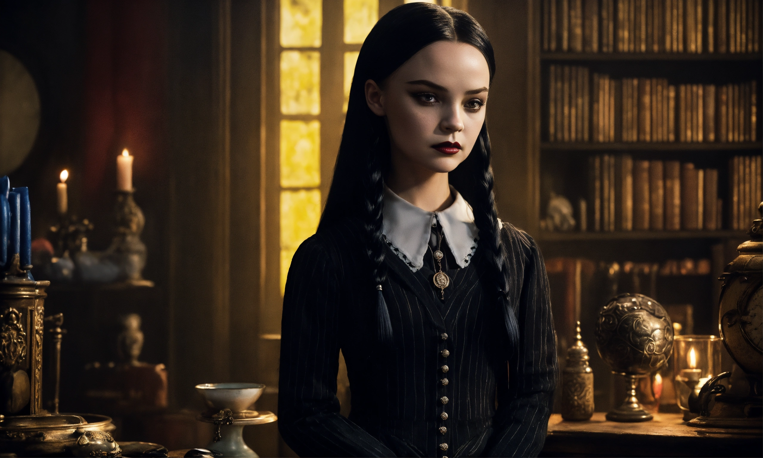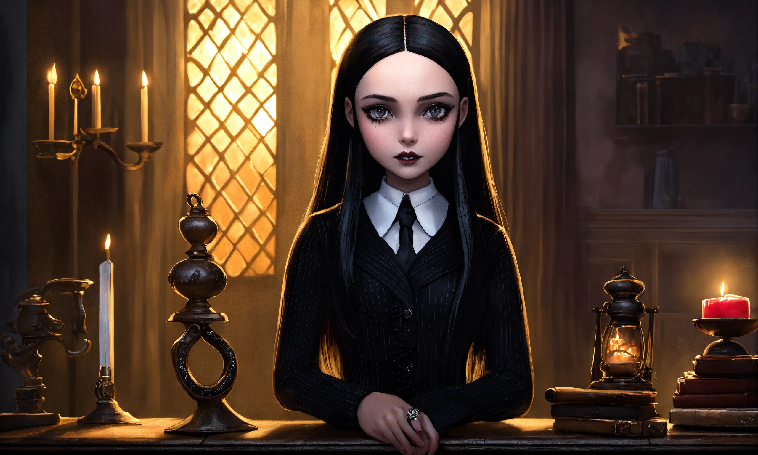 Draw wednesday addams, the daughter of gomez and morticia, with their characteristic facial features and attire. position her in a pose that reflects her characteristic eccentricity and enigmatic nature. create a background that corresponds to the dark and mysterious atmosphere of the addams family. include distinctive elements such as antique objects, dark colors, and ominous shadows. incorporate details that emphasize her unique personality, such as her favorite toys or items she typically uses. ensure that her cold and ominous character is reflected in her facial expression and posture. make sure the color, need like real photo, like real life