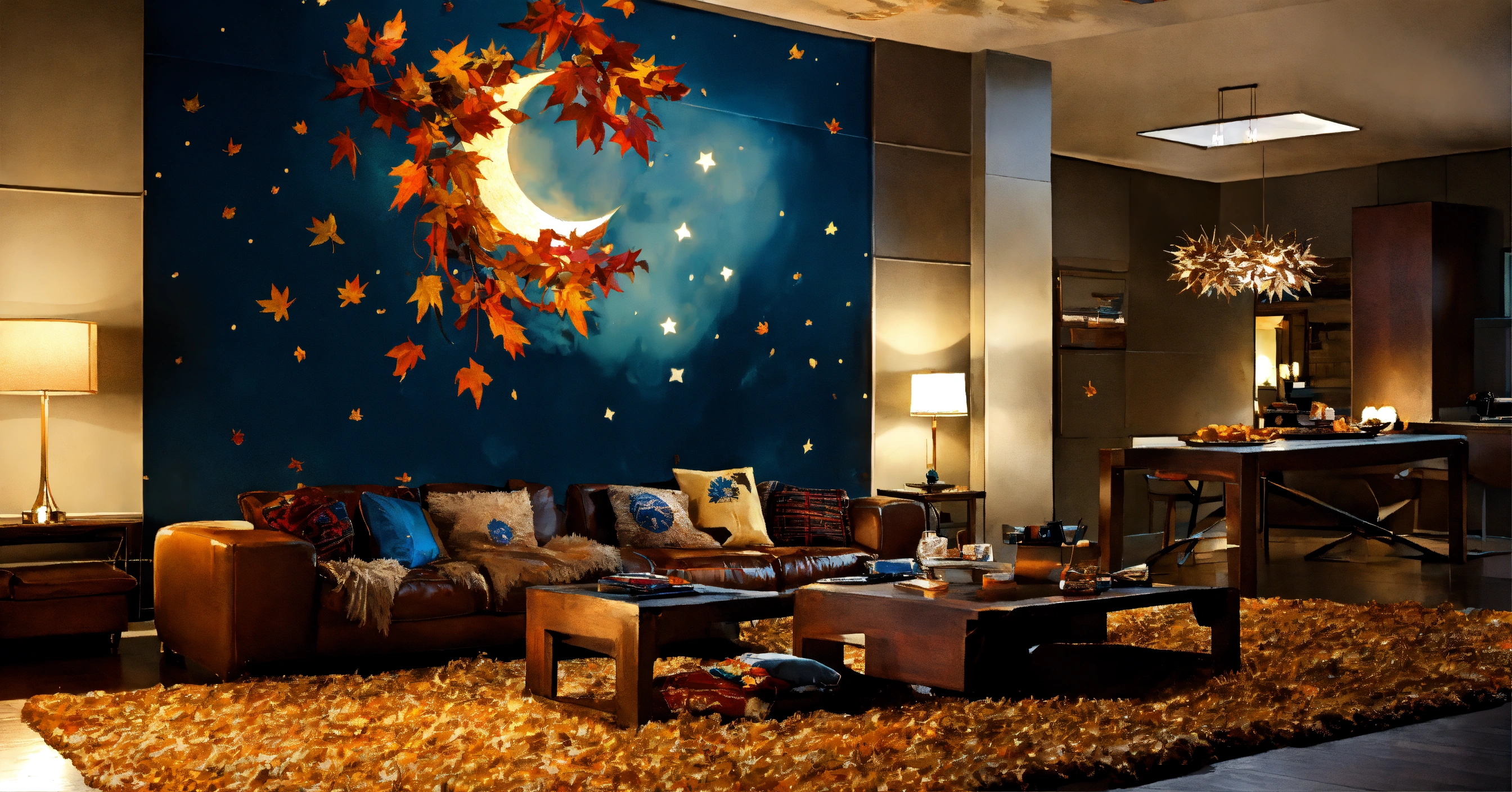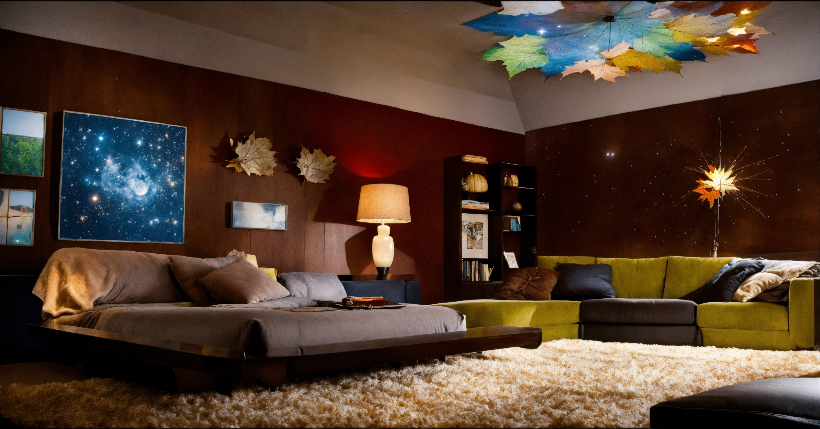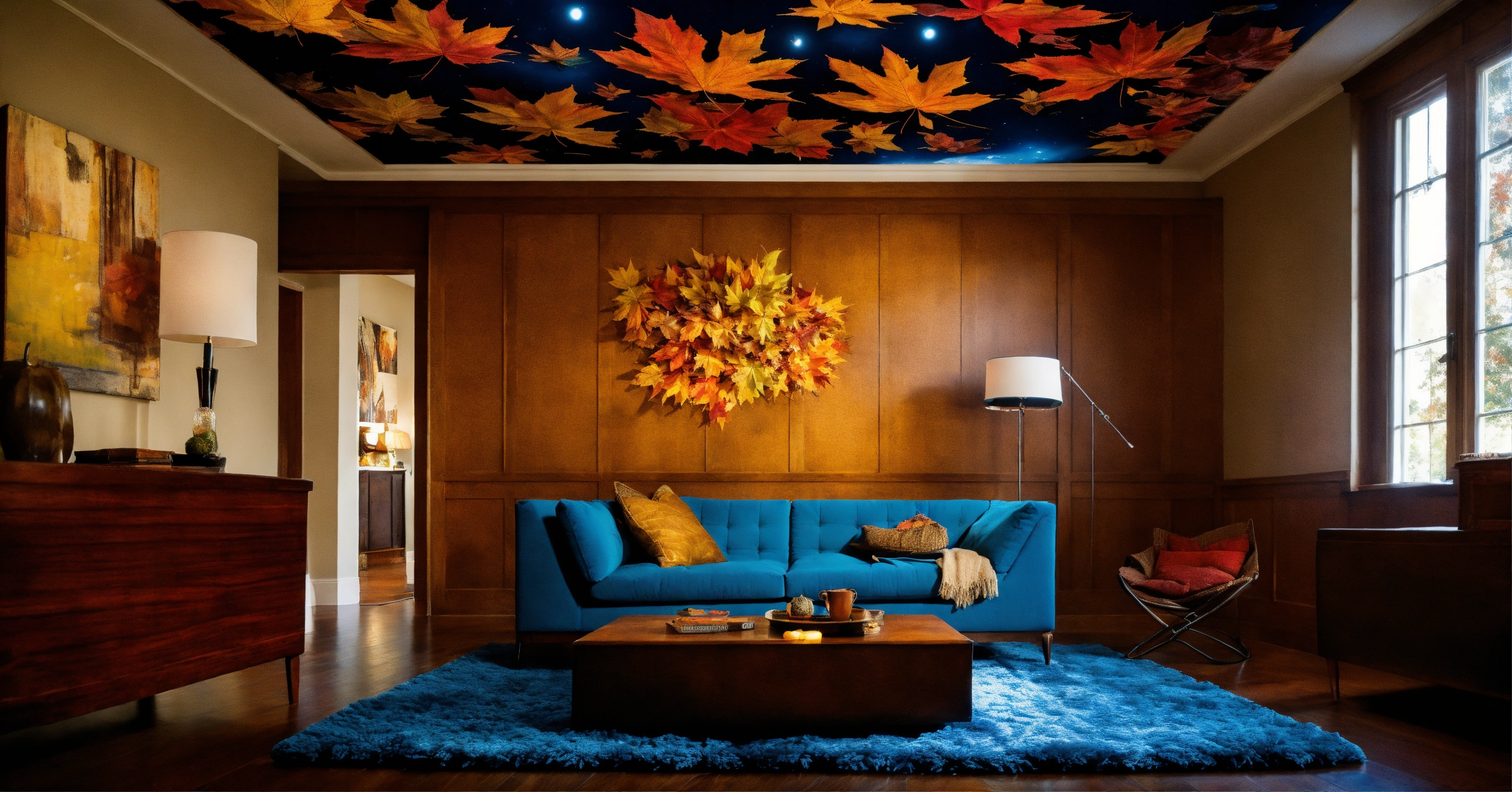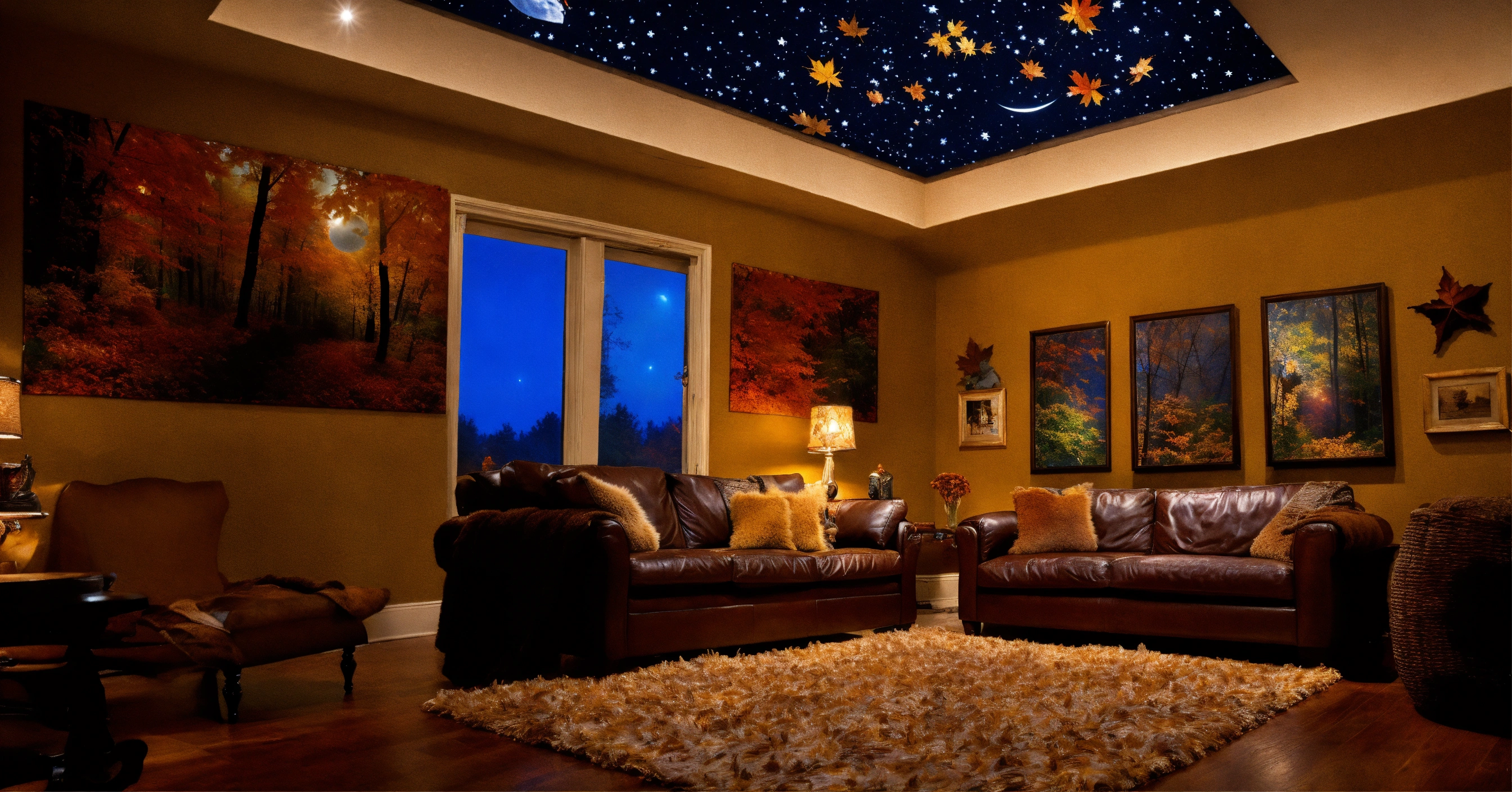 Fall leaf sitting room, fuzzy leaf rug, big couch, grafitti fall pics, night star ceiling, dark wood. stars moon, dark blues