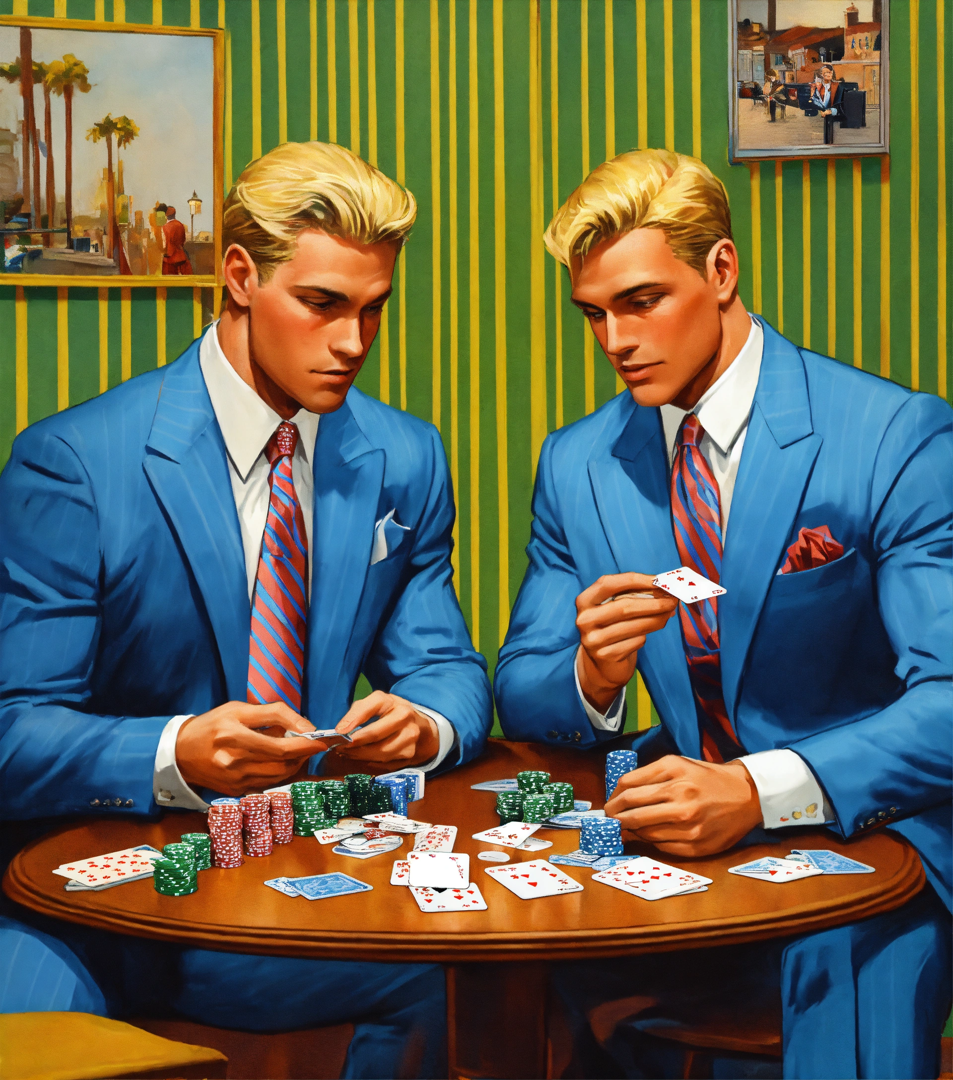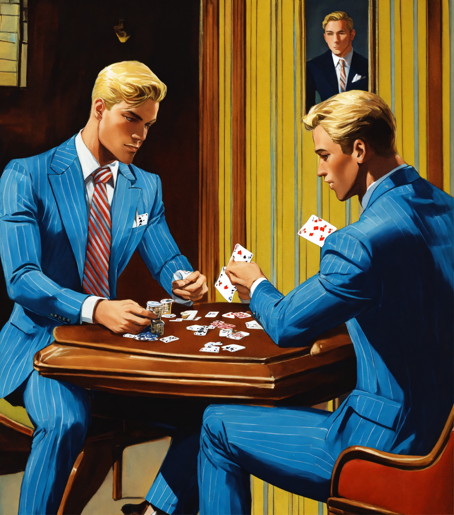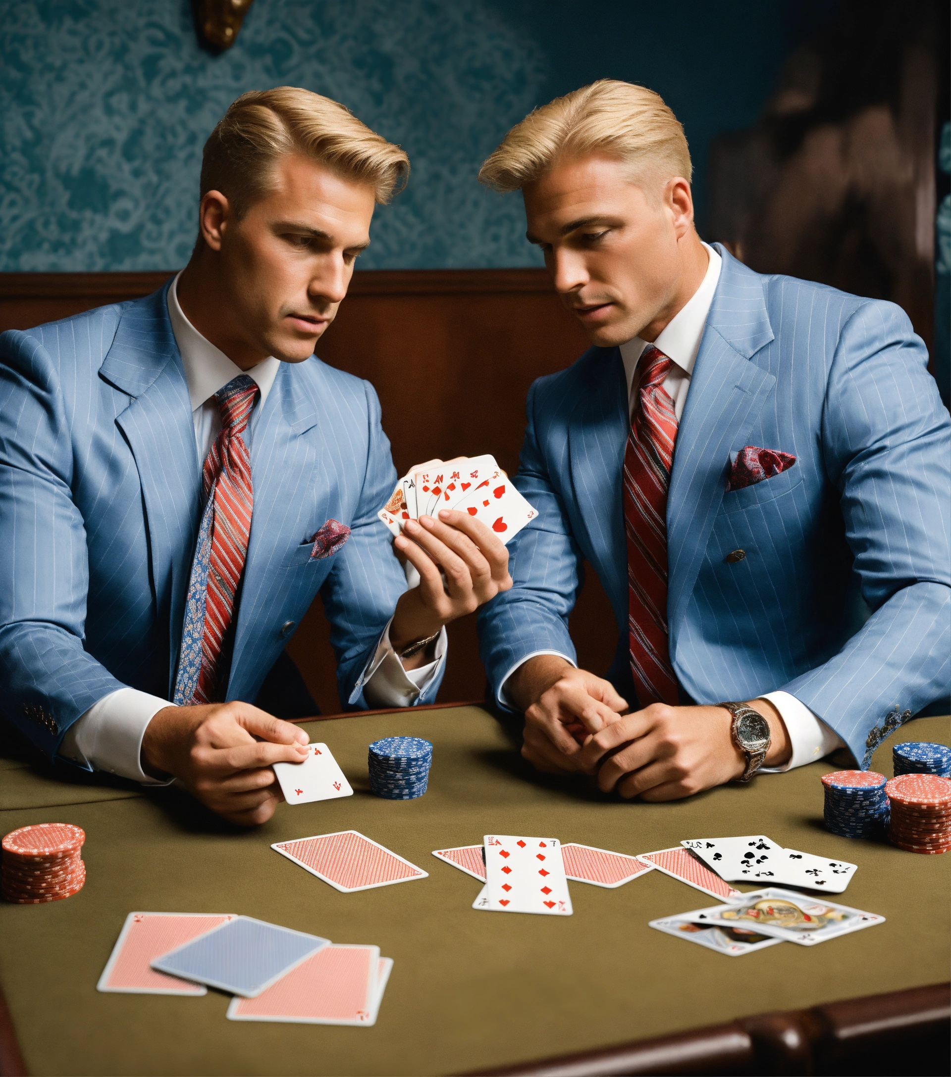 Two naive blonde muscular businessmen in pale blue pinstripe suit and club tie playing cards while a third one is cheating