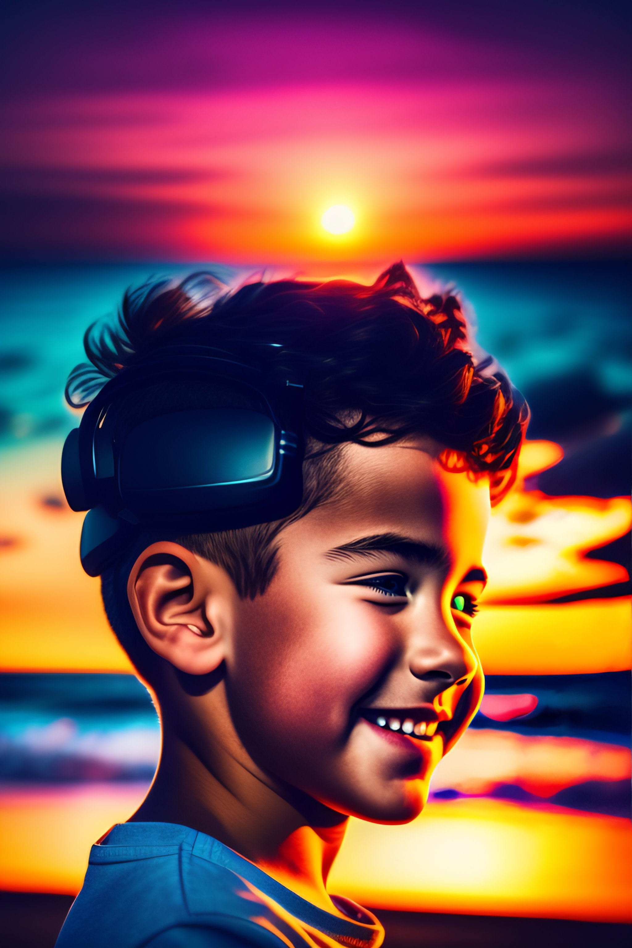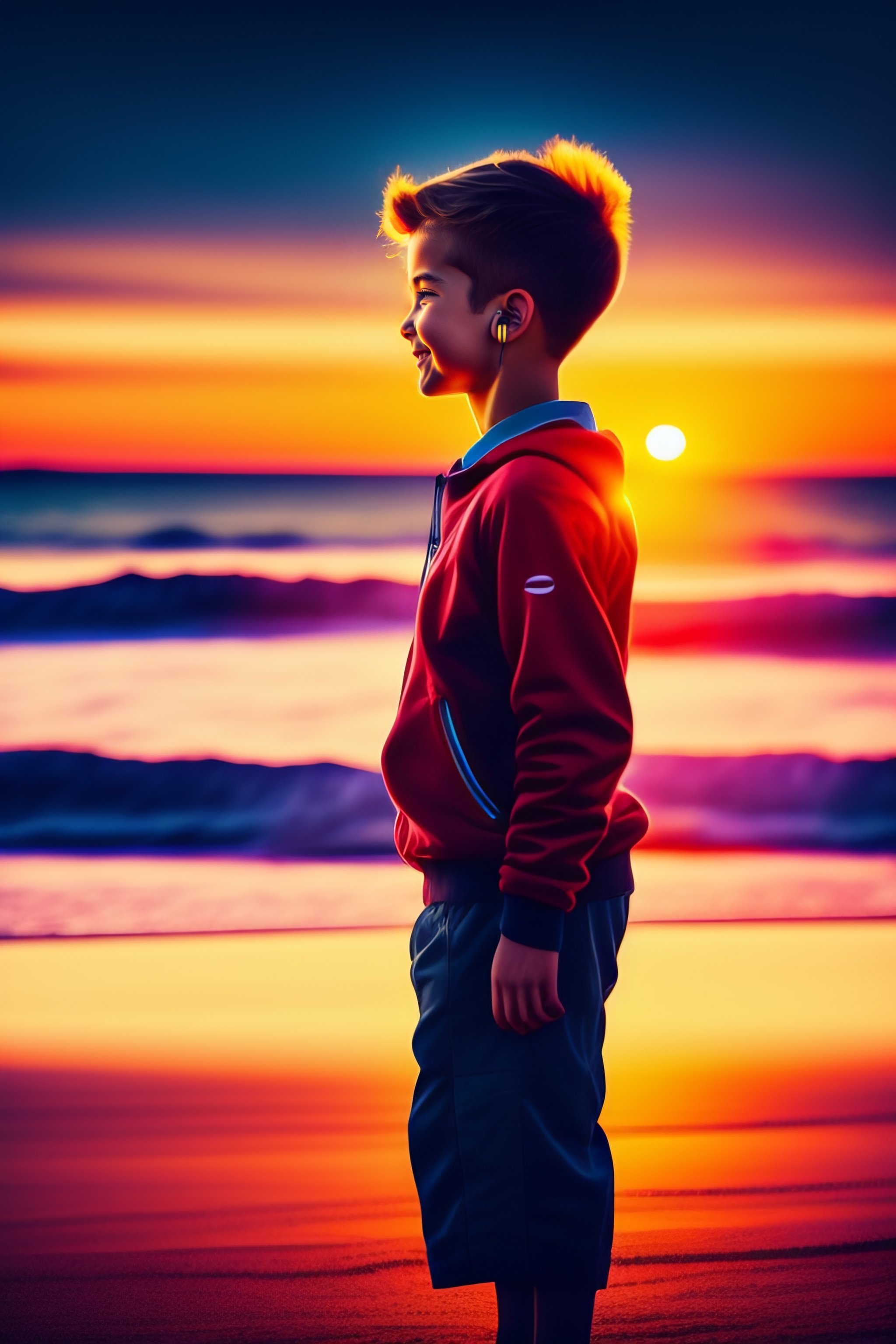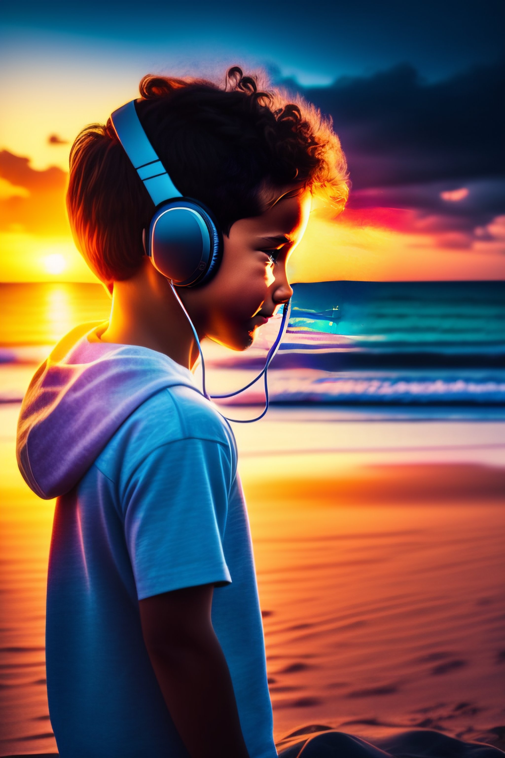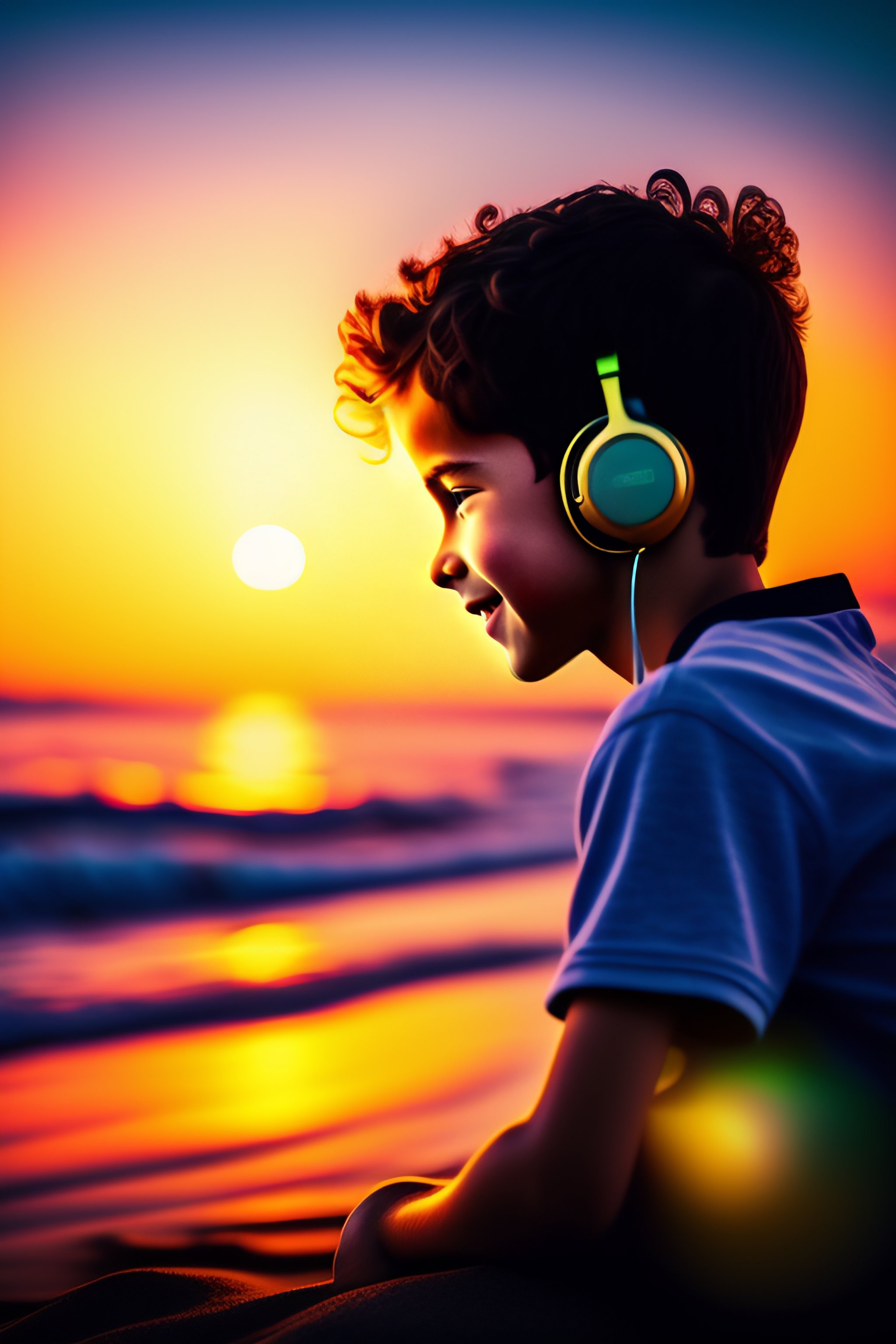Silhuette of a single boy enjoying music through headset and watching sunset in a beach, vibrant evening sky, beautiful visual, happy vibes, realistic, photography