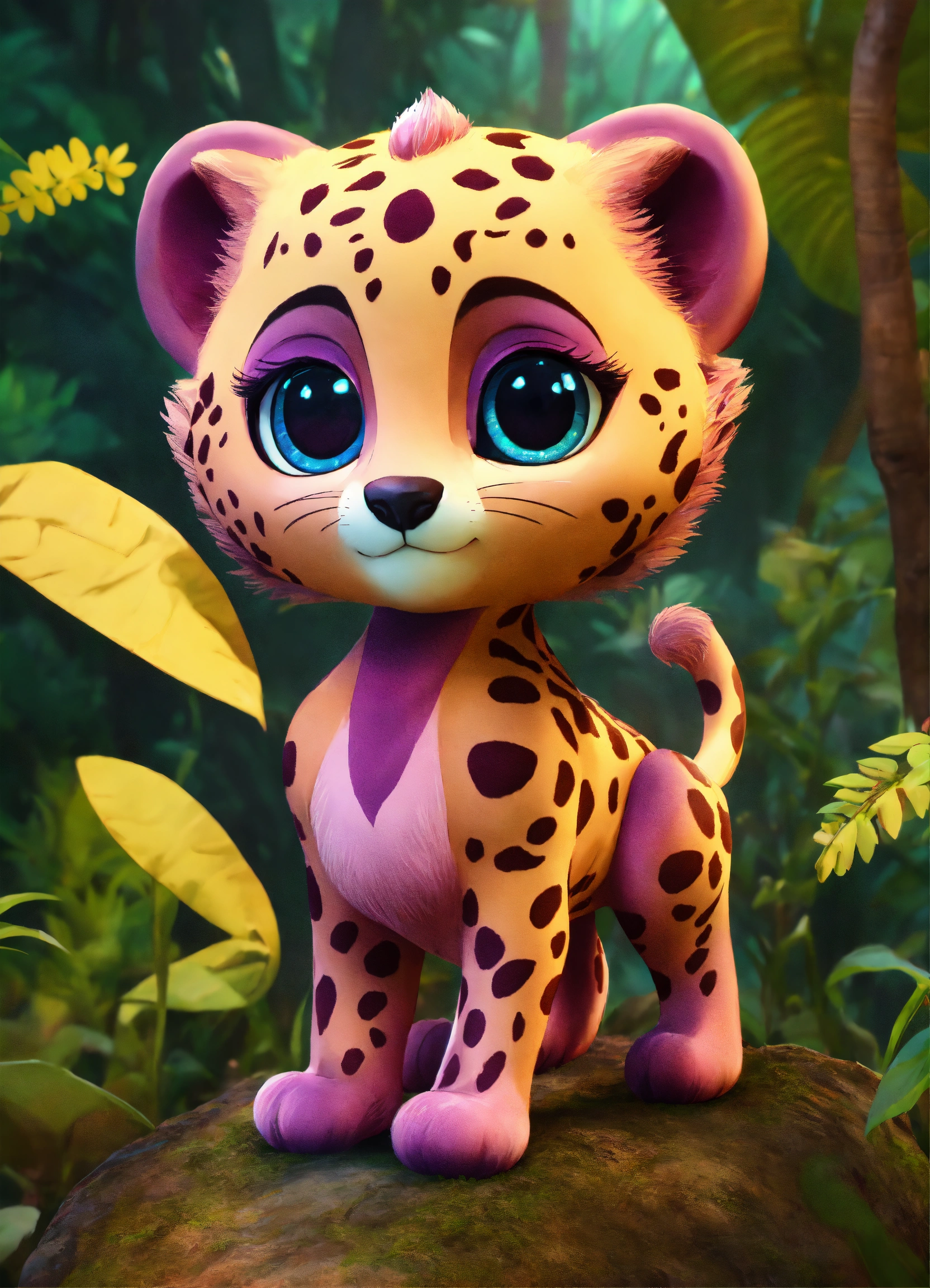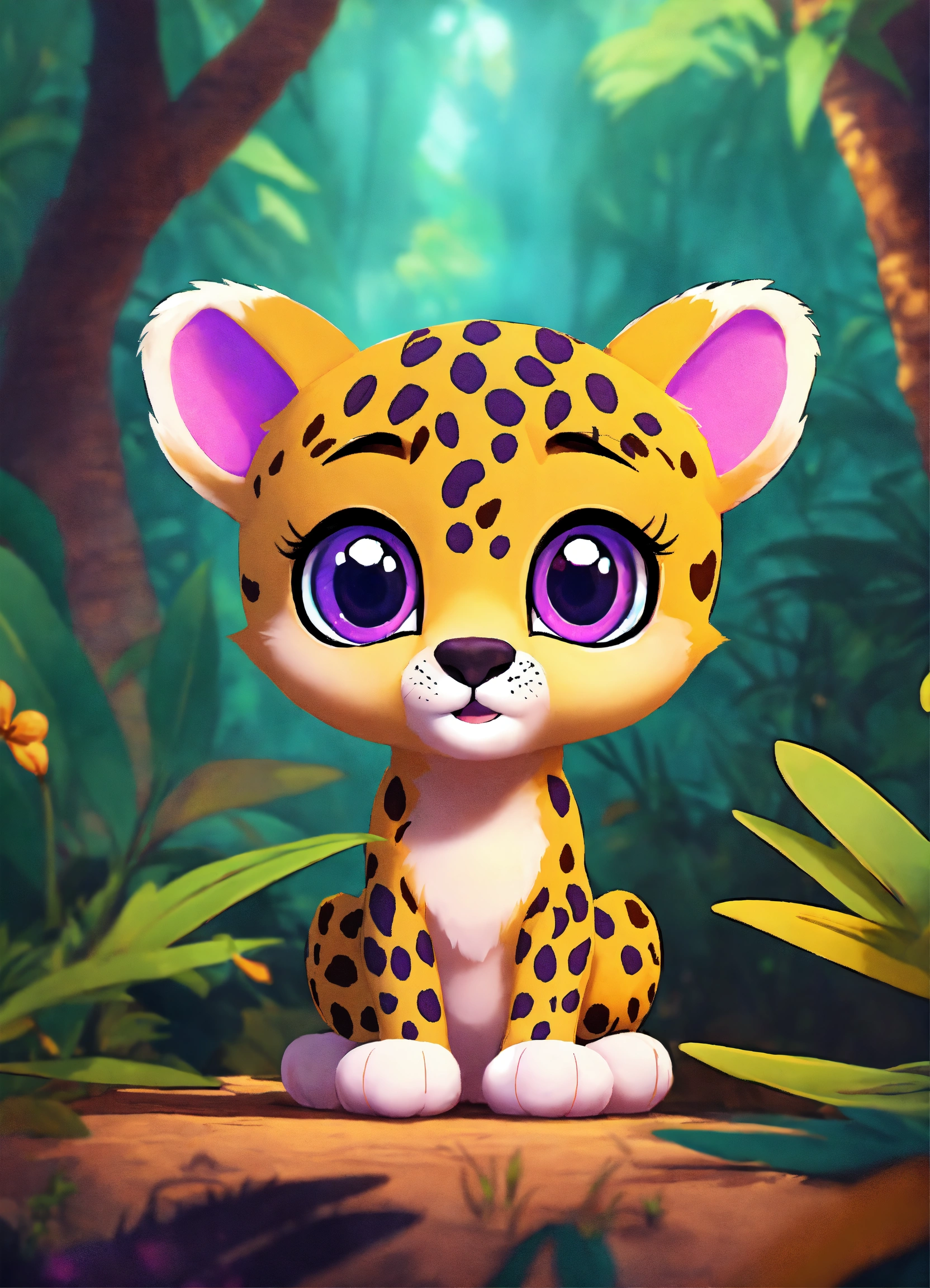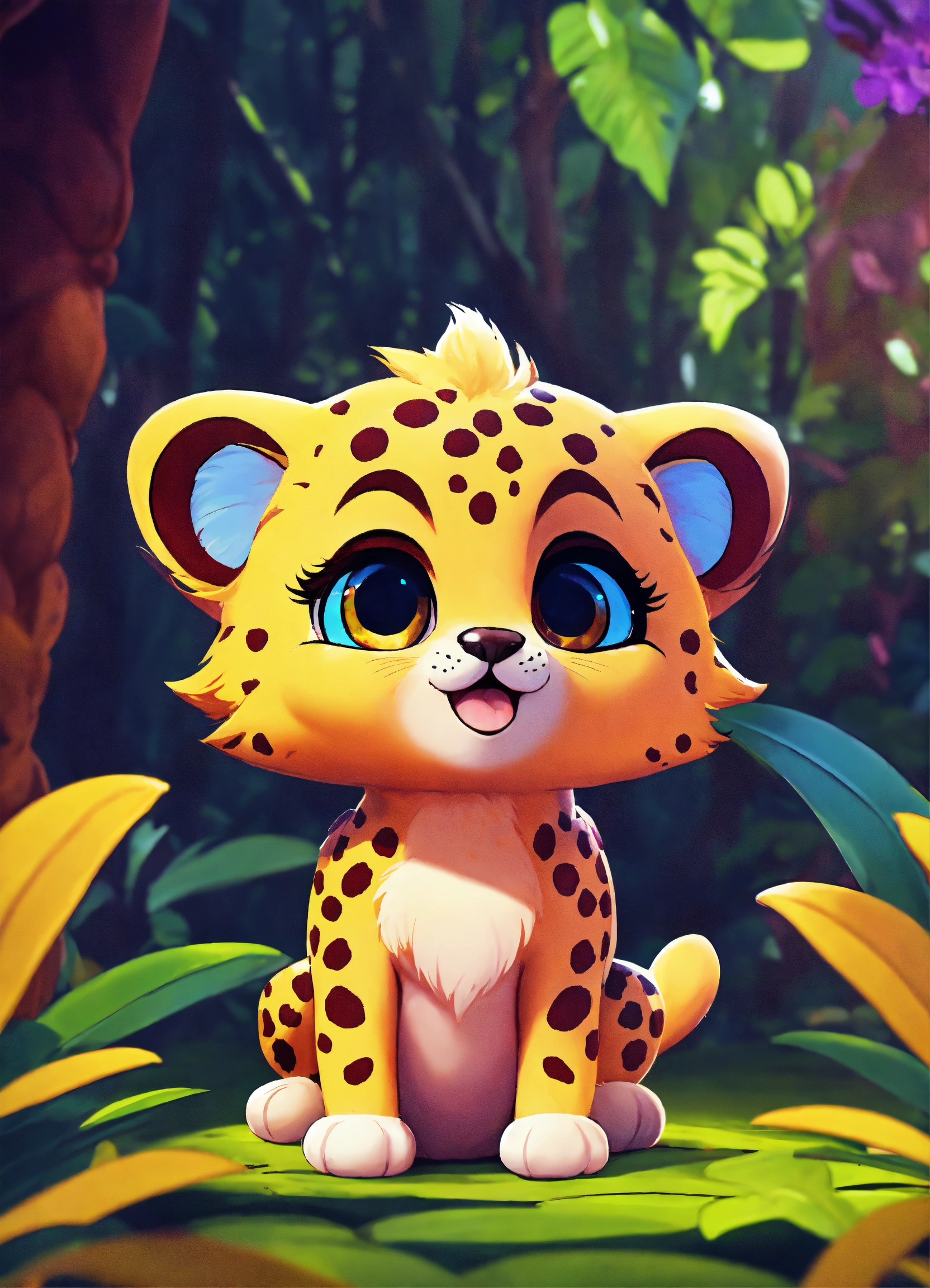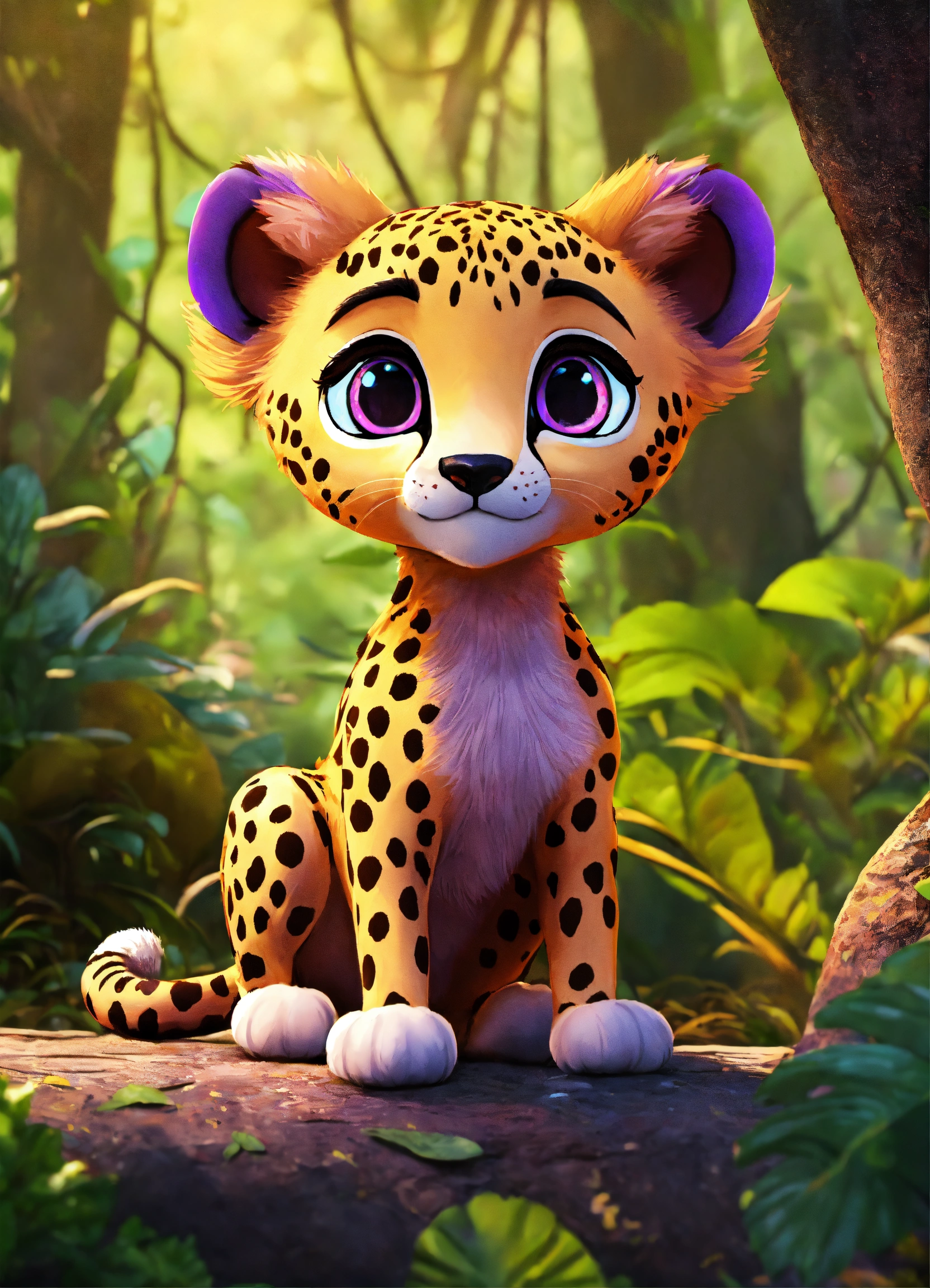 A cute (color saffron and plum) baby cheetah with big eyes in the jungle, animated, cartoon, unreal, 8k.