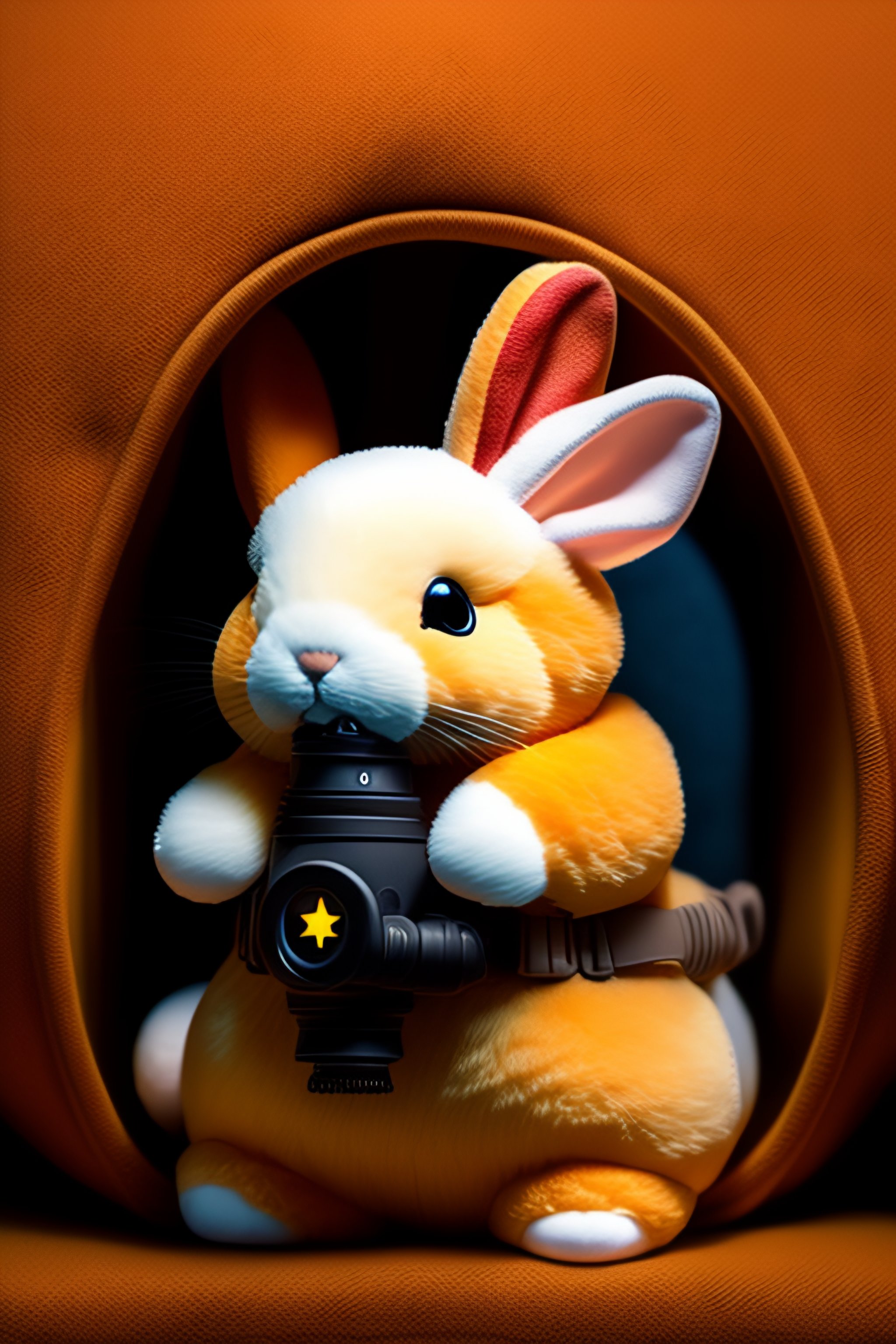Plush rabbit in a gas mask with a machine gun against the background of a nuclear explosionnuclear explosion