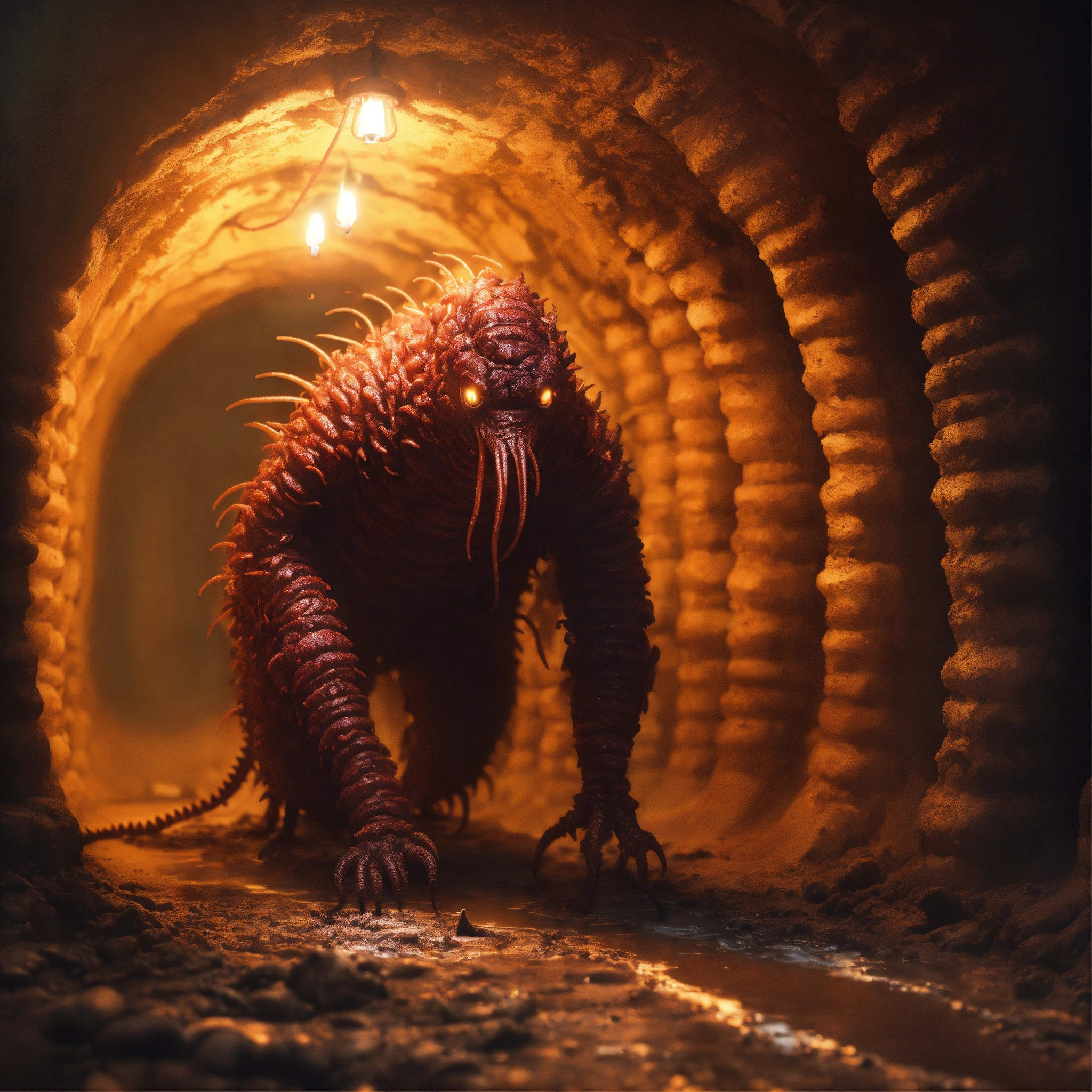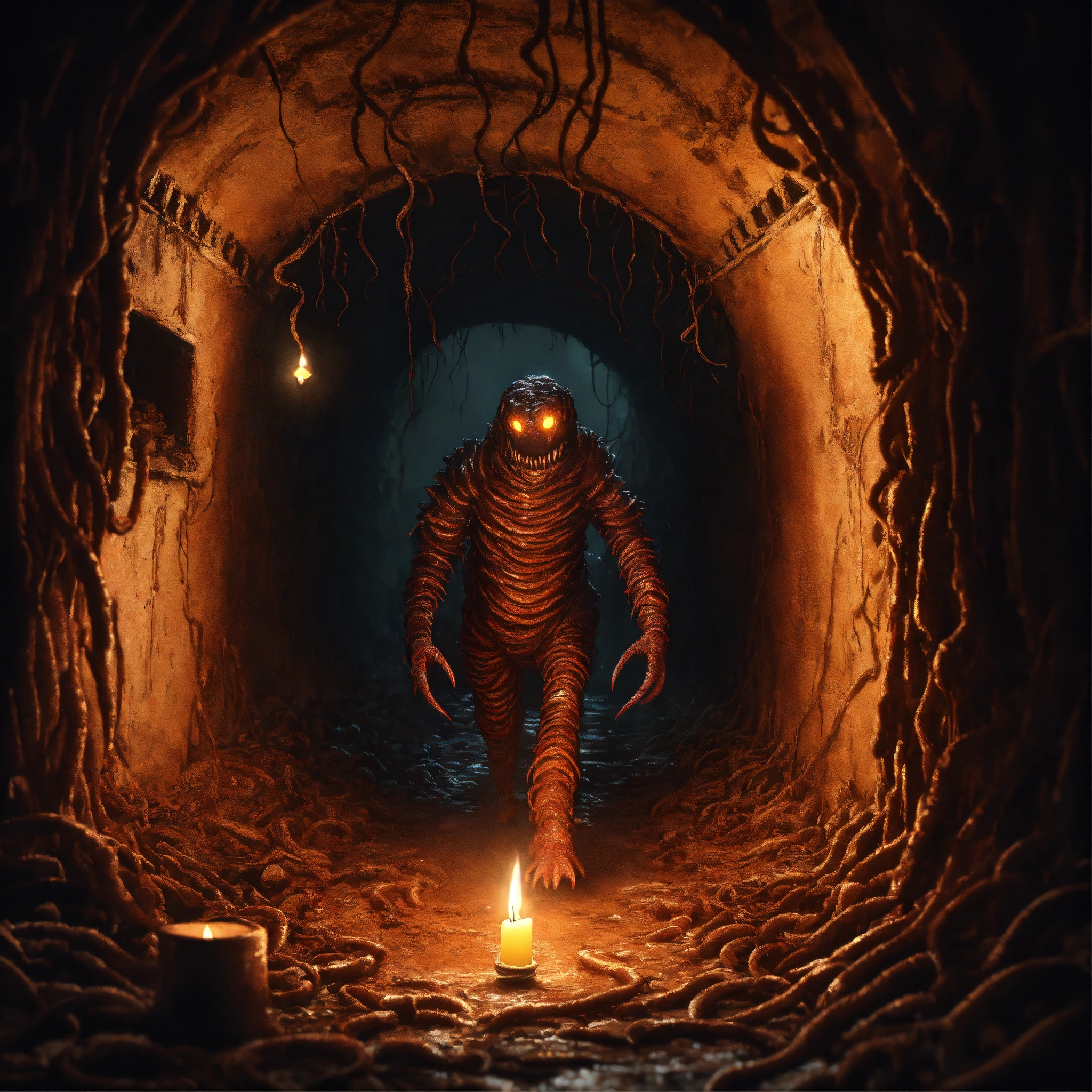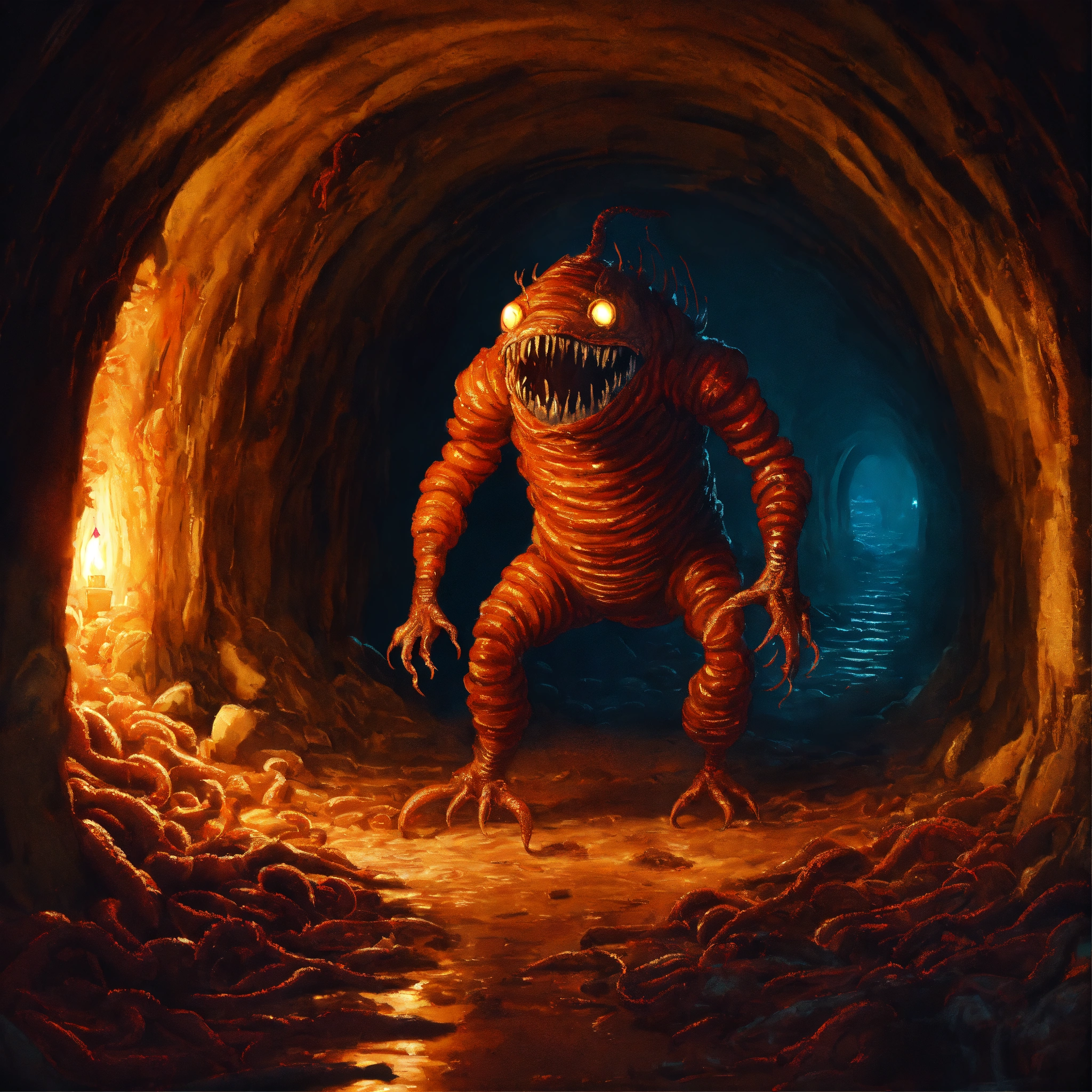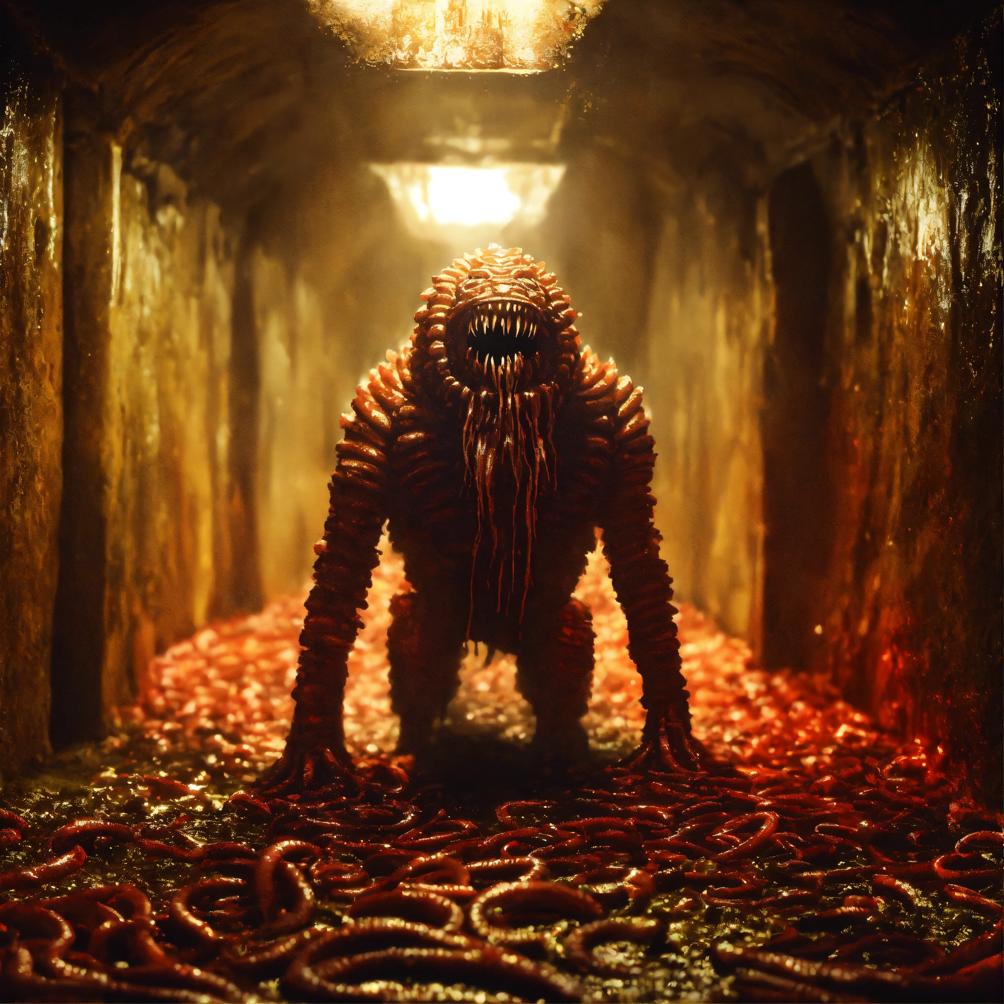 Concept art of a scary humanoid worm monster body is made out of many worms and mud, walking towards me inside of a candle illuminated old sewer tunnel, highly detailed, oil painting style, brush strokes, 8k