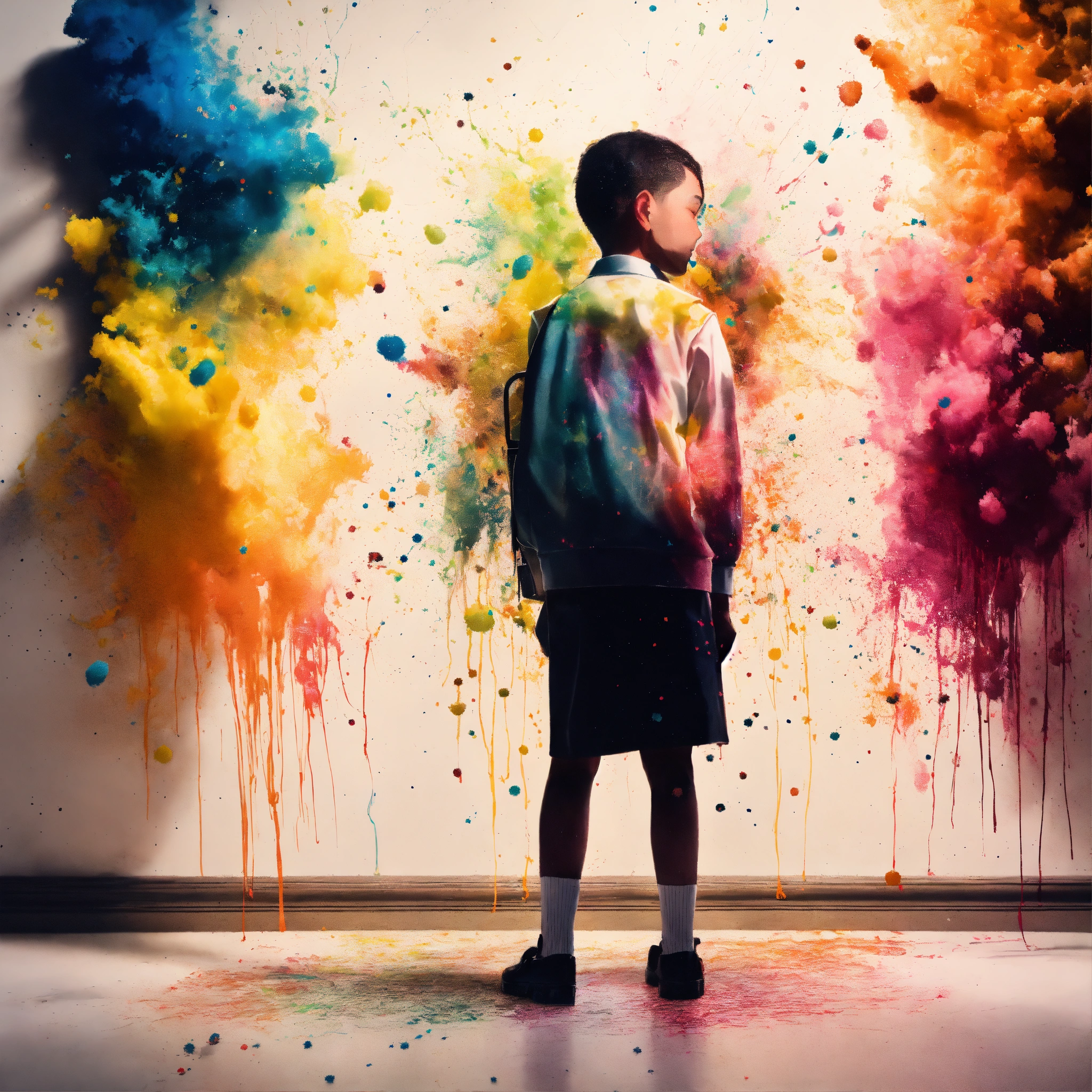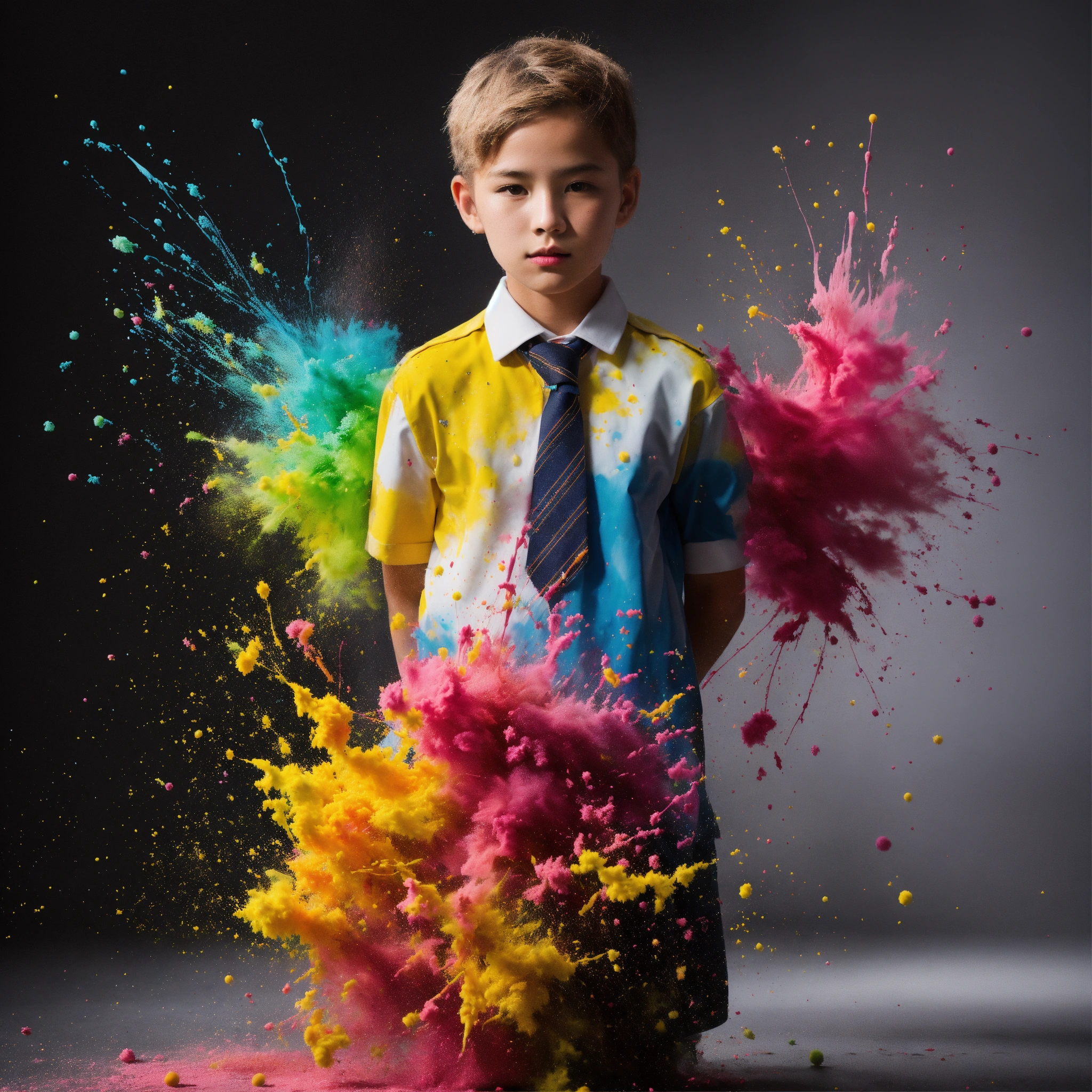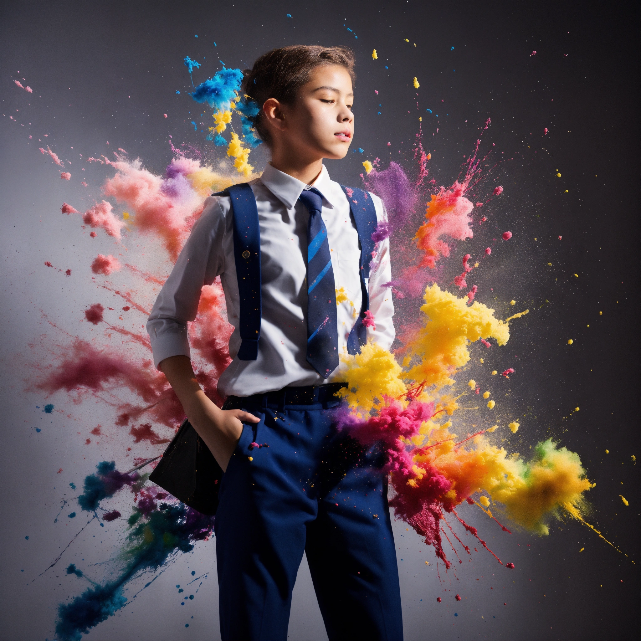 Create an image of a school uniform with a dynamic sequence of ink splatters in various colors being expelled into the air from the uniform towards a chalkboard. gradation of colors from bold to pastels, studio lighting that casts dynamic shadows, white background, with a strong emphasis on the "expulsion" action.