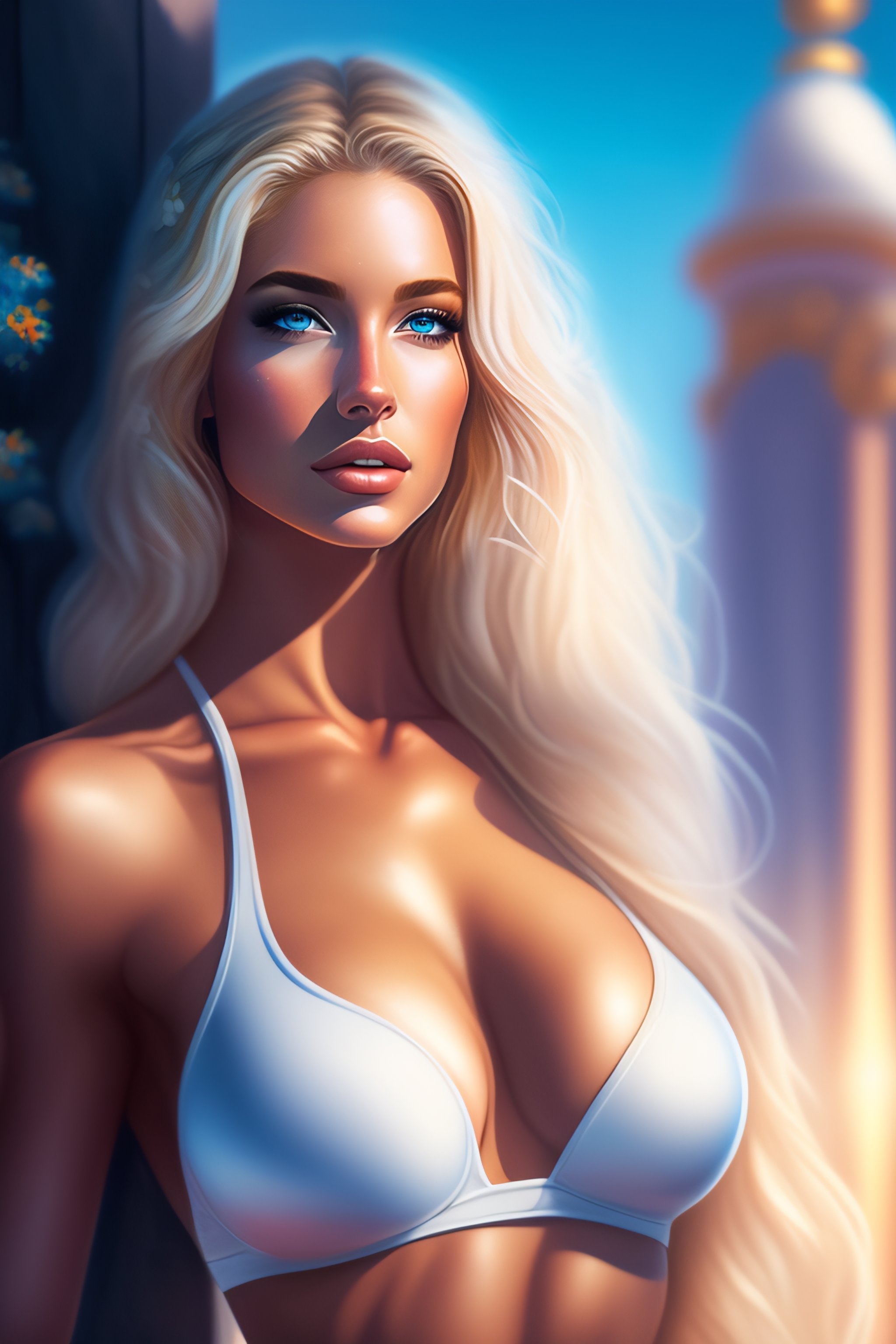 Photograph of pretty hannah palmer woman in simple white bikini, blonde flowing hair and blue eyes, kneeling pose, live action, fantasy, intricate, elegant, highly detailed, artstation, concept art, matte, sharp focus, illustration, rooftop background, art by dandonfuga